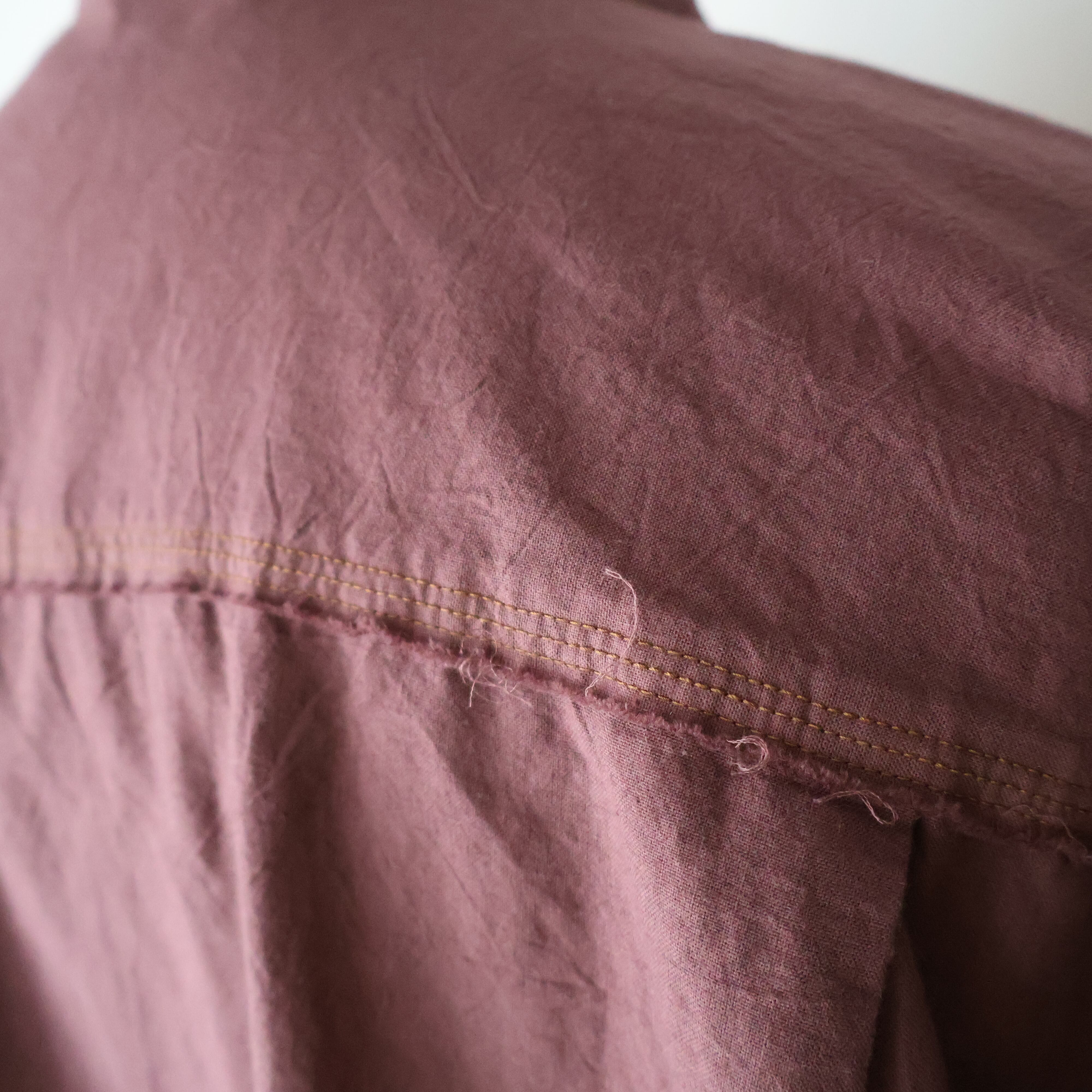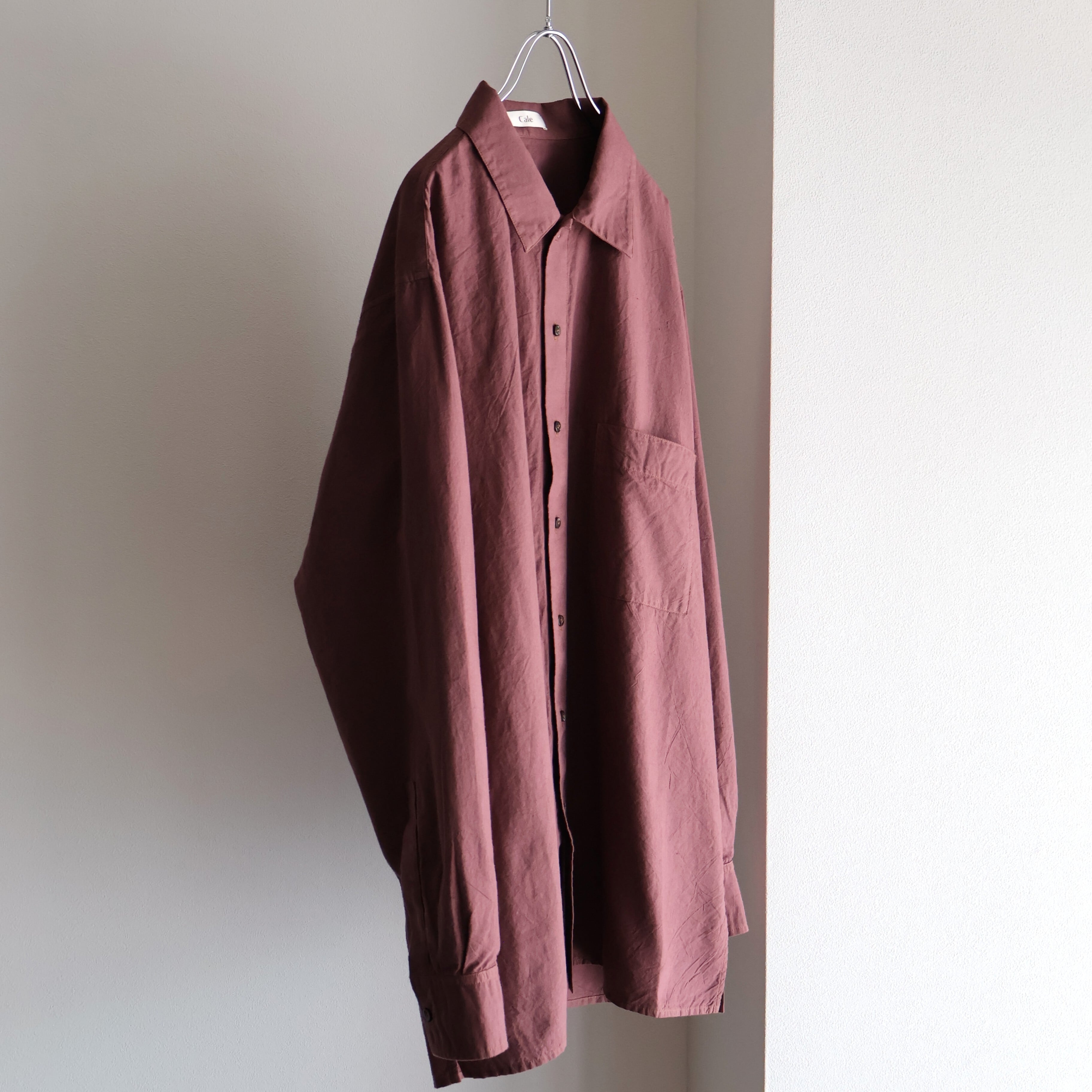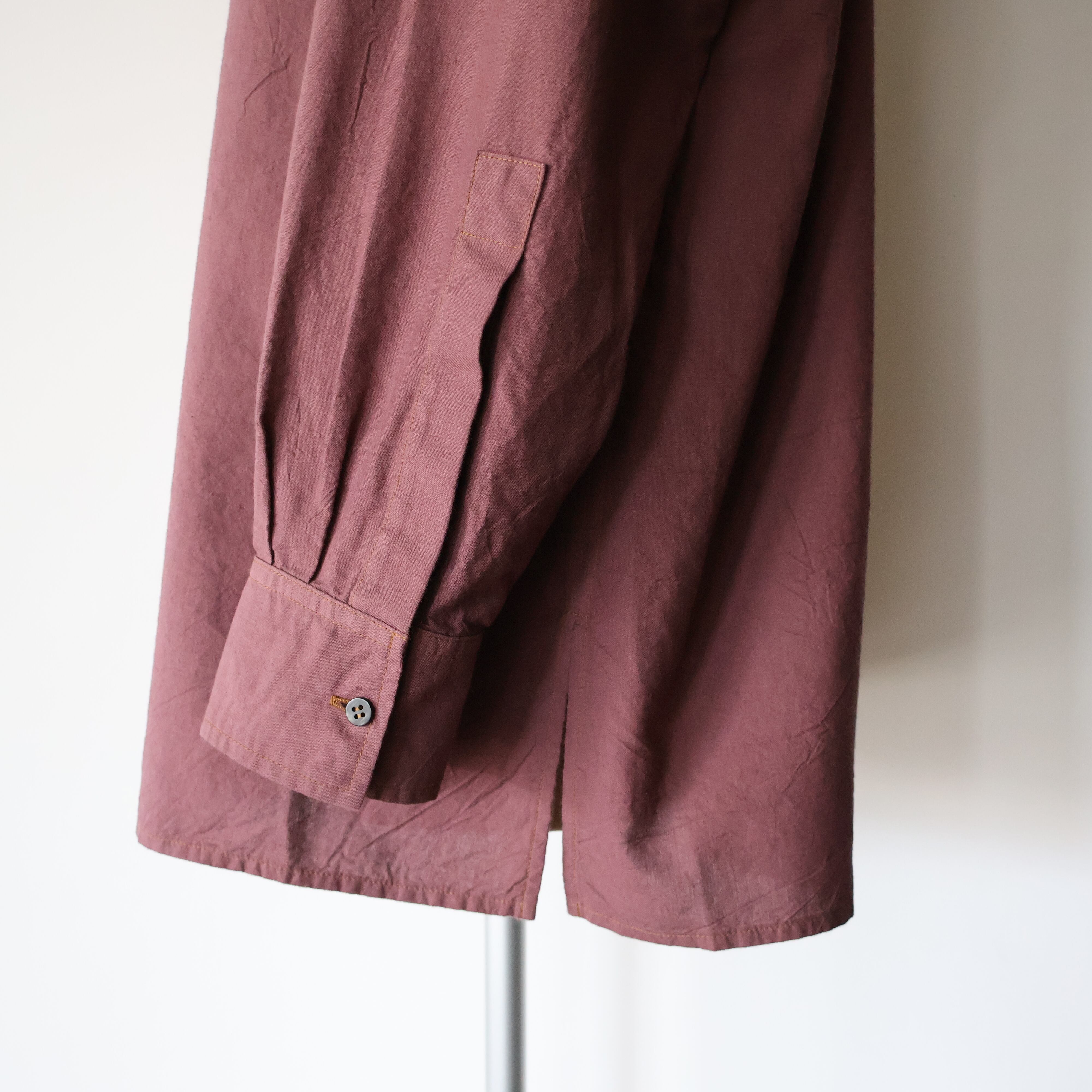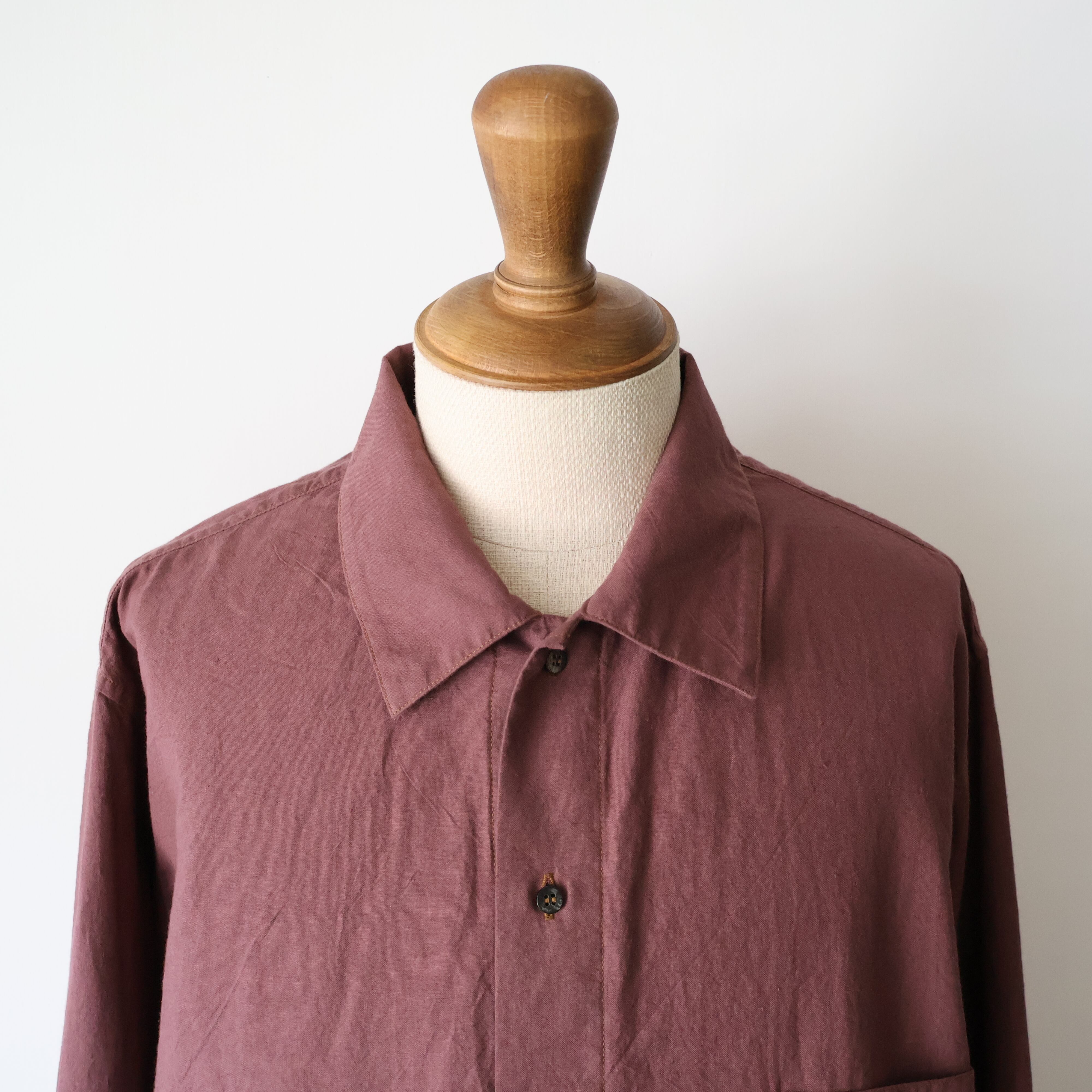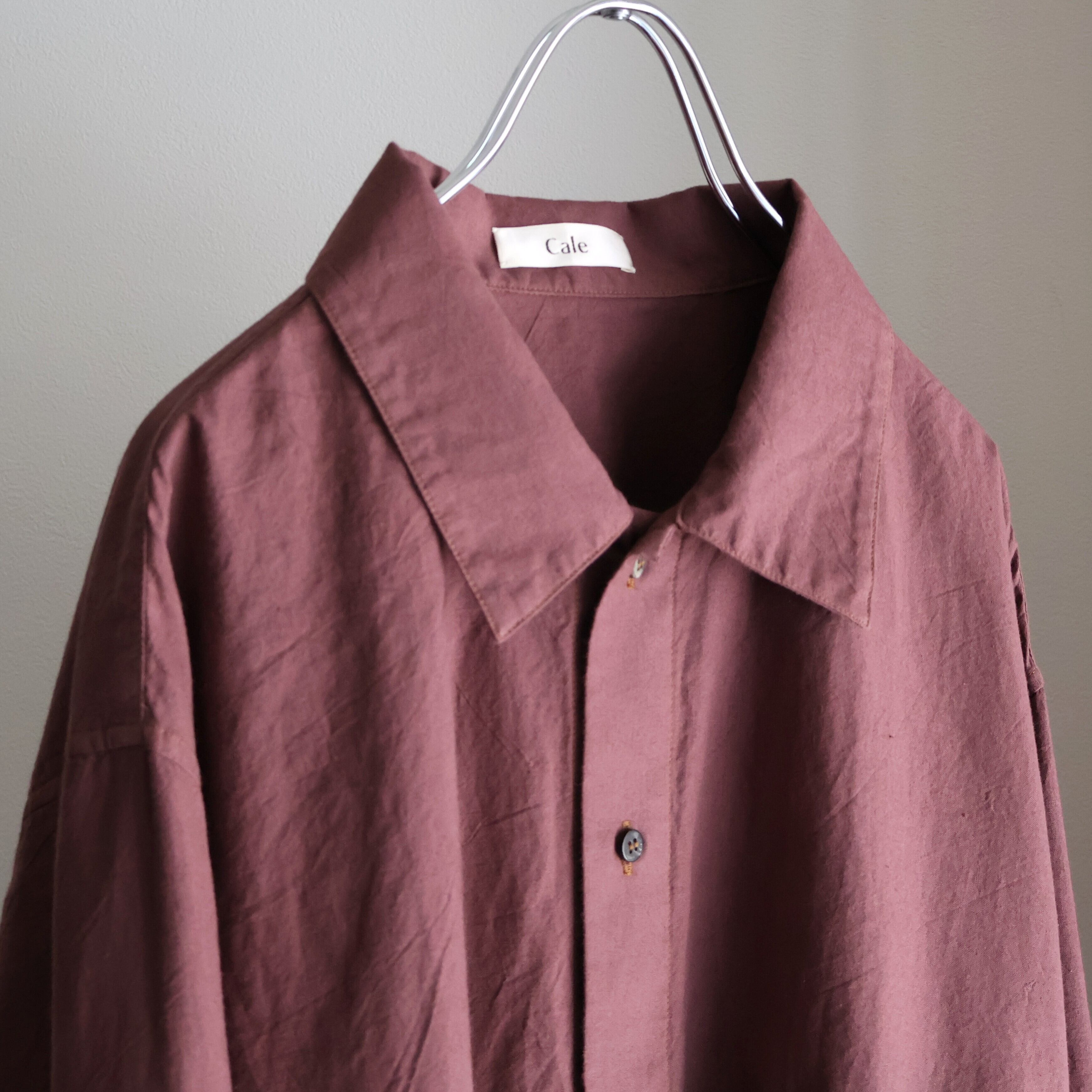 ヨークに配された切りっぱなしや3本針ステッチのディティールによるユニークさと草木染めによる独特な色合い、生地による無国籍感がCaleの持つ高い縫製技術によるアーバンな雰囲気と掛け合わさることで唯一無二の存在感に包まれたアイテムです。