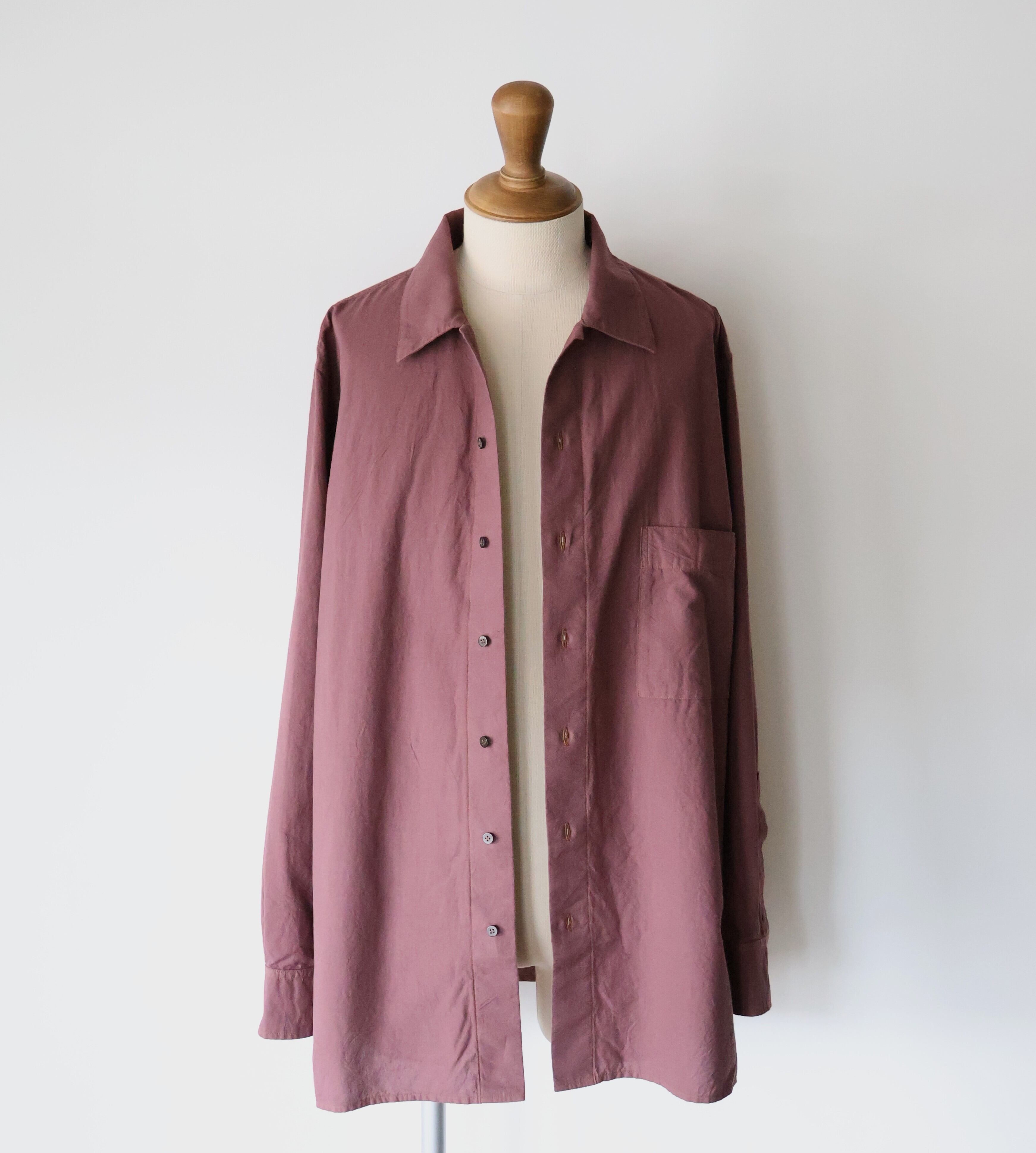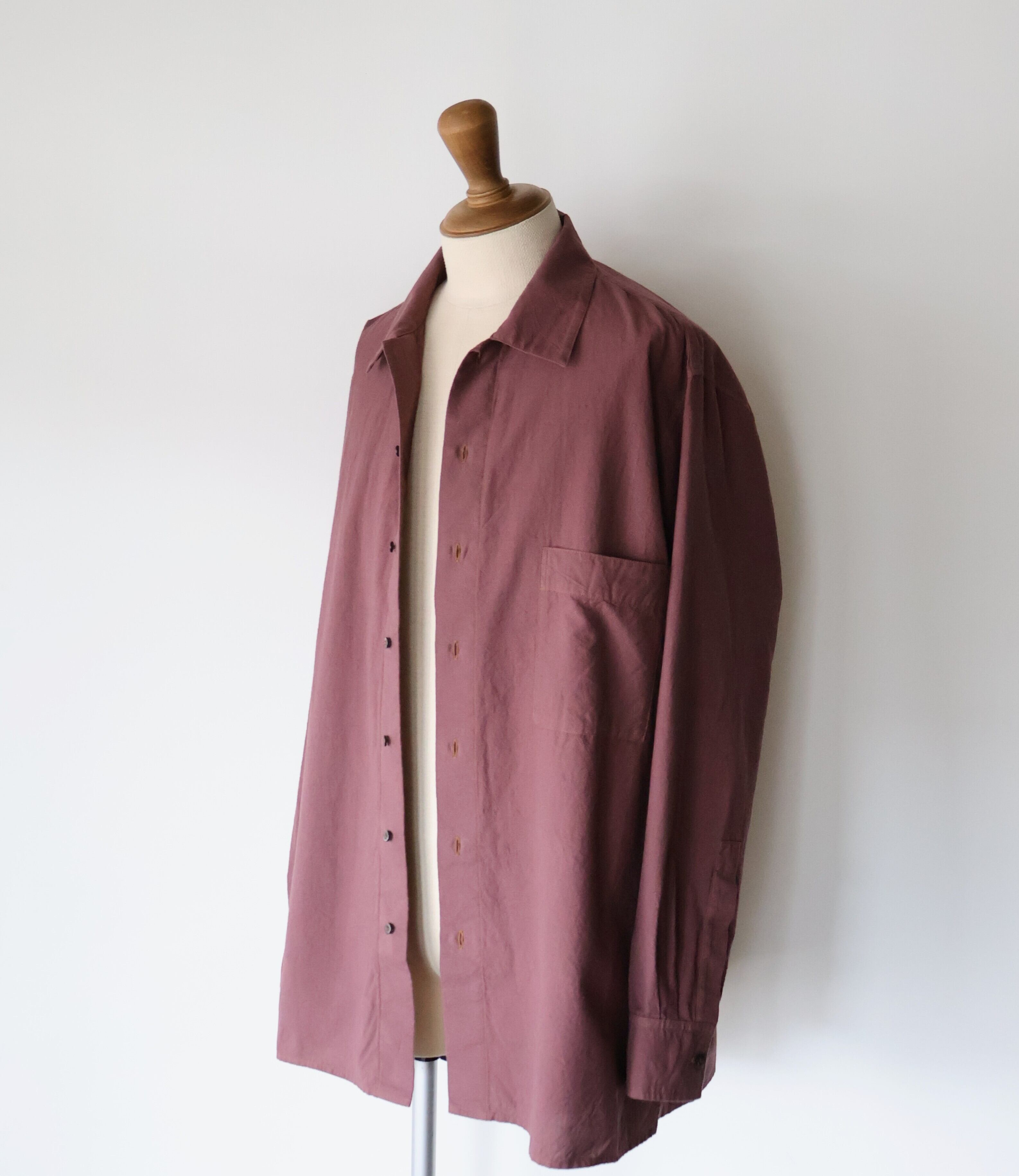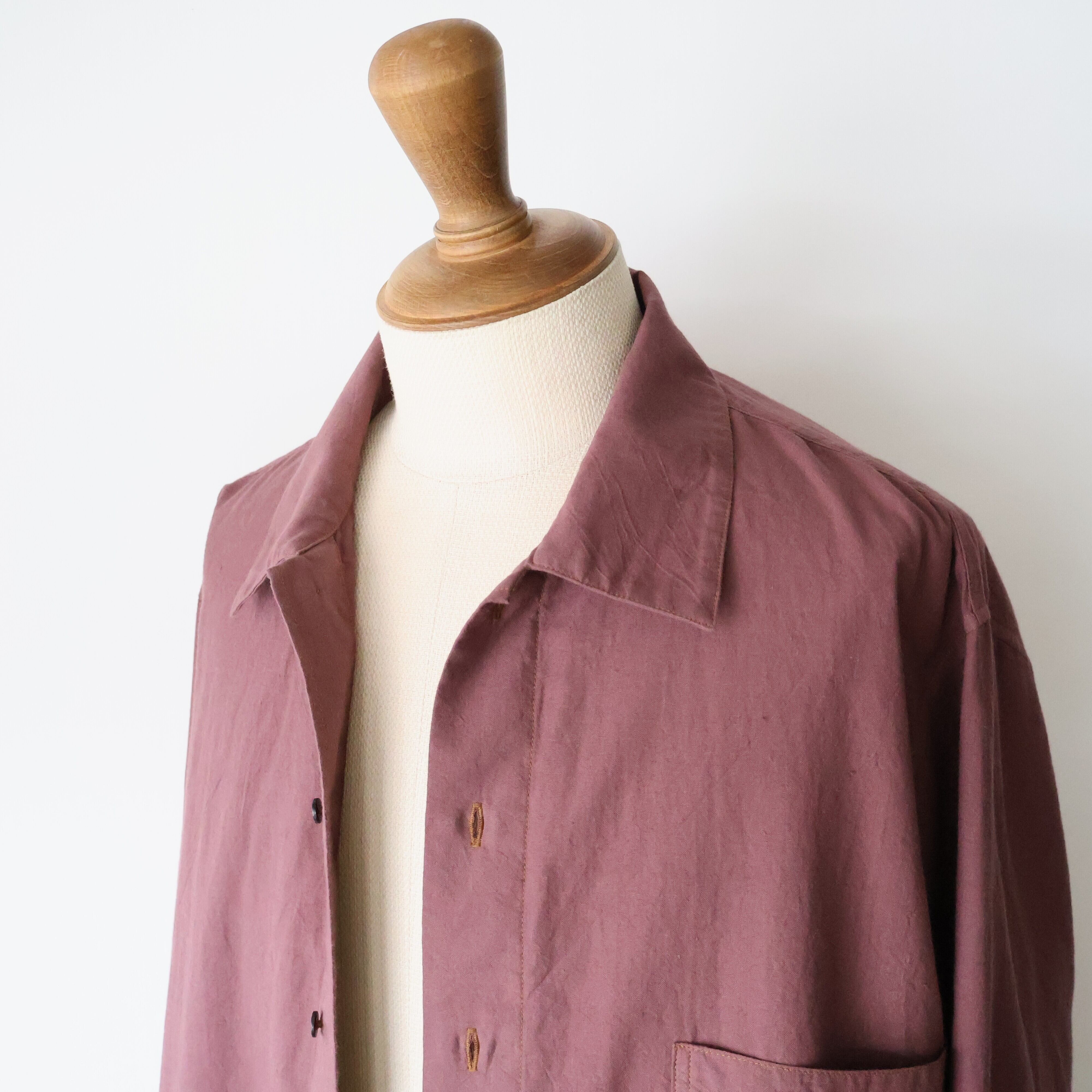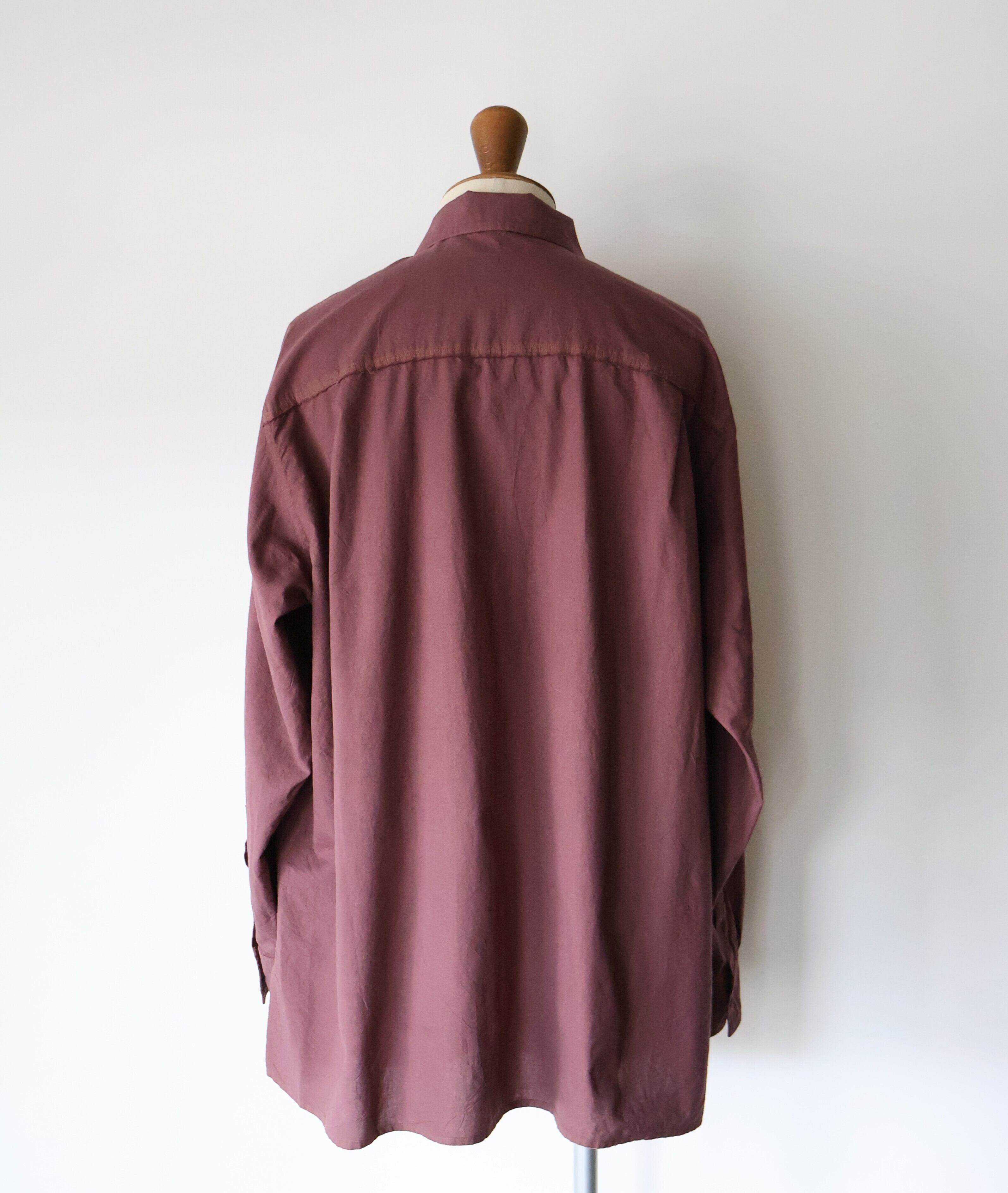 ヨークに配された切りっぱなしや3本針ステッチのディティールによるユニークさと草木染めによる独特な色合い、生地による無国籍感がCaleの持つ高い縫製技術によるアーバンな雰囲気と掛け合わさることで唯一無二の存在感に包まれたアイテムです。