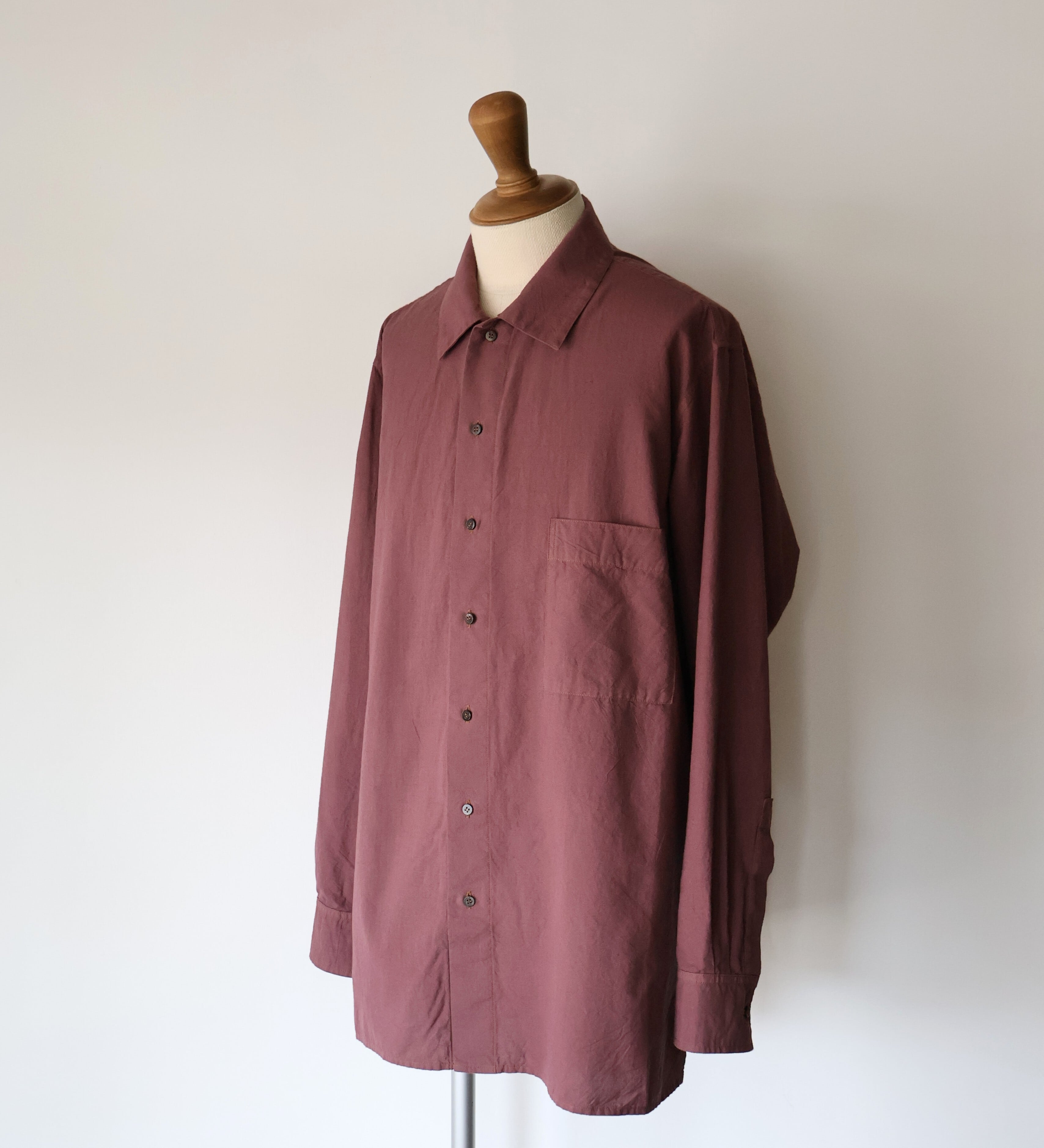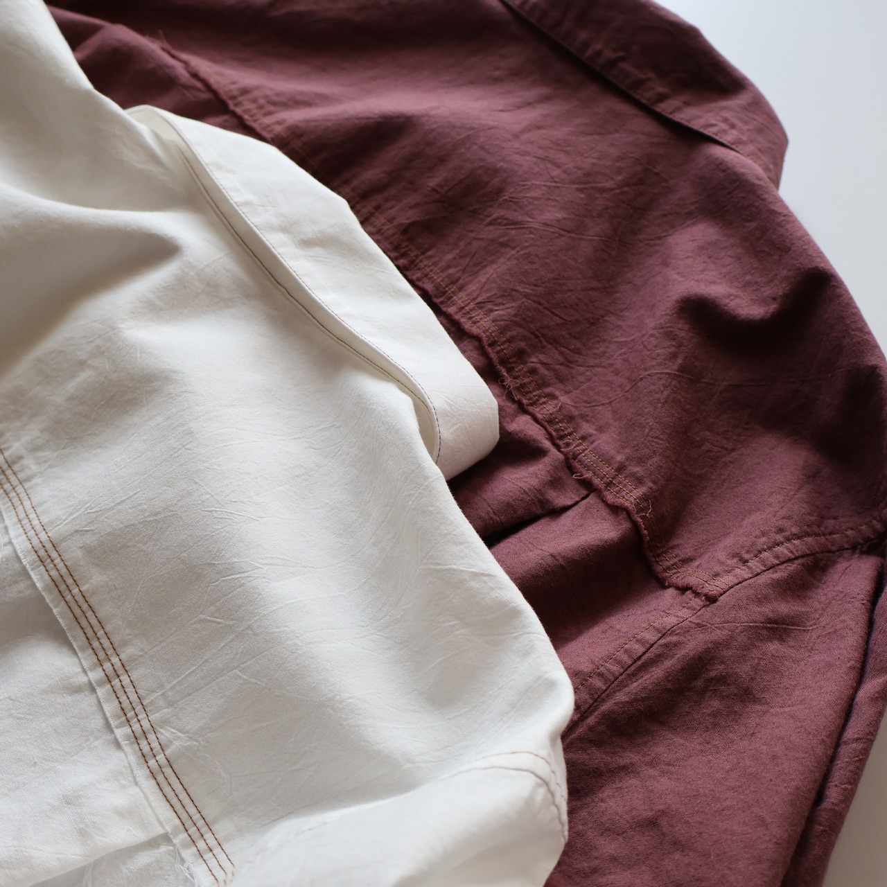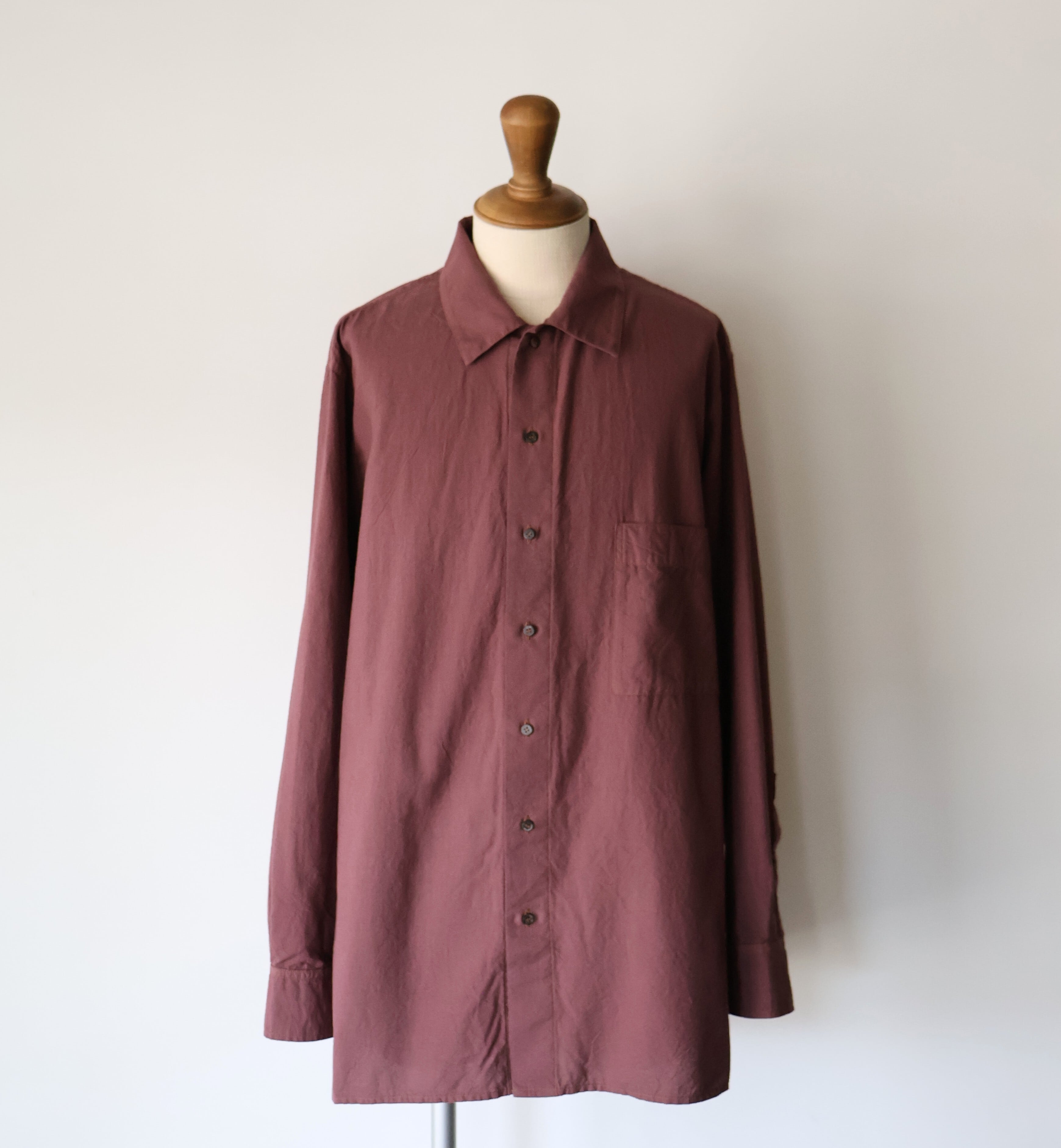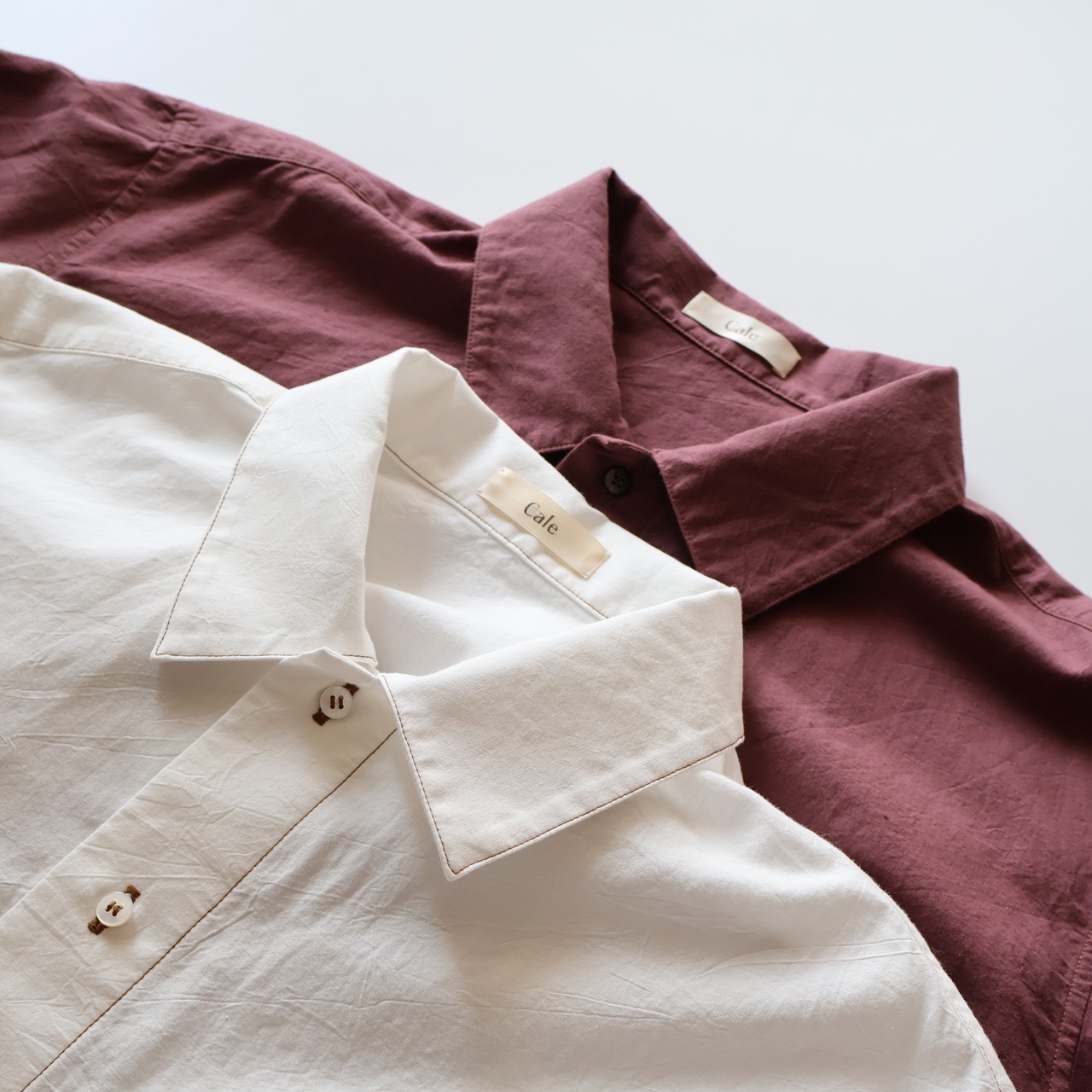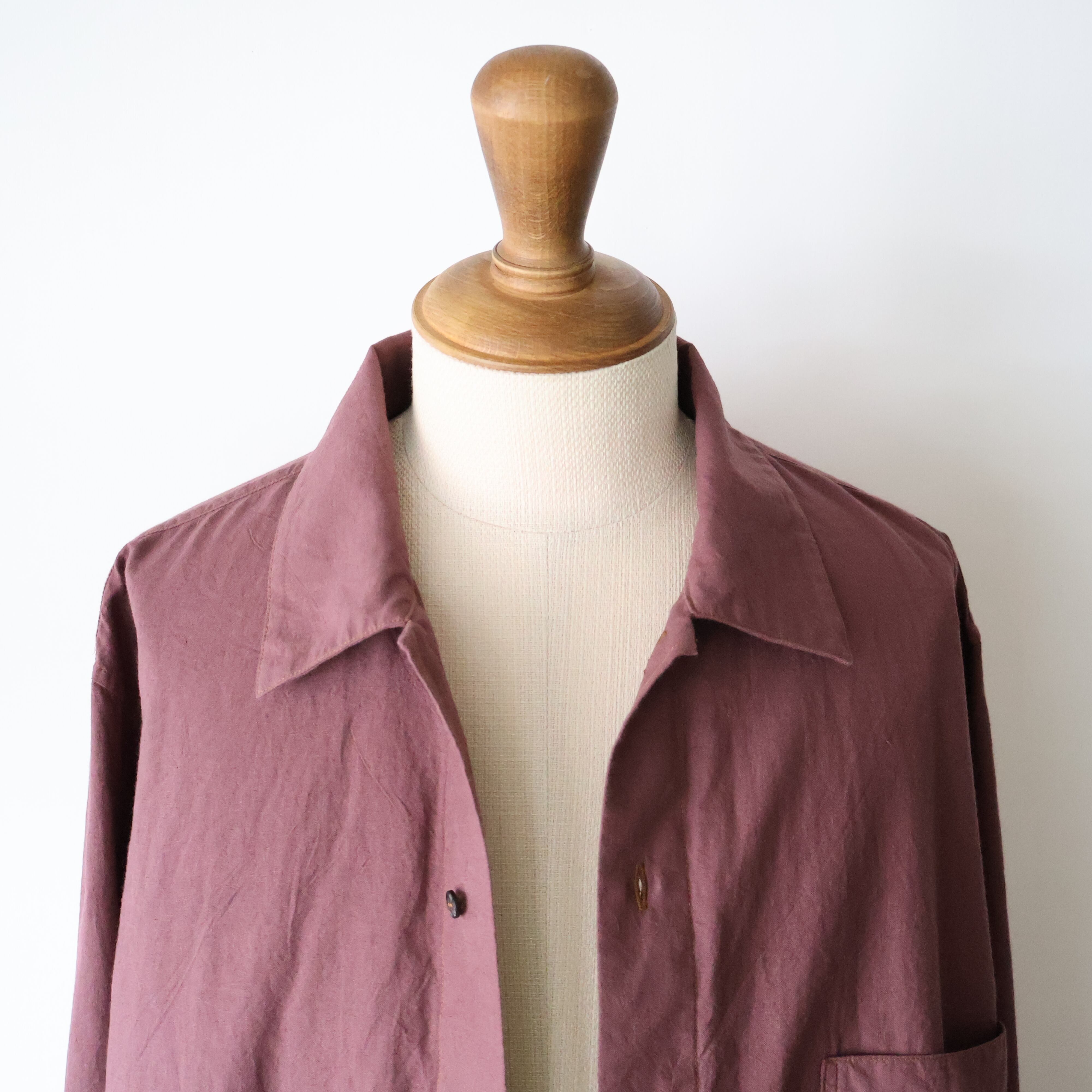 ヨークに配された切りっぱなしや3本針ステッチのディティールによるユニークさと草木染めによる独特な色合い、生地による無国籍感がCaleの持つ高い縫製技術によるアーバンな雰囲気と掛け合わさることで唯一無二の存在感に包まれたアイテムです。