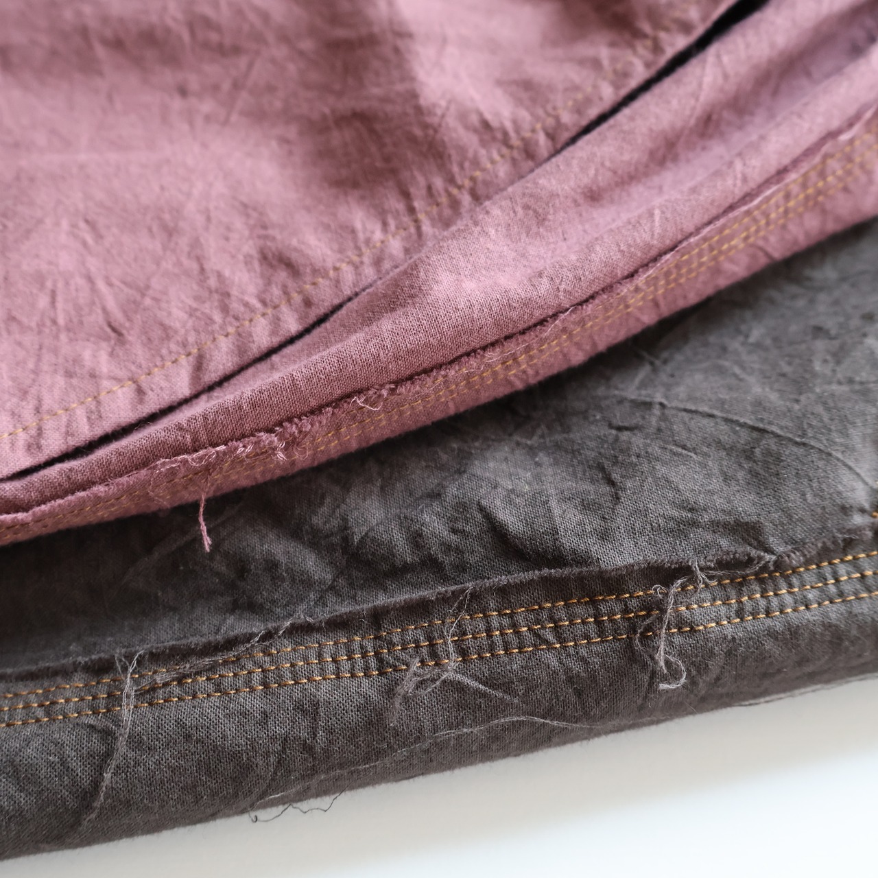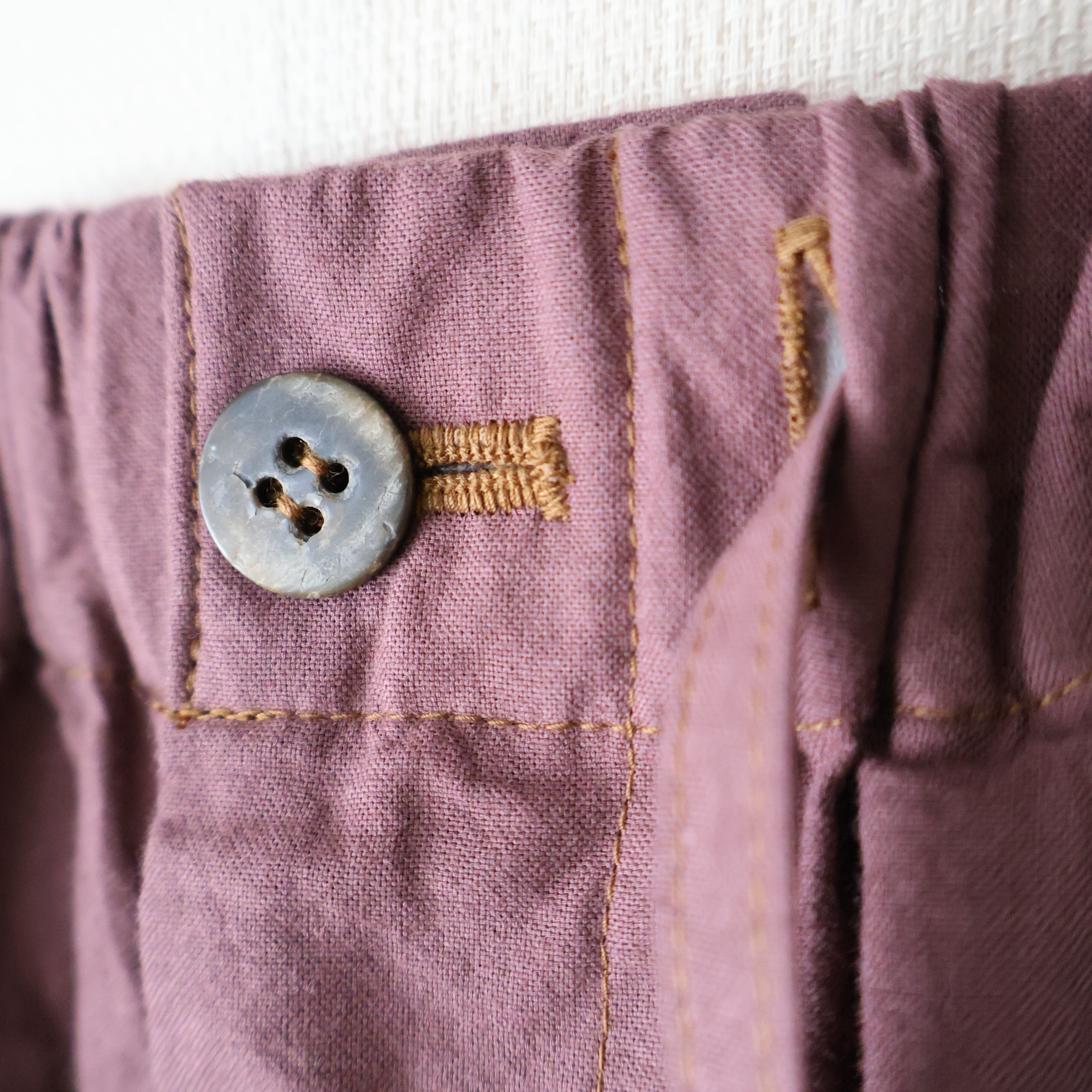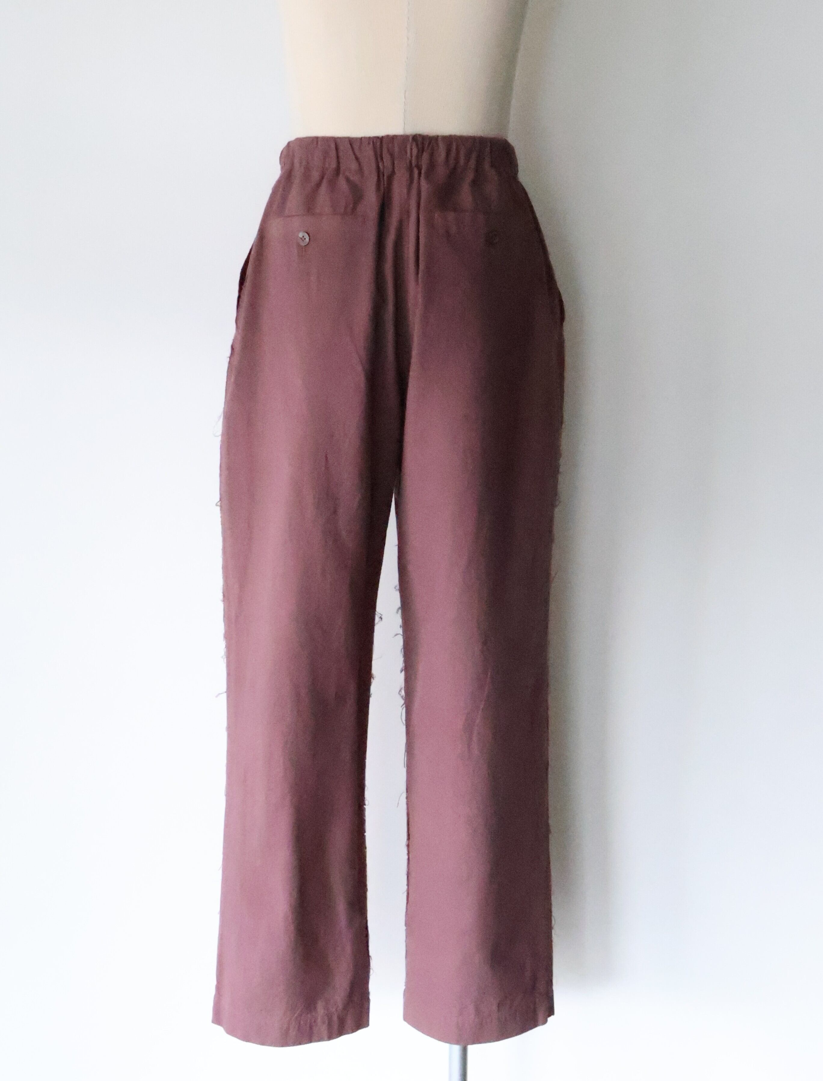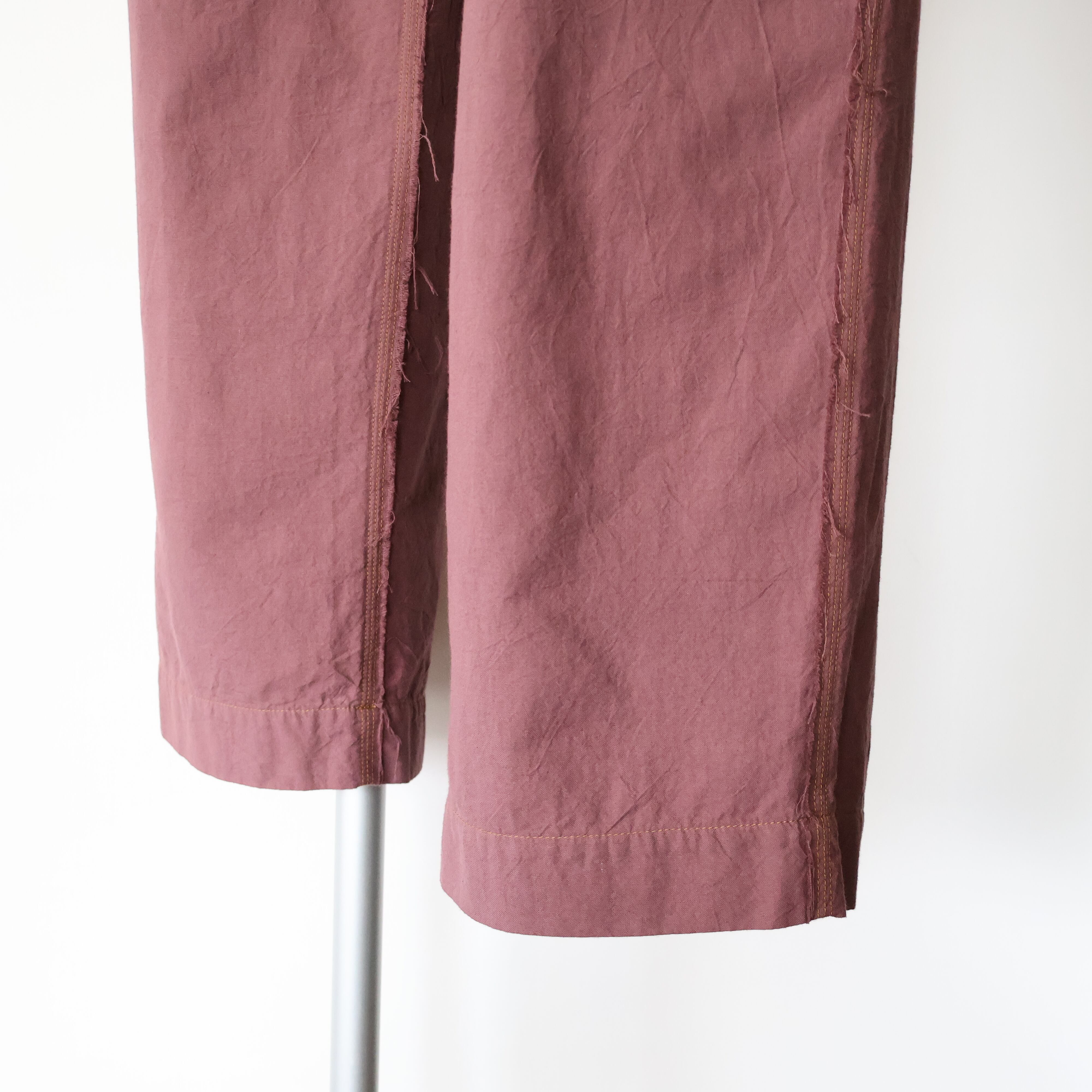 サイドシームレスとインサイドシームに配された切りっぱなしや3本針ステッチのディティールによるユニークさと草木染めによる独特な色合い、生地による無国籍感がCaleの持つ高い縫製技術によるアーバンな雰囲気と掛け合わさることで唯一無二の存在感に包まれたアイテムです。