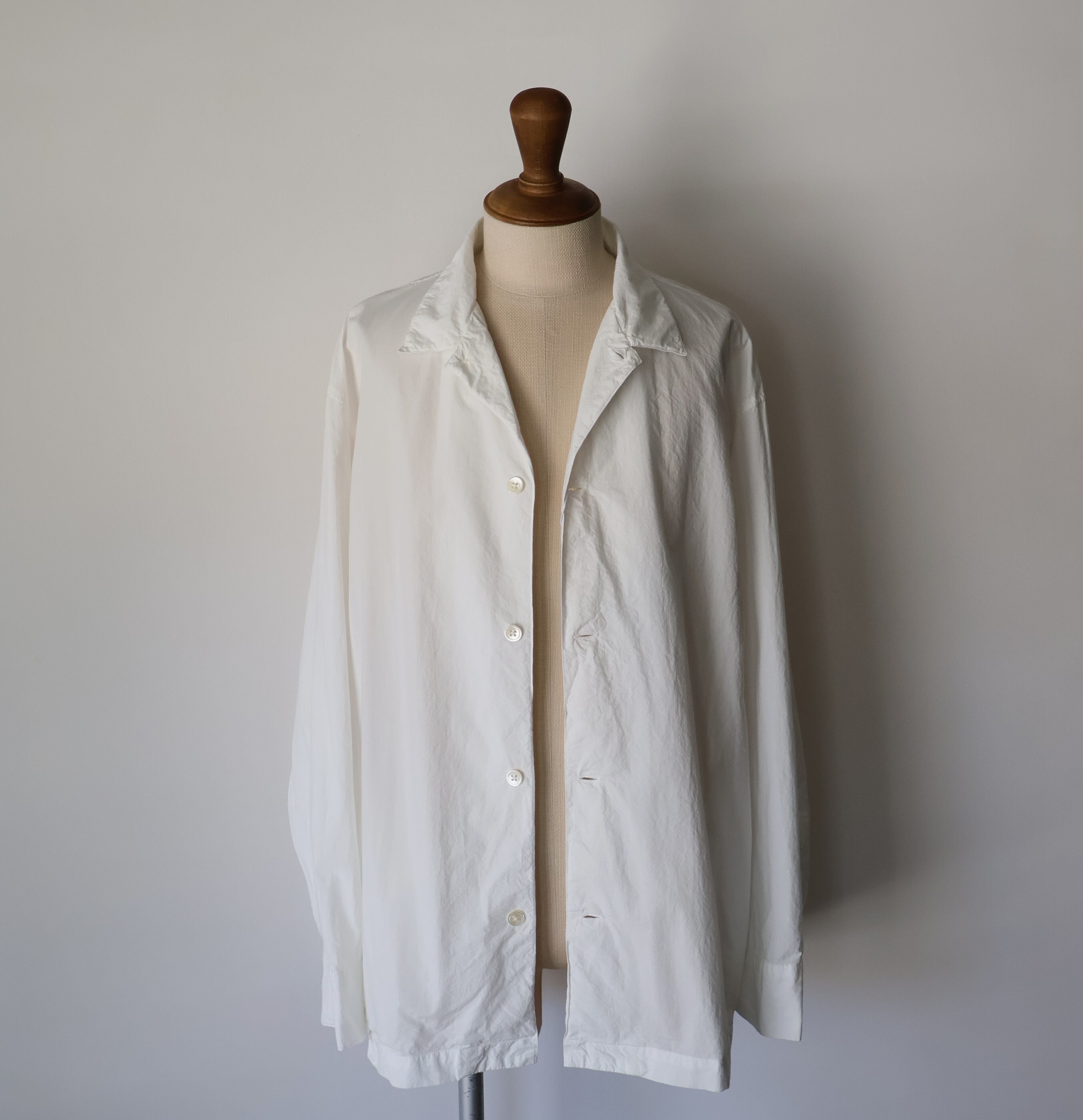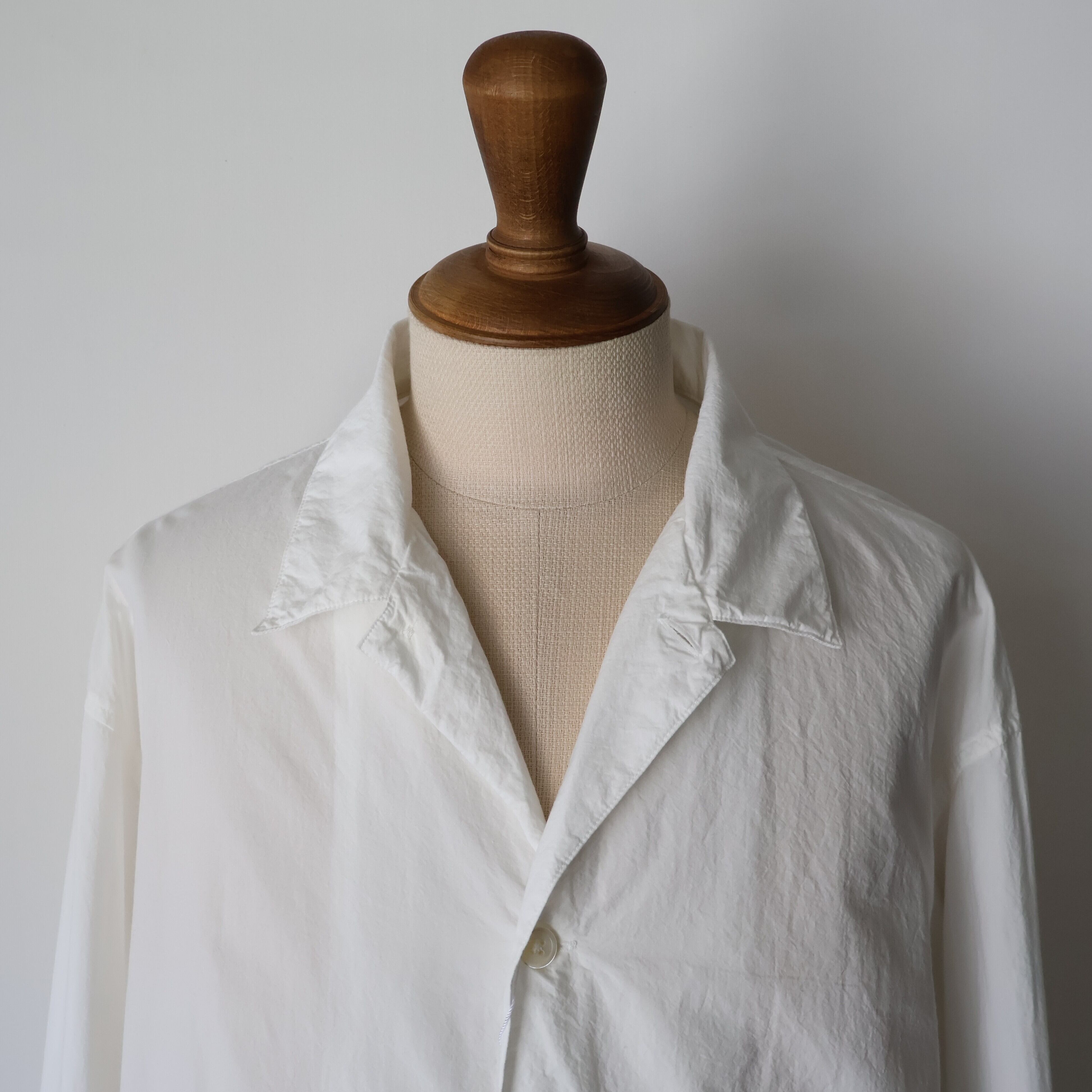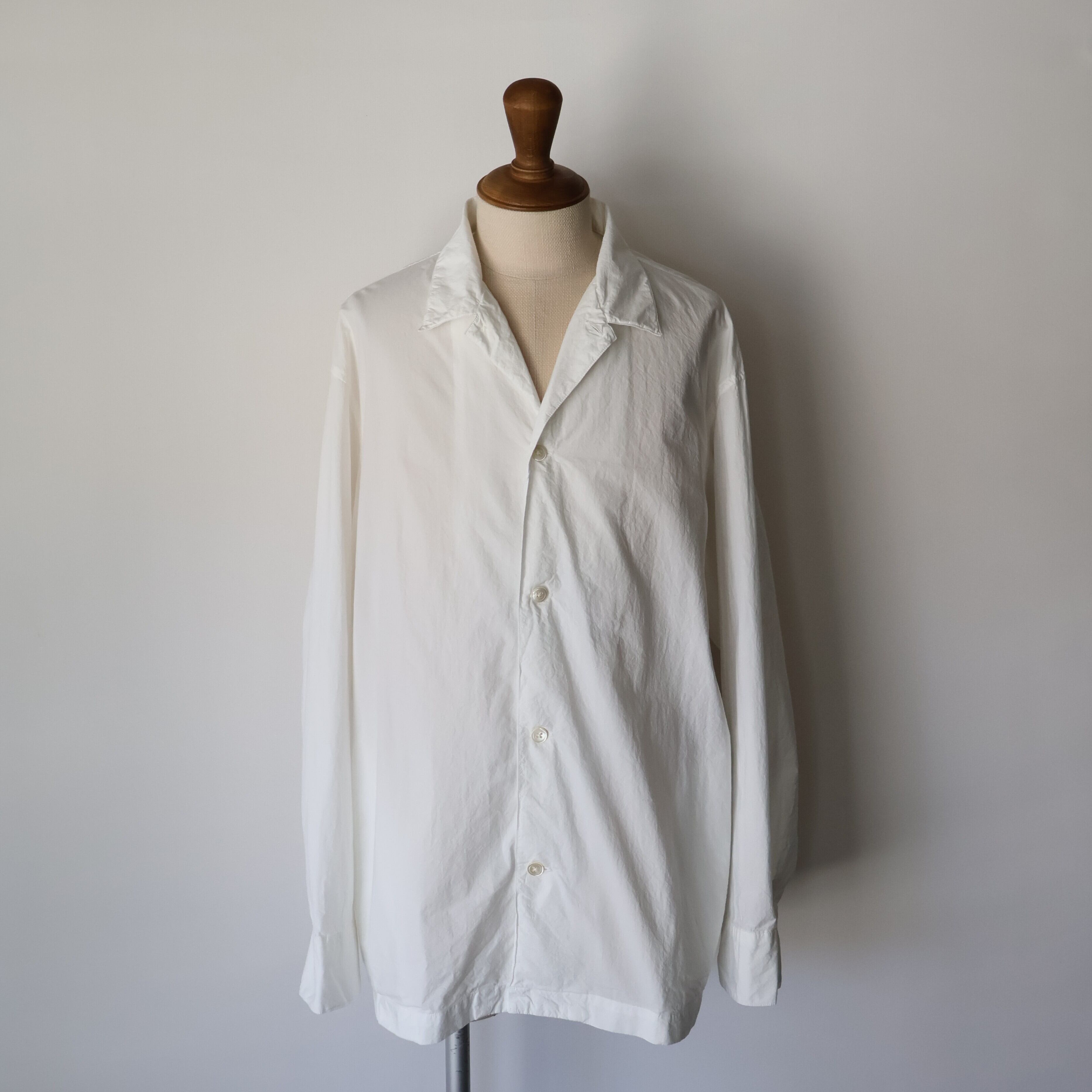 コットンシルクの混紡糸を使用して織られた生地をワッシャーにより柔らかくした生地を使用して製品染をしたオープンカラーのL/Sシャツになります。