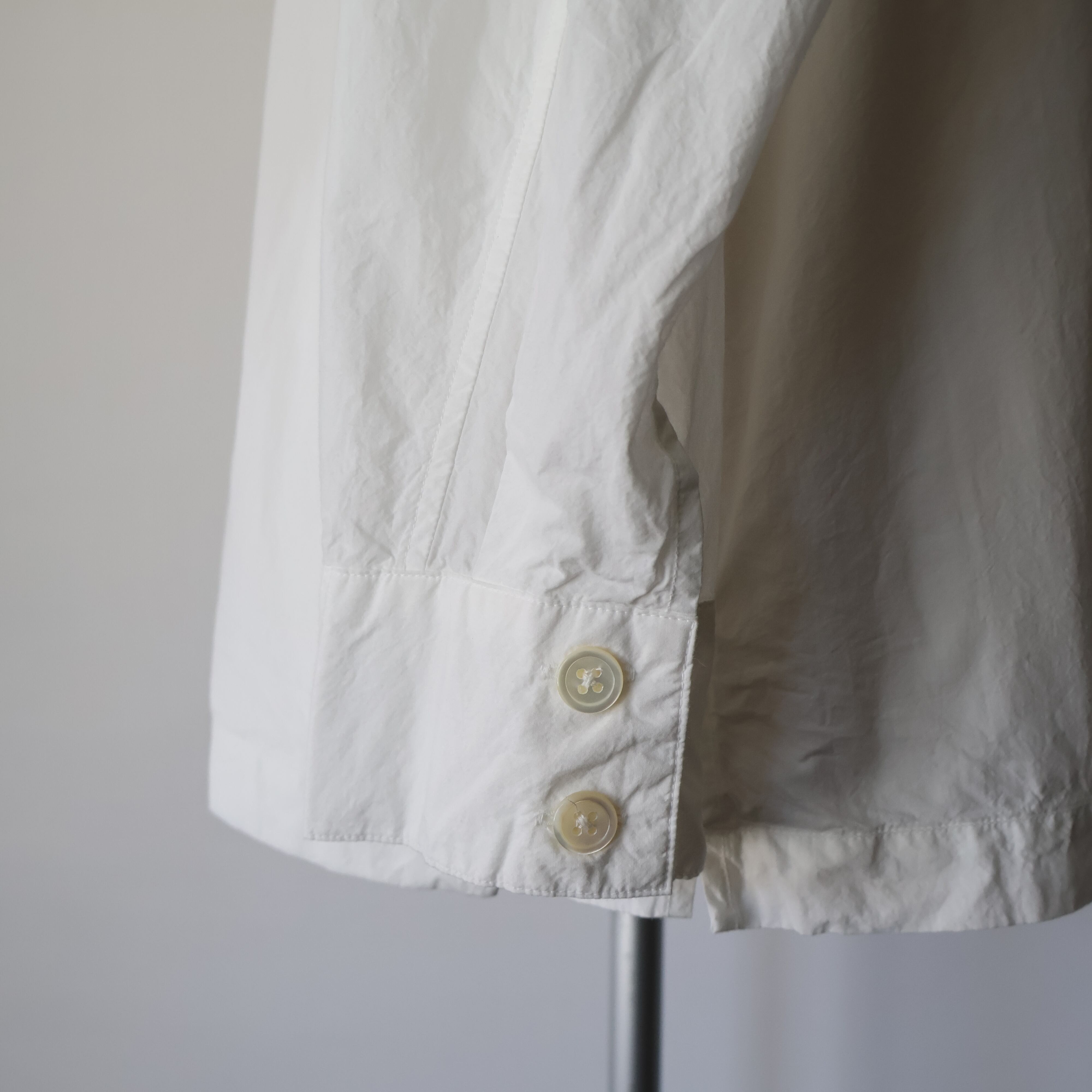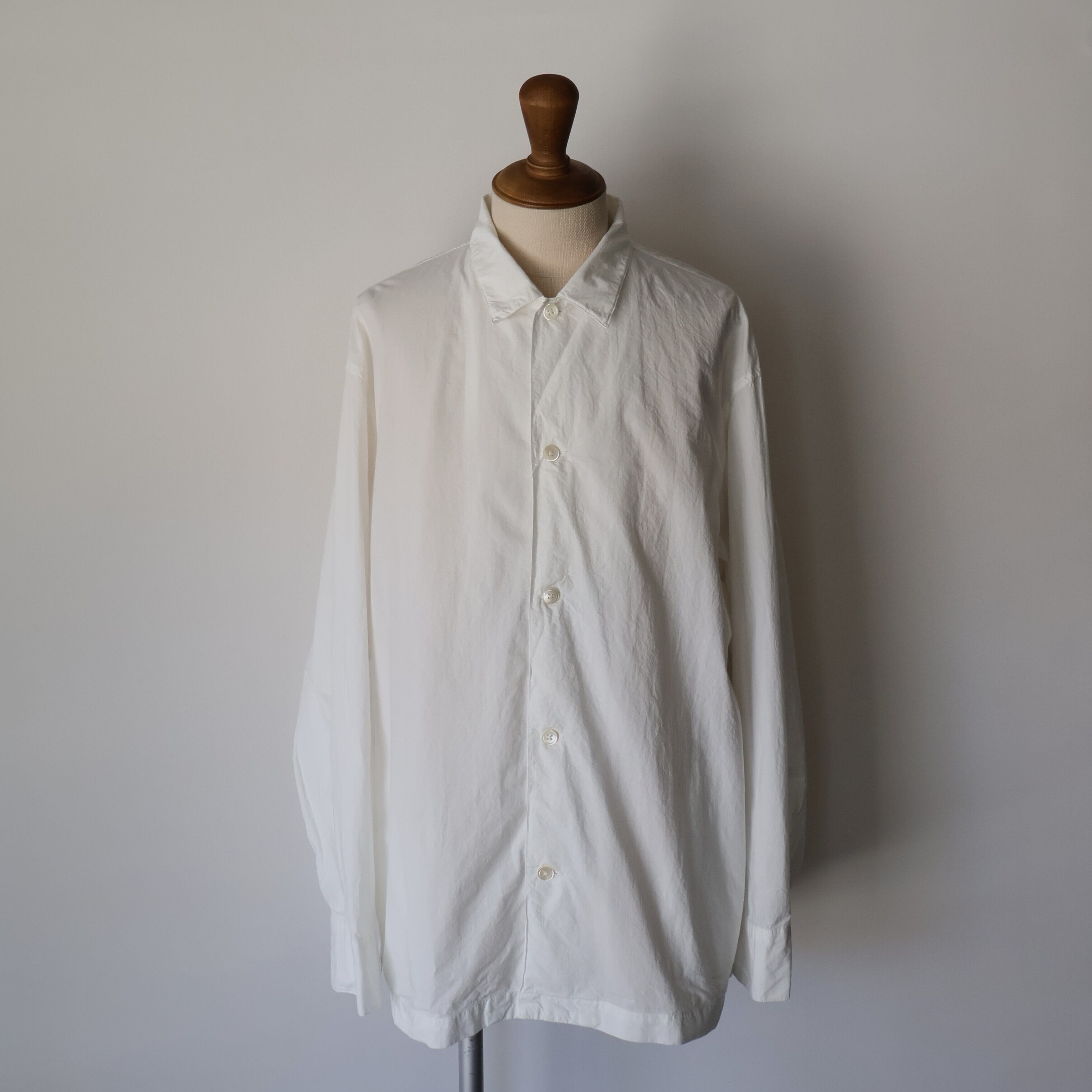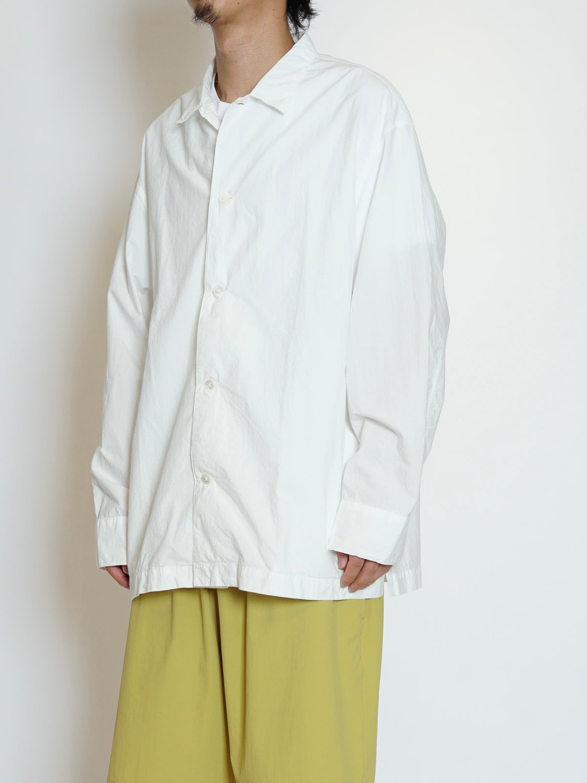 コットンシルクの混紡糸を使用して織られた生地をワッシャーにより柔らかくした生地を使用して製品染をしたオープンカラーのL/Sシャツになります。