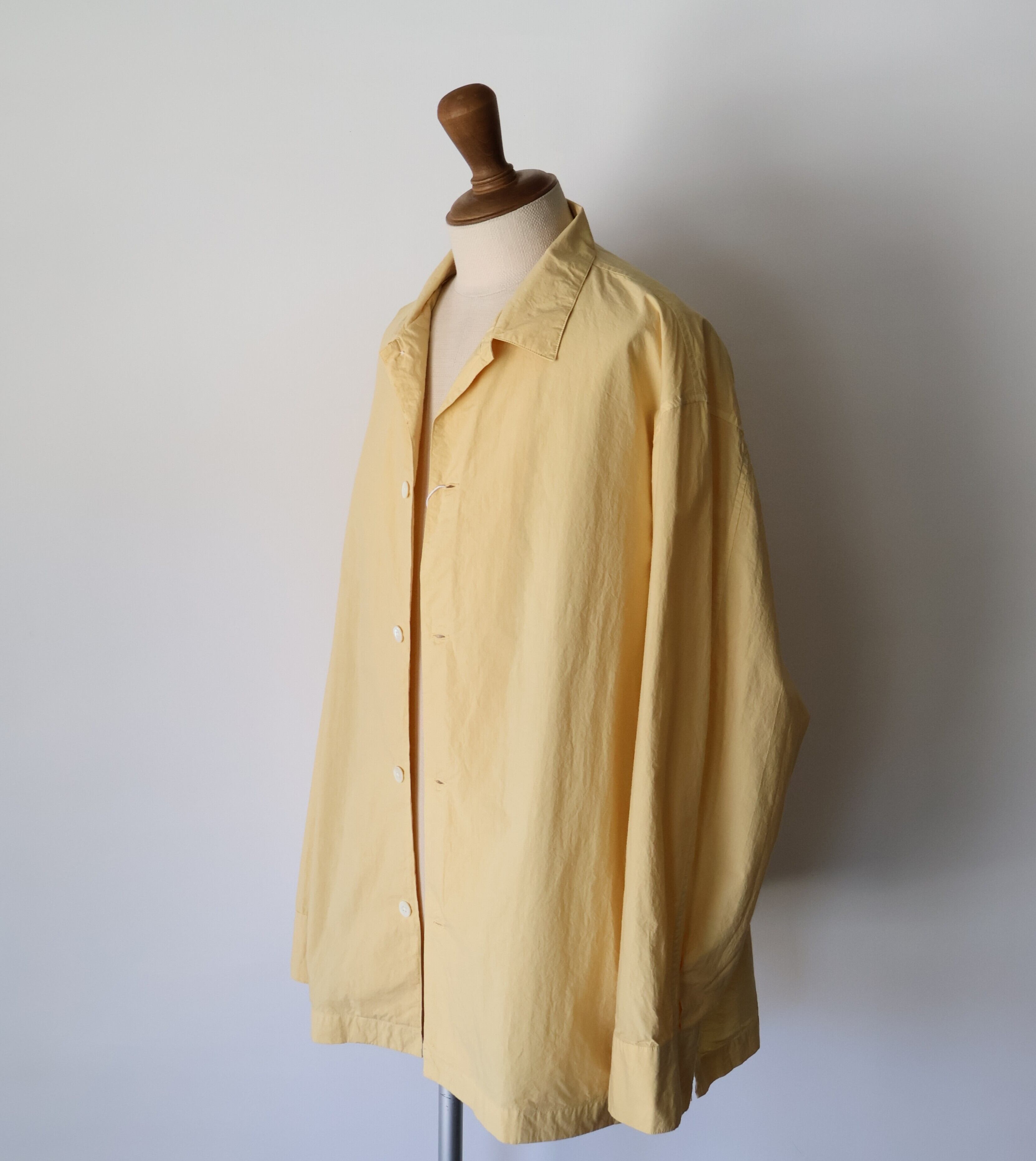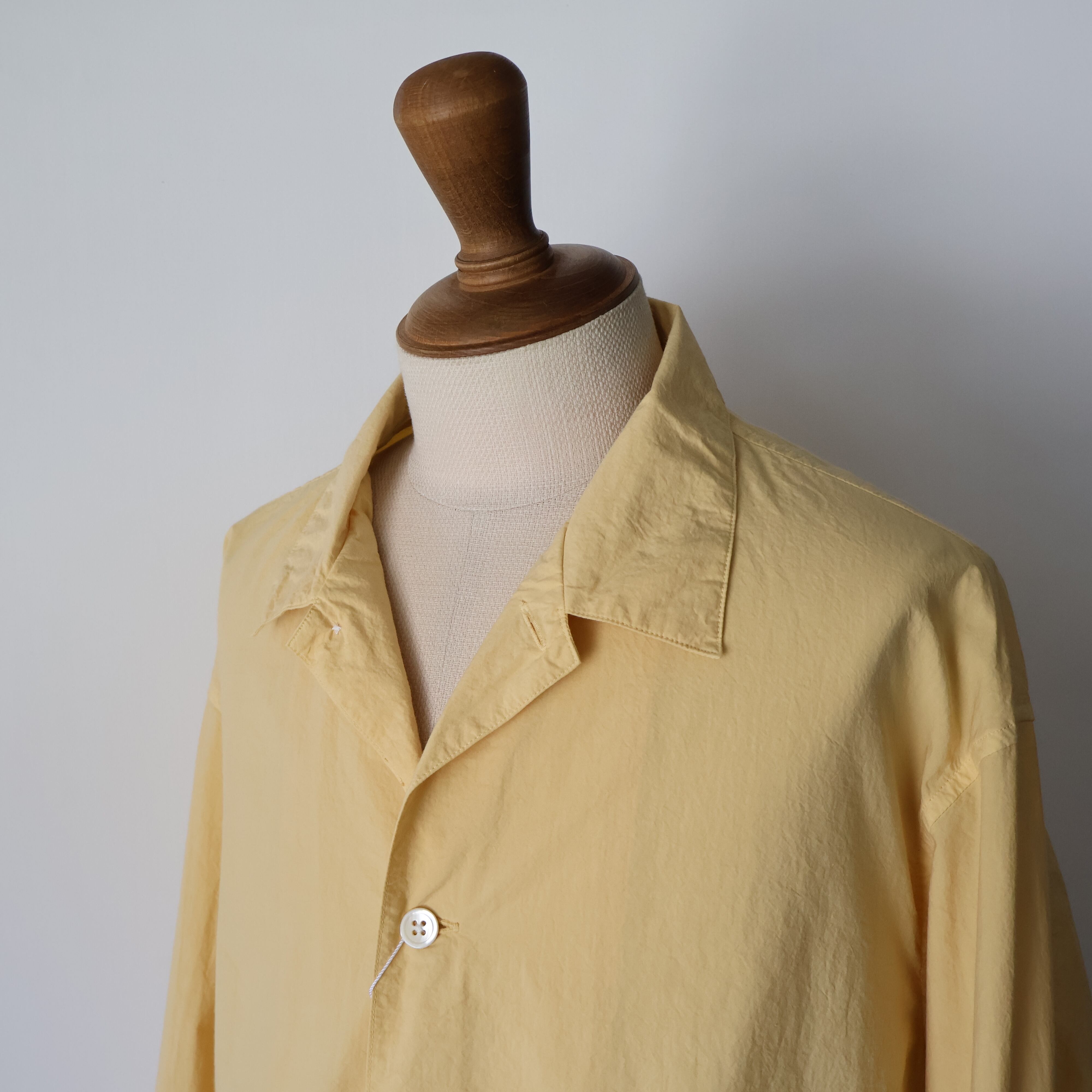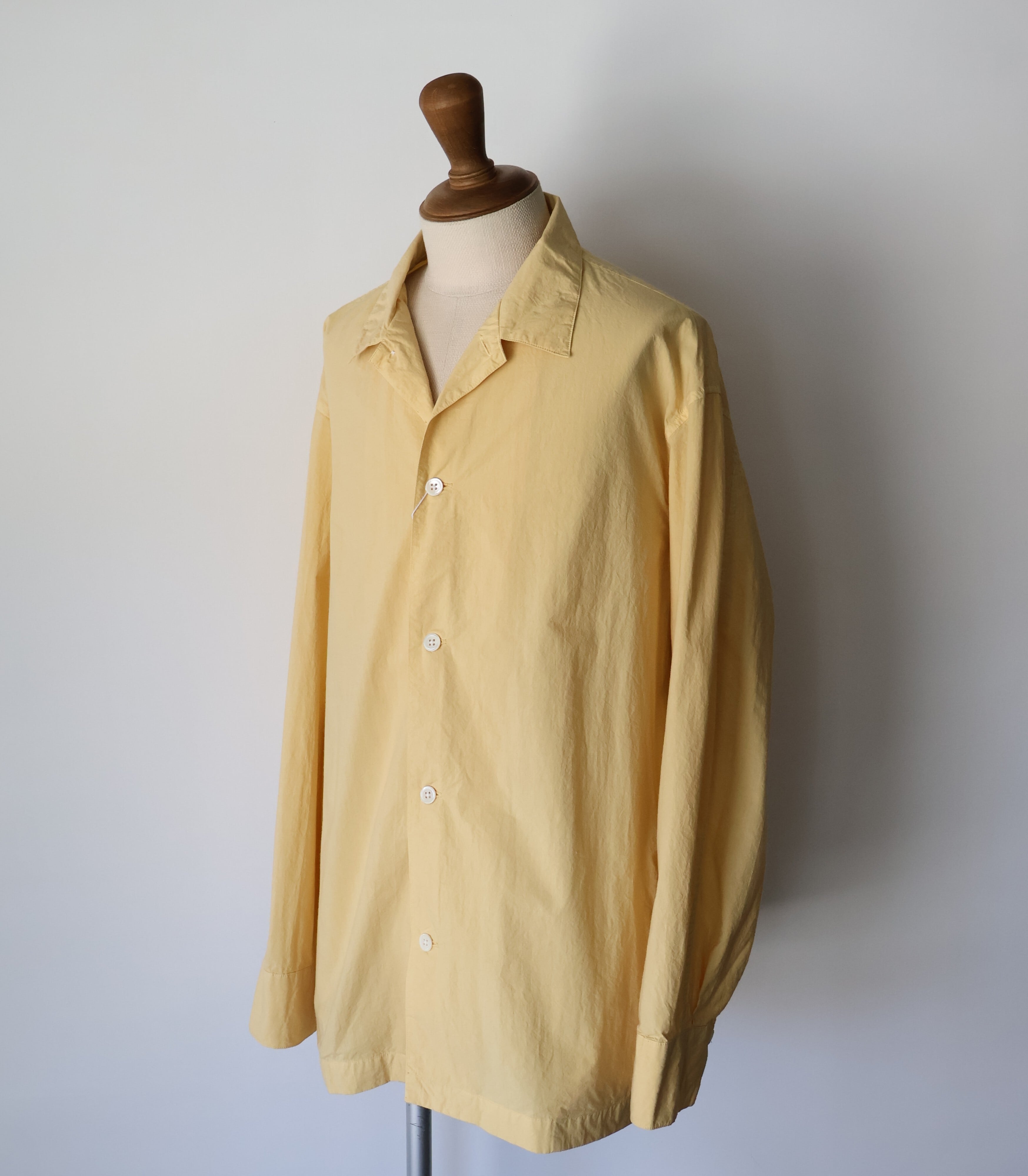 コットンシルクの混紡糸を使用して織られた生地をワッシャーにより柔らかくした生地を使用して製品染をしたオープンカラーのL/Sシャツになります。