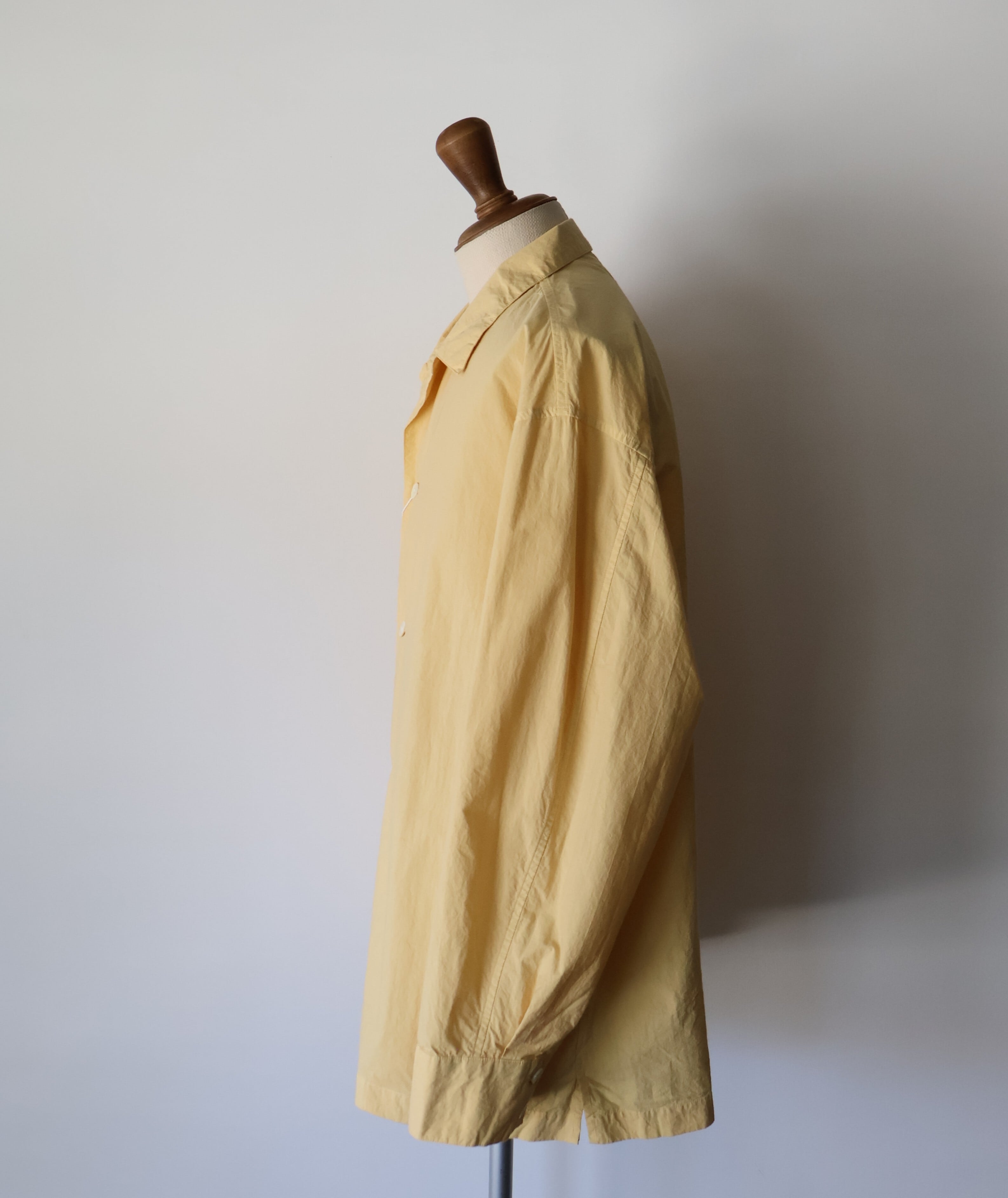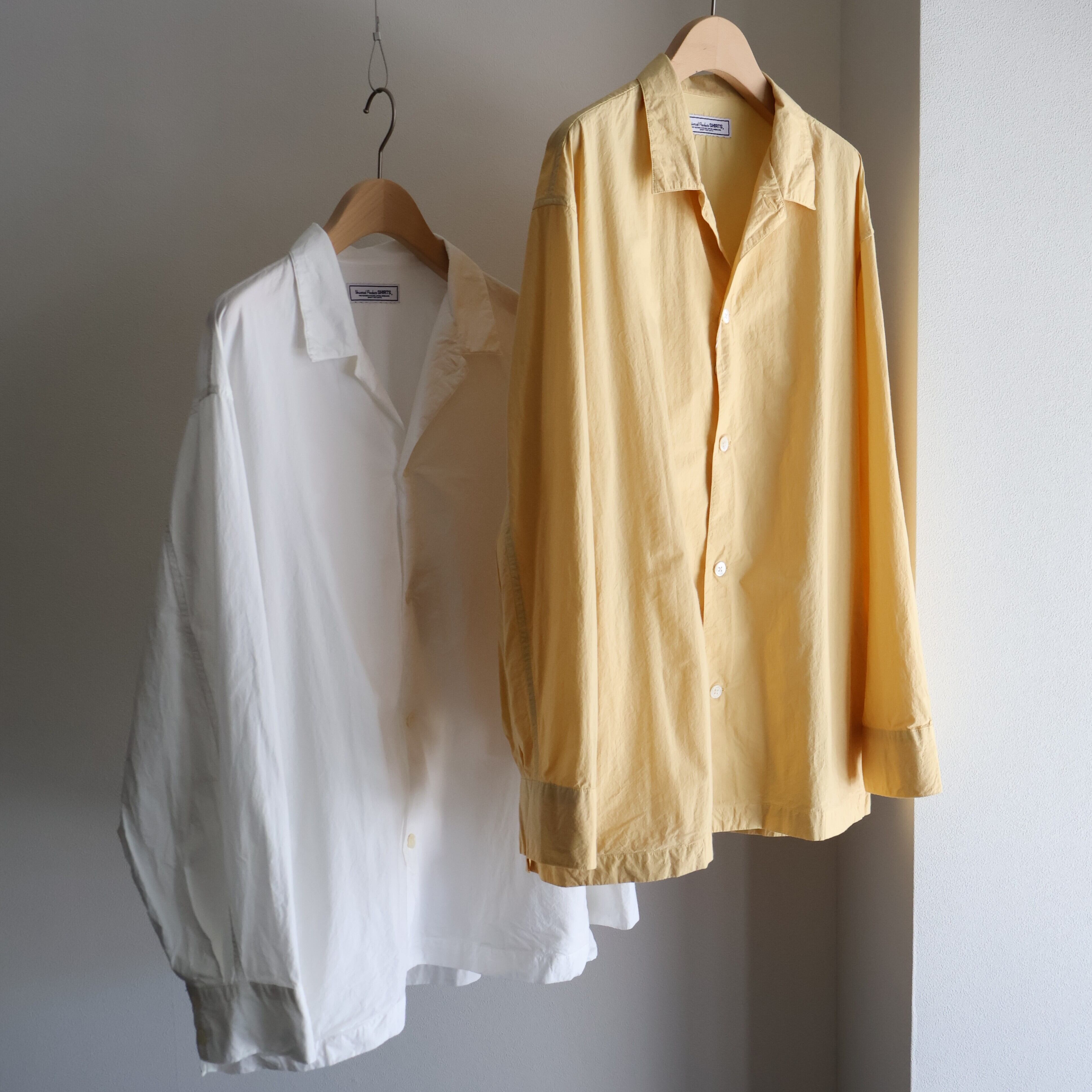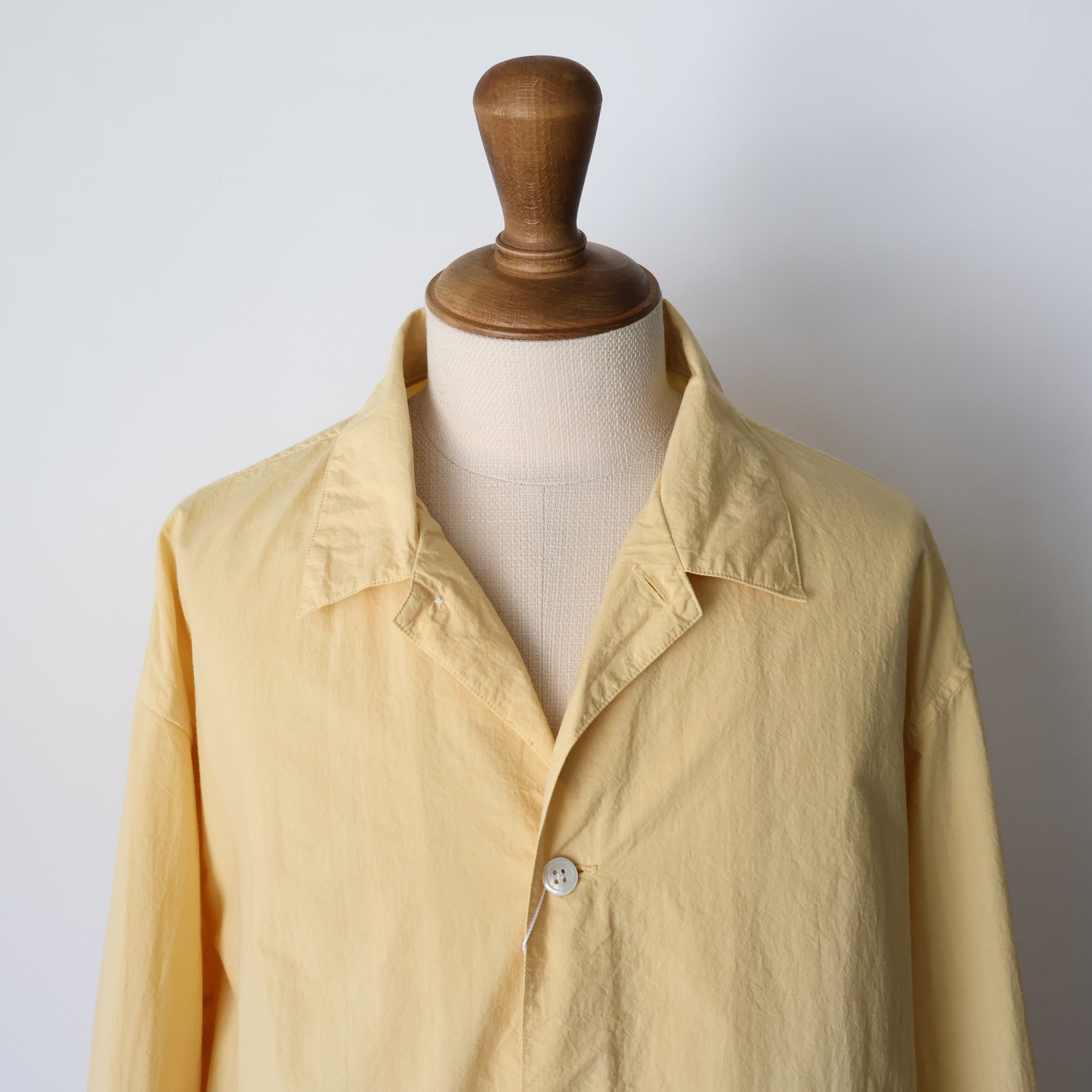 コットンシルクの混紡糸を使用して織られた生地をワッシャーにより柔らかくした生地を使用して製品染をしたオープンカラーのL/Sシャツになります。