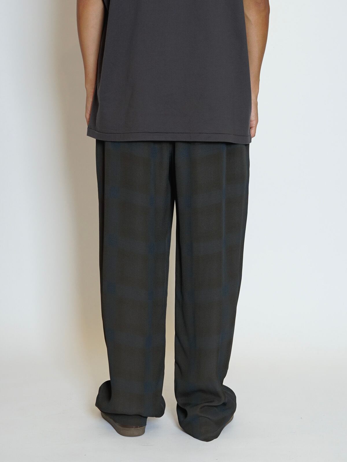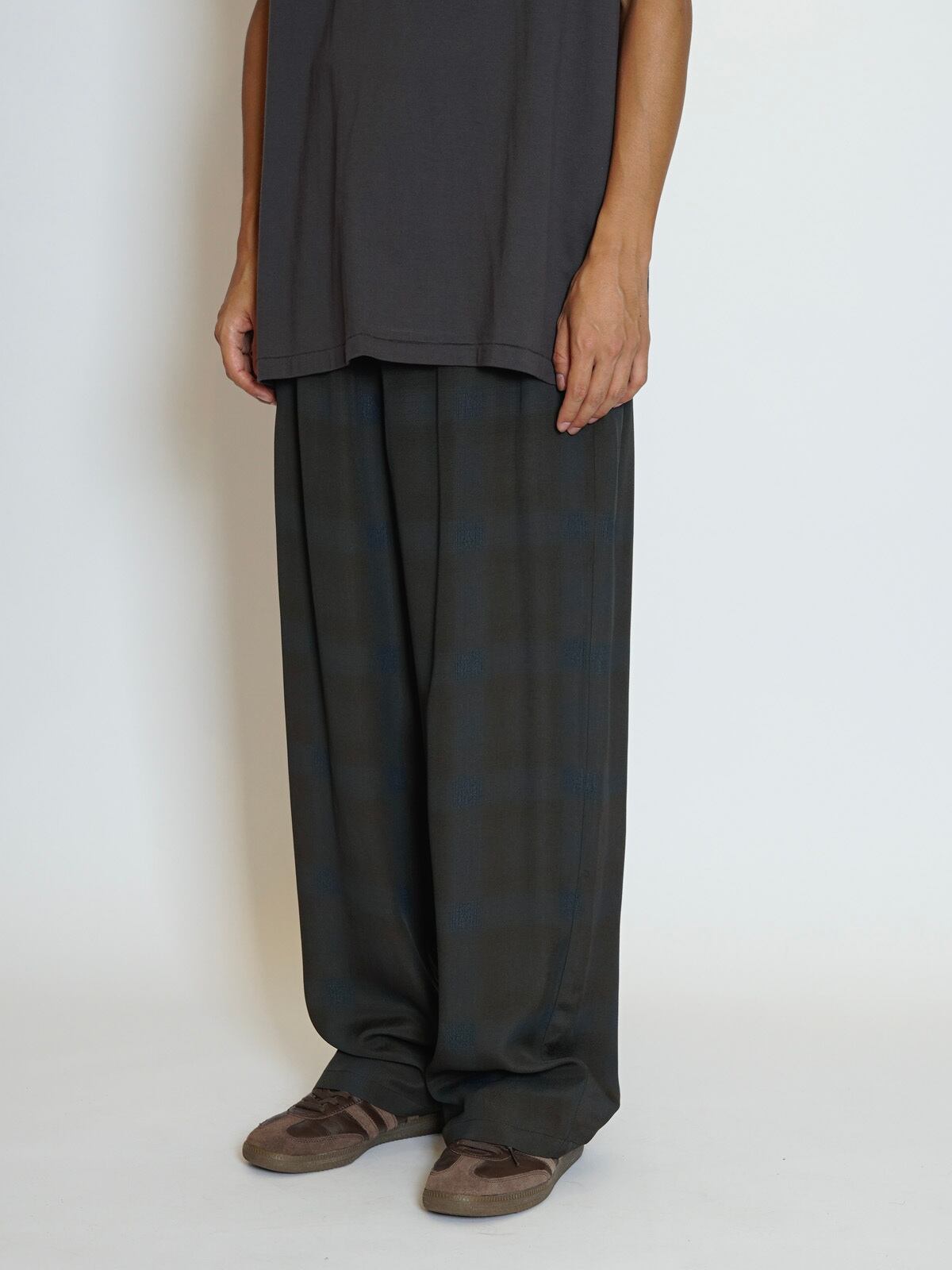 オリジナルで作成したアセテートとレーヨン素材を使った非常に落ち感のあるチェックを使用したラウンジパンツになります。