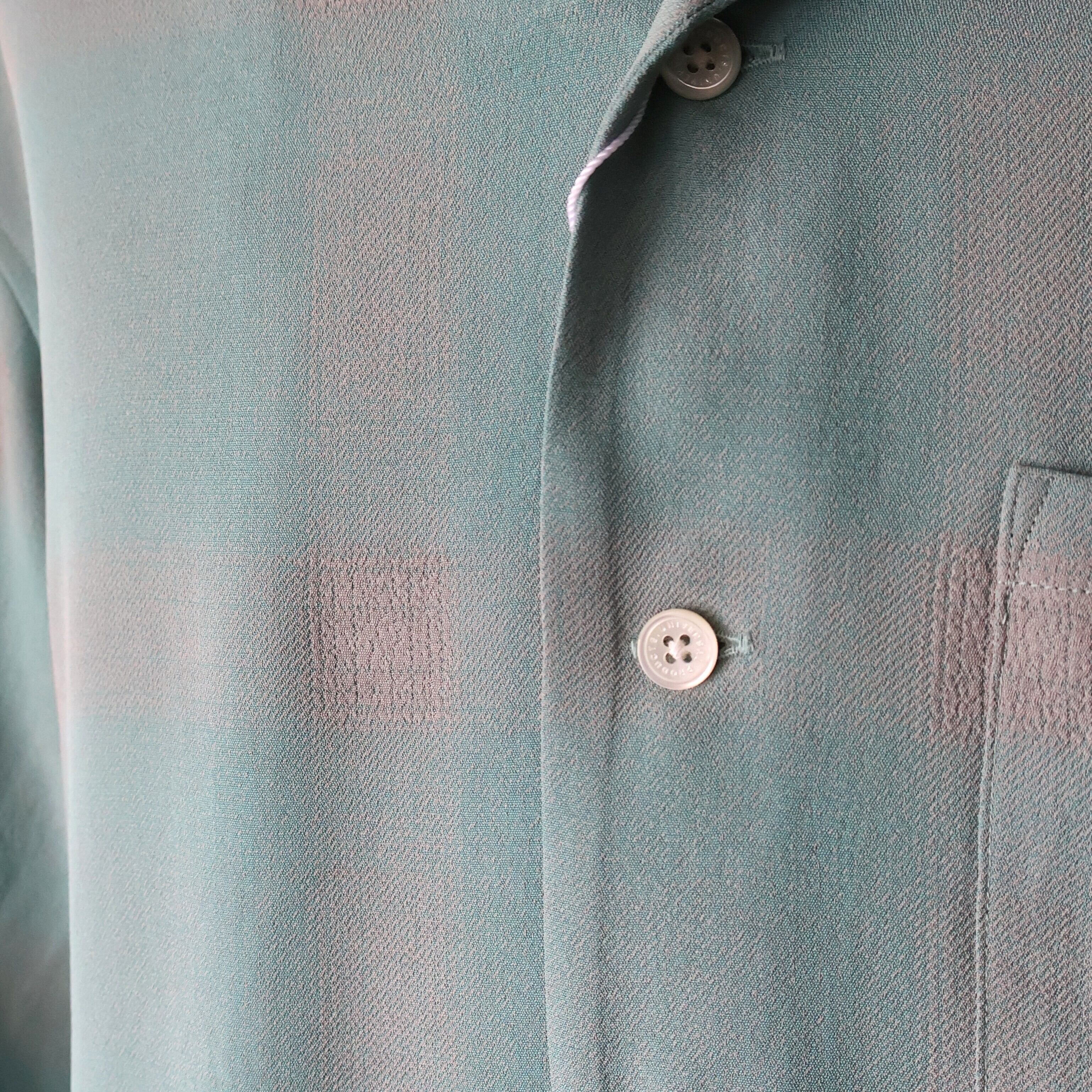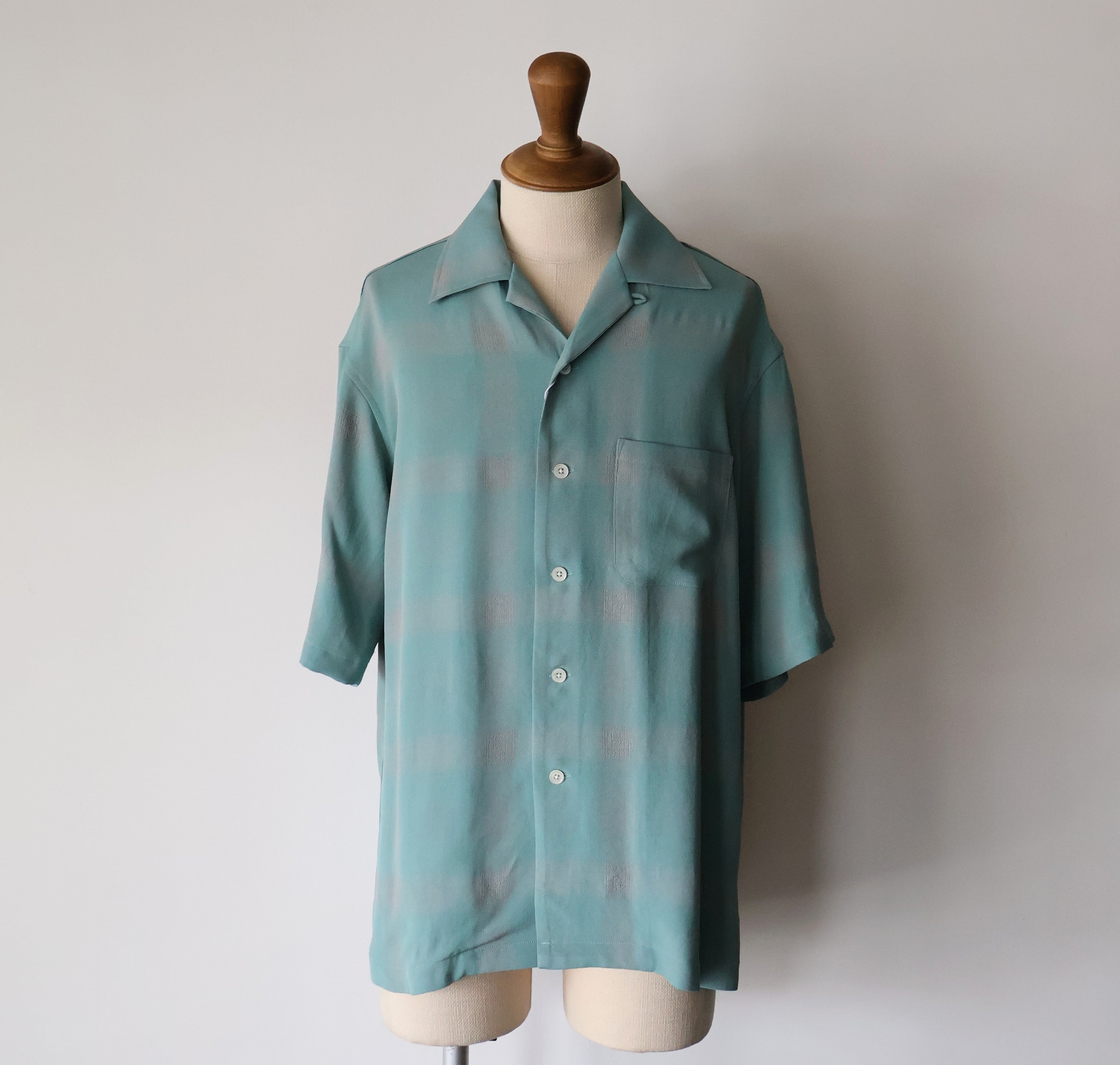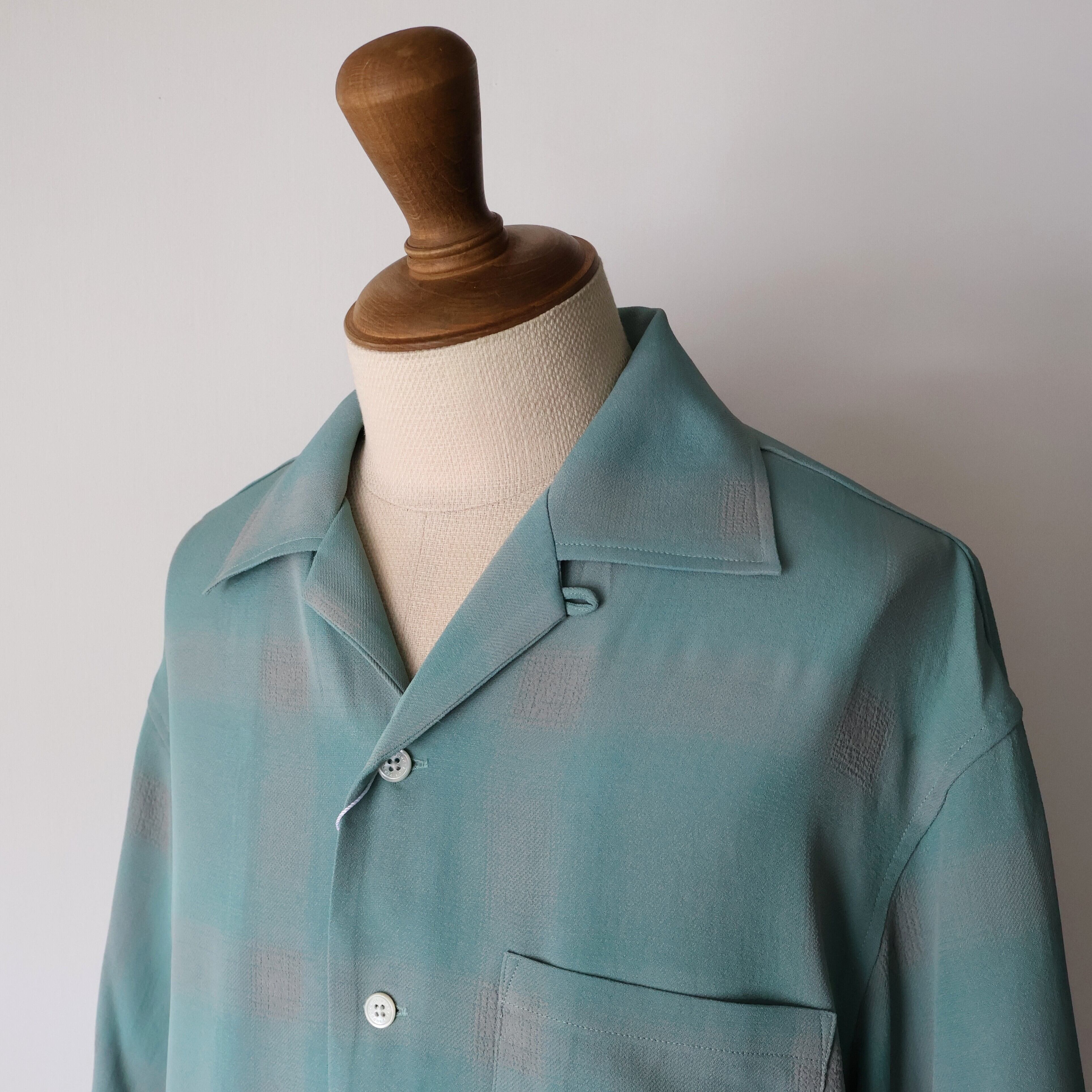 オリジナルで作成したアセテートとレーヨン素材を使った非常に落ち感のあるチェックを使用した開襟シャツになります。
