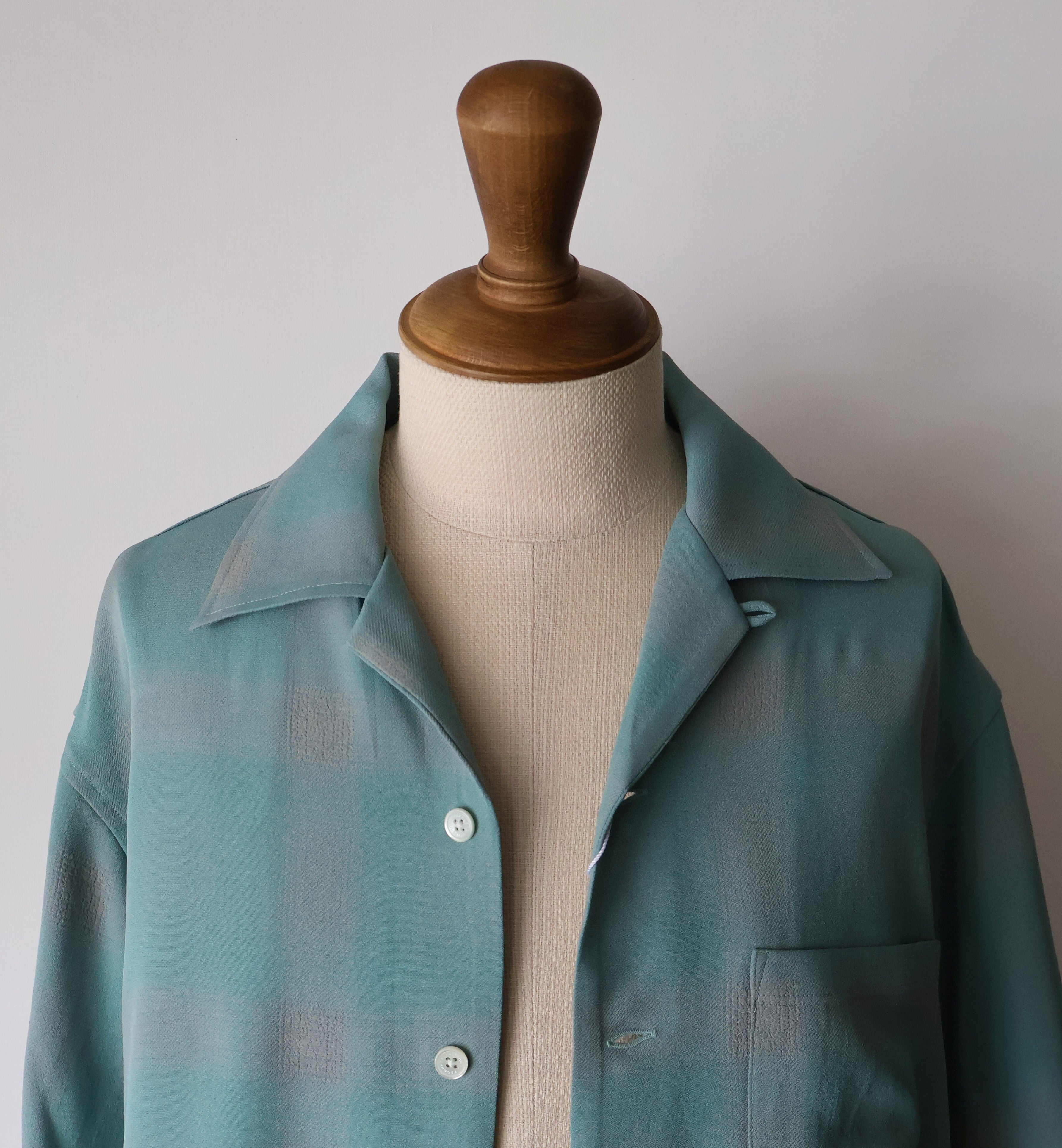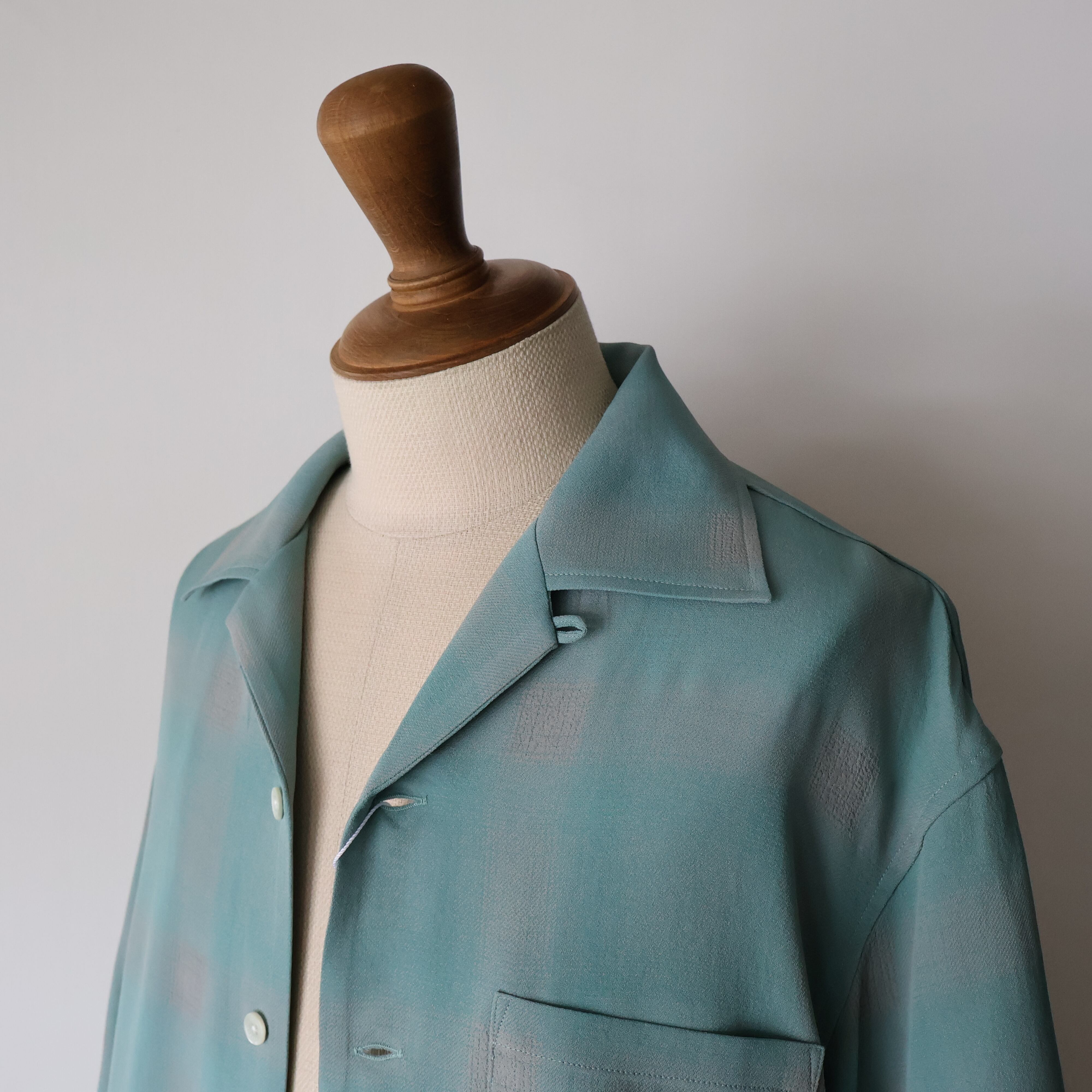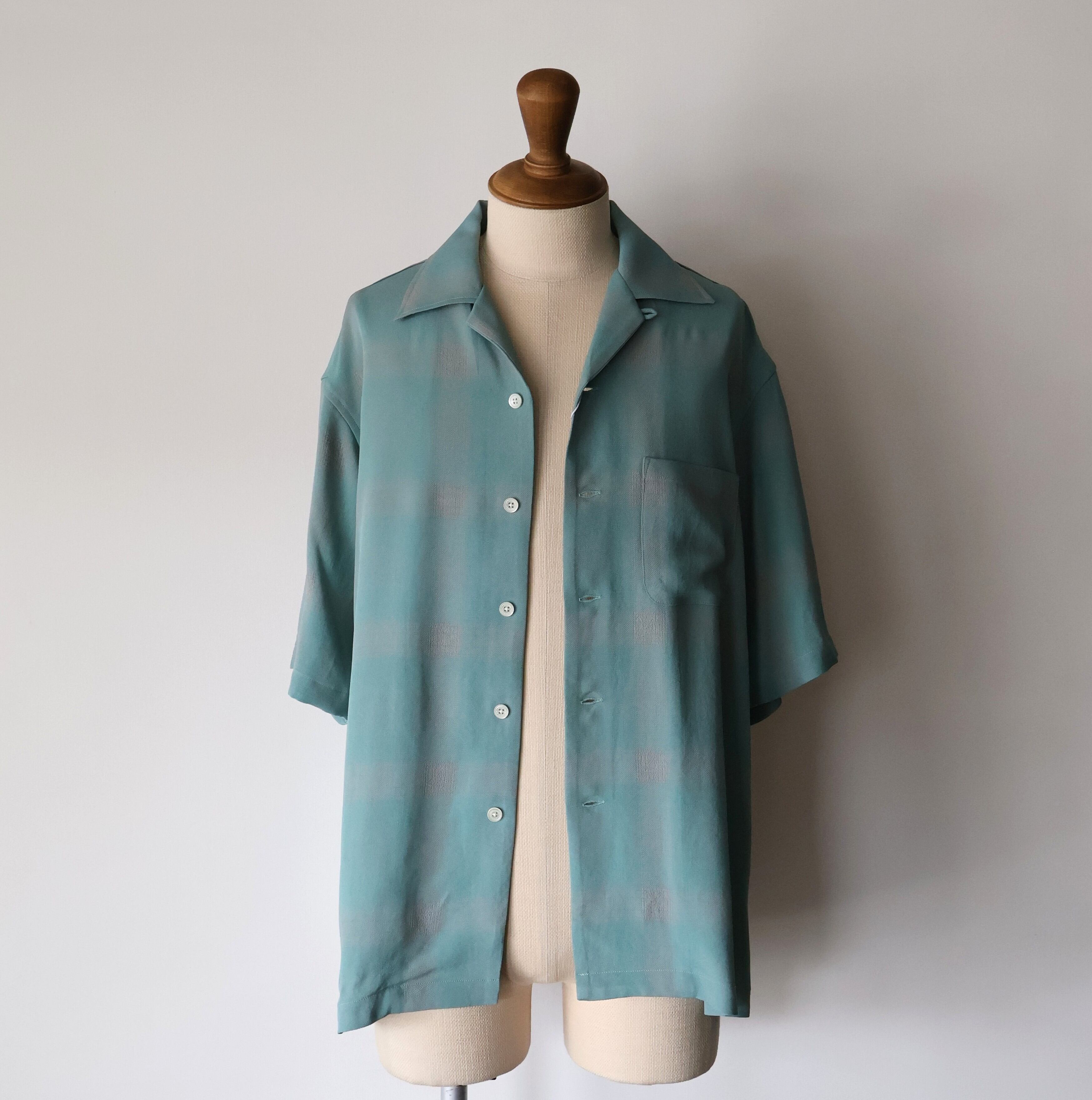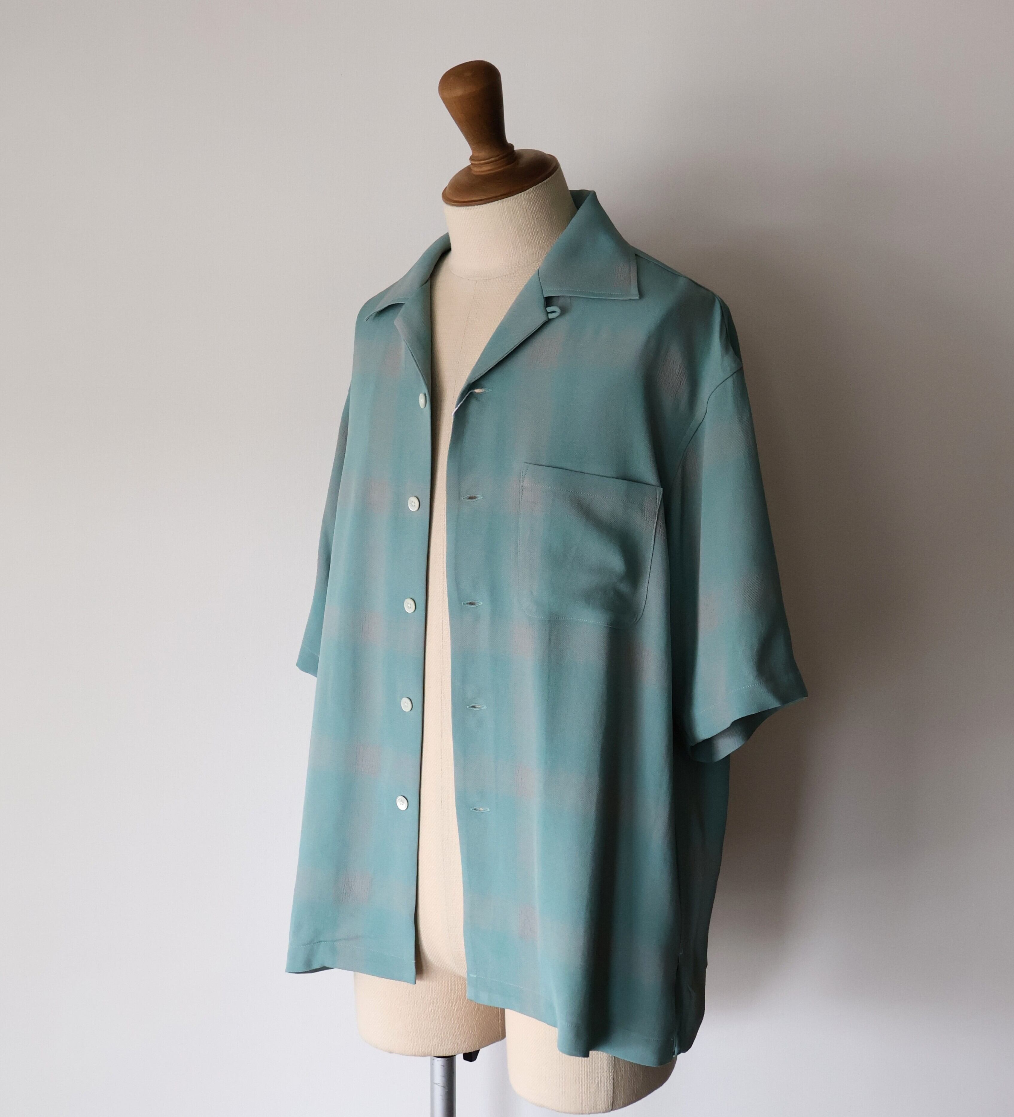 オリジナルで作成したアセテートとレーヨン素材を使った非常に落ち感のあるチェックを使用した開襟シャツになります。