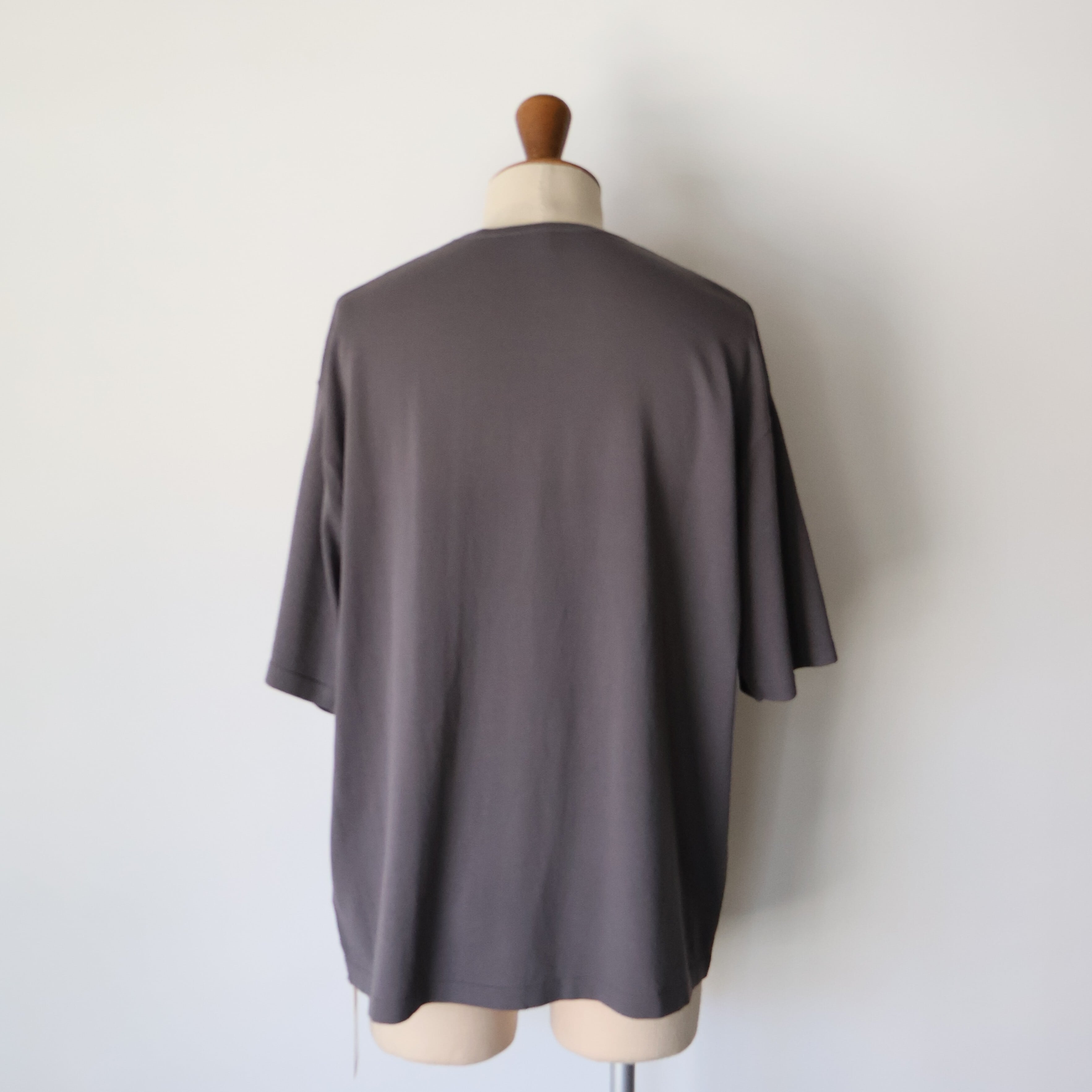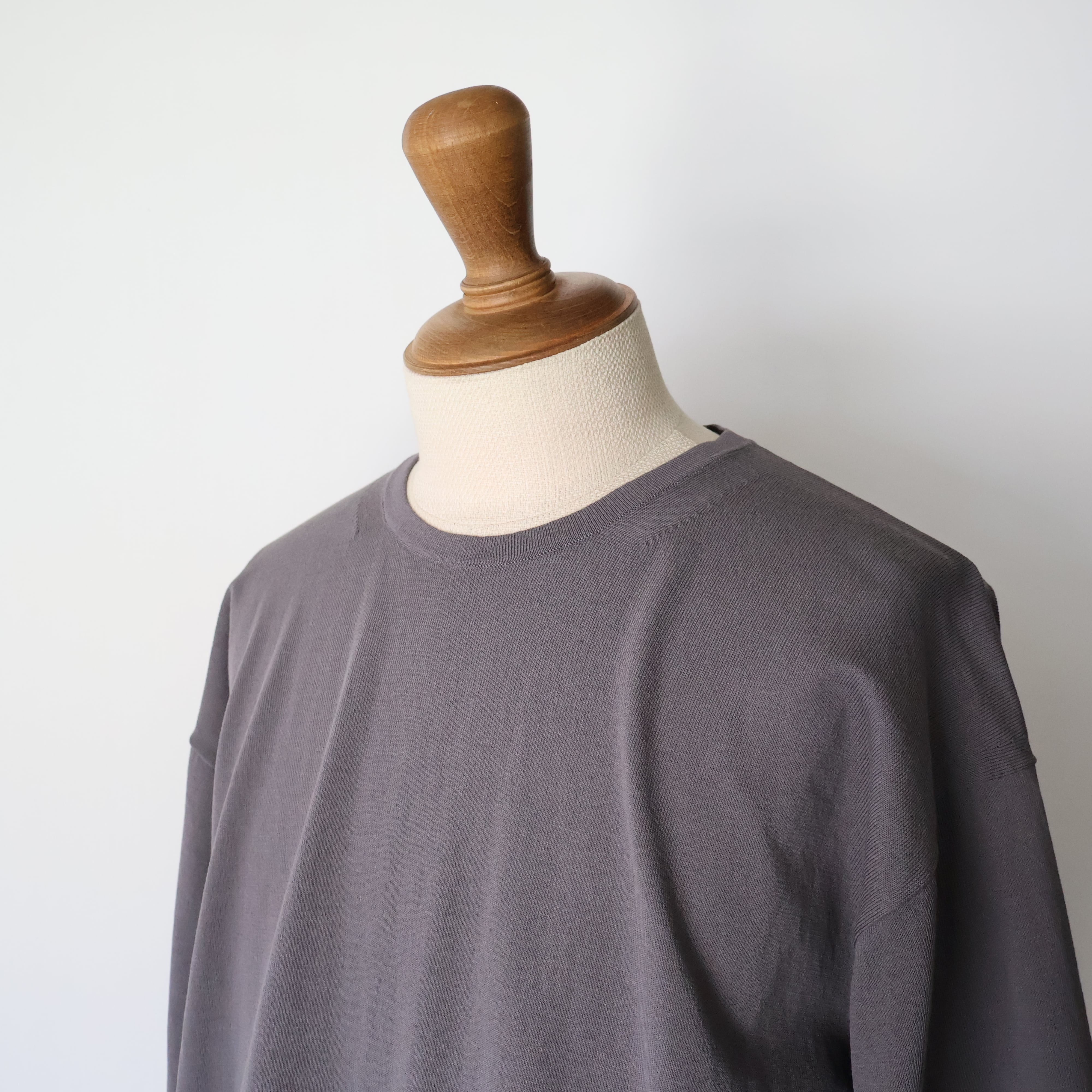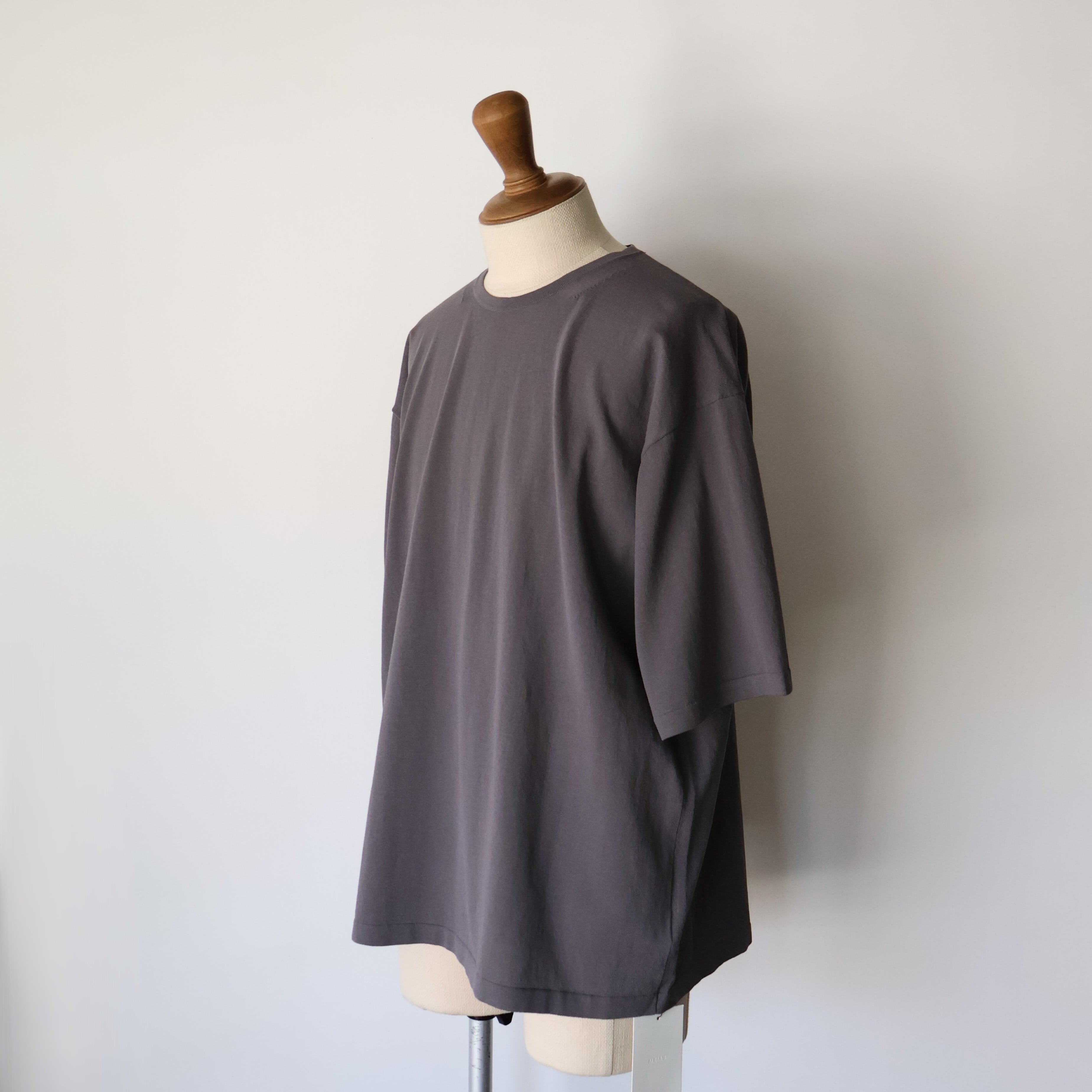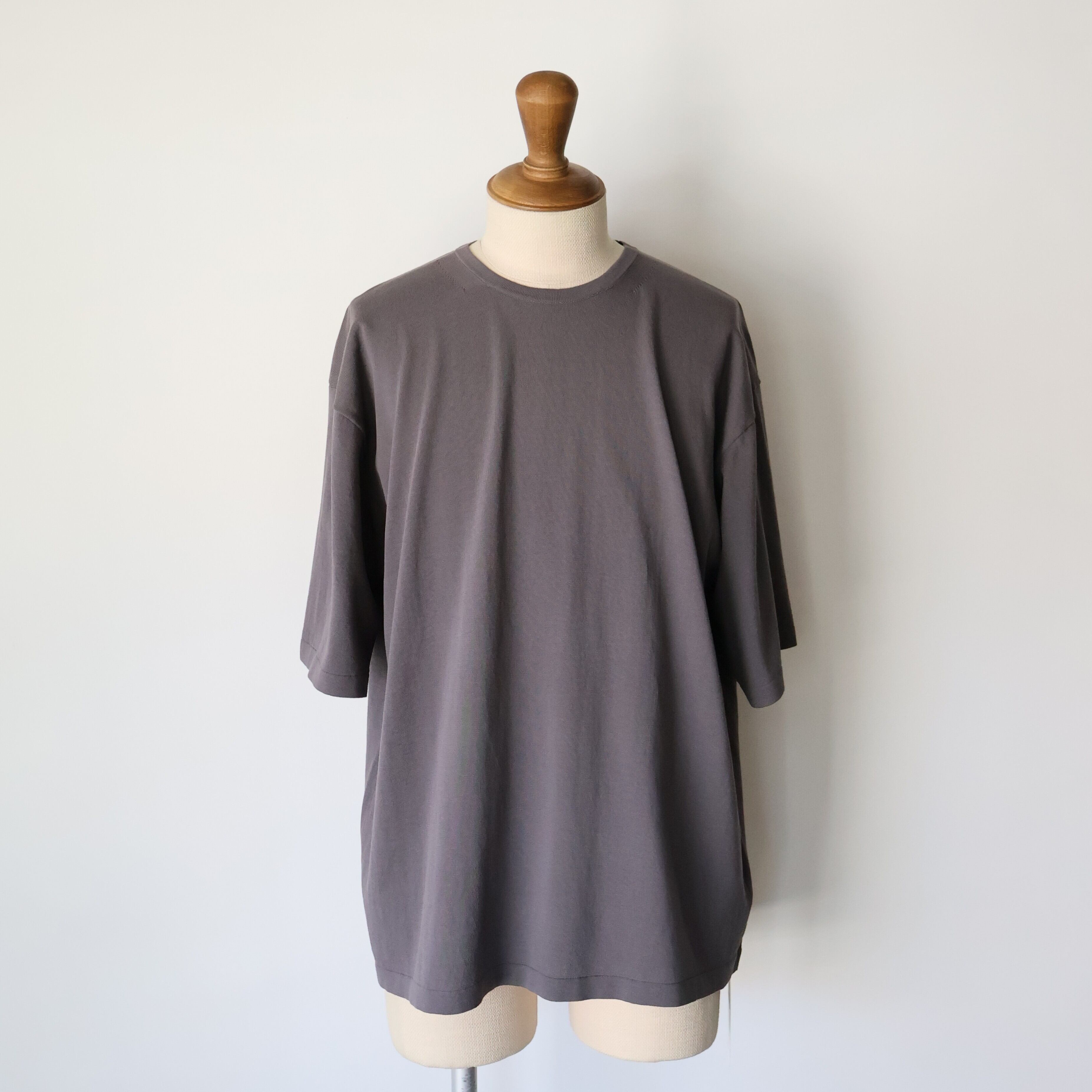ニットでもどこまで美しいシルエットのTシャツを作ることができるのか、を追求し 通常では⾏わない布帛のパターンをおこしてからニットの仕⽴てに設計をしました。