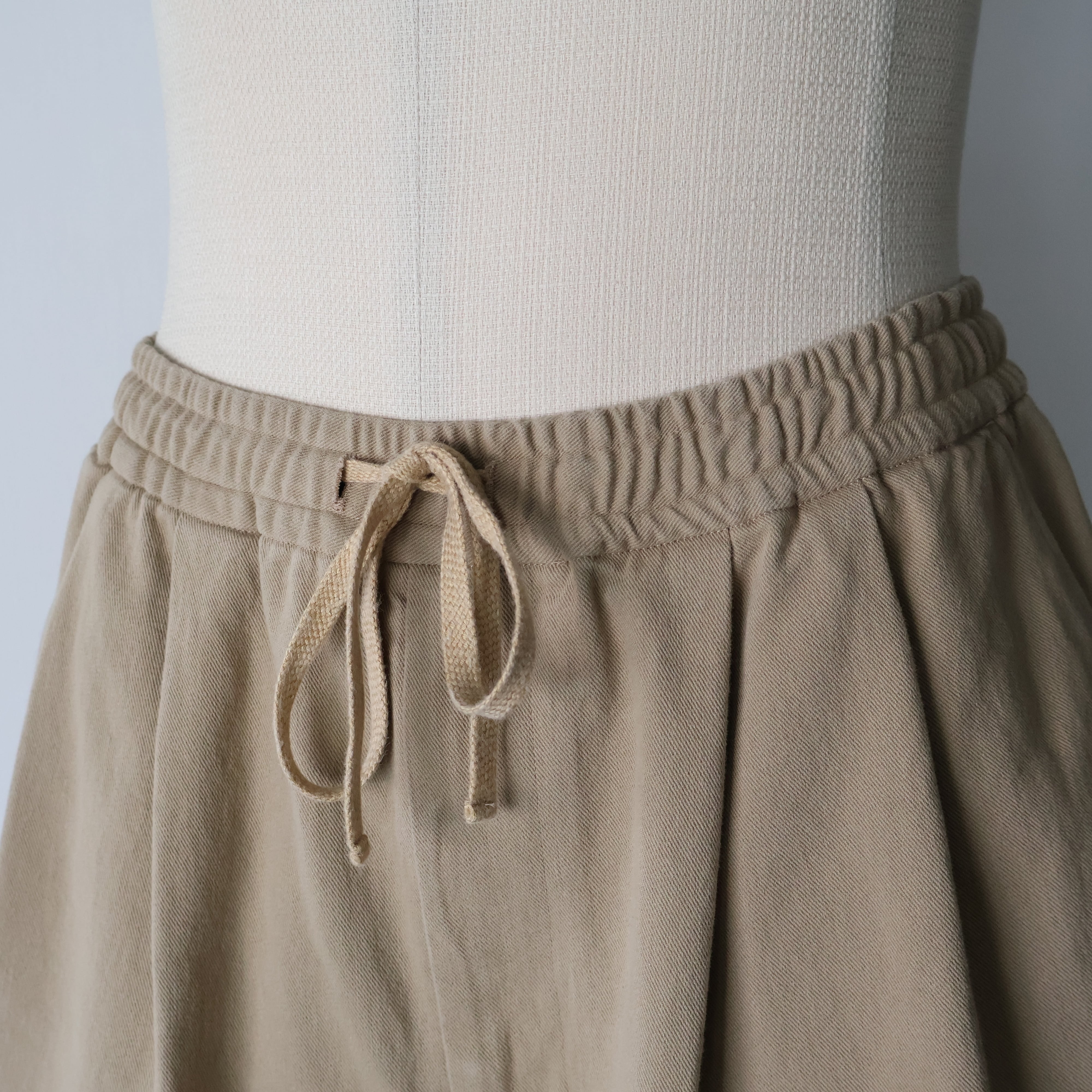 外側に紐が出るドローストリング仕様なので、トップスをタックインした際に良いアクセントになります。茹だる様な暑い夏に穿けるように”肌離れの良い”強燃のコットンツイルが快適です。