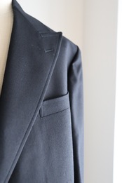 ナチュラルショルダーで自然なフォルムの肩、そしてフロントにダーツがなくボックスシルエットでとても着心地が良い事が最大の特徴。