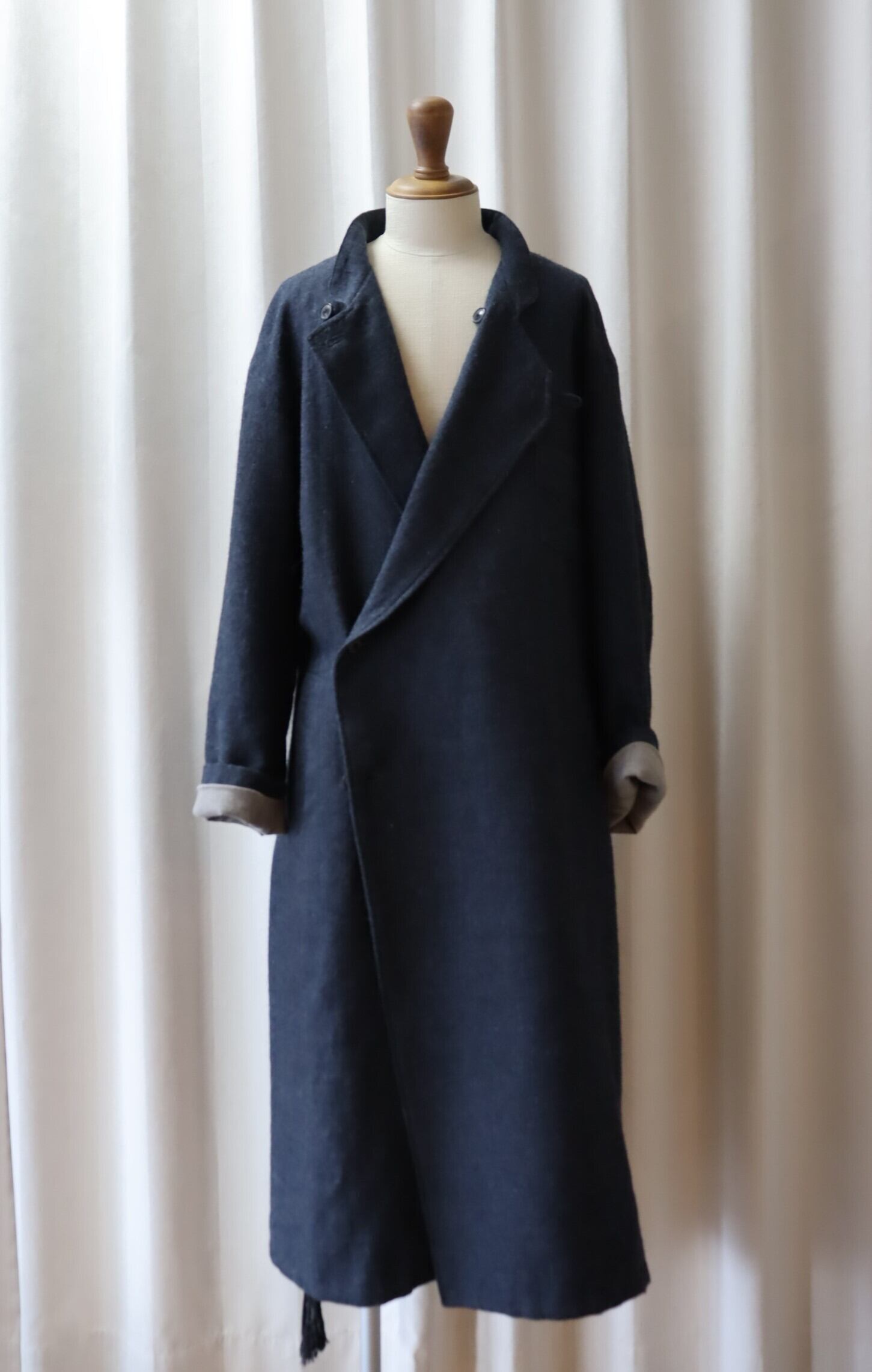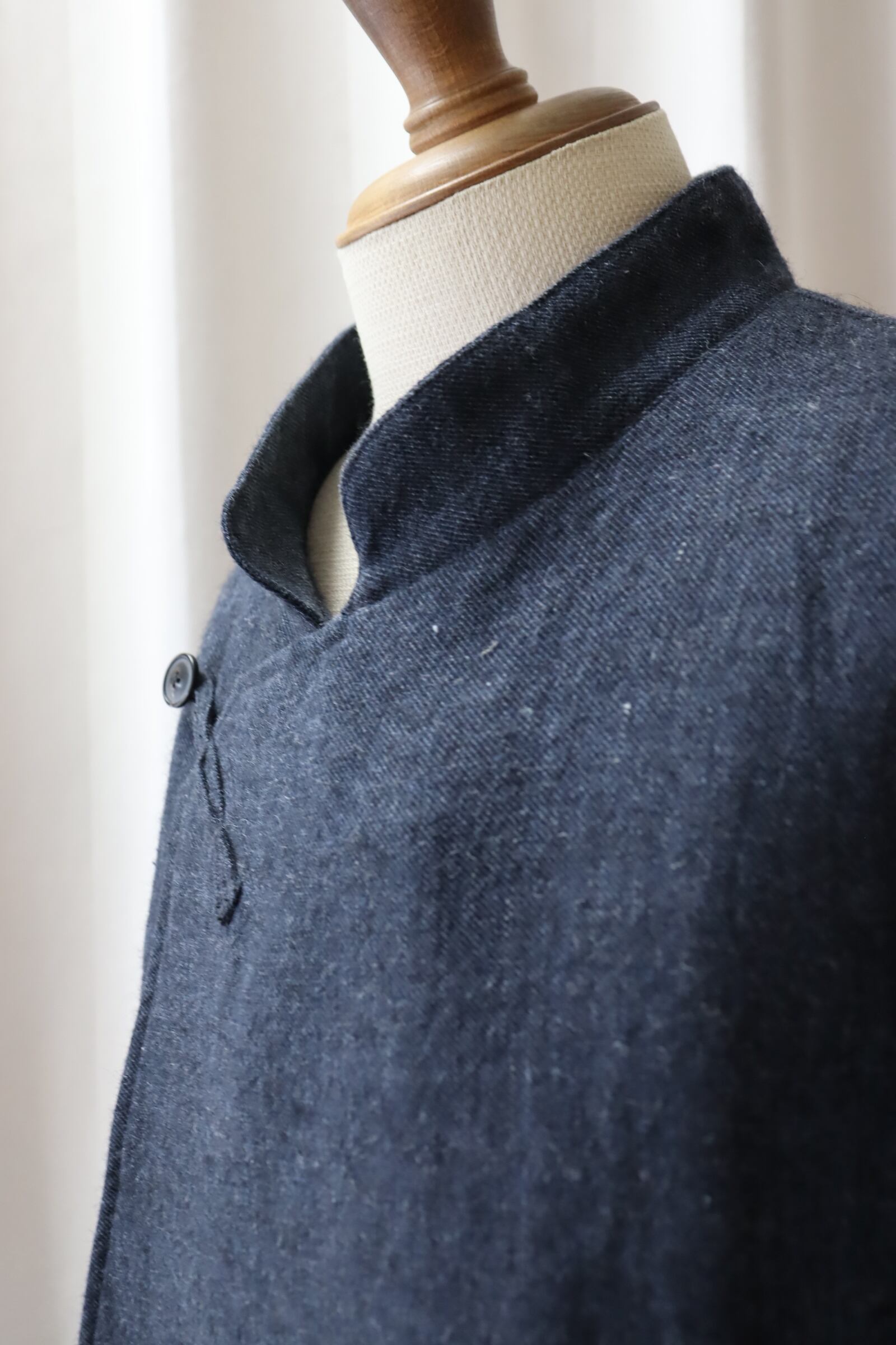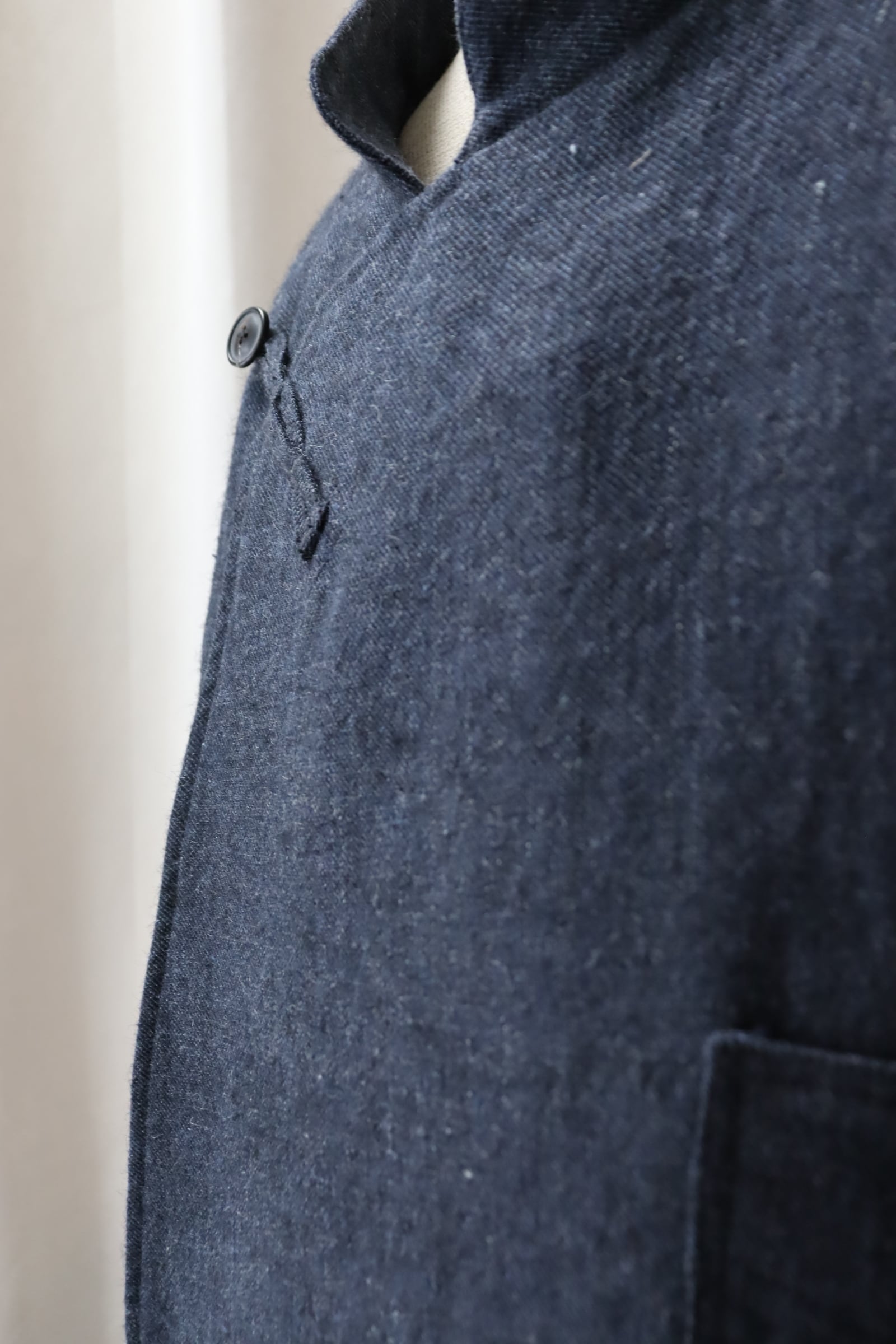表の素材にはシェットランドウール×フレンチリネンの混紡糸を高密度に打ち込み、y適度なハリ感と柔らかさのバランスの取れたレフトハンドツイル生地を使用。着込む事で繊維がほぐれ更に生地に柔らかさや膨らみが現れ、風合いの良いものと成長していきます。裏地にはオーガニックコットンのトップ糸を使用したビエラ生地を使用。オーガニックコットンのトップ糸のもつ柔らかくて膨らみのある風合いを活かし弱起毛をかけ、タッチの良さと保温力の向上をあげております。釦には水牛の角から作られる本水牛ボタンを使用しています。