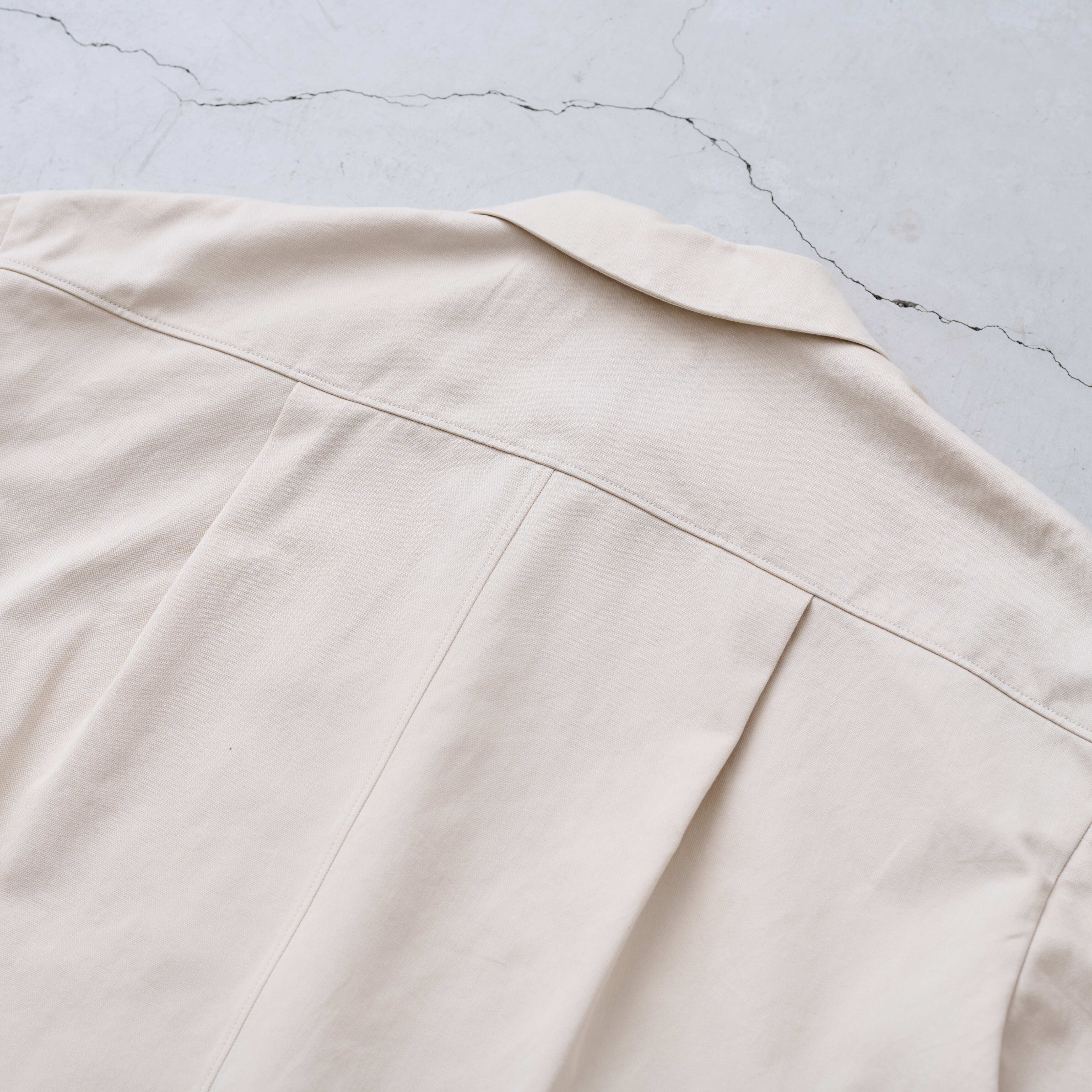 ファブリックは経緯全てにアルティメイトピマを使用したシャンブレーラチネ。しっかりと油分を含みながらもシーアイランド由来のパツッとした質感が特徴のハイグレードオーガニック綿原料。そんな贅沢な原料を同色トーンで糸染め、経緯複雑な交織で色味に奥行きをもたせています。仕上げにウェットタンブラーを生地段階で施しており、エッジの効いた縫いたてのニュアンスを残しながら、生地の風合いは初めからワンウォッシュで腰を抜いているので最初からこなれた表情になっております。ウェイトは中肉でオールシーズン幅広くお召しになっていただけます。ショート丈なので横に少し寸法を出しています。敢えて大きな変化や意匠は