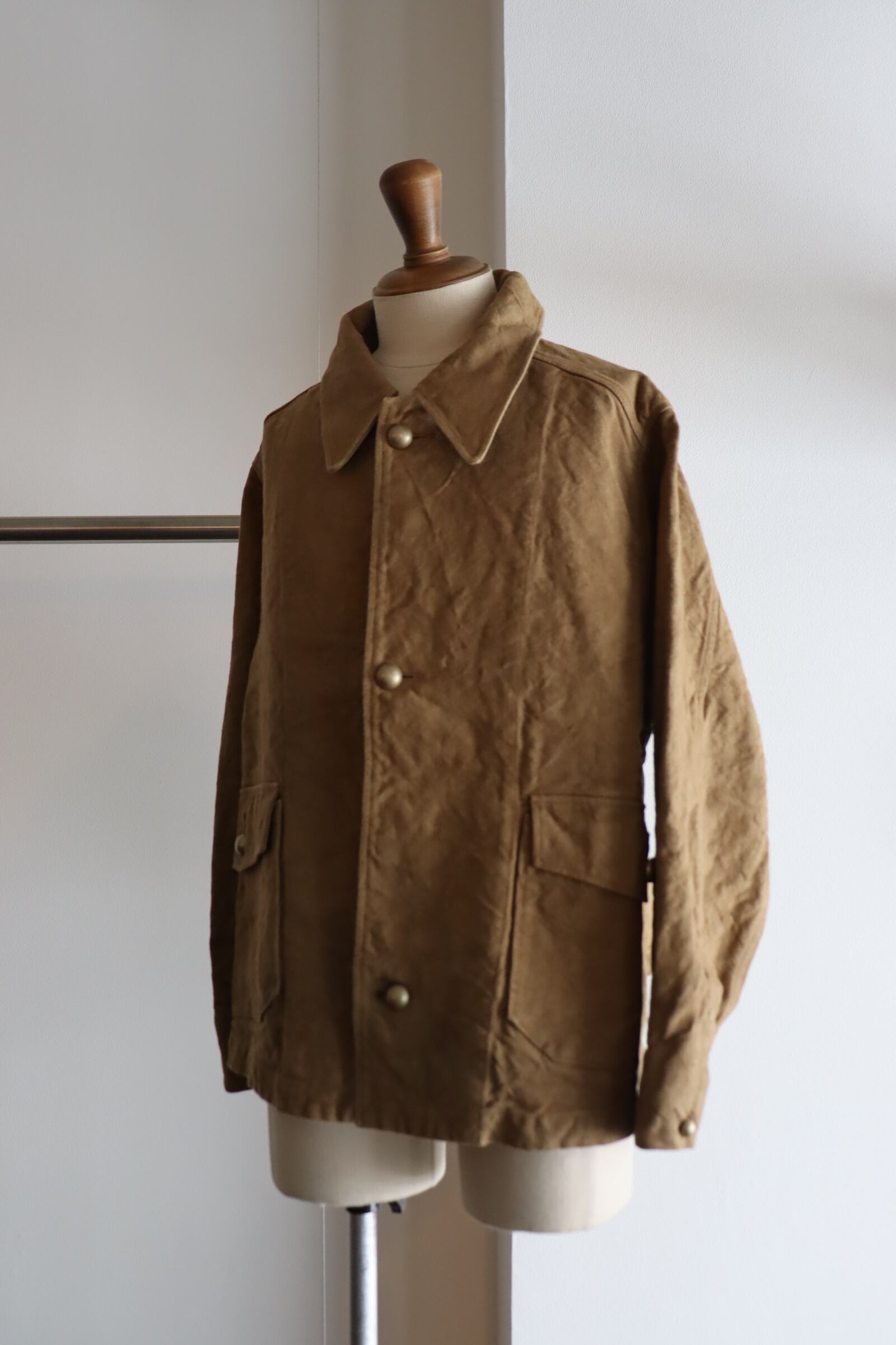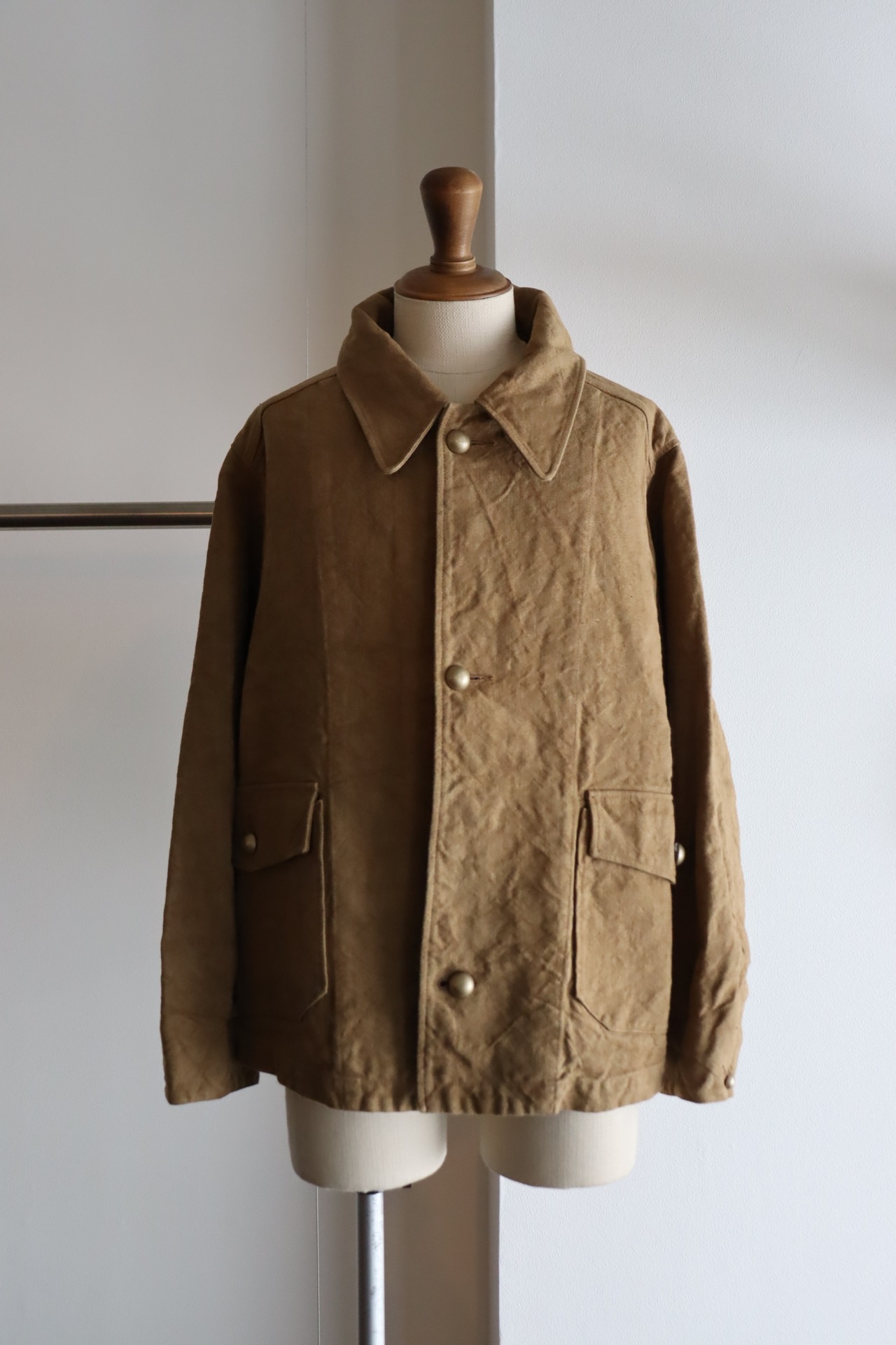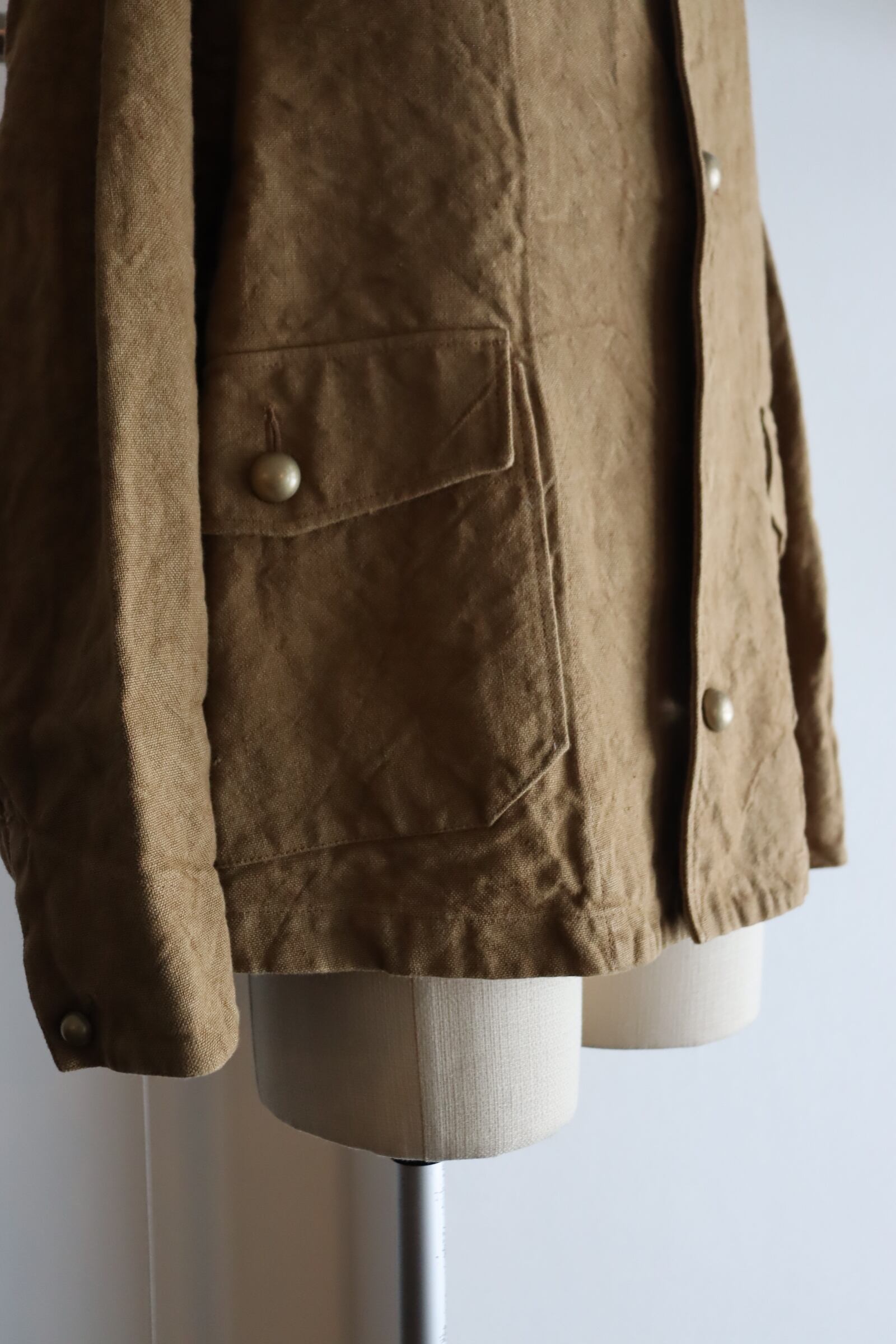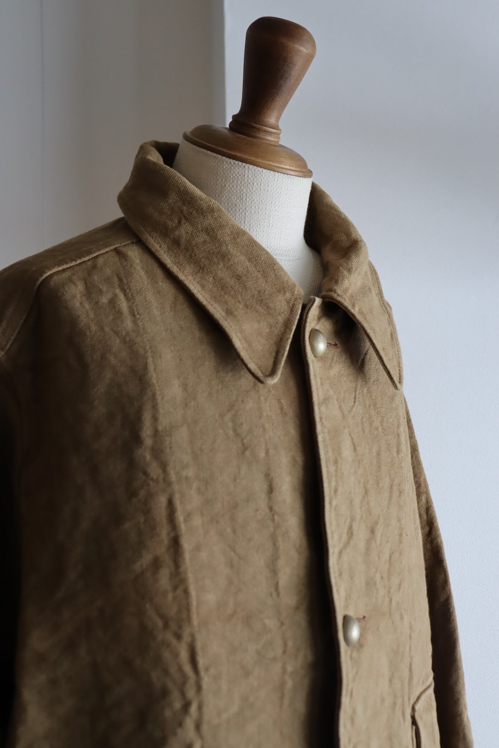 フランス軍のモーターサイクルコートであるM-35をモチーフに、ショート丈にリファイン。生地にはベルギー産のリネンを使用し、微妙に太さの違う3本の太い糸を撚った三子糸を、古い織機で織り上げ、天日干しで独特な凹凸感を演出し、非常に雰囲気ある1着に仕上げております。