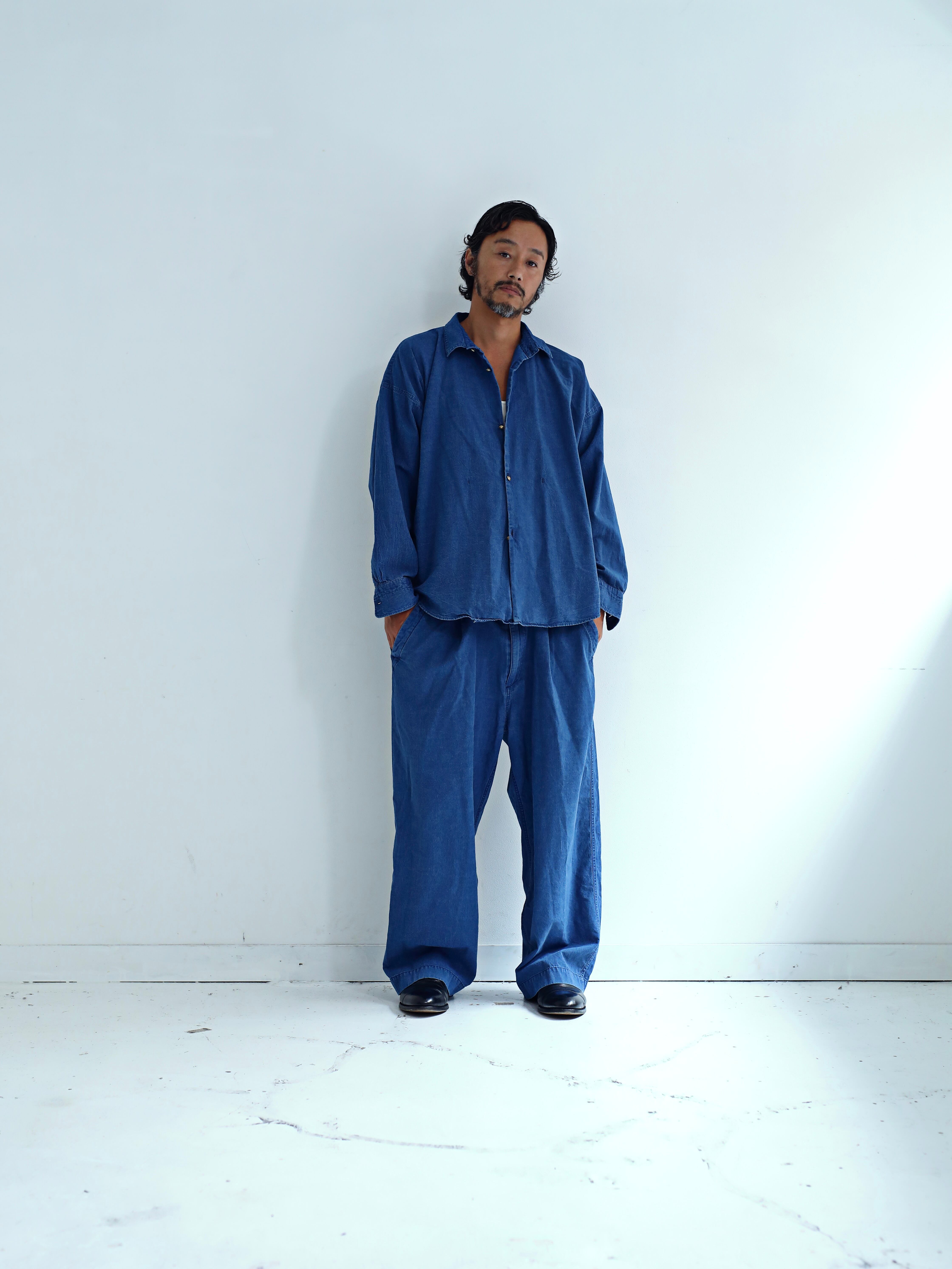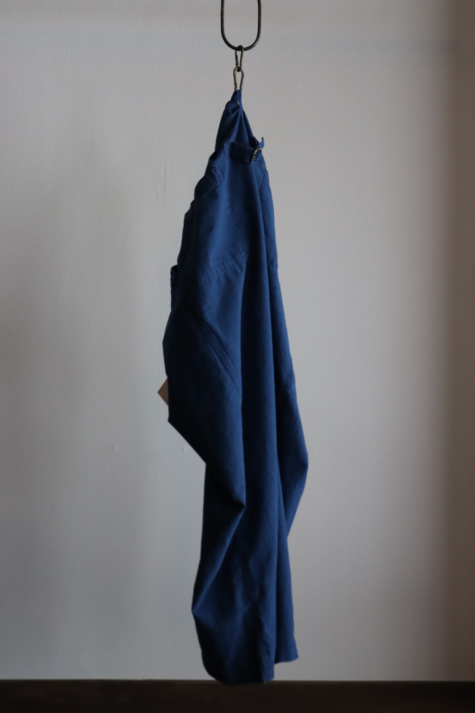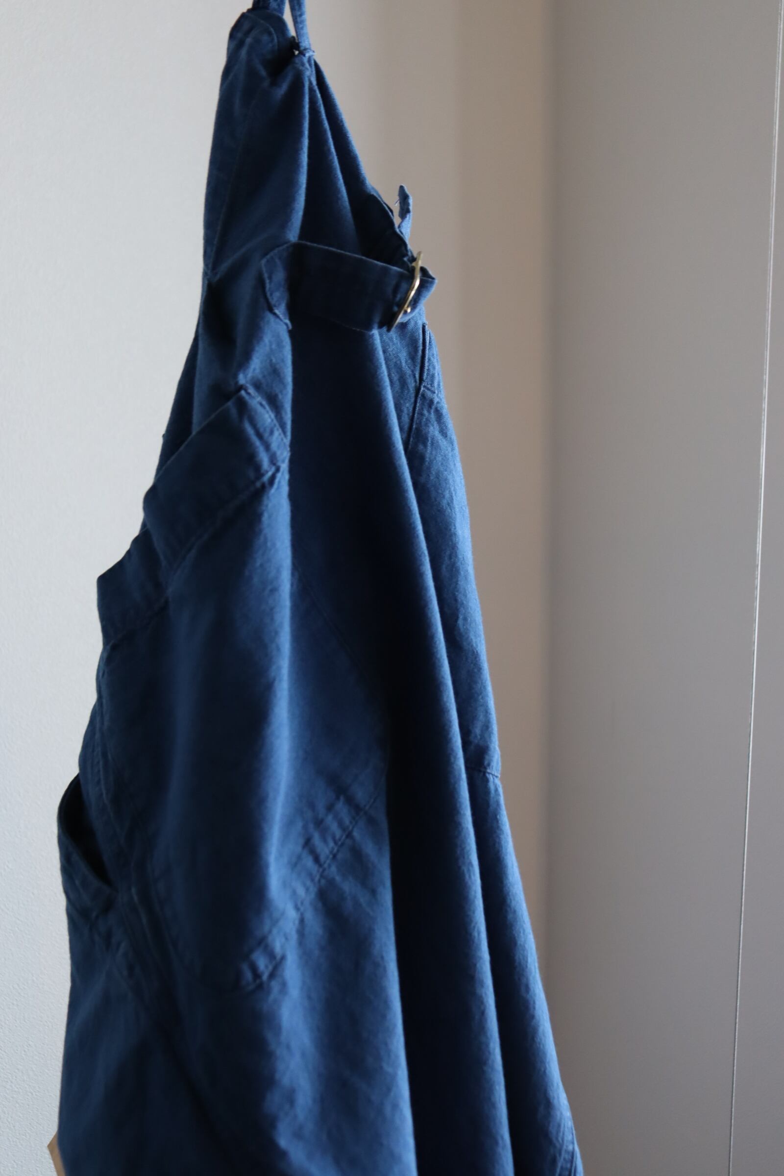 Gurank定番のシルエットのワークトラウザーです。テーパードしない太めのシルエットで独特のドレープ感。あえて大きめのウエストに仕上げ、ベルトで絞ってもらうように提案していますが、バックルバック仕様なのでウエストの調整が可能になっています。通常のシャンブレーですと、タテ糸に色糸、ヨコ糸に白糸を使用するところを、縦横ともにムラ糸のインディゴ糸を使ったベタシャンですが、縦横それぞれのインディゴの濃さを微妙に変えることで立体感を演出しております。