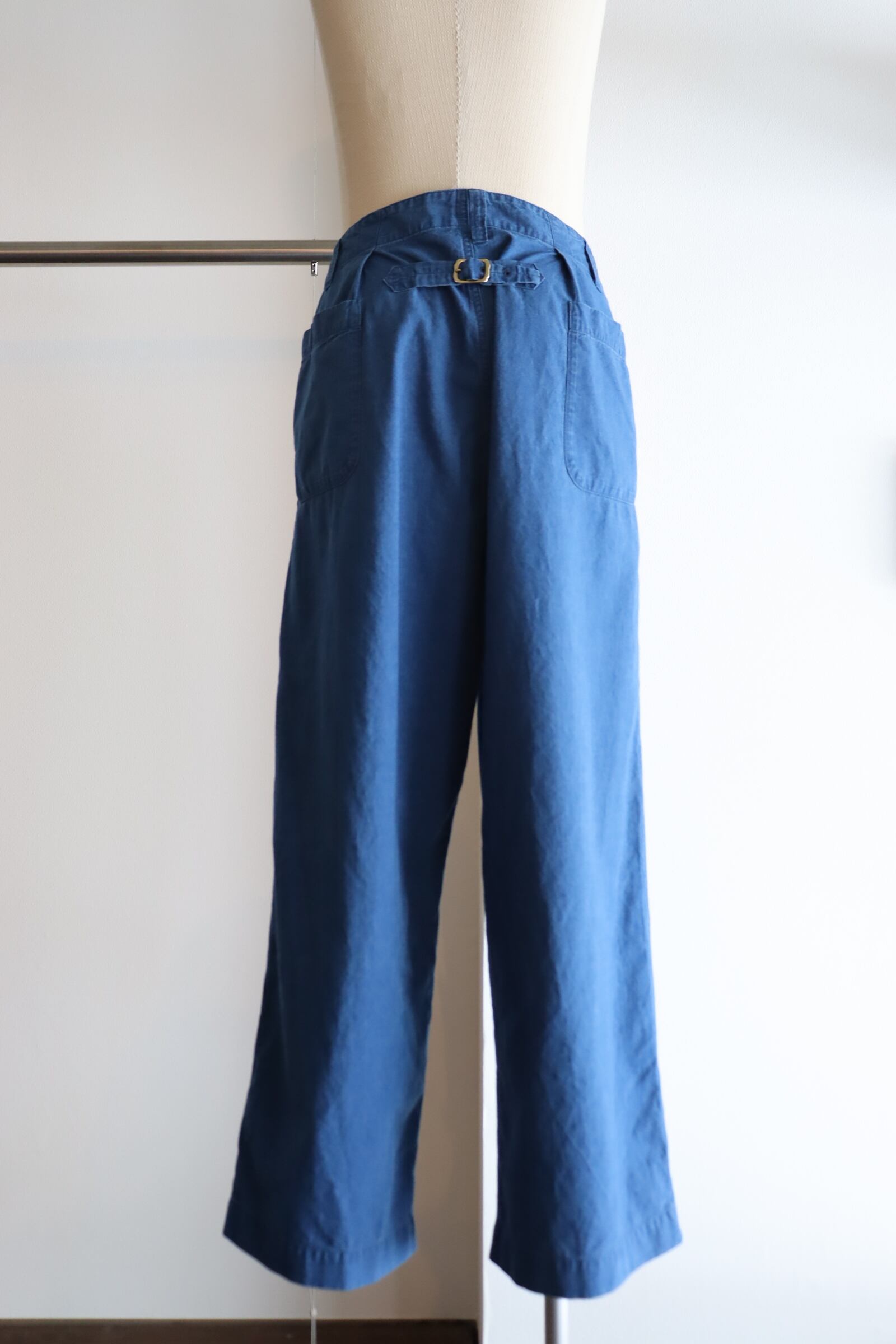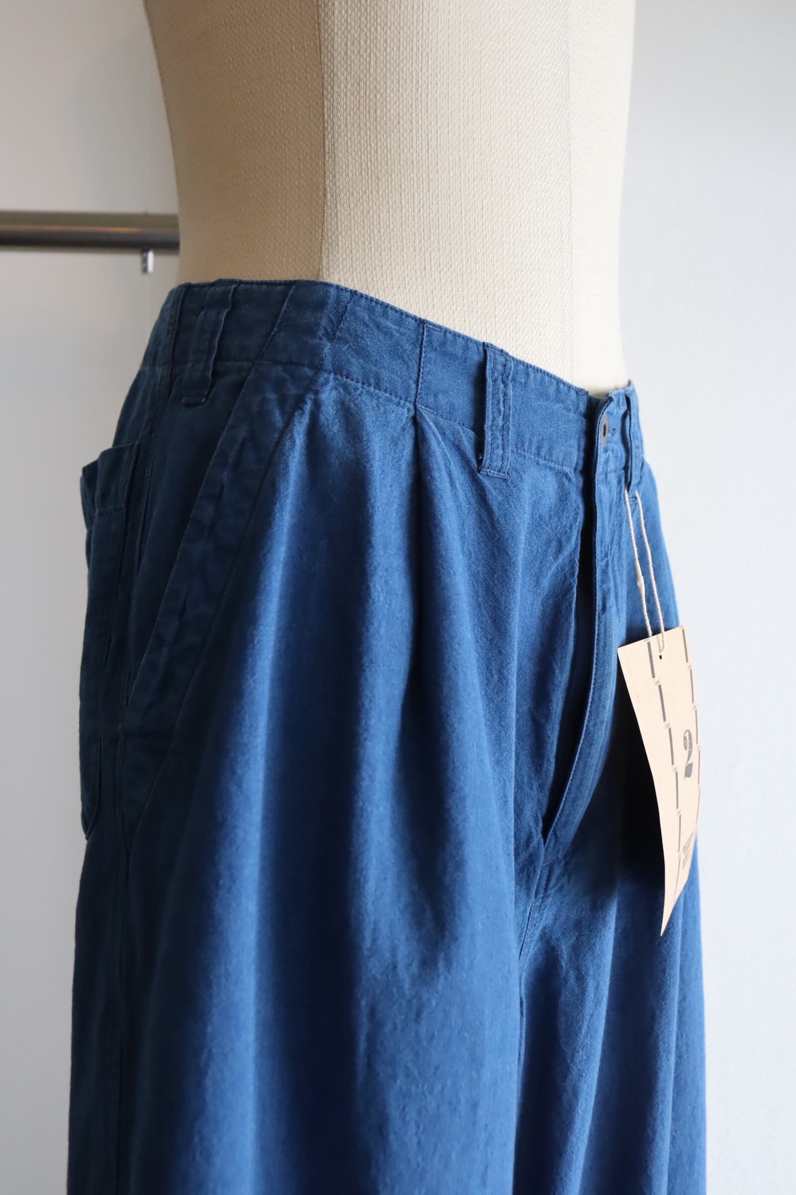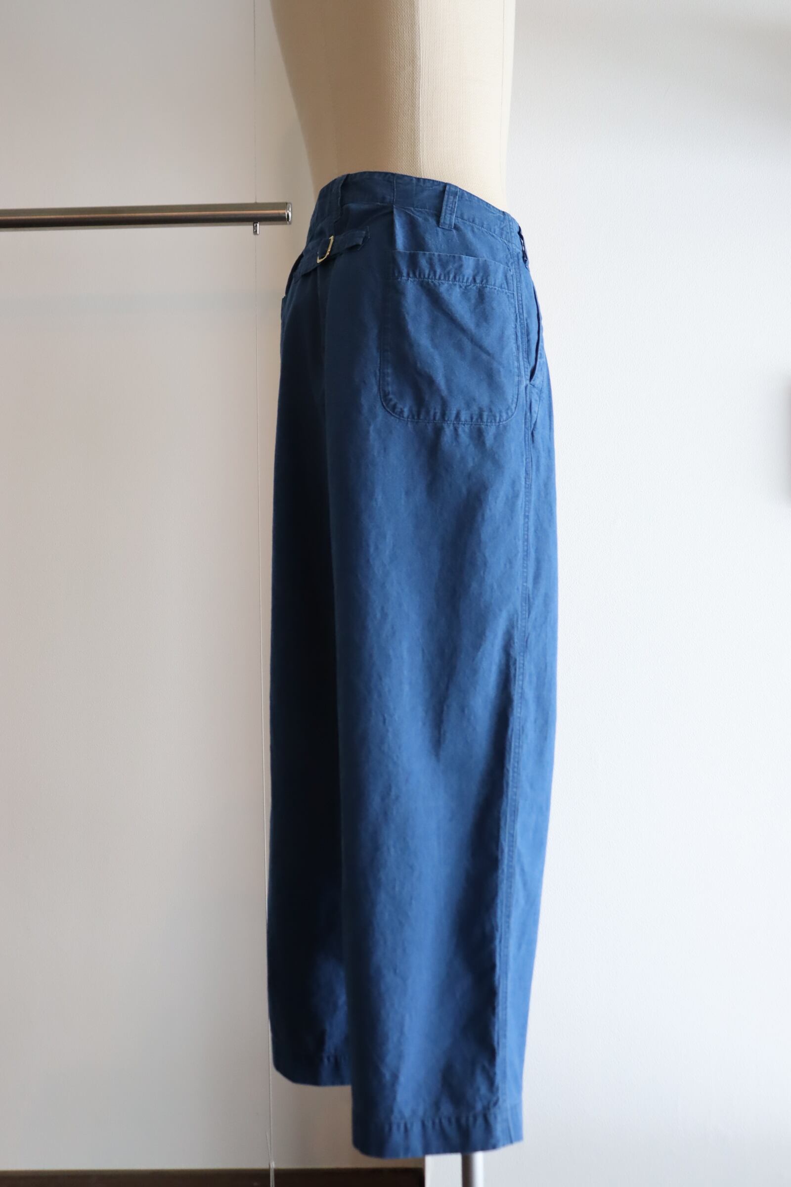 Gurank定番のシルエットのワークトラウザーです。テーパードしない太めのシルエットで独特のドレープ感。あえて大きめのウエストに仕上げ、ベルトで絞ってもらうように提案していますが、バックルバック仕様なのでウエストの調整が可能になっています。通常のシャンブレーですと、タテ糸に色糸、ヨコ糸に白糸を使用するところを、縦横ともにムラ糸のインディゴ糸を使ったベタシャンですが、縦横それぞれのインディゴの濃さを微妙に変えることで立体感を演出しております。
