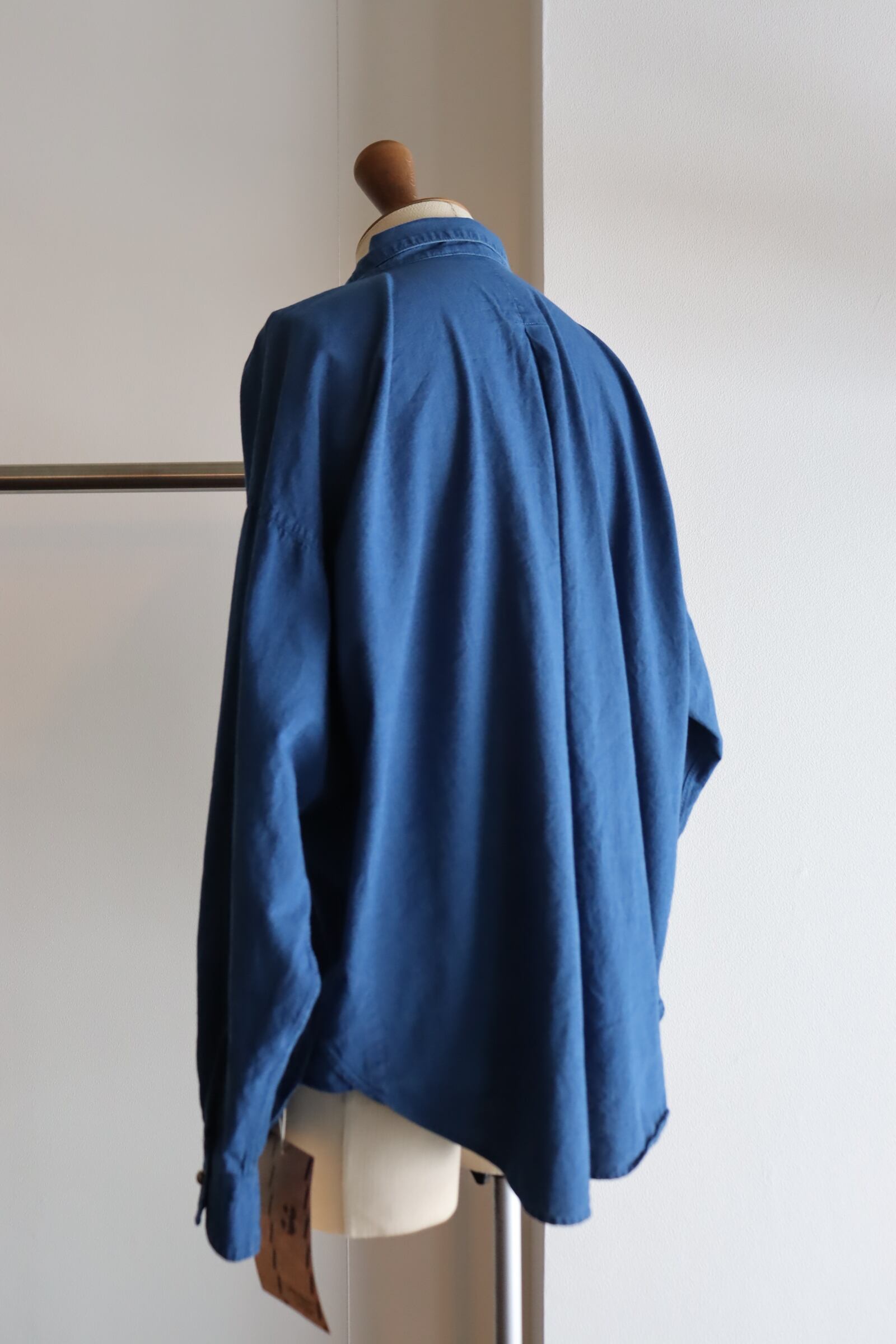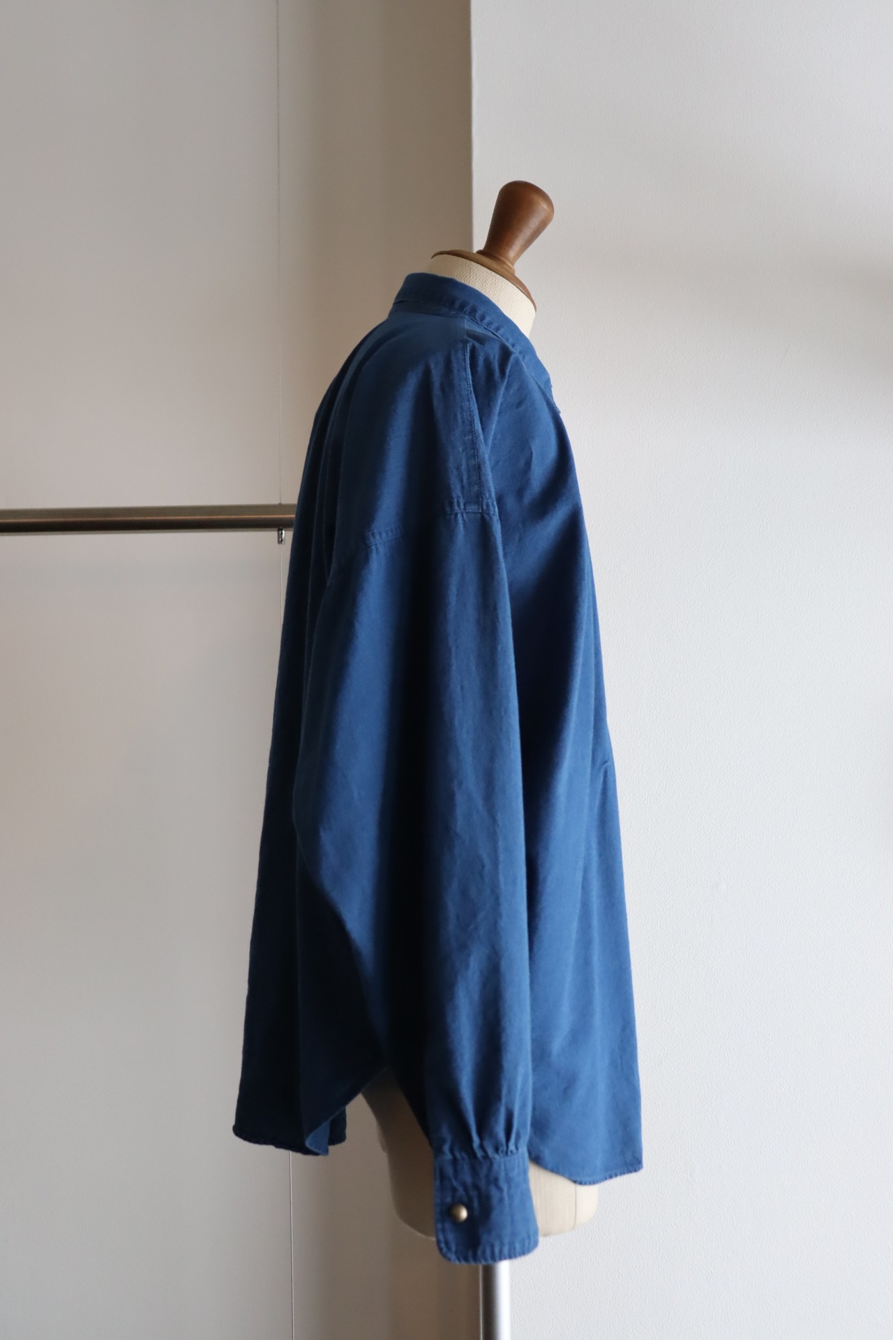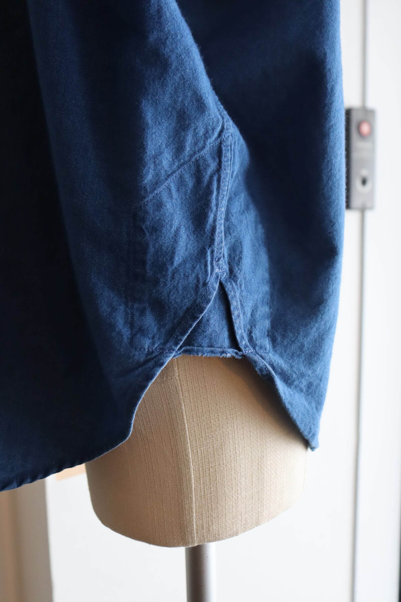 素材には風合いのあるベタシャンを使用。通常のシャンブレーですとタテ糸に色糸、ヨコ糸に白糸を使うところを、縦横ともにムラ糸のインディゴ糸を使ったベタシャンですが、縦横それぞれのインディゴの濃さを微妙に変えることで立体感を演出しております。機能性も含め、パターンの細部にこだわりのある羽織れるシャツとなります。