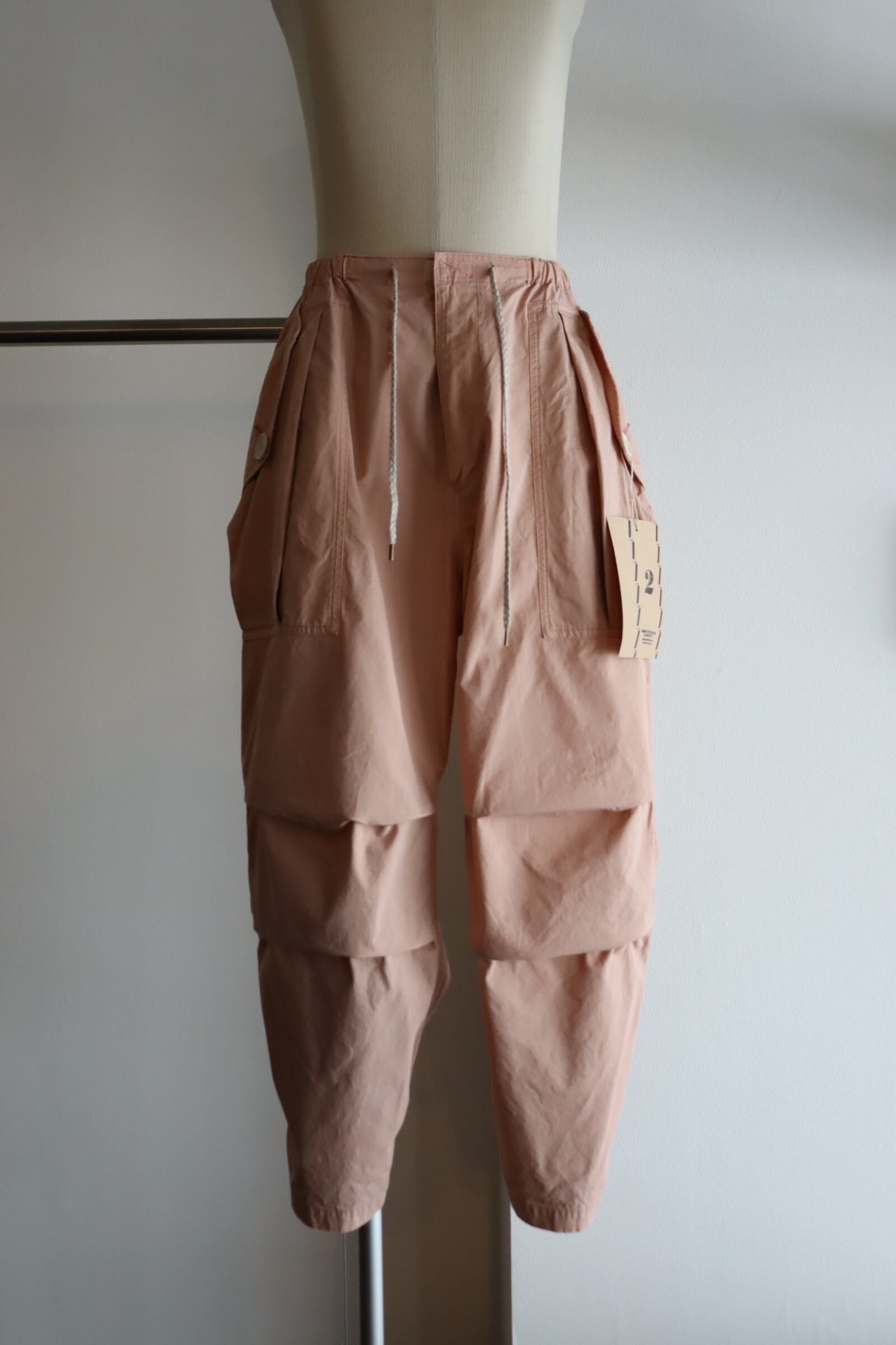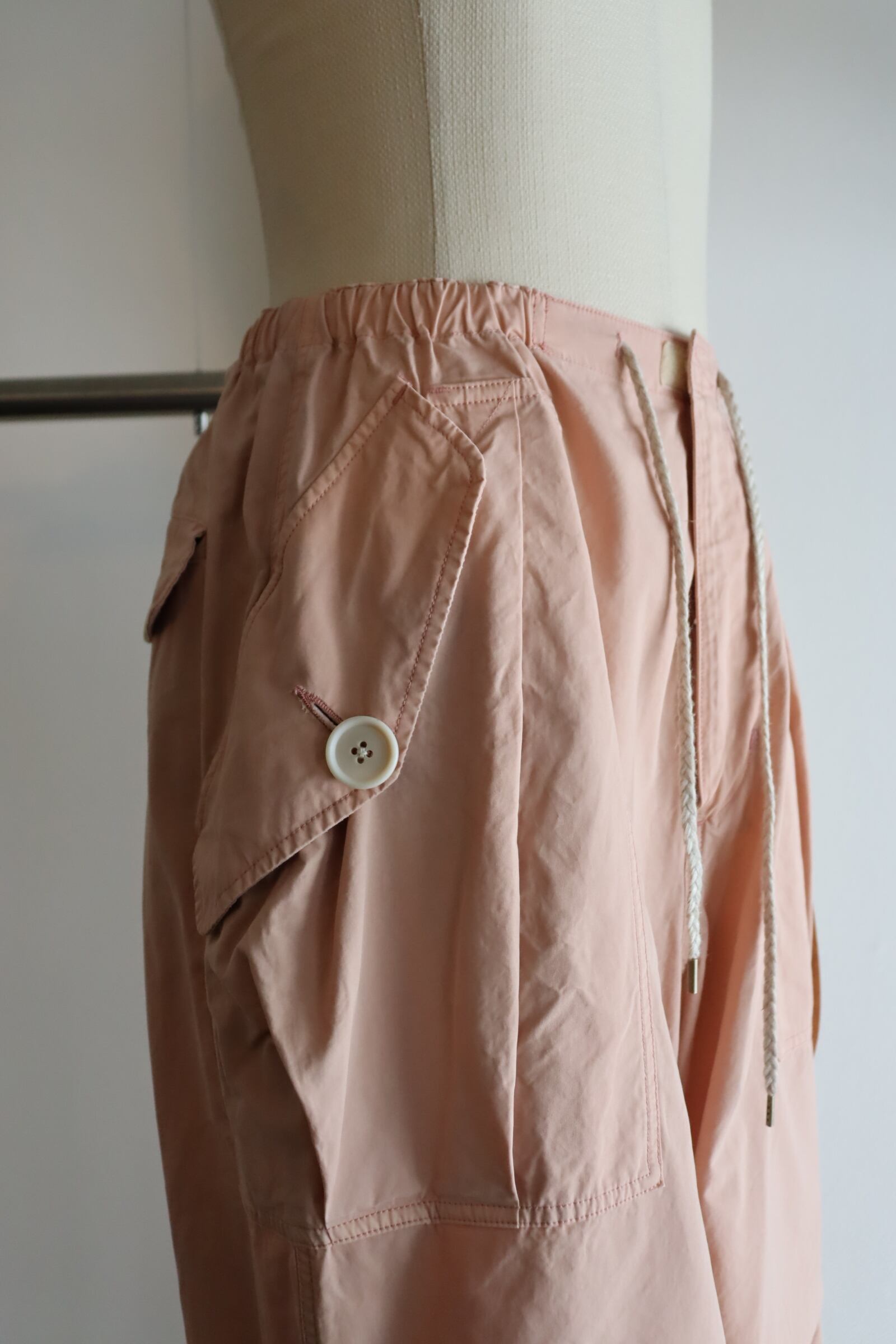 グルカショーツをベースにしたデザインに、近江晒と反応染めで仕上げたシボ感のある強撚ツイルを落とし込んだWDU TROUSERS 。ウエストに付いたマジックテープで、サイズ調整はもちろんのこと、タックやギャザーで独特のドレープ感を味わって頂けます。