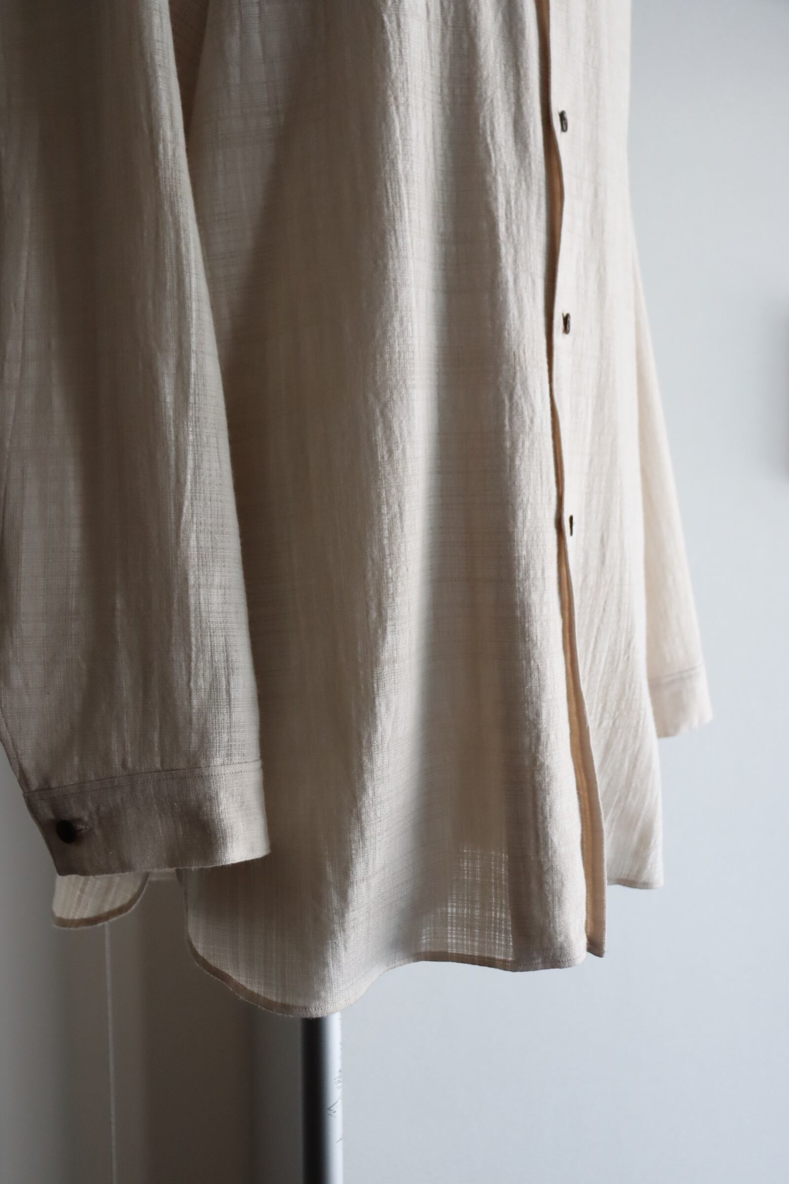 コットン 100% なのでお洗濯も簡単です。( 手洗い推奨 ) 生地にある程度デザイン性があるのと、ランダムな交織感を活かす為ヨークなどの細かいハギが入る仕様は削ぎ落として設計されています。袖口に少し寄せた控えめなニュアンスギャザー、サイドの重ねスリット、第一ボタンを省いた色気ある首周りがポイントです。