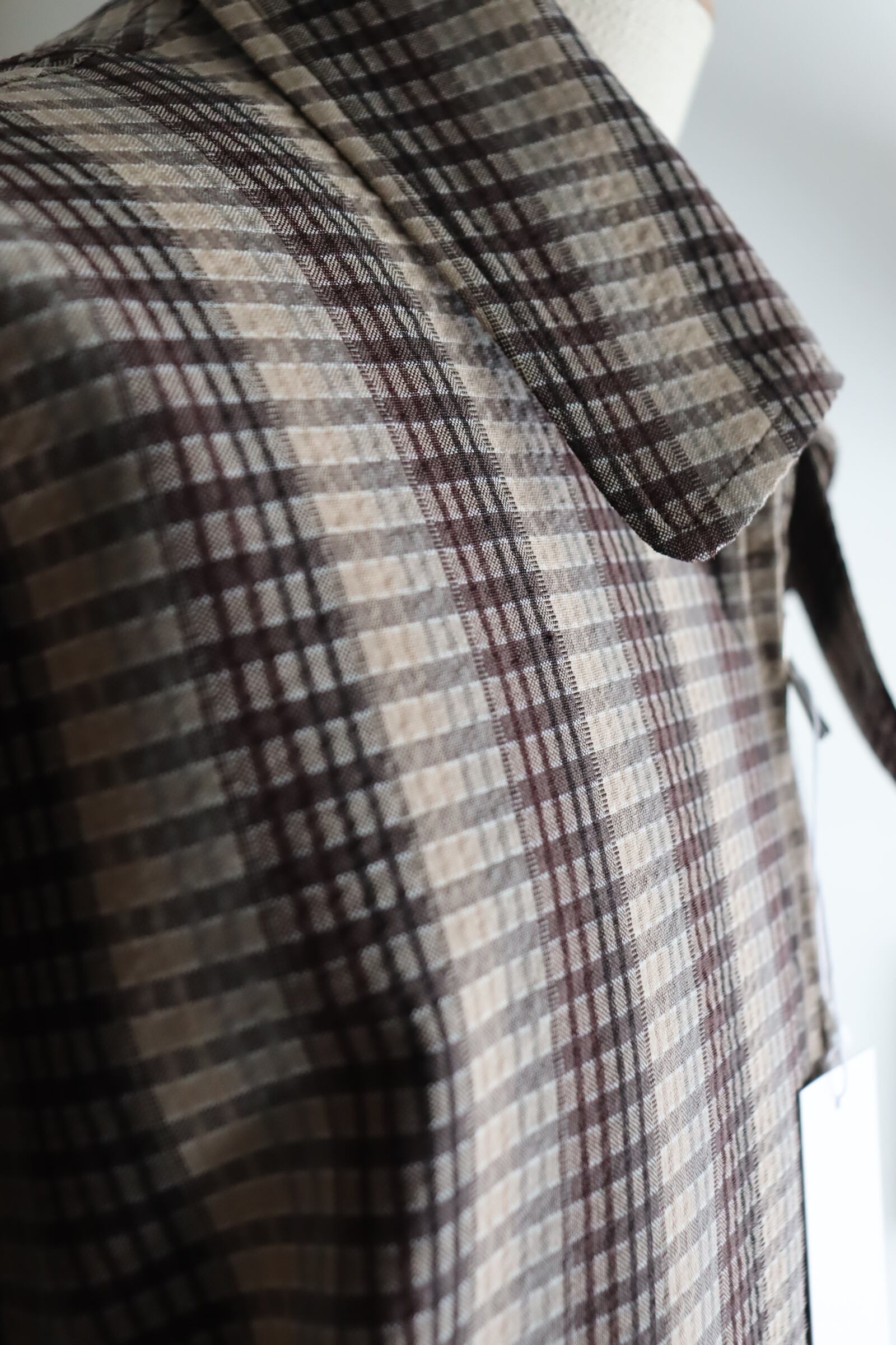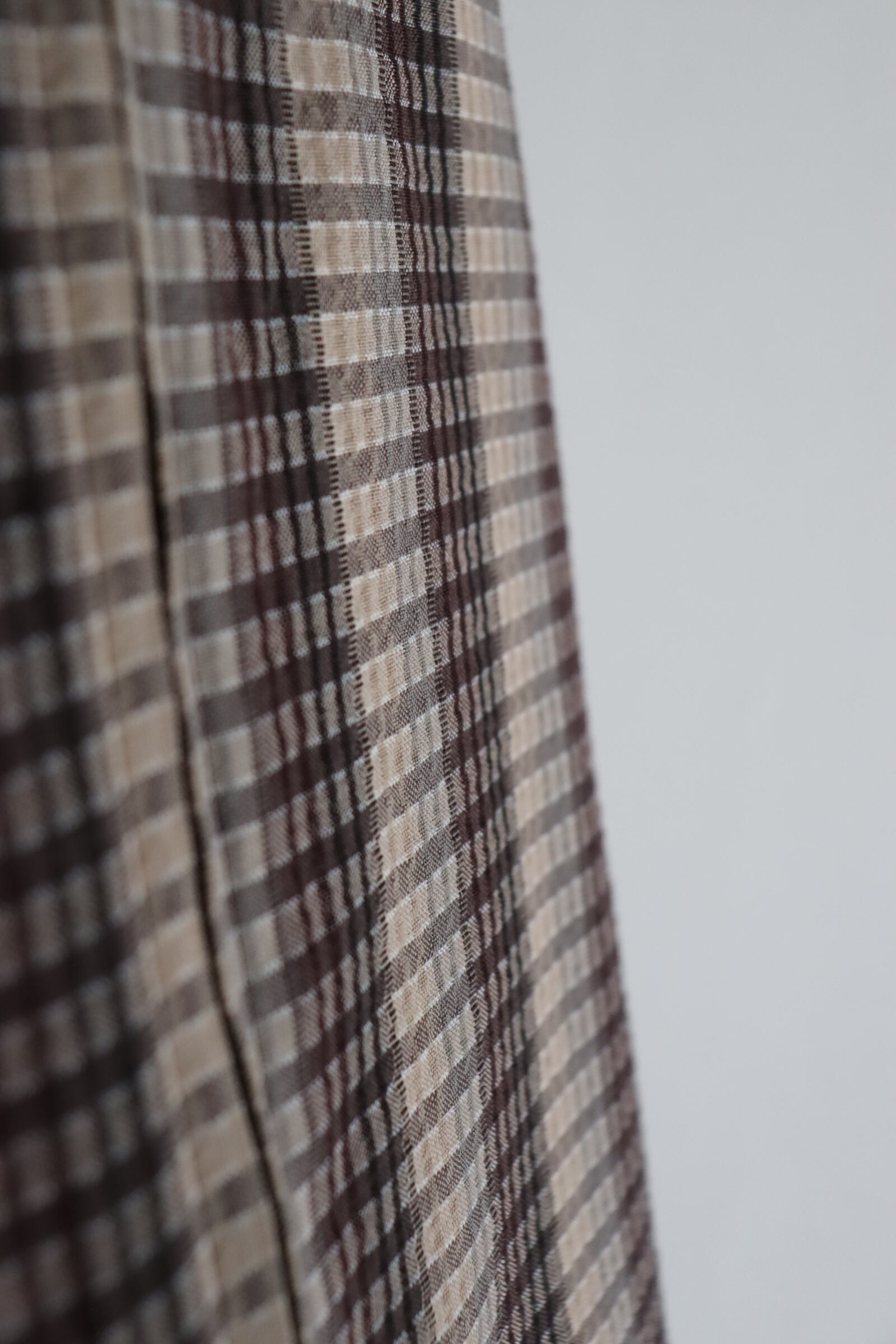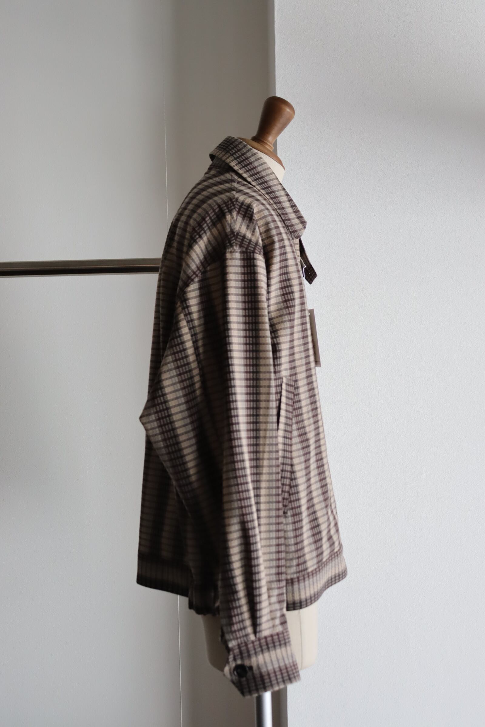 チェックとストライプが混じったような独特な柄と、サッカー地の凹凸のある表面感でさらに奥行のある素材感に仕上っており、存在感のある1着。存在感のある柄でありながらもどこか品のあるモダンな雰囲気を纏ったアイテムです。