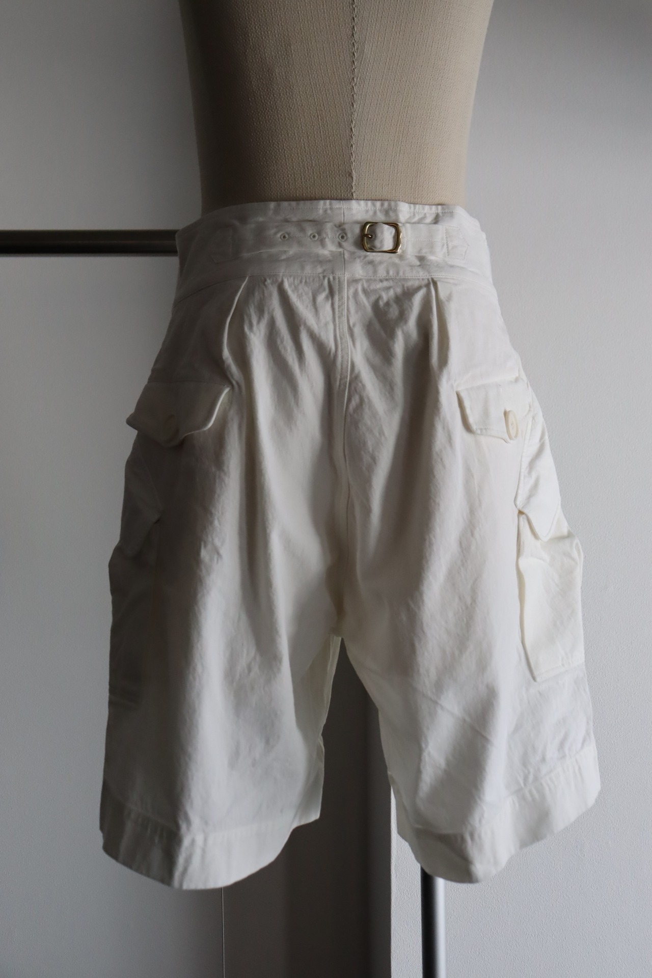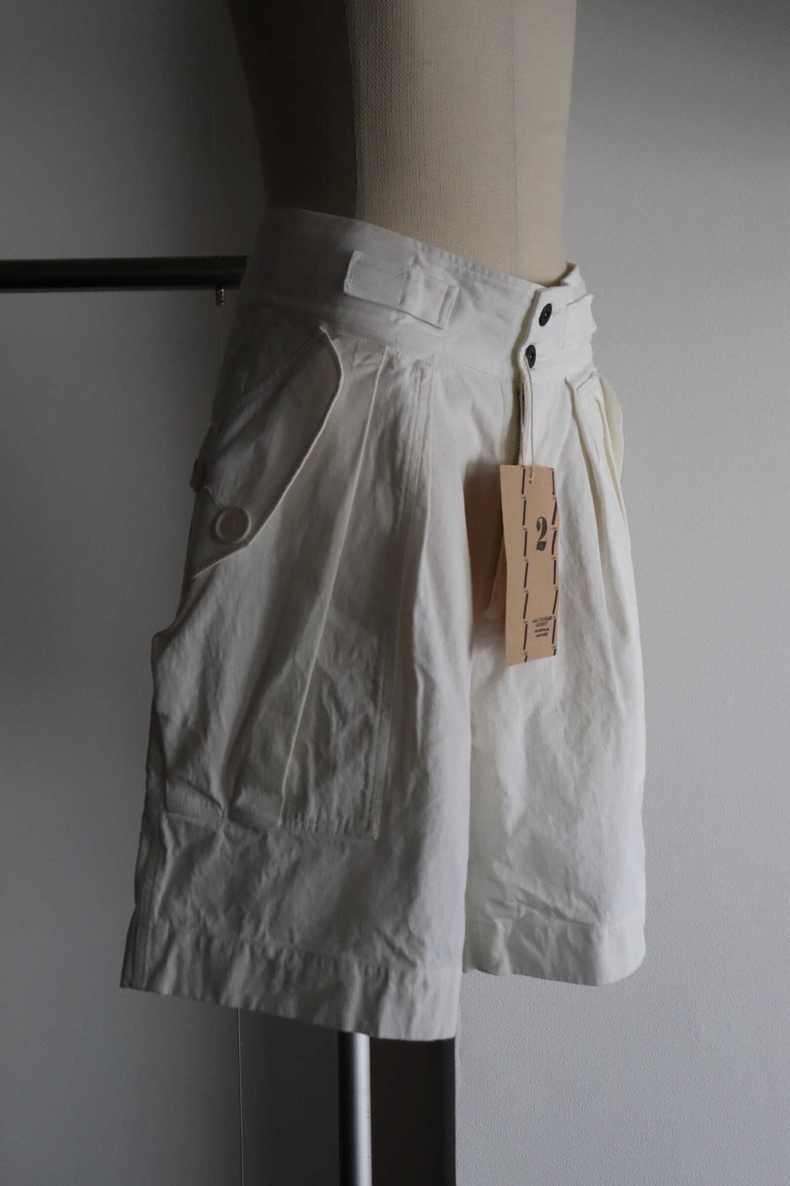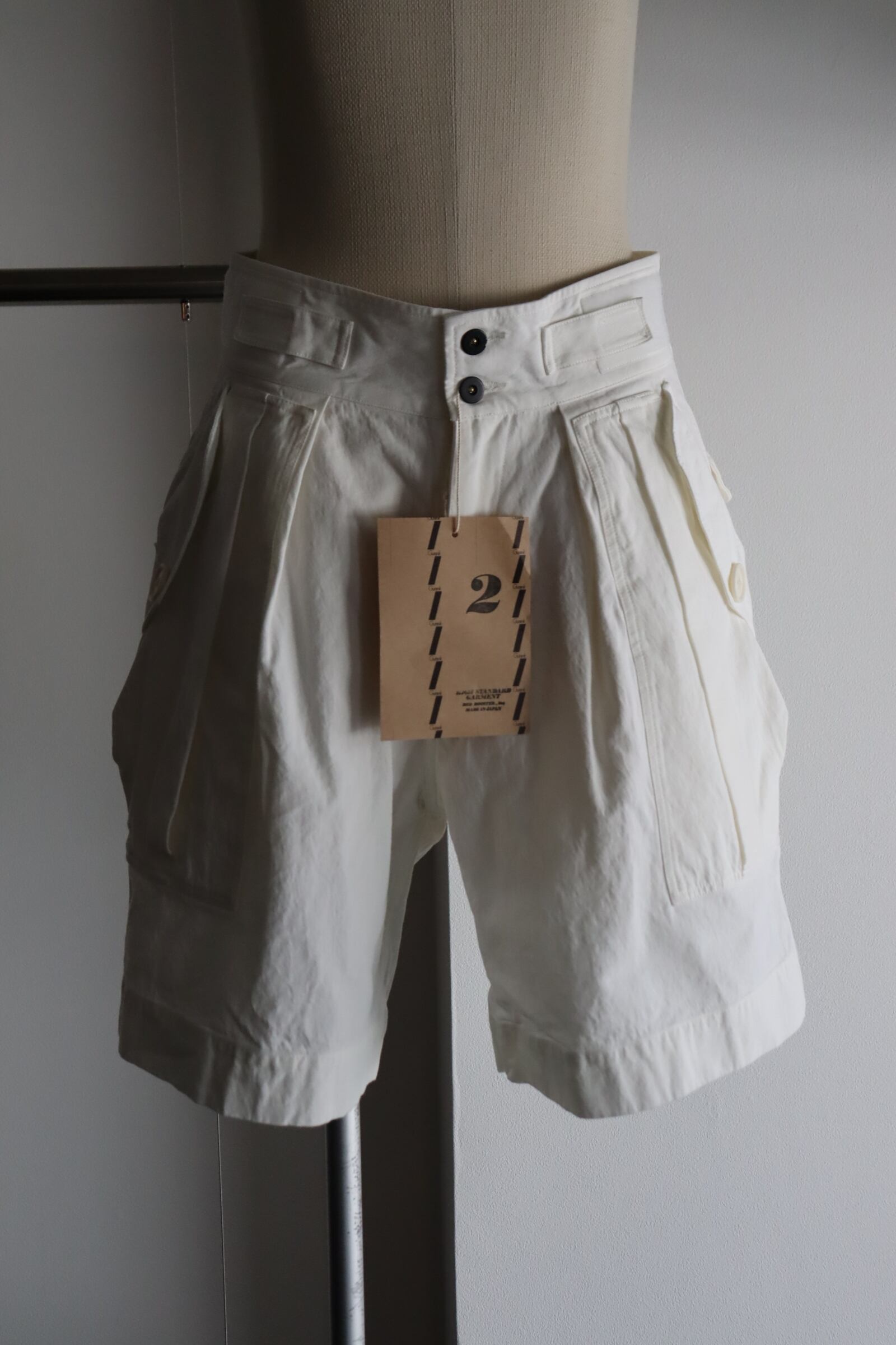 グルカショーツをベースにしたデザインに、近江晒と反応染めで仕上げたシボ感のある強撚ツイルを落とし込んだアイテム。ウエストに付いたマジックテープで、サイズ調整はもちろんのこと、プリーツを加えることができるので、独特なリラックス感が生まれます。フラップを外さなくても出し入れが可能なポケットも特徴的です。