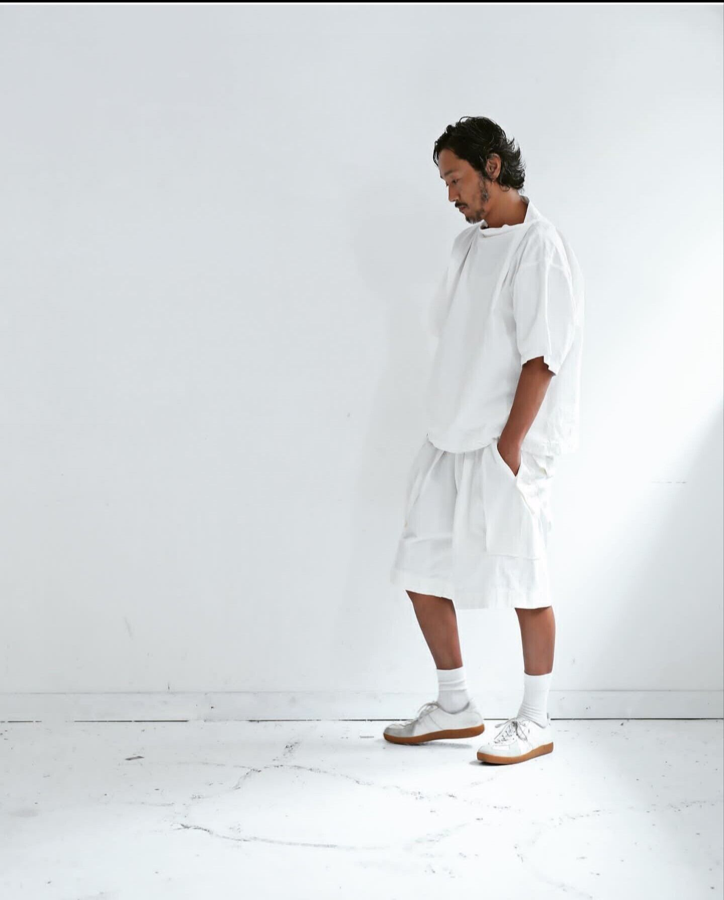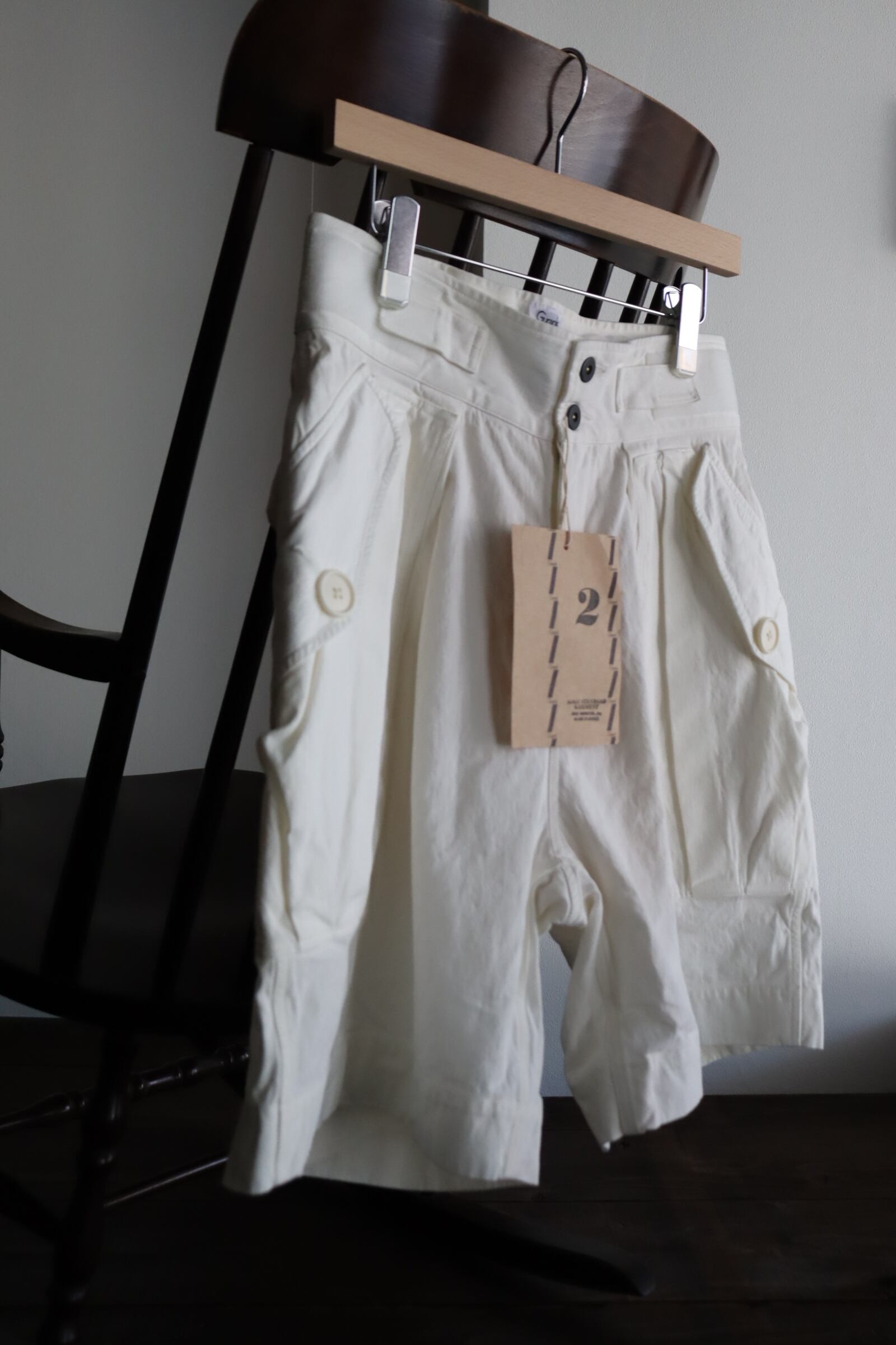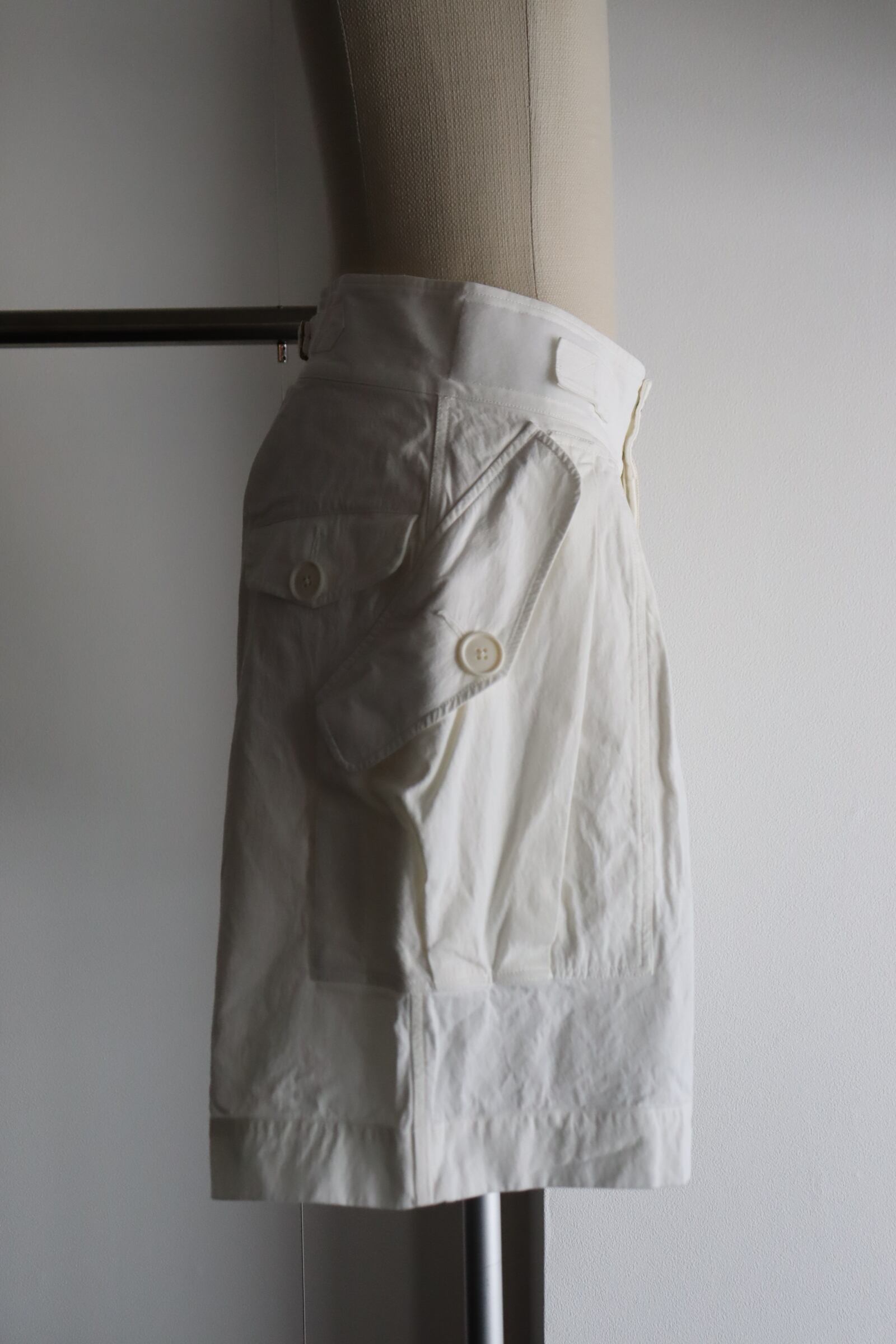 グルカショーツをベースにしたデザインに、近江晒と反応染めで仕上げたシボ感のある強撚ツイルを落とし込んだアイテム。ウエストに付いたマジックテープで、サイズ調整はもちろんのこと、プリーツを加えることができるので、独特なリラックス感が生まれます。フラップを外さなくても出し入れが可能なポケットも特徴的です。