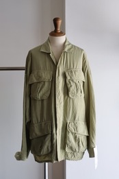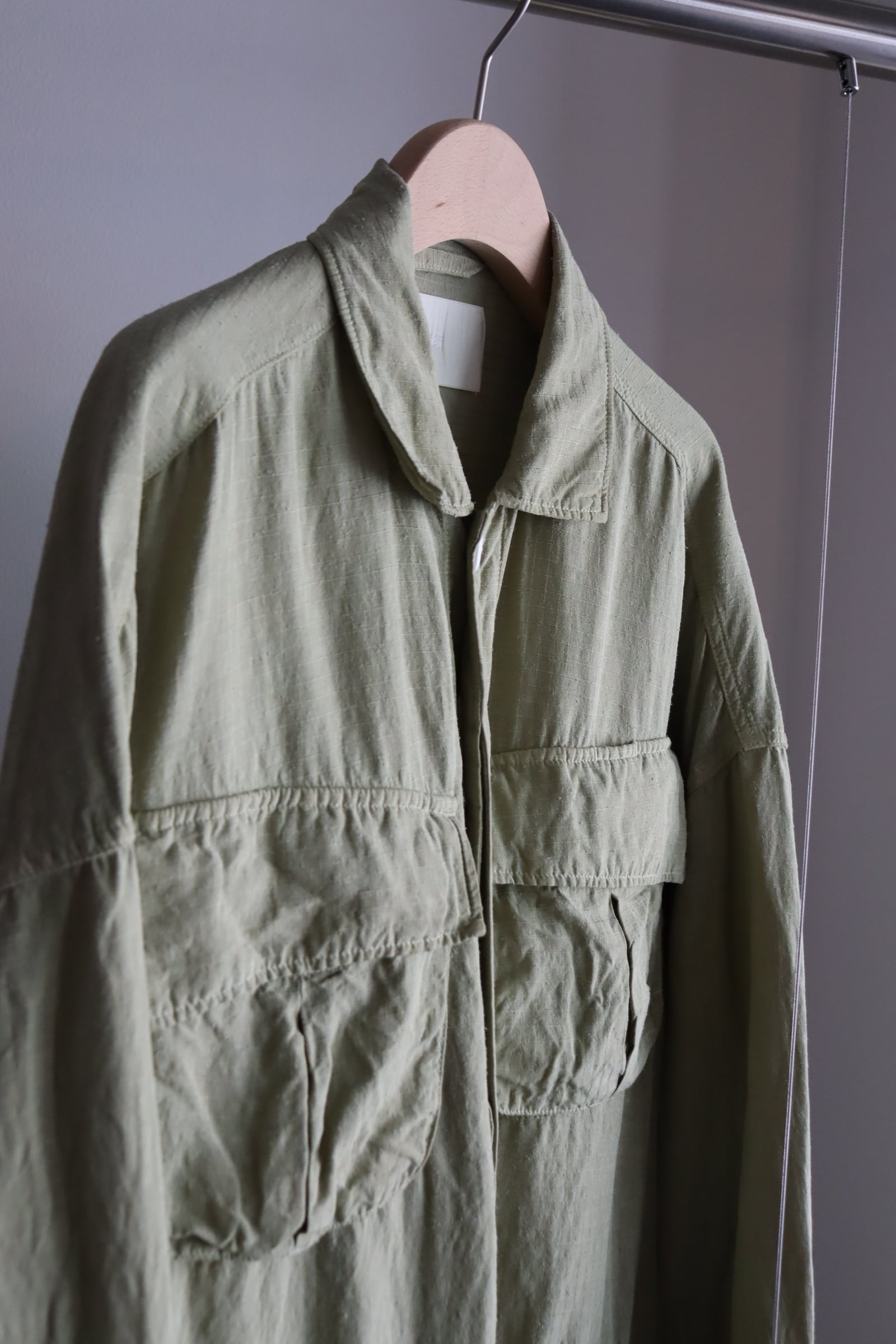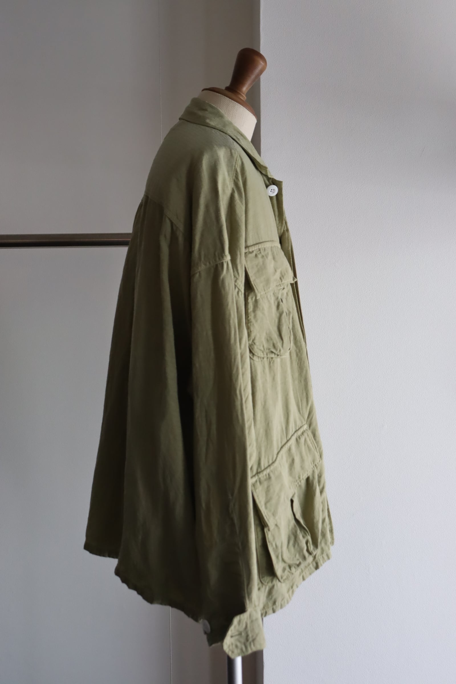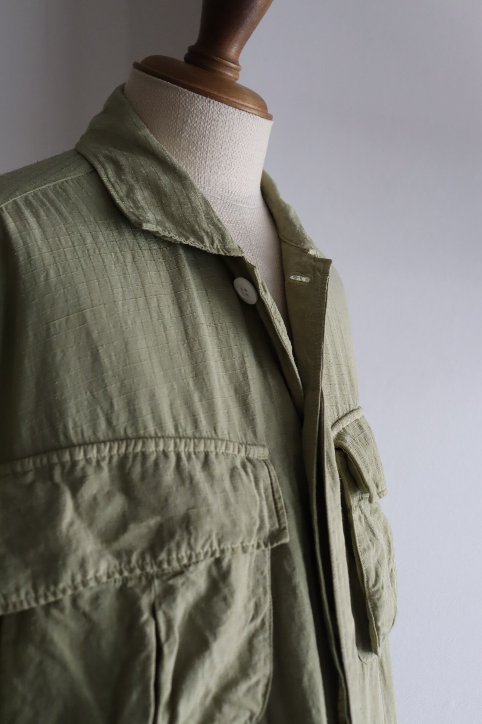 レーヨンリネンシルクのオリジナルリップストップ素材を採⽤し、丁⼦でボタニカルダイ染めを施したファティーグJKT。