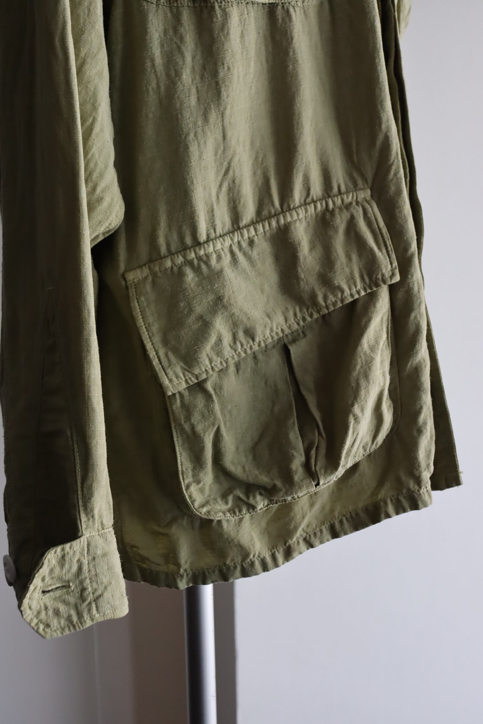 リップストップは⽣地の引き裂きを太い格⼦の箇所で⽌める為、強度がありアウトドアやミリタリーなどでよく採⽤される素材です。この無⾻なイメージの素材とファティーグJKの型を採⽤する事により、無⾻なイメージとは真逆なリラックス感のあるミリタリーを表現。ボタニカルのハイブリッド製品染めを施し、⾊落ちしていく事でリップの太い格⼦が浮いて来る事を楽しめます。