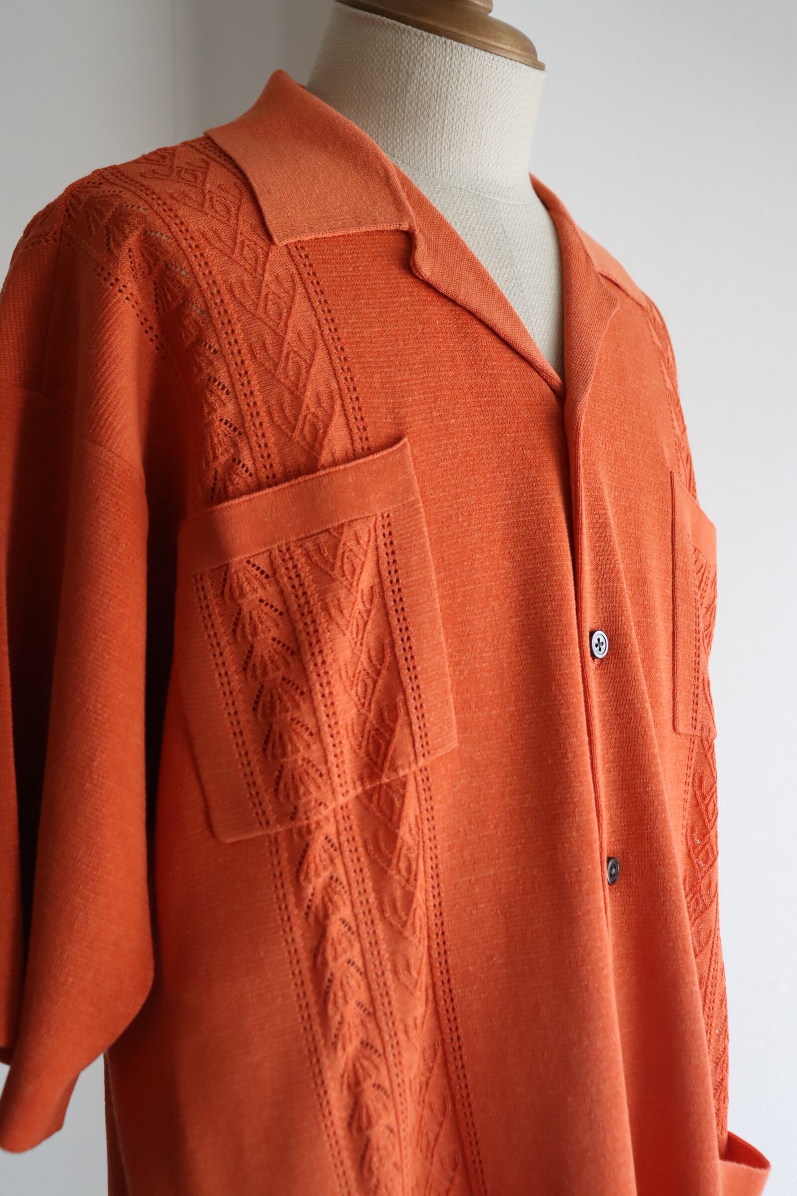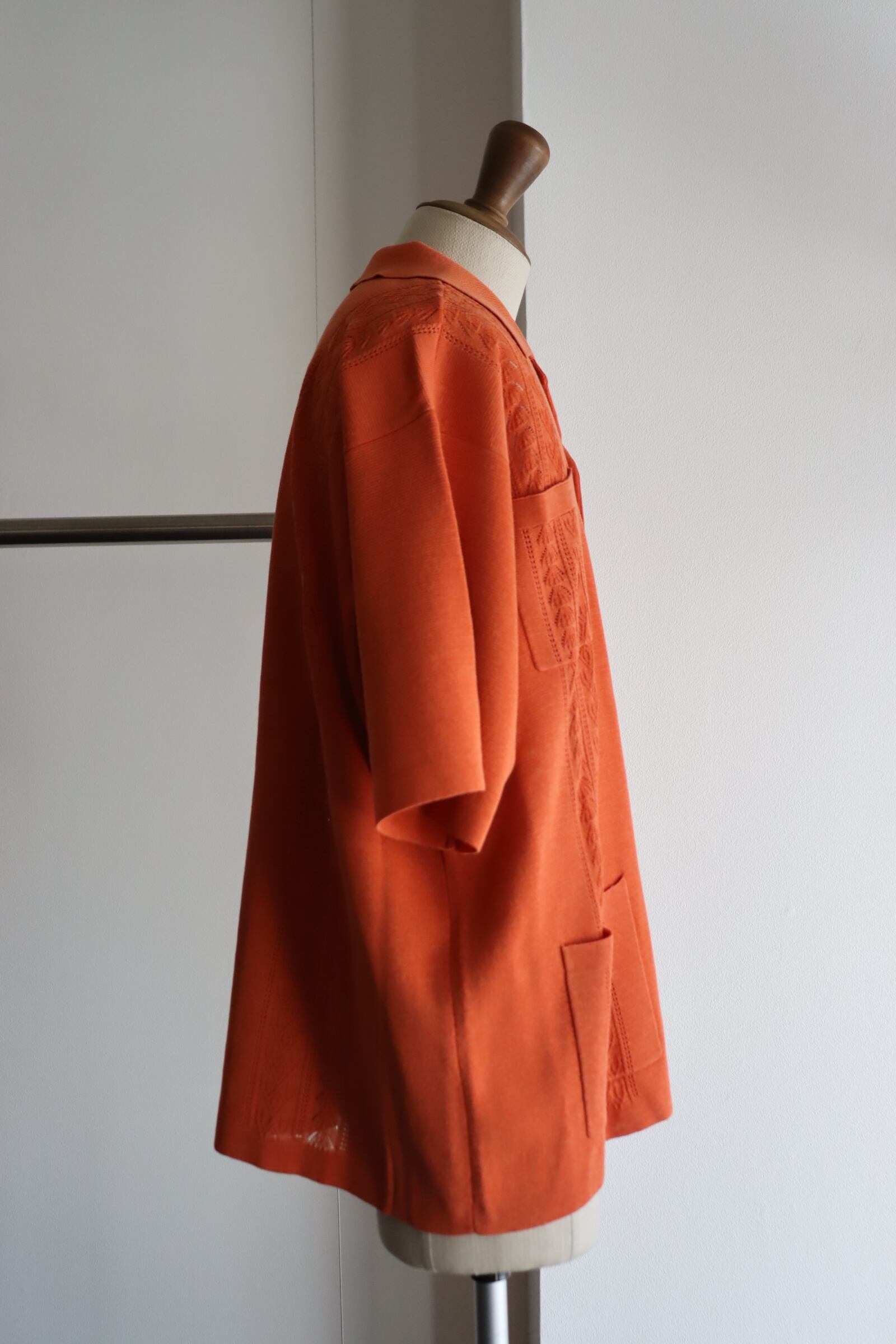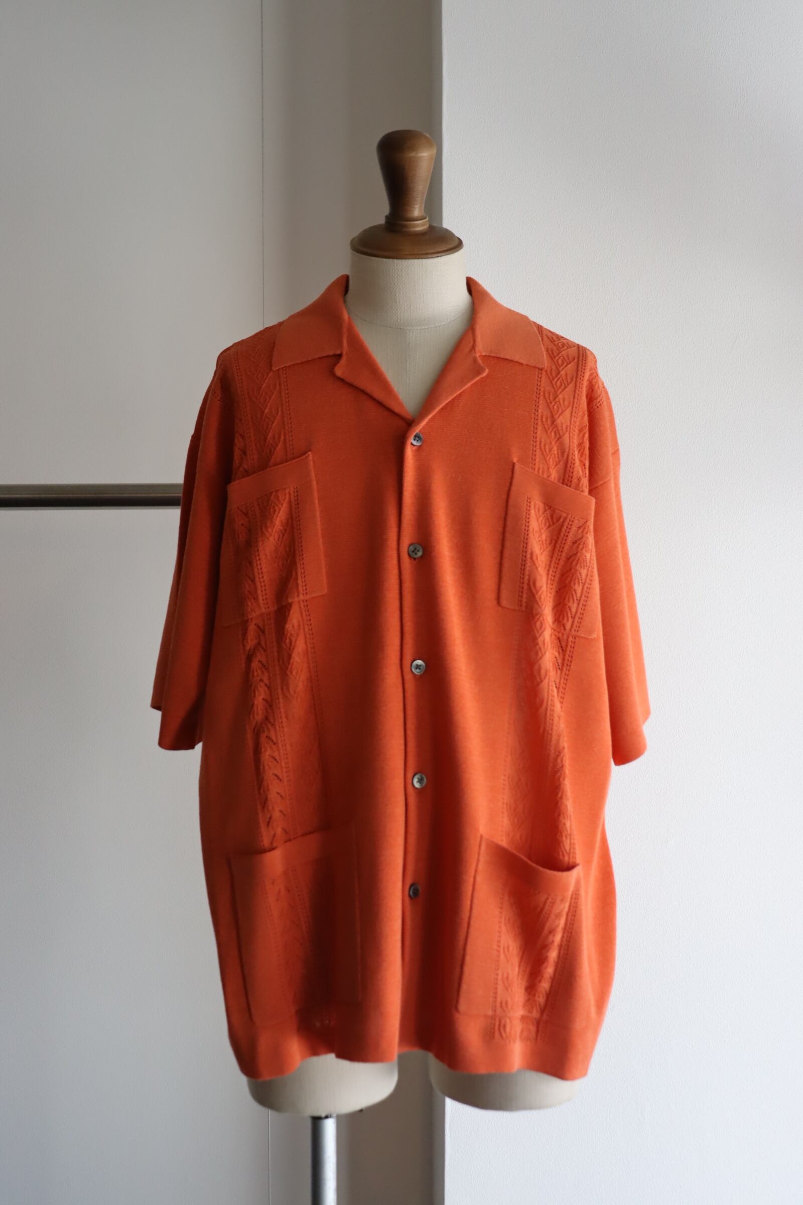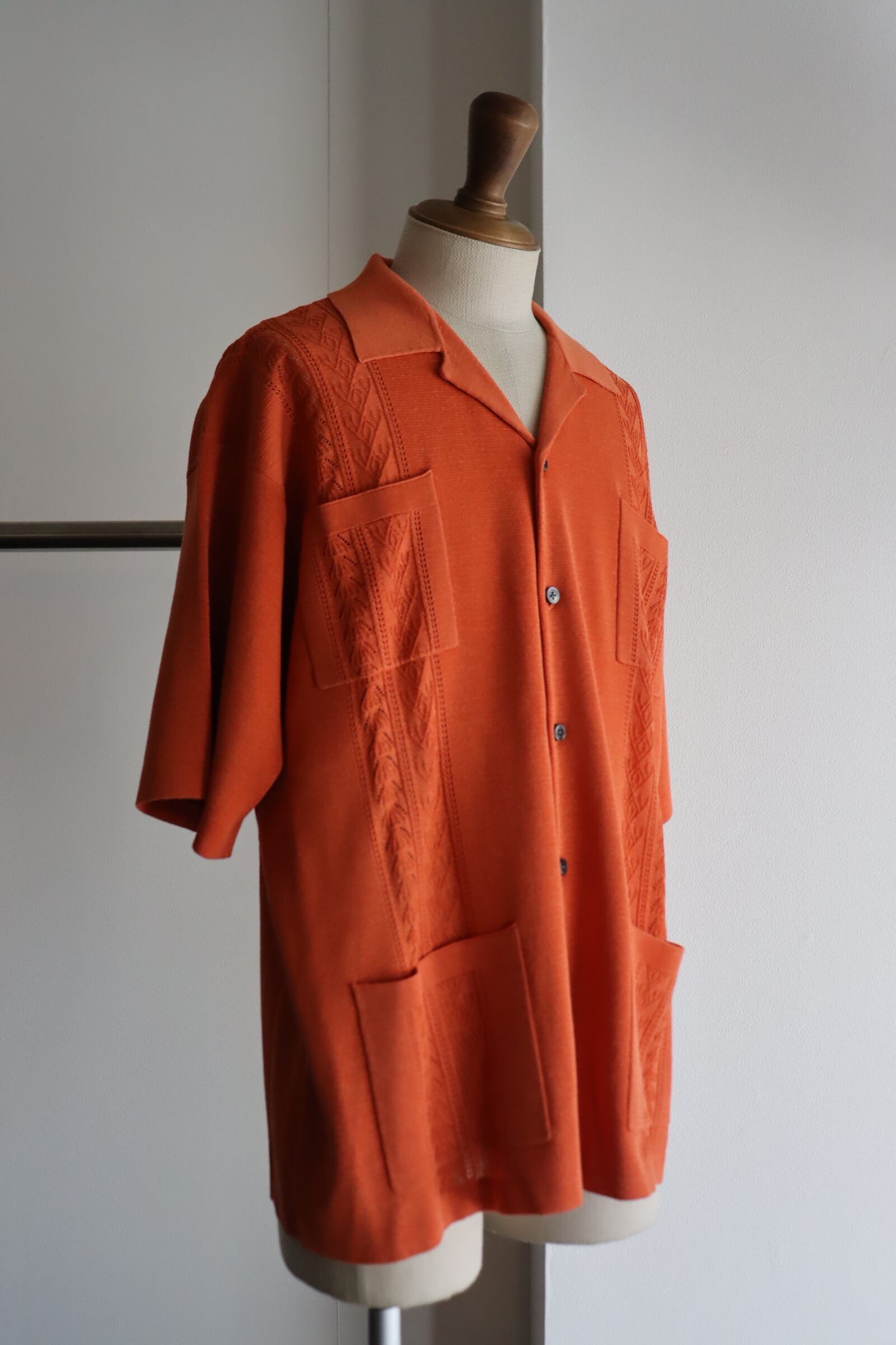 ニットのキューバシャツです。キューバシャツは名前の通り本国キューバの洋服です。冠婚葬祭や職員のユニフォームなど、正装としても認識される伝統のある洋服です。発祥の起源は判明しておりませんがサトウキビ農家のワークシャツであったなど諸説あります。ハリのある生地感を出す為にベースの編み地は14Gのミラノリブでしっかりと編み立てました。キューバシャツの特徴の1つの胸元の刺繍は透かし編みで表現しました。通常でしたらミラノリブと透かし編みは別々に編んで接ぎにした方が編み効率は良いですが、できる限り縫い代を少なくしたく、丁寧に切り替えながら編み続きで編み立てました。衿は増し糸し、ボディーに負けないようにしっかりと総針で編み立てました。身頃とポケットの柄合わせなど、編みテクニックが詰まった1着です。