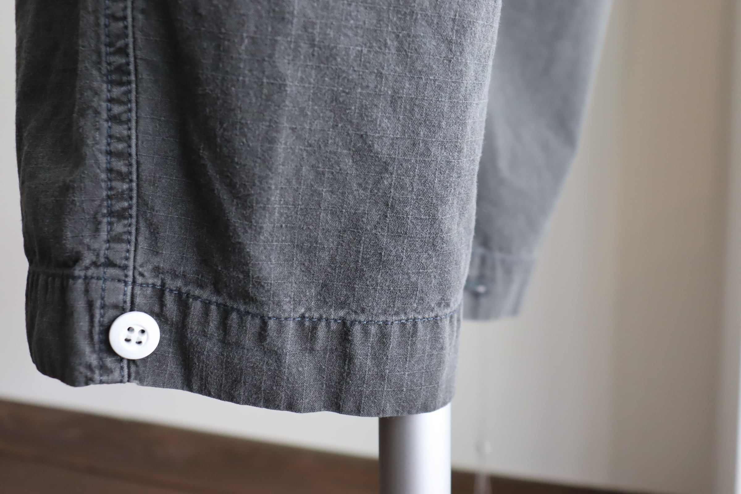 40-50年代頃のUS NAVYのサルベージトラウザーからインスピレーションを受けデザイン。元々のサルベージトラウザーは脇線が輪になっており、パンツのシルエットが単調だったり、前開きが無かったり着にくさがある点を踏まえて、脇線を作り、気易いパターンにアップデート。脇にある調整リボンはINNAT PAJAMA JK同様の仕様にしています。裾に配したボタンでシルエットを変えて着⽤可能。⼤きめな後パッチポケットは脇線まで挟みこむ事によりアクセスし易く⼗分な収納⼒があります。素材は綿100%のリップストップに紀州備長炭によるボタニカルダイを施しております。