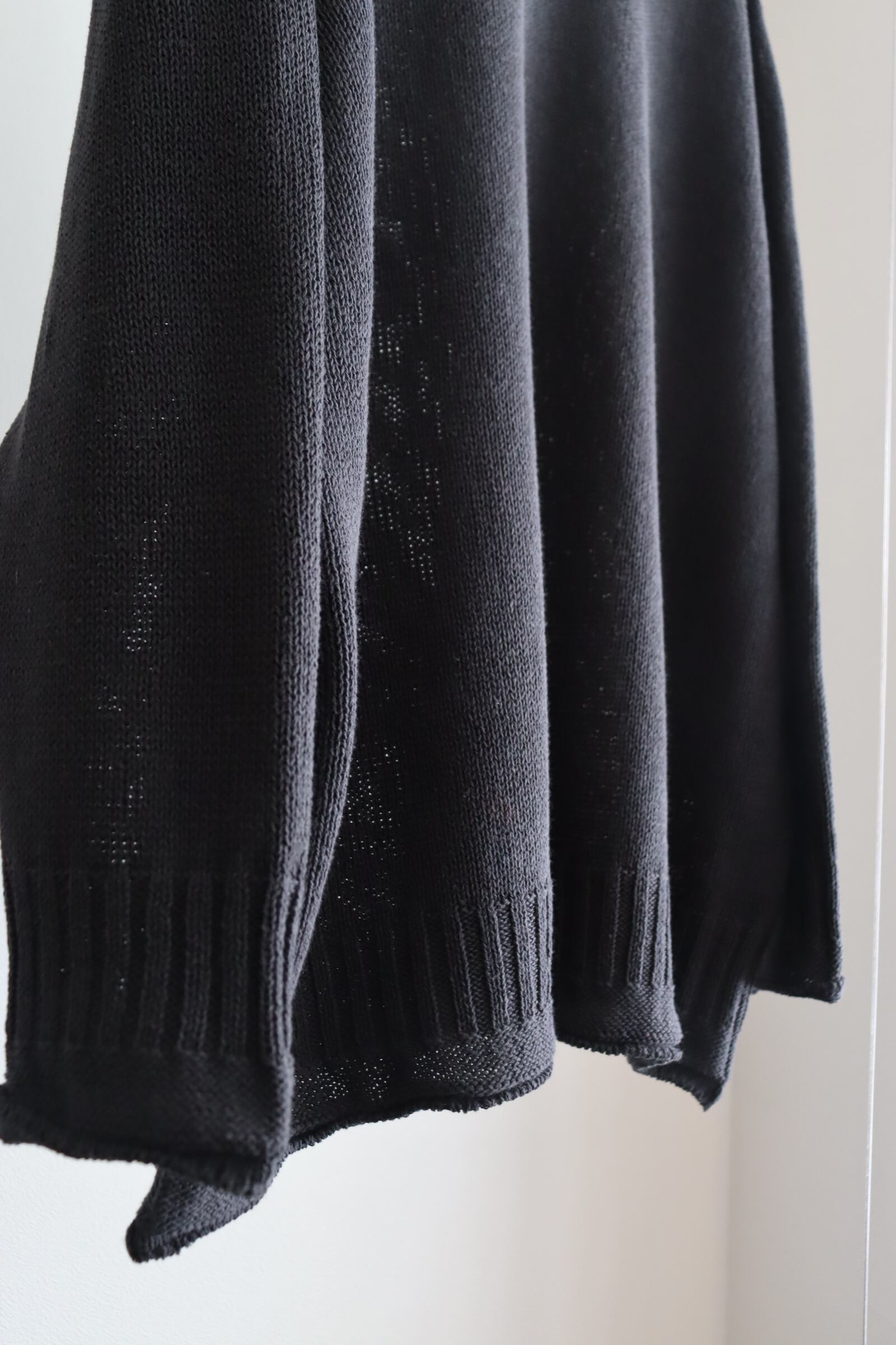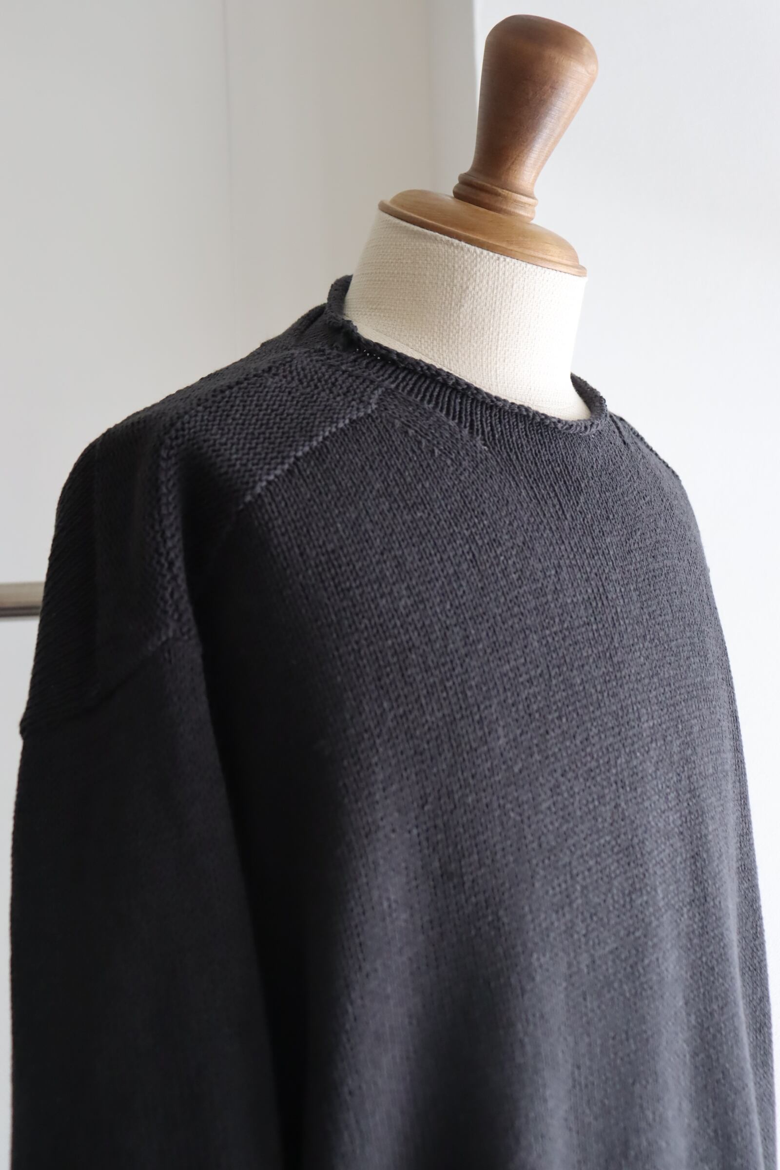 空紡糸に樹脂加工された糸を採用し、ドライタッチなシャリ感で麻にも似た清涼感のある肌触りのニットになります。5ゲージでローゲージとミドルゲージの間位の肉感となります。
