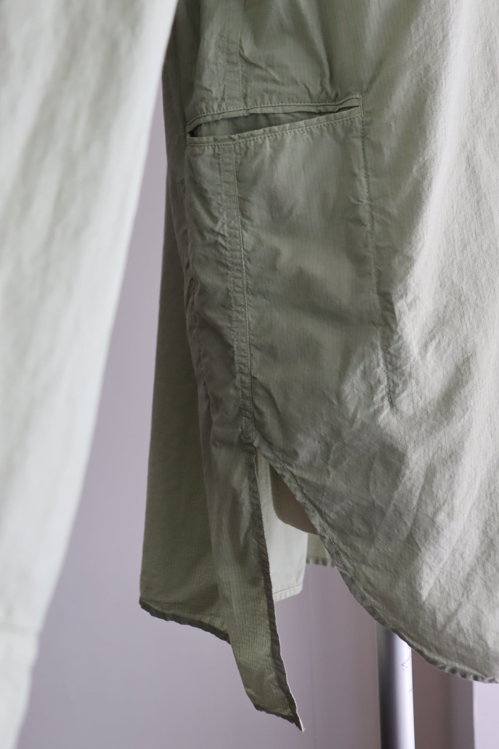 トを付けてシャツ⼀枚でもちょっとした外出できるデザインです。素材はオーガニックコットン100%を使⽤したコットンリップストップのタイプライターで適度な張り感と強度を持った素材です。