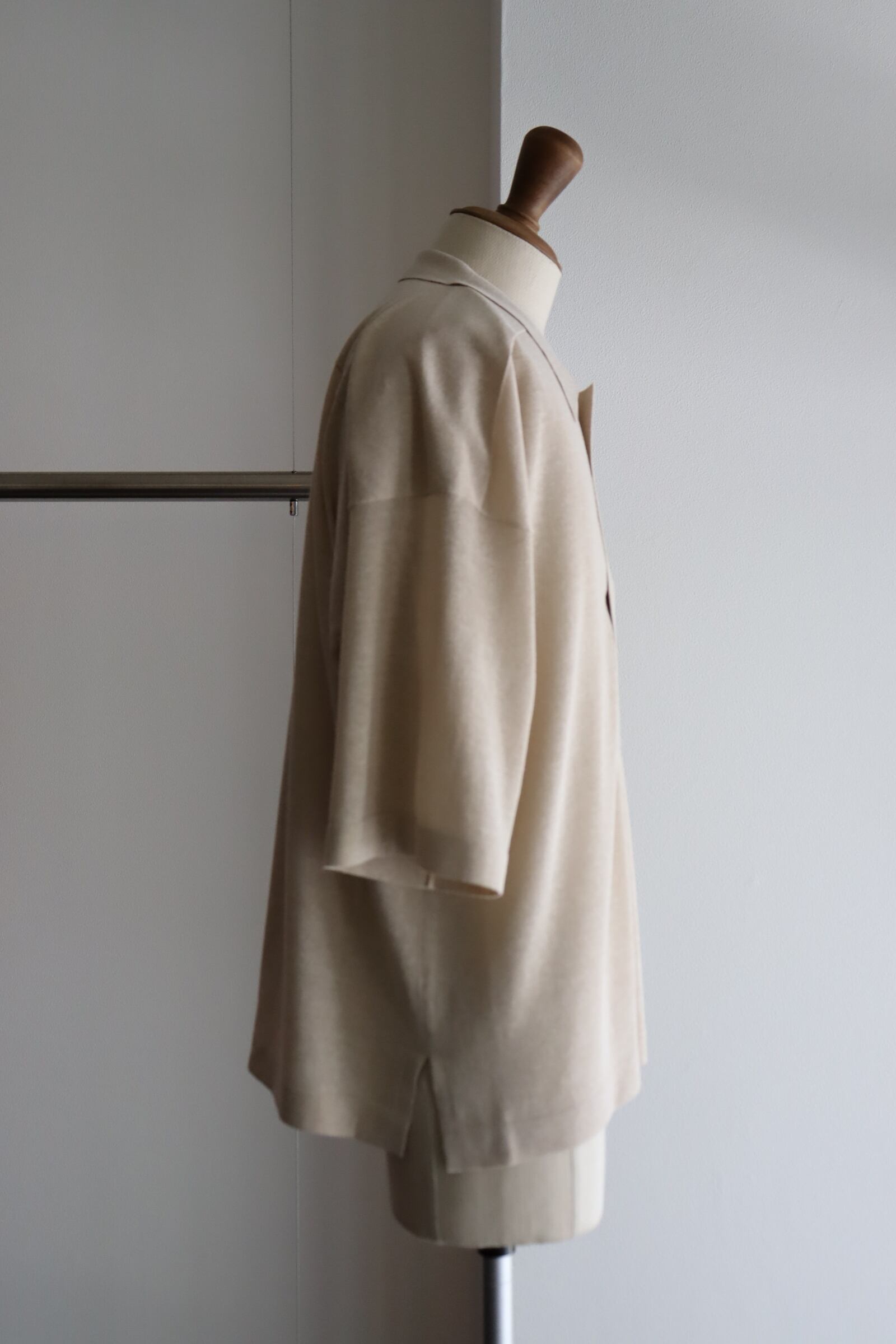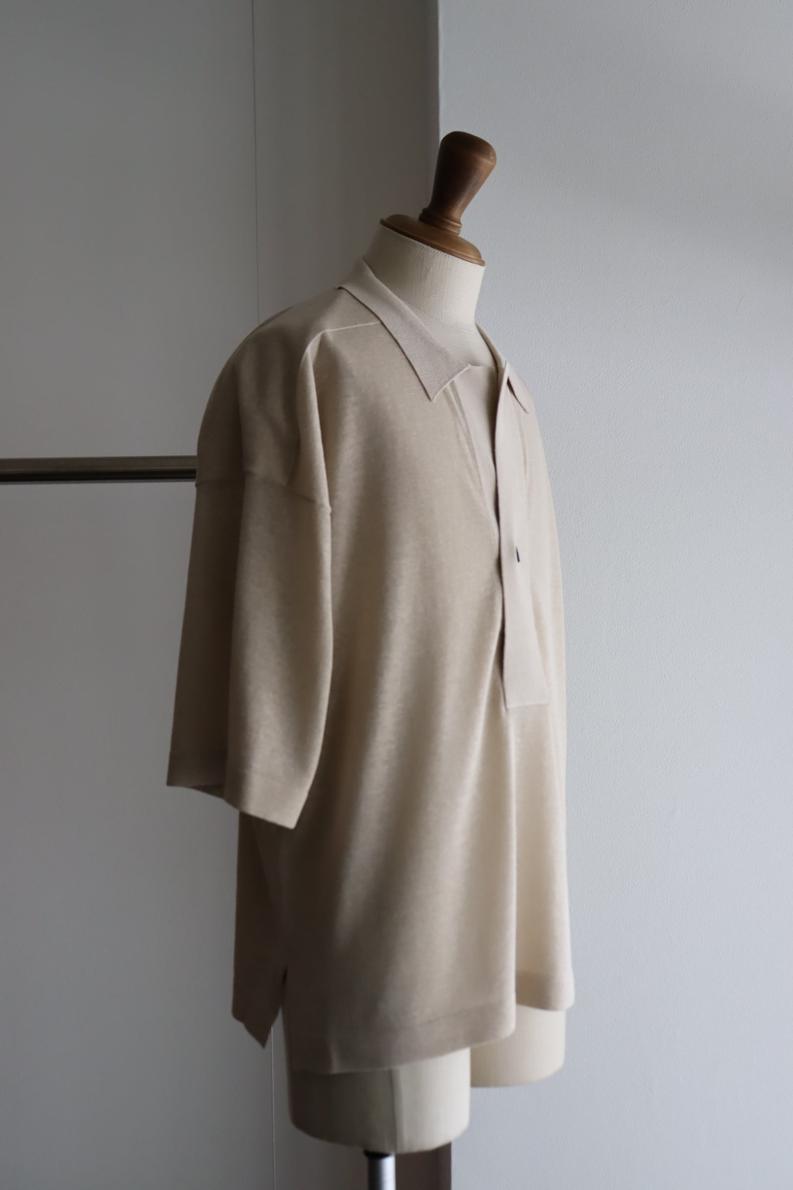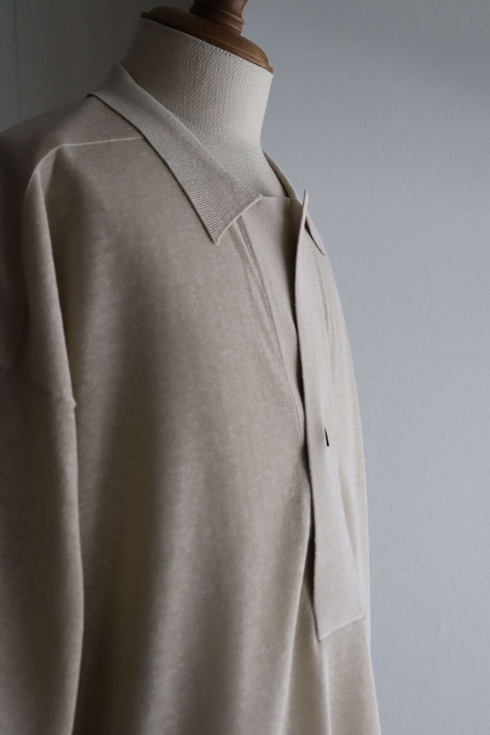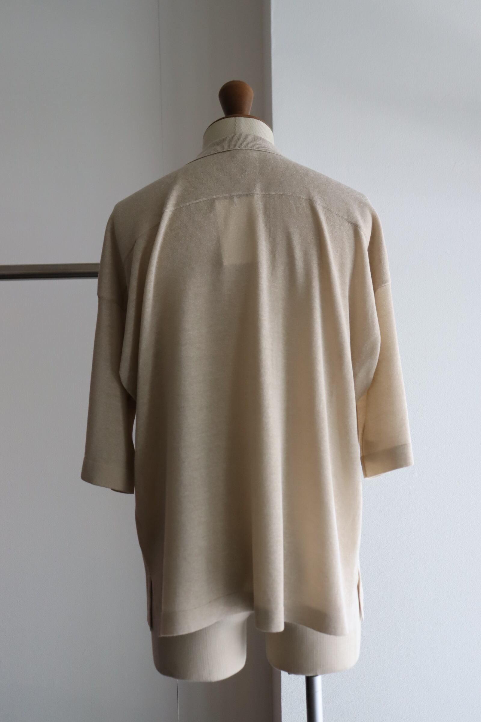ミリタリーのスキッパーシャツをベースに14Gの天竺で編み立てました。肩下がりを付けずに肩線と袖山を直線になるようなパターンにしており、腕の可動域を広げるために袖下にたっぷりとマチを入れました。肩のヨークは身頃と同じ天竺ですが、袋編みの2重仕立てになり透け感の差を出す事によって切り替えにしています。衿と総針は増し糸してしっかりさせました。長めの前立てと1つボタンもミリタリースキッパーシャツのディテールです。透け感のある素材なので見た目も着用時も涼しく、夏のトップスにオススメです。