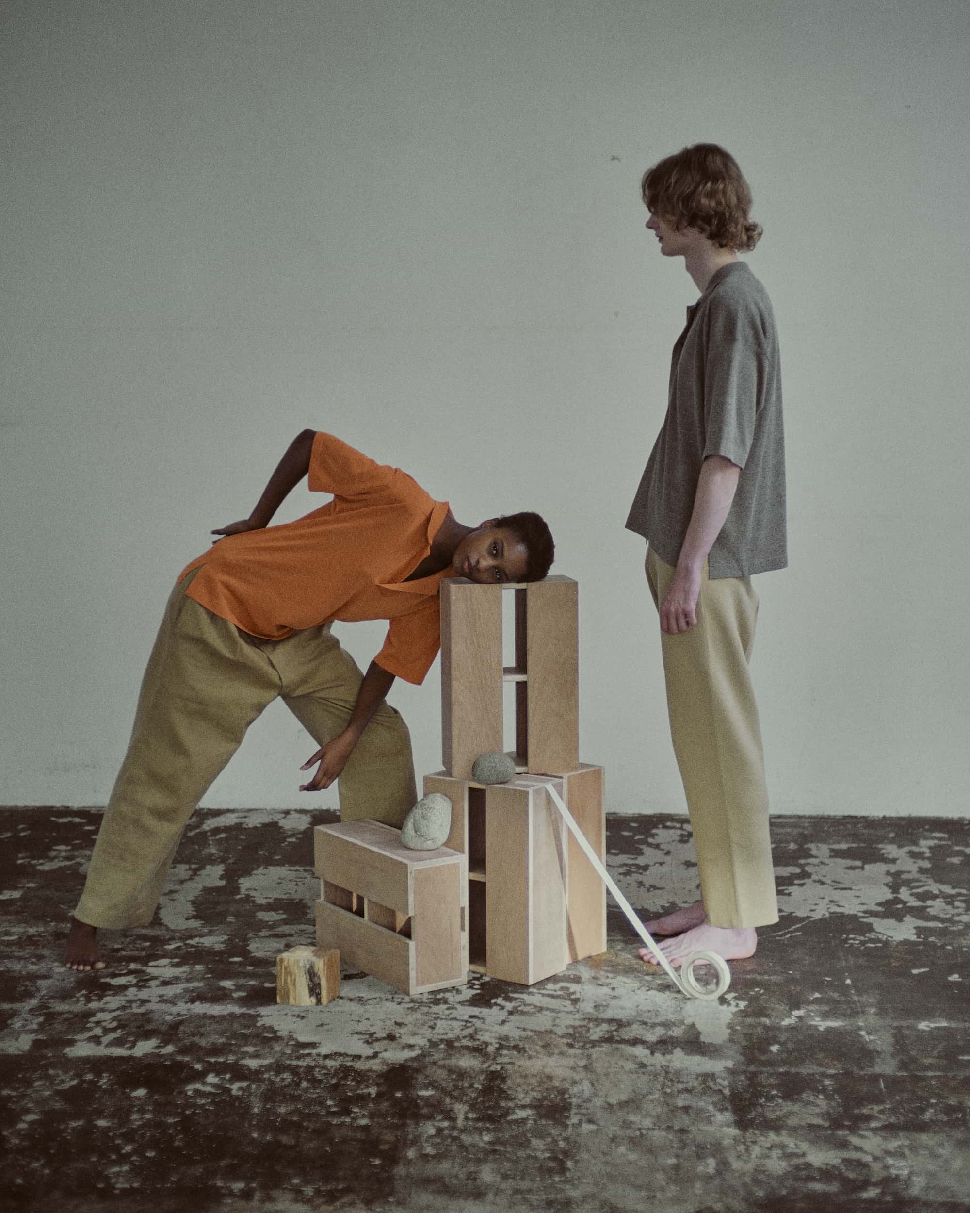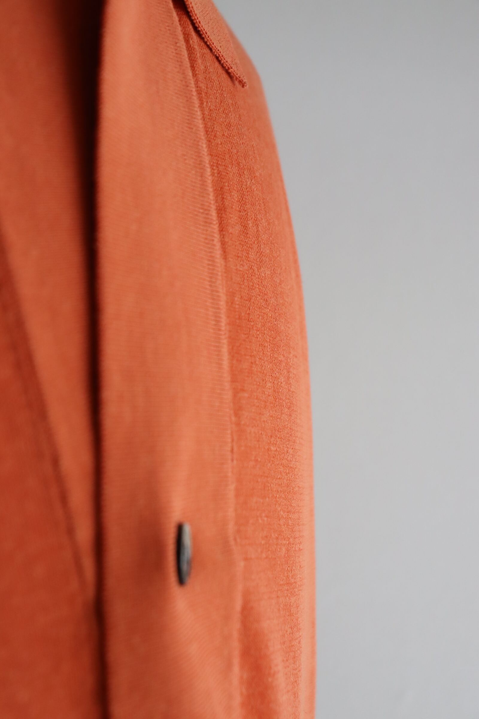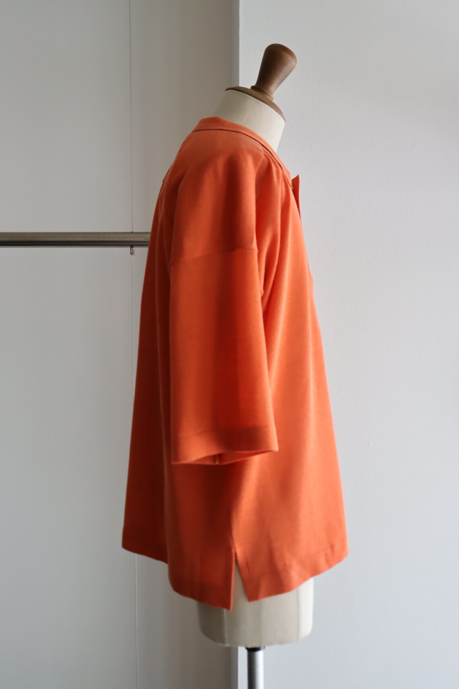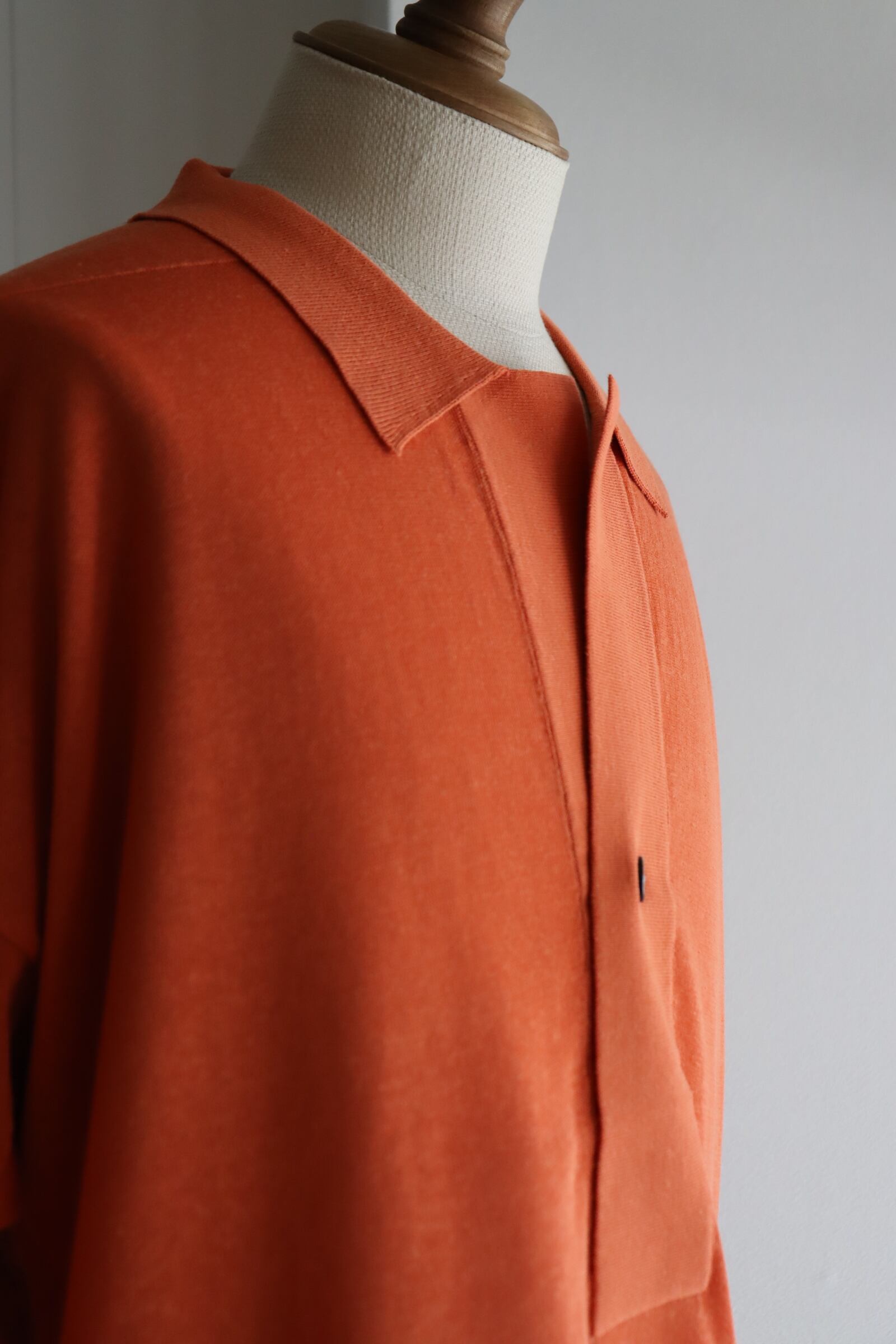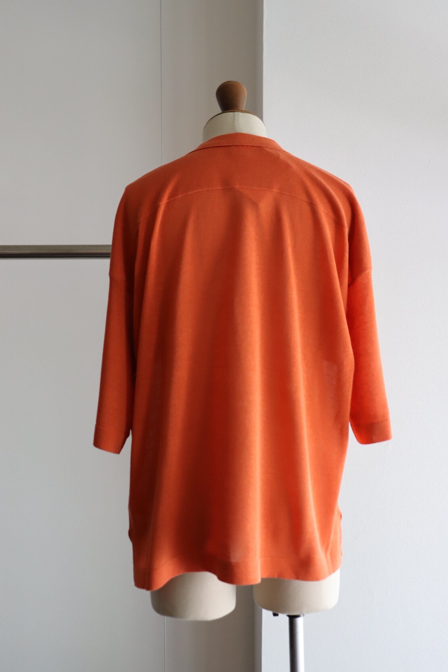 ミリタリーのスキッパーシャツをベースに14Gの天竺で編み立てました。肩下がりを付けずに肩線と袖山を直線になるようなパターンにしており、腕の可動域を広げるために袖下にたっぷりとマチを入れました。肩のヨークは身頃と同じ天竺ですが、袋編みの2重仕立てになり透け感の差を出す事によって切り替えにしています。衿と総針は増し糸してしっかりさせました。長めの前立てと1つボタンもミリタリースキッパーシャツのディテールです。透け感のある素材なので見た目も着用時も涼しく、夏のトップスにオススメです。