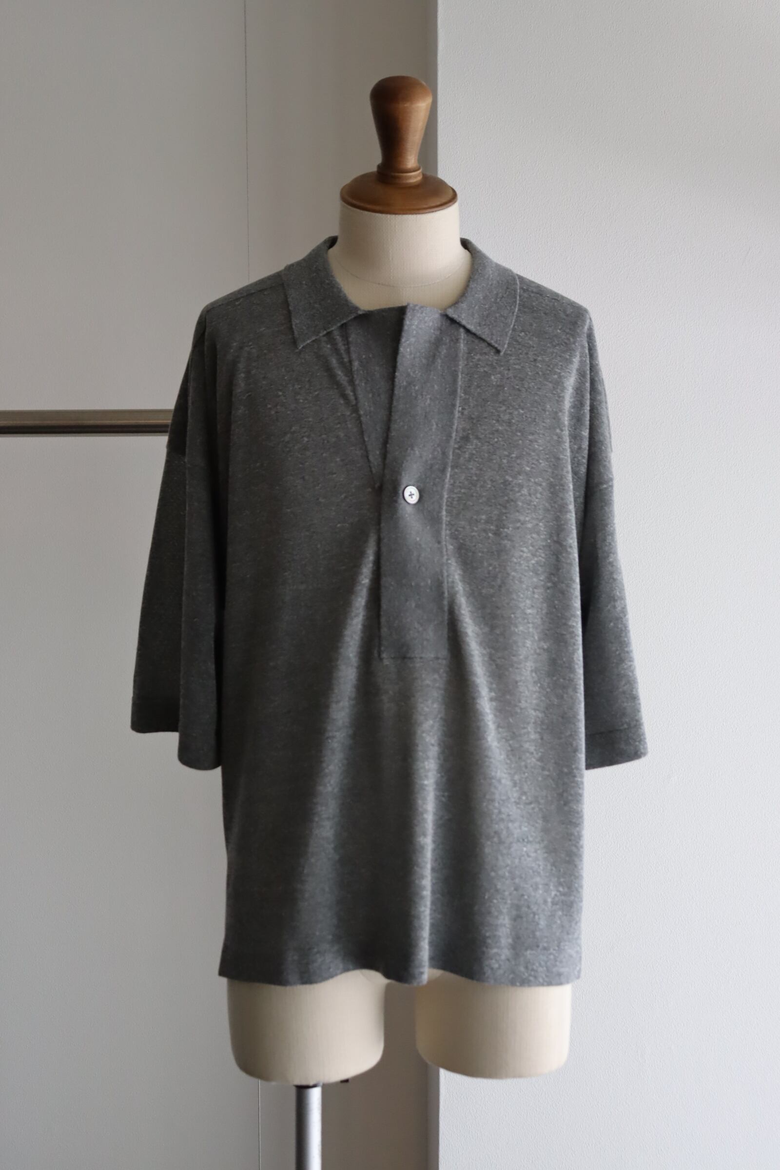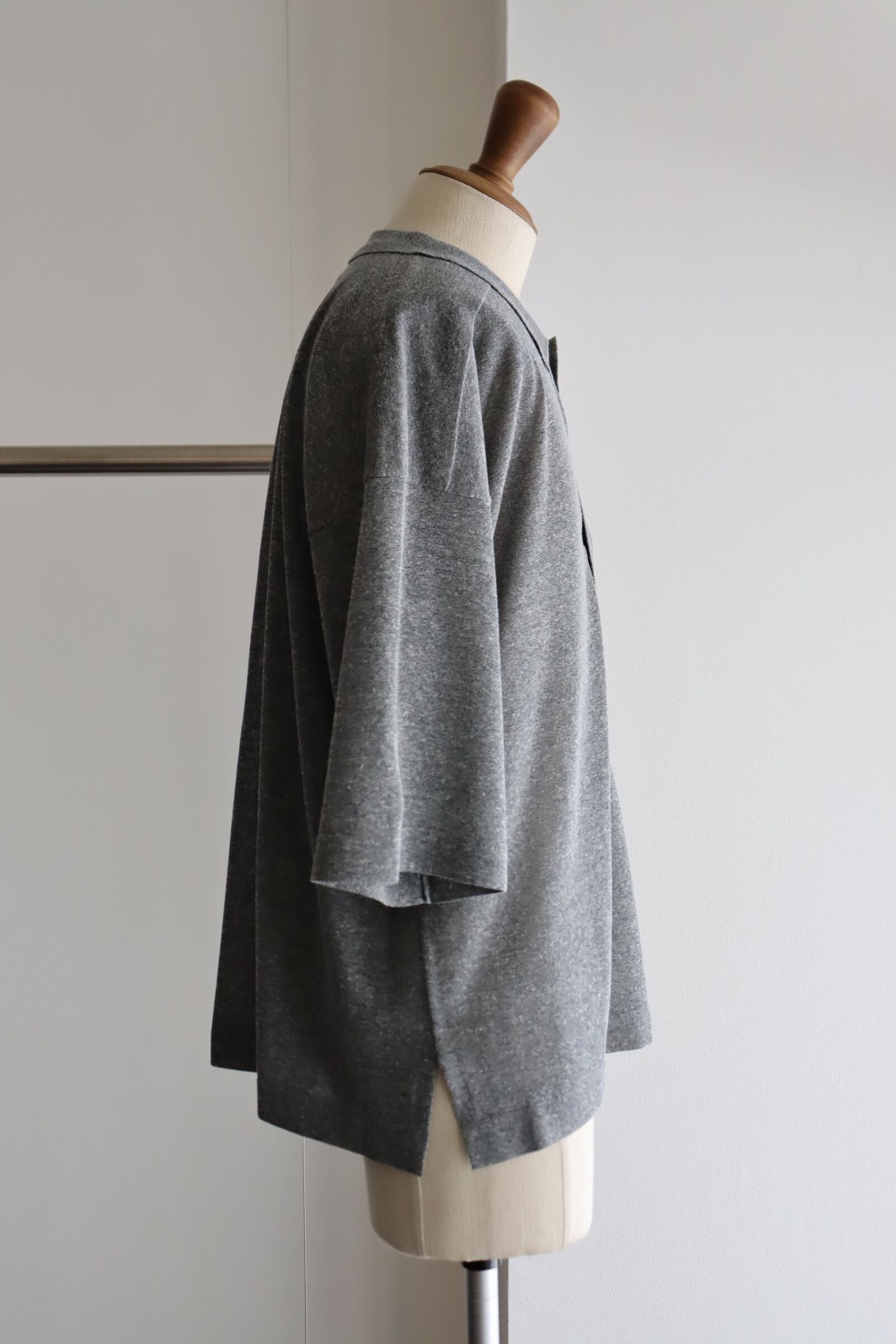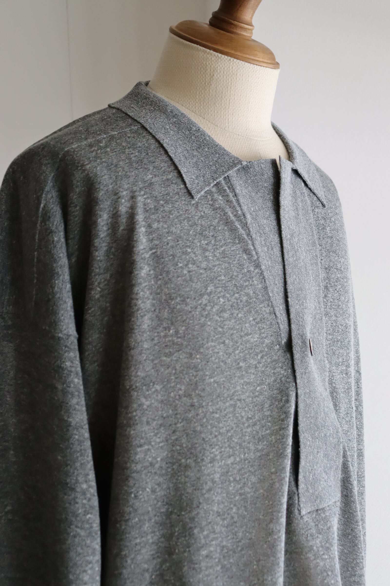 ミリタリーのスキッパーシャツをベースに14Gの天竺で編み立てました。肩下がりを付けずに肩線と袖山を直線になるようなパターンにしており、腕の可動域を広げるために袖下にたっぷりとマチを入れました。肩のヨークは身頃と同じ天竺ですが、袋編みの2重仕立てになり透け感の差を出す事によって切り替えにしています。衿と総針は増し糸してしっかりさせました。長めの前立てと1つボタンもミリタリースキッパーシャツのディテールです。透け感のある素材なので見た目も着用時も涼しく、夏のトップスにオススメです。
