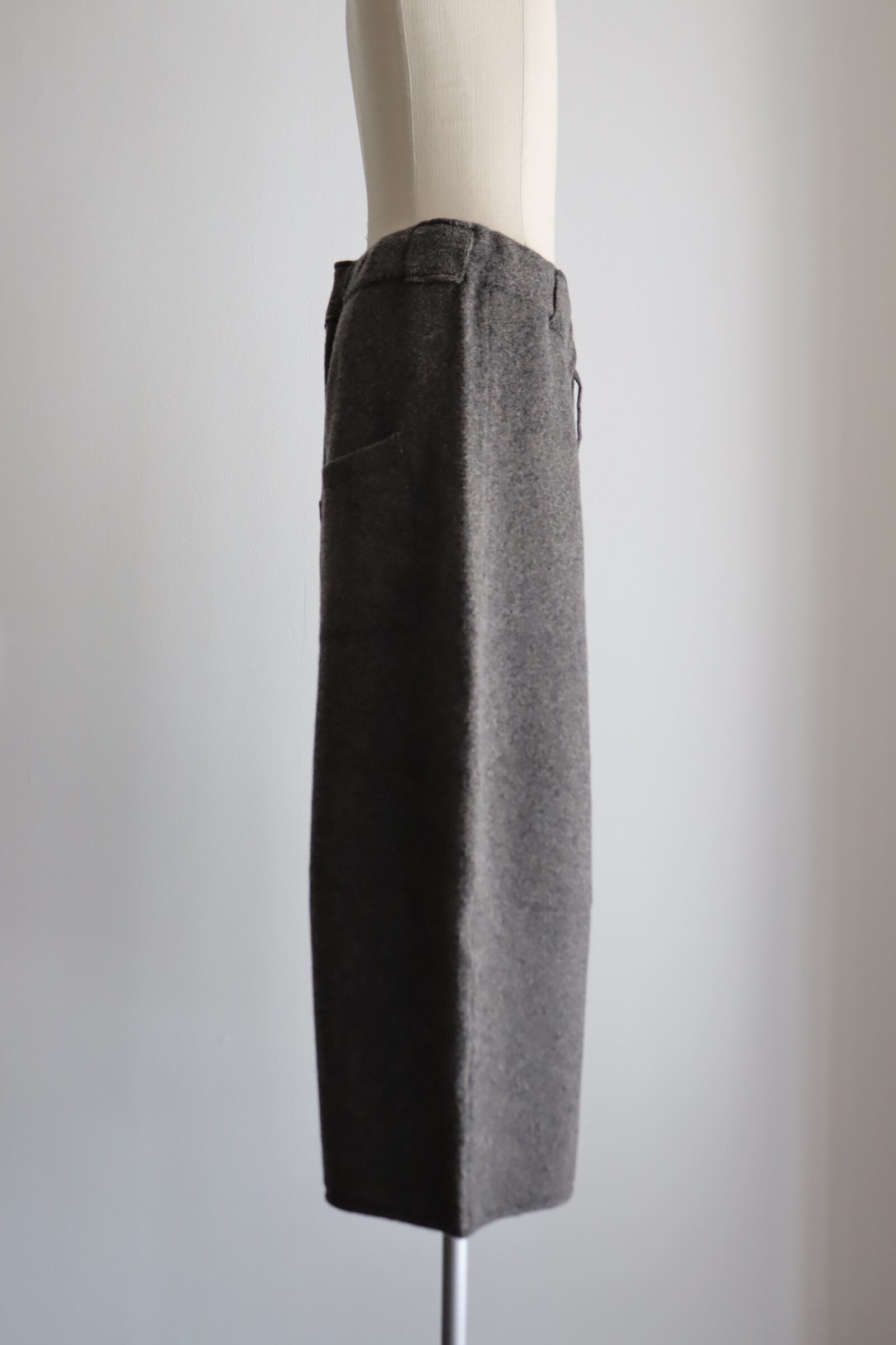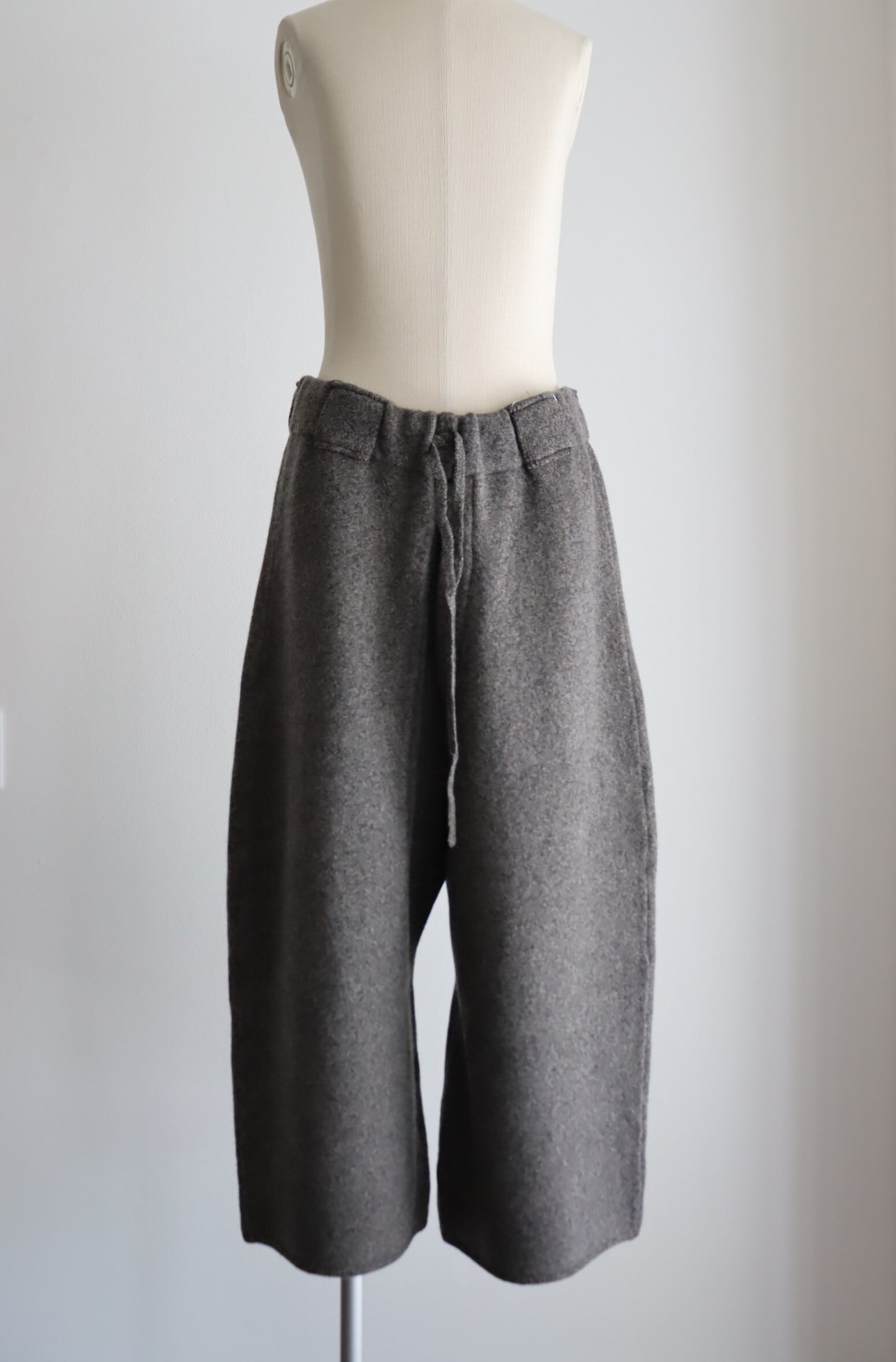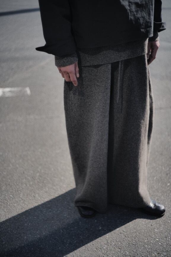 デザイナー自身がヘビーオンス ウールYAKのニット 手持ちのセーターを見返すと、どれも耐久性に対して心もとなさを感じました。 肘が抜けていたり長年着用することで毛玉を都度削ぎ落とし行った結果痩せていたりと。 裏毛のスウェットに負けない究極なヘビーオンスセータを着たいという思いから、内モンゴルにて牧場から紡績、編みまでを一貫生産する国内ニットファクトリーとのオリジナル素材開発を進行。 今回こだわったのは、その編み地だけでなくカラーでした。 既存のTOP糸に対して、無染色のYAKを混ぜることにより、オリジナルの温かみのあるTOPが完成しました。 今までに見たことがない色と見た事がない編み地、その両方を楽しんでいただけたらと思います。 型は、編み目を減らしてシルエットを形成していく方法をダーツに応用し、腿から膝にかけてカーブするように湾曲したテーパードが特徴的なエクストラワイドパンツになります。 贅沢な分量とその重量からなるインパクトをスタイリングに加えて頂けましたら幸いです。