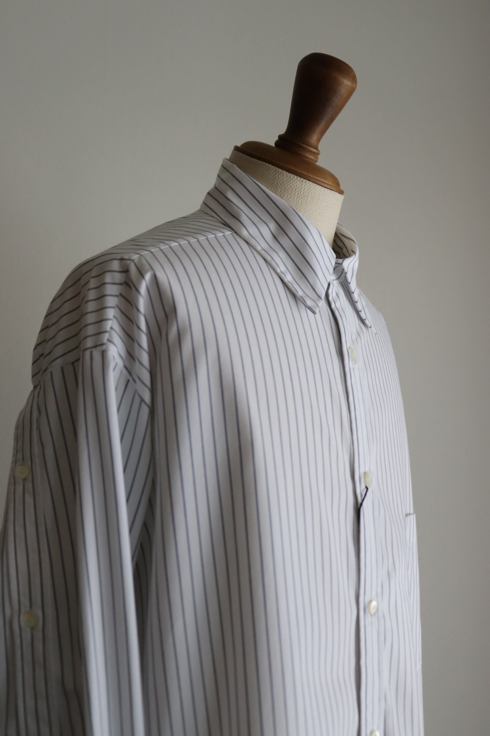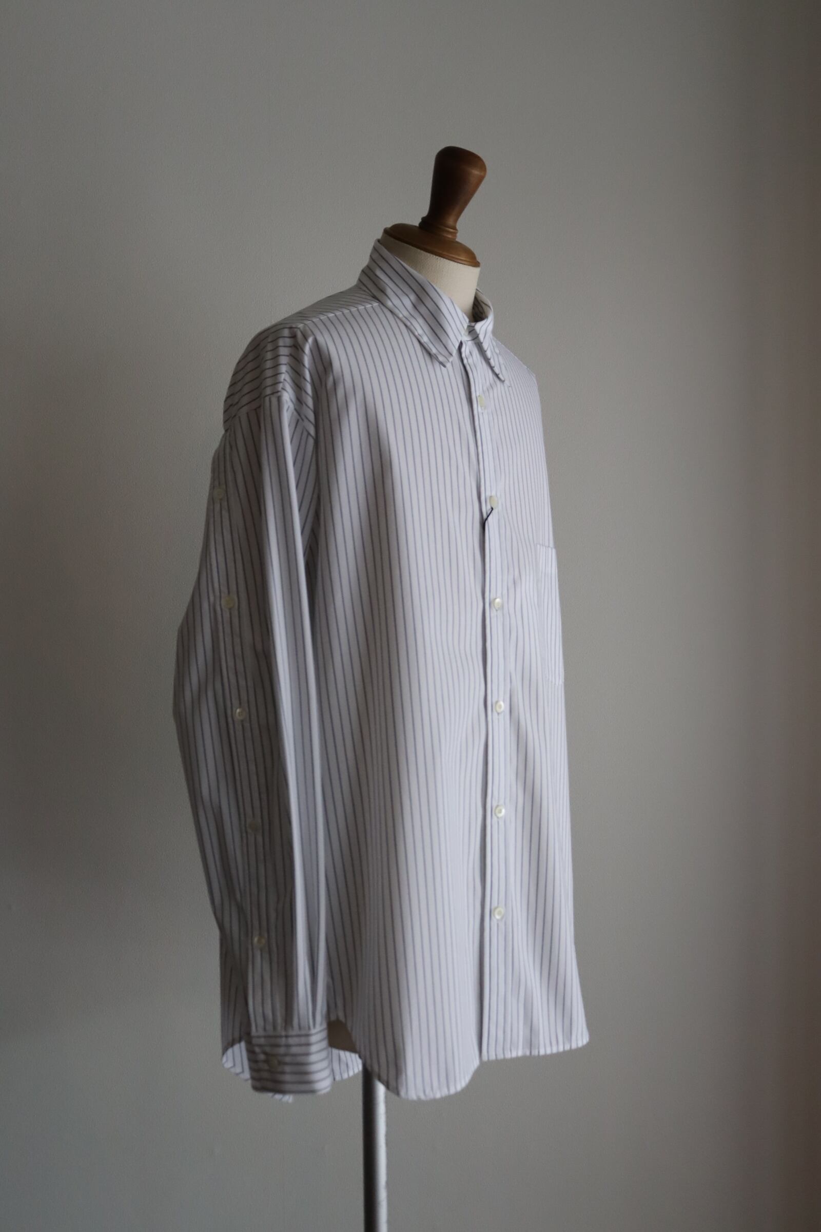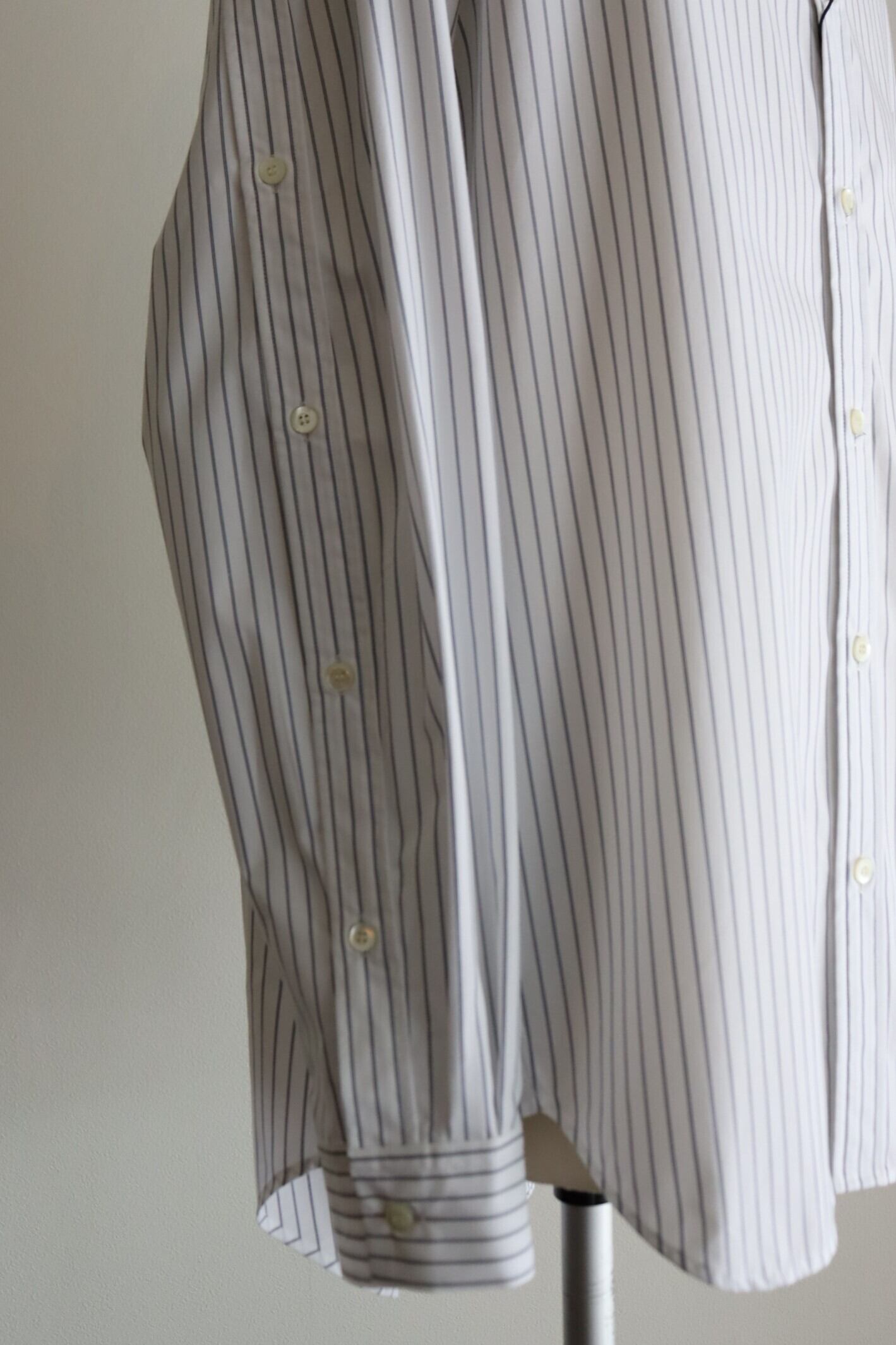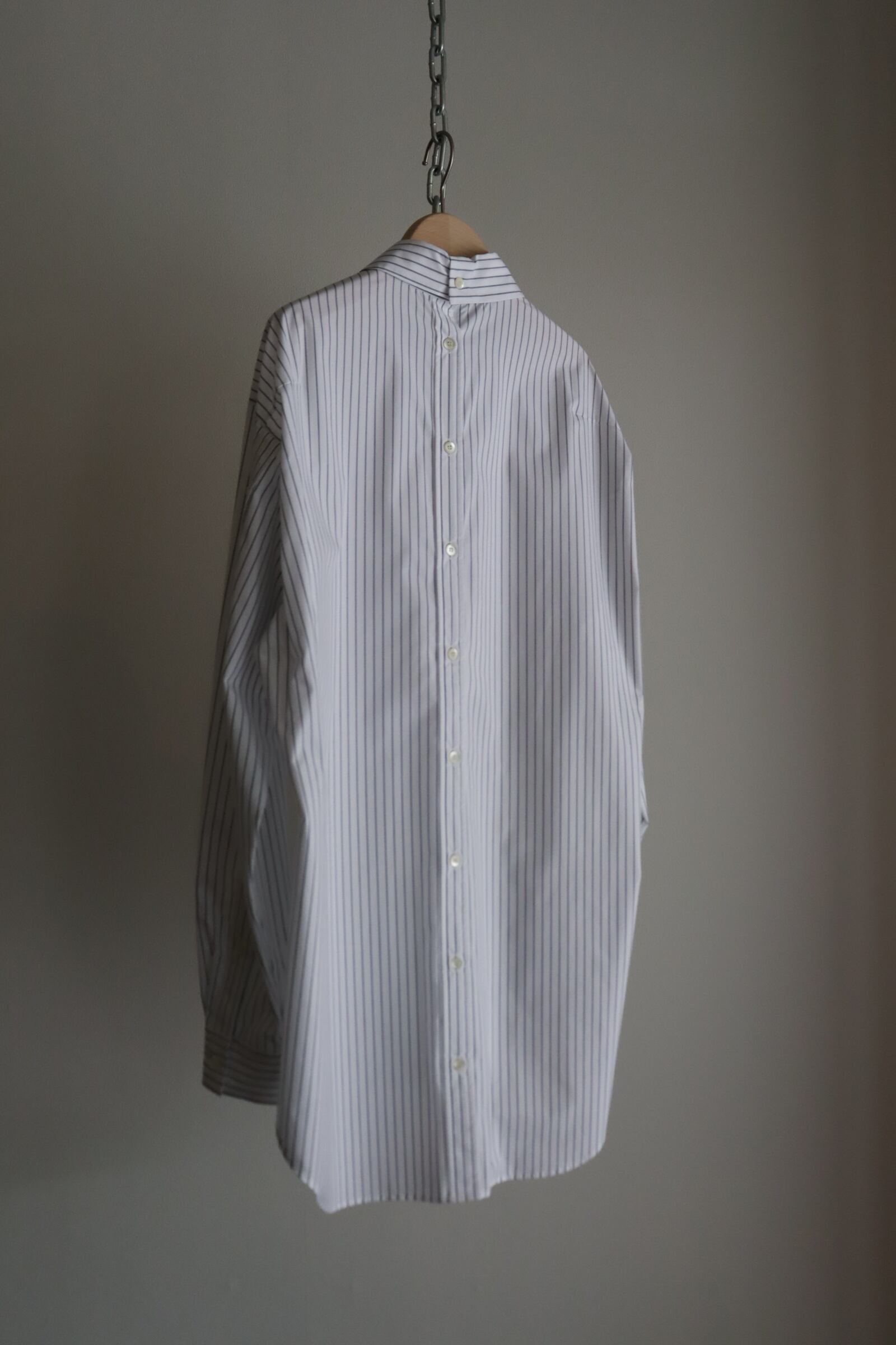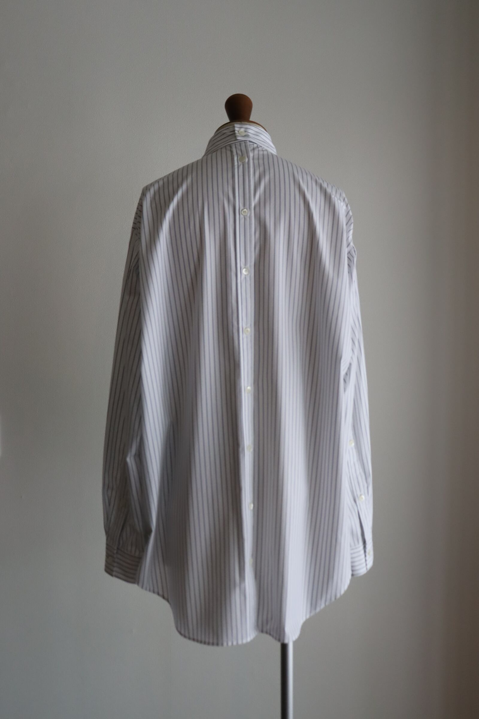 液アン加工により生地の反発感と膨らみが特徴で、シワになりにくいイージーケアが魅力の生地を使用したブランド定番のフルオープンシャツ。密な織り上がりでツヤ感もあり、キレイなストライプ生地です。 袖のタテハギや後中心が前立てのような仕様になっており、開閉可能なデザインになっています。