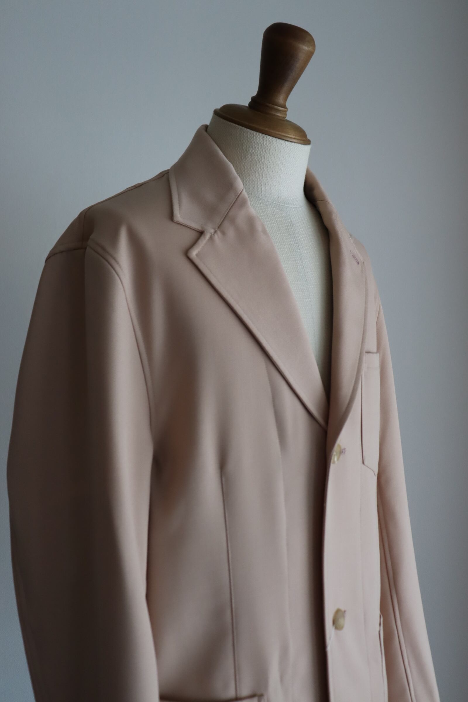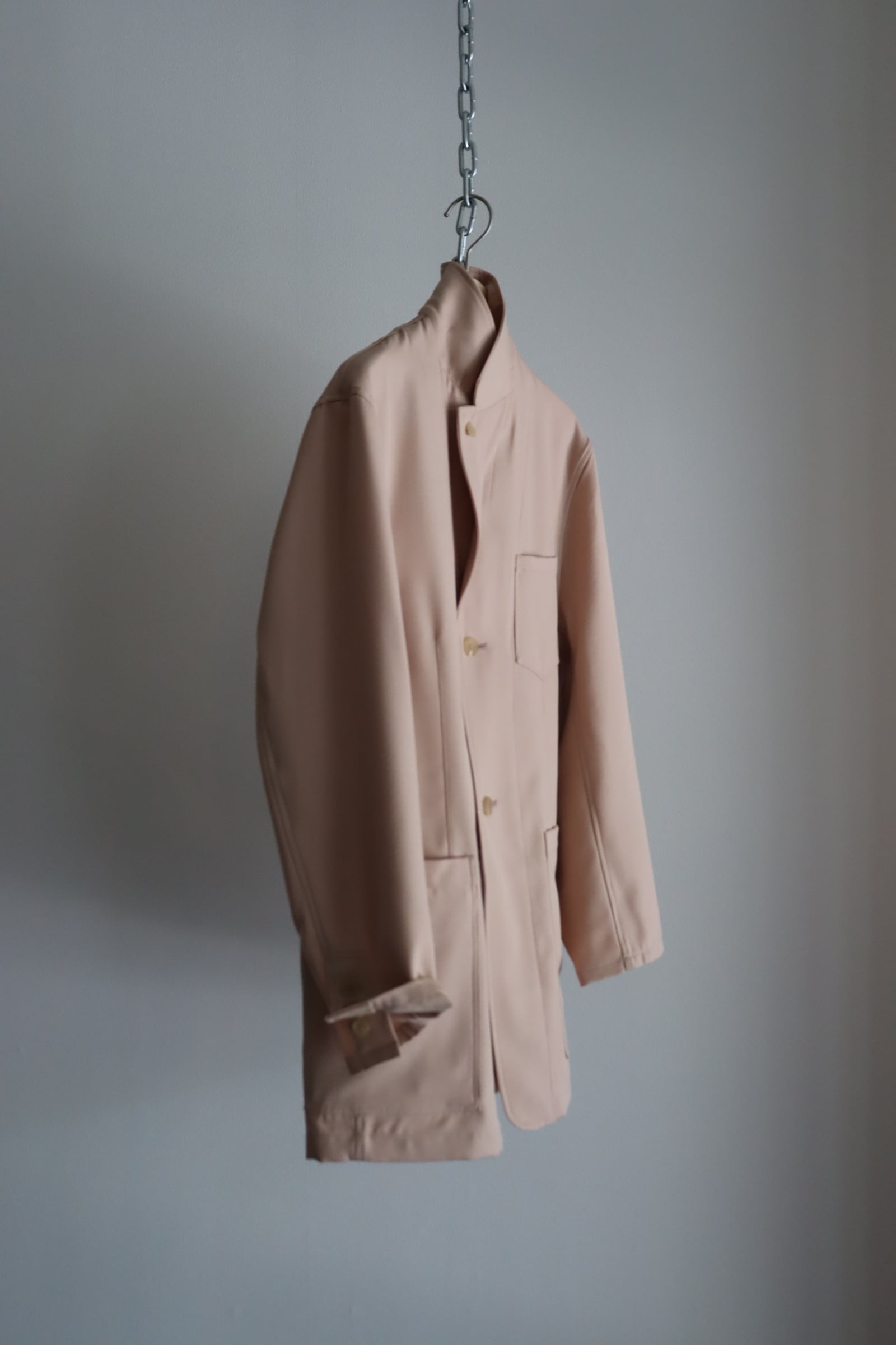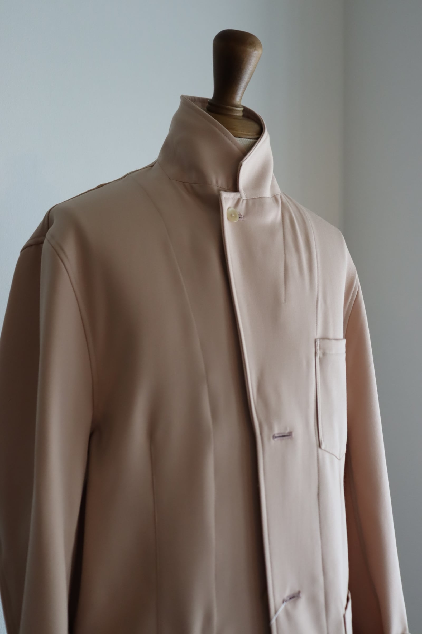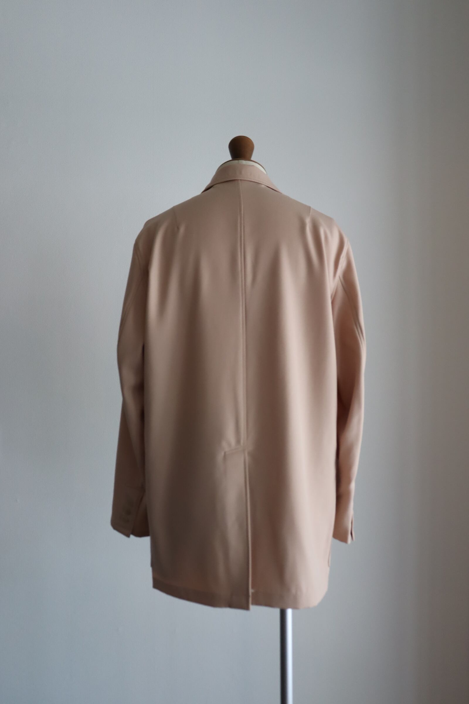 バックサテンギャバジン素材を使用したカットアウェイフロントJKT。 裏面をサテンにすることで、肌あたりの良い着心地を実現。 二重織り素材特有の張り感とエアリーな落ち感が共存する魅力的な素材です。 耐久性にも優れており、長く丈夫に履ける事を意識しております。 型は、フロントのデザインが、後ろに流れるように添う、「カットアウェイフロント」というカッティングの技法を使用し、身体が美しく見えるよう心がけた立体的なロングジャケットとなっております。