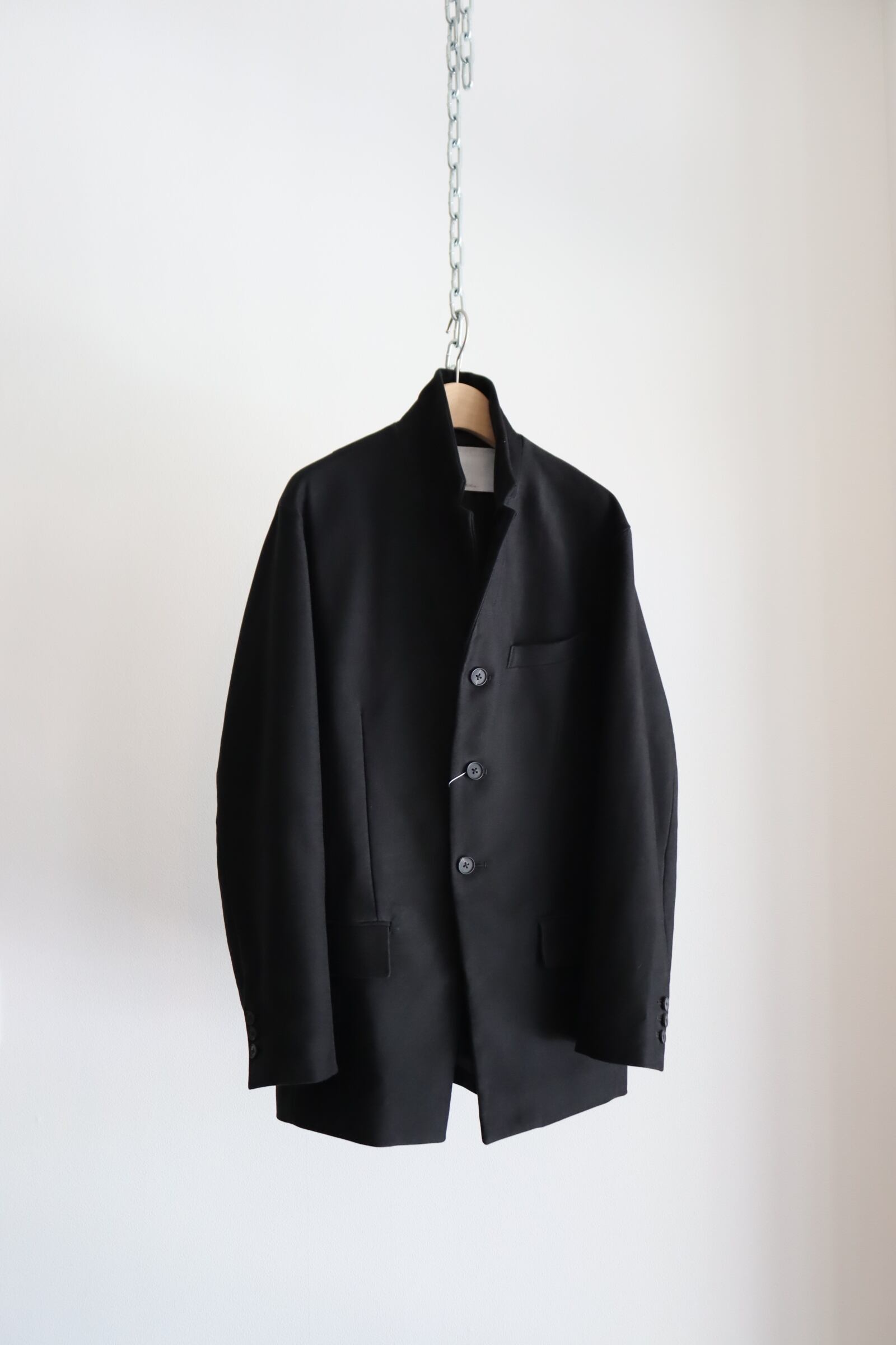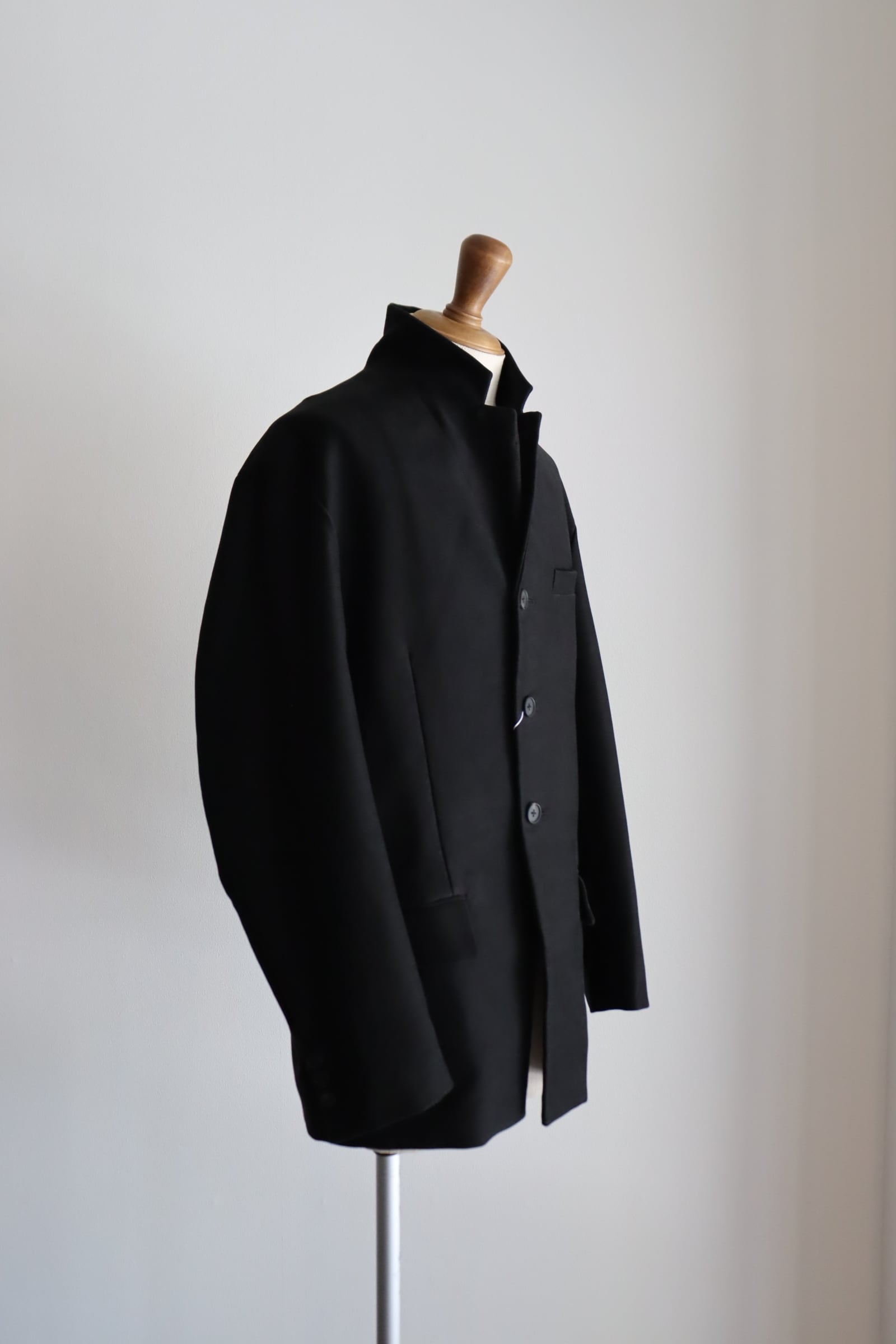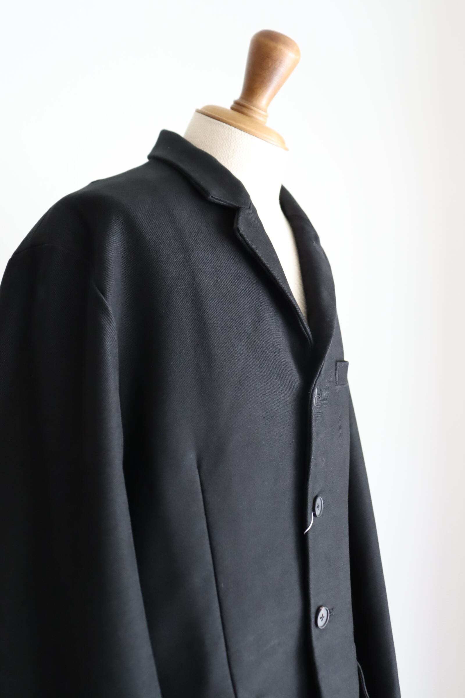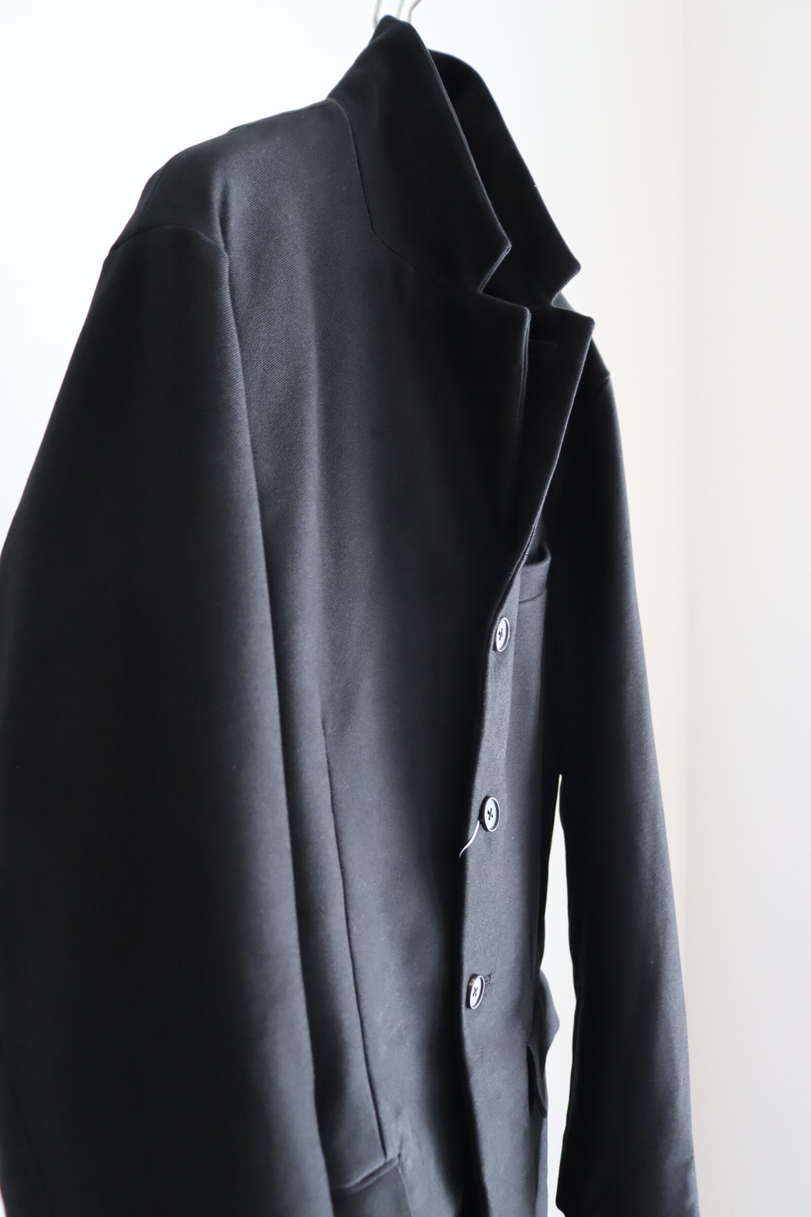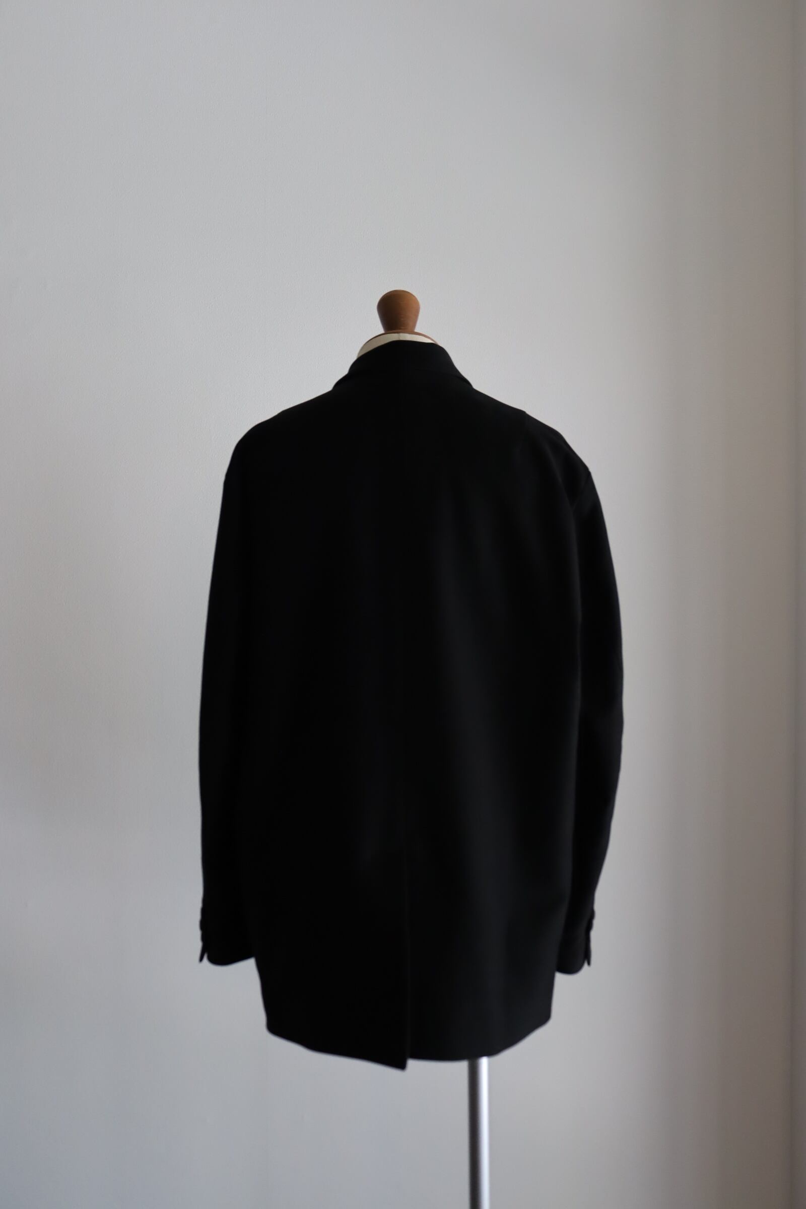 モールスキンのイメージはどうしてもガサっとしたイメージがあり、それもまた良さでもあるのですが、今回は上質な原綿を使用し、織りの技術で今までに見たことがないような、しなやかなモールスキンを目指した究極のモールスキン。 原料の持つ自然な光沢感と、高密度による隙間の無いマットな表情を味わって頂きたく、Deep Blackという深い黒の1色展開。 型は、フロントのデザインが、後ろに流れるように添う、「カットアウェイフロント」というカッティングの技法を使用し、身体が美しく見えるよう心がけた立体的なジャケットとなっております。