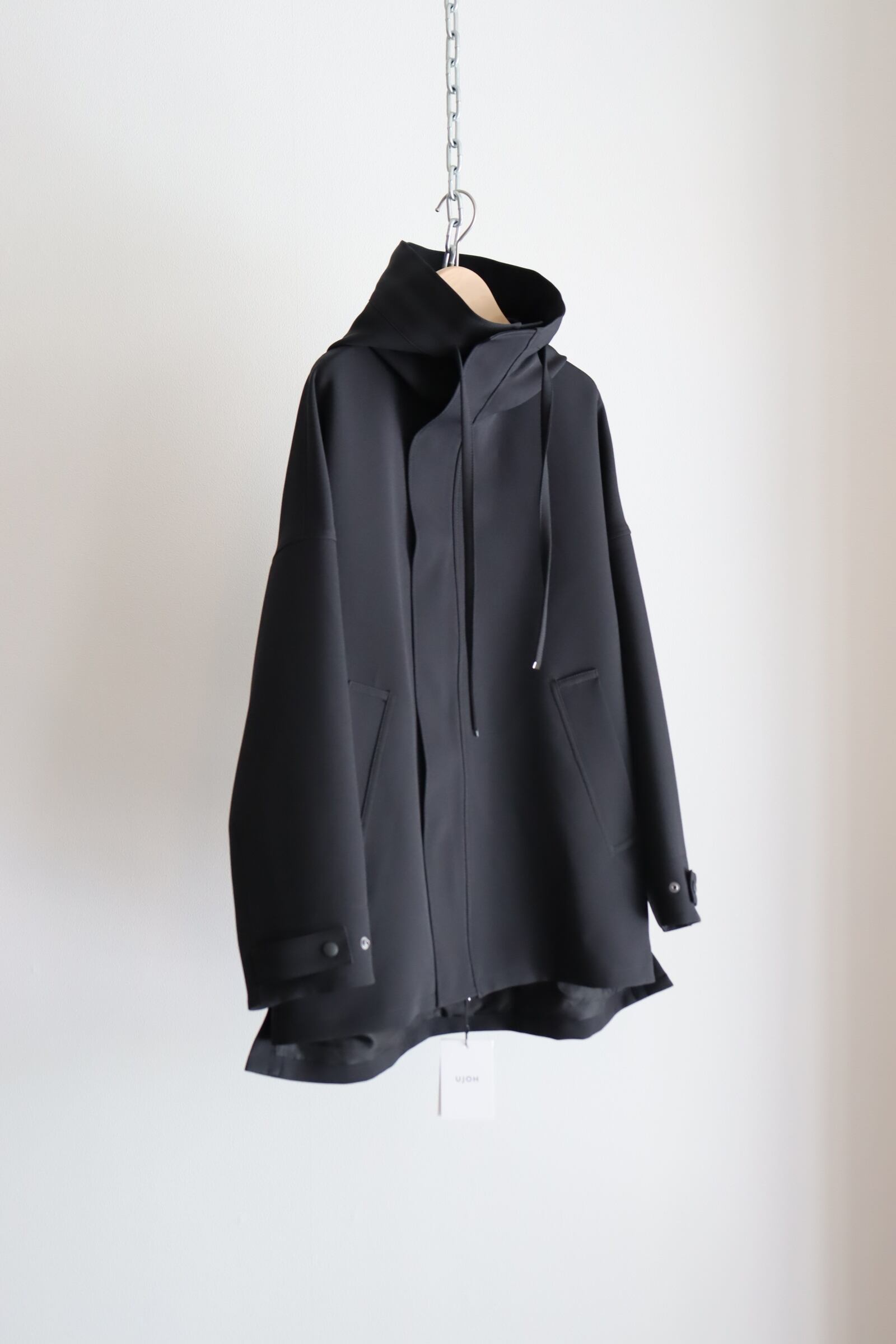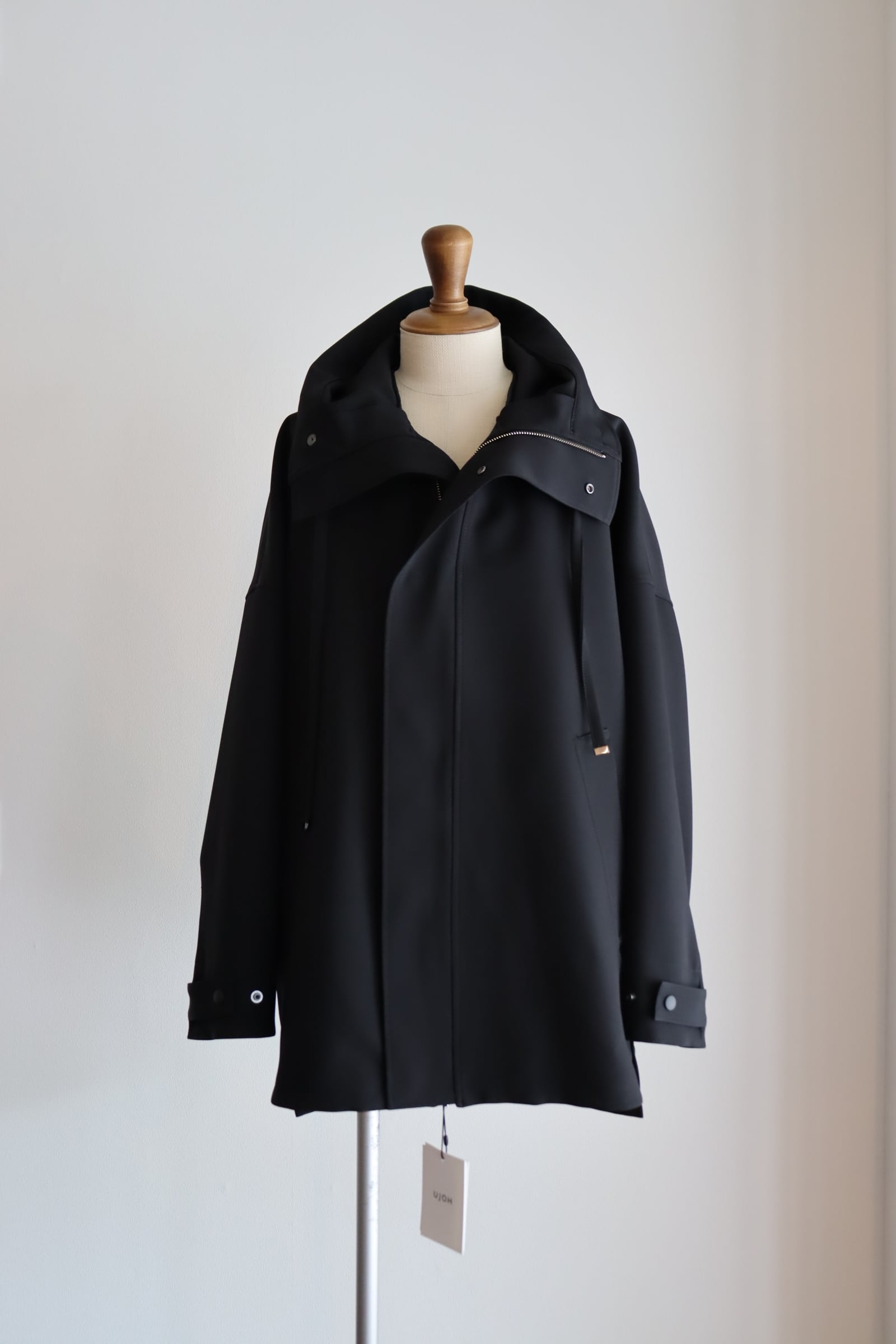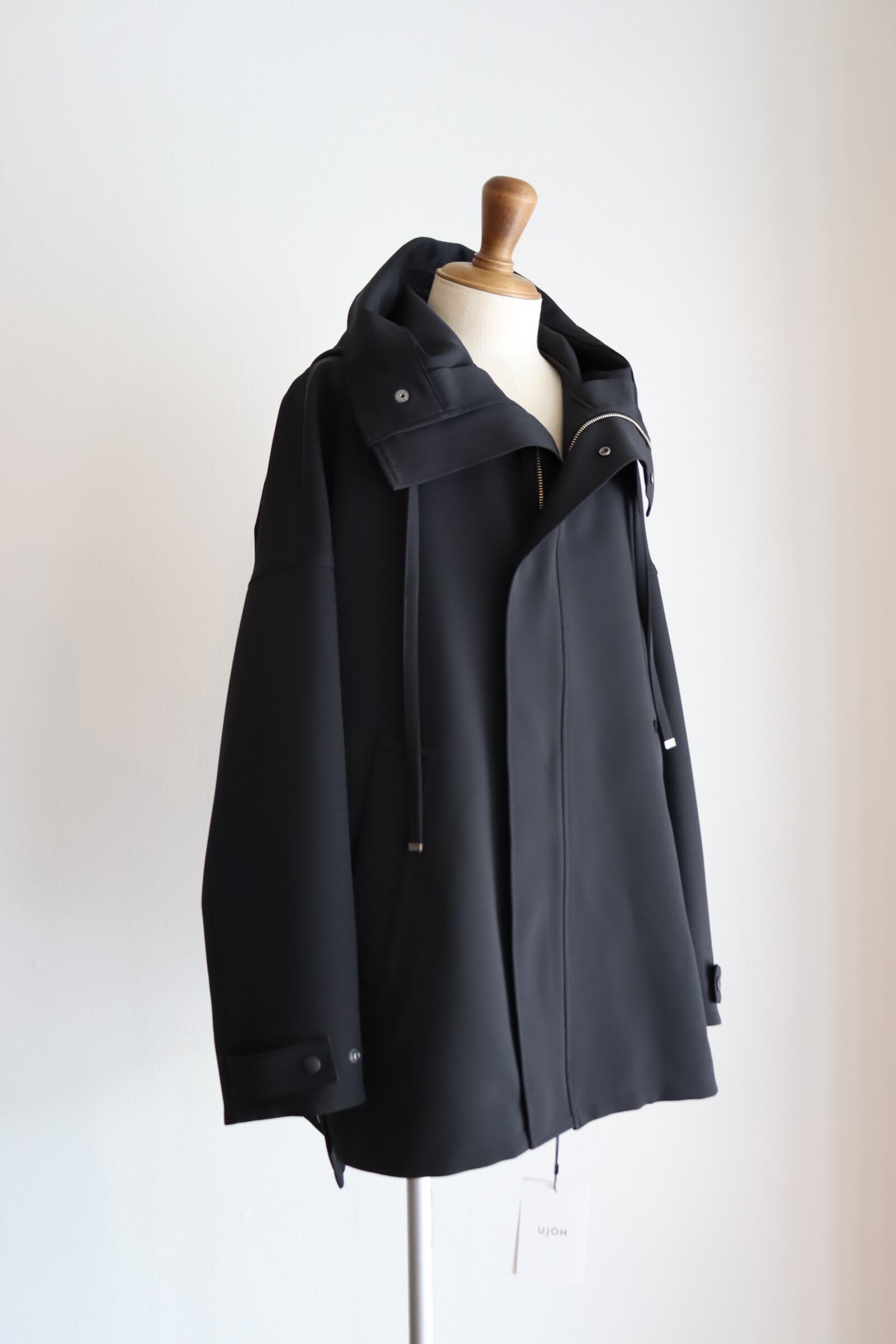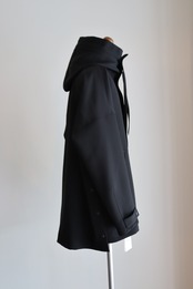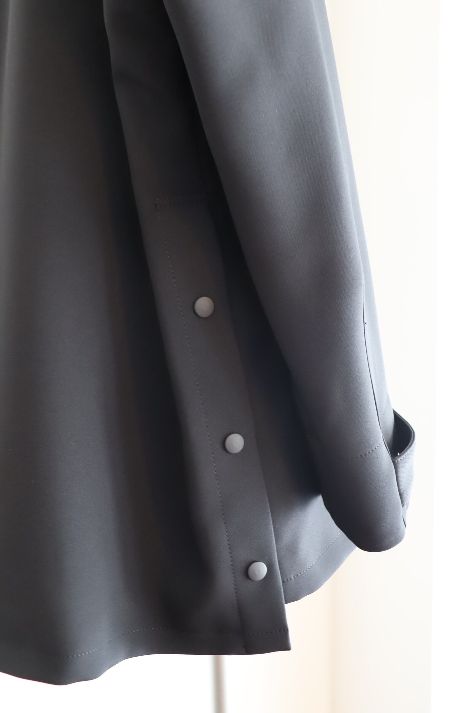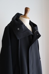 ドット釦付きサイドスリット仕様や、大ぶりなフードデザインが抜け感のある雰囲気に仕上がっています。