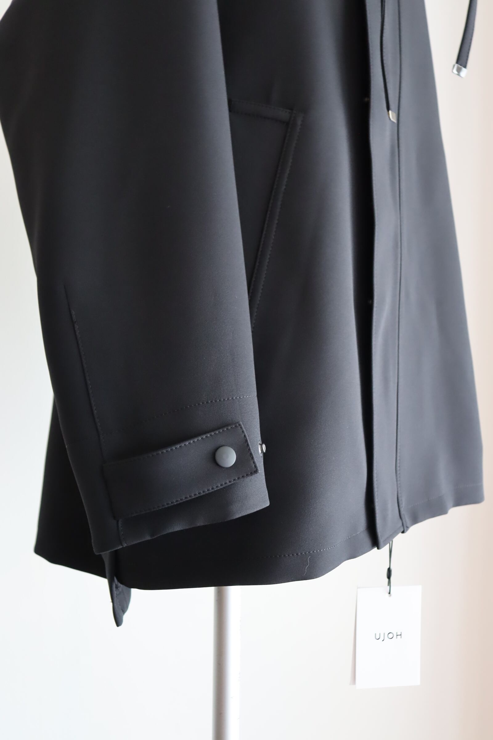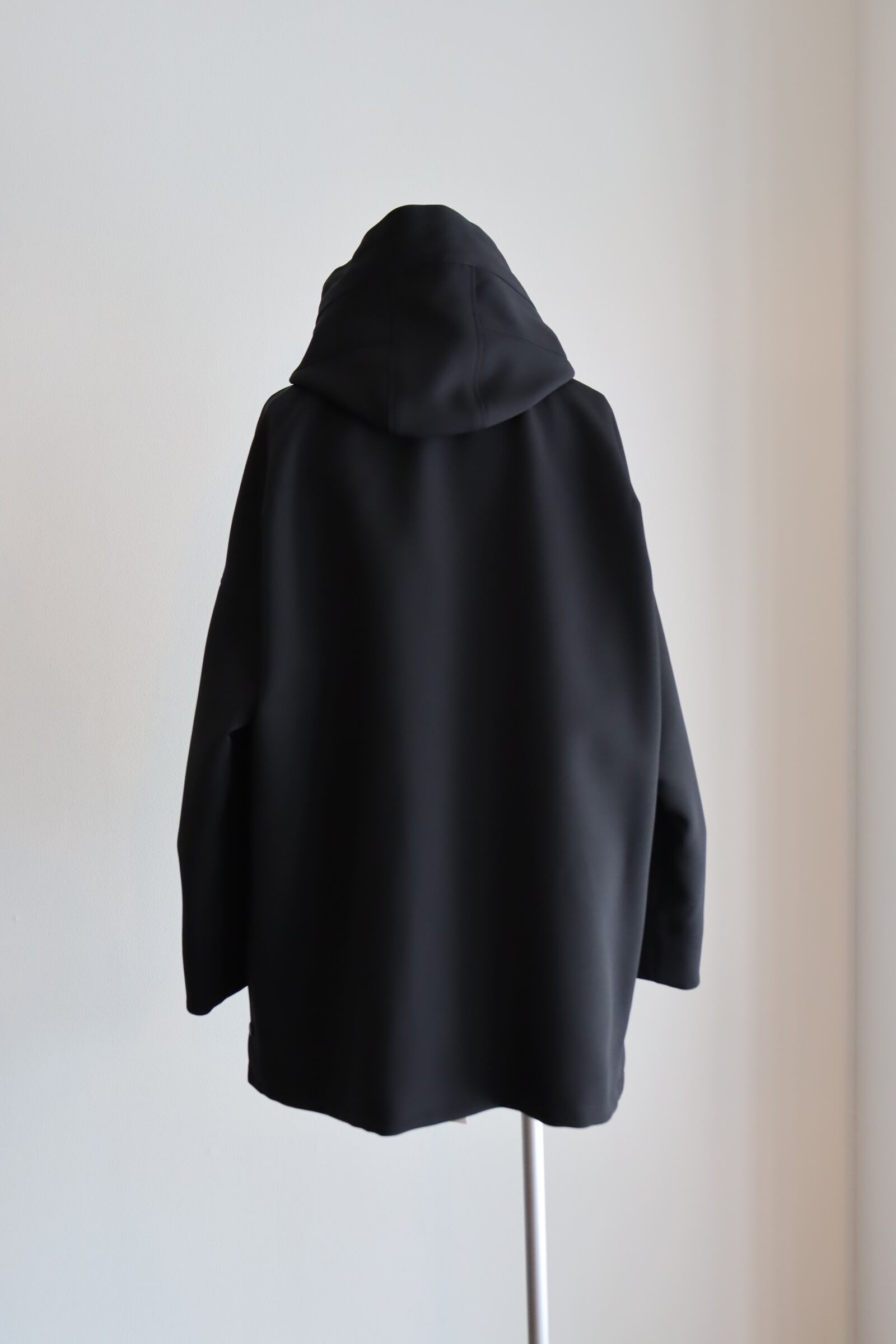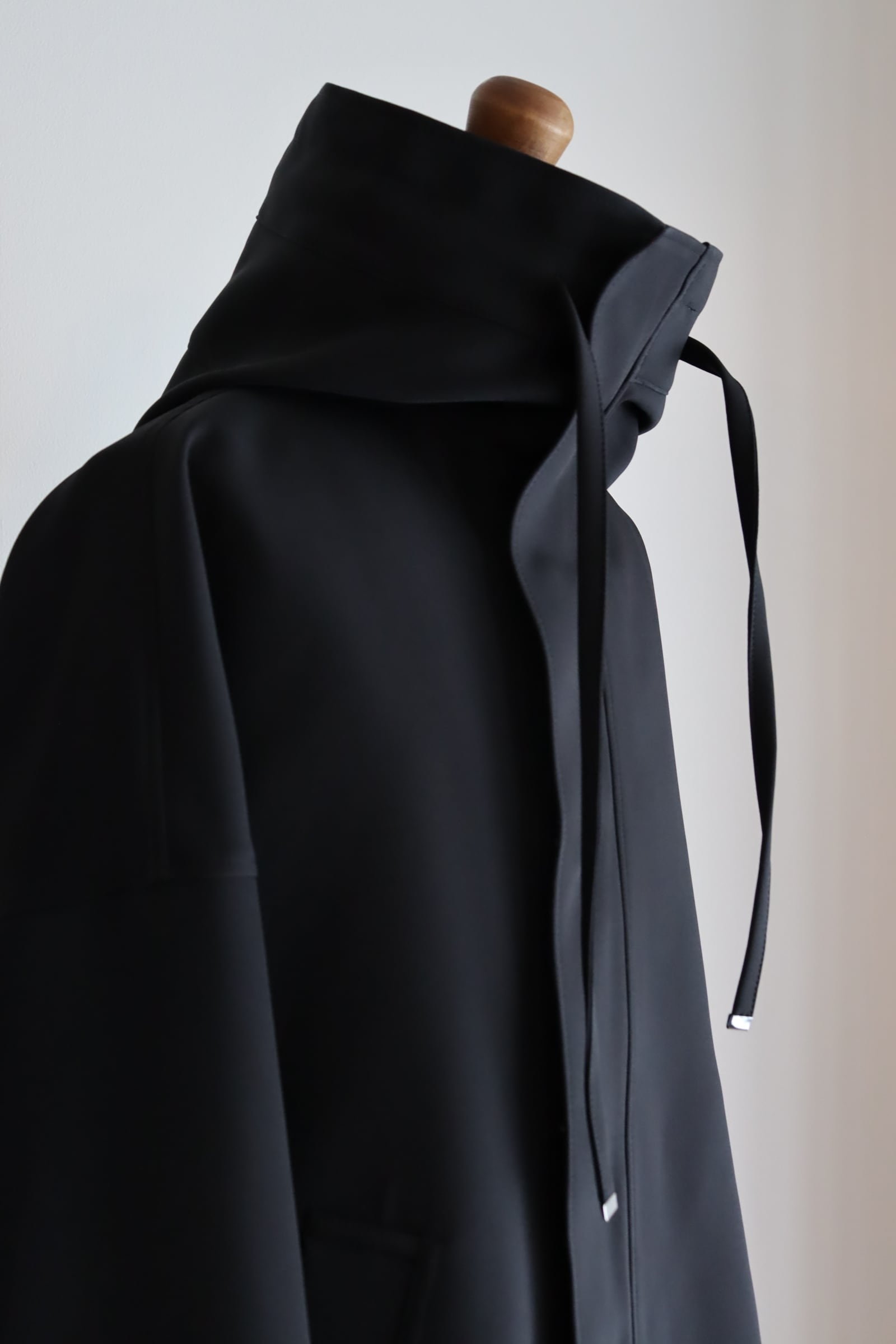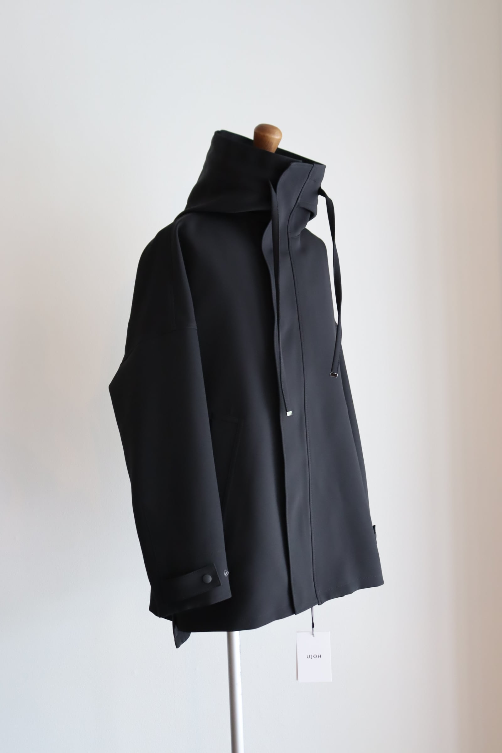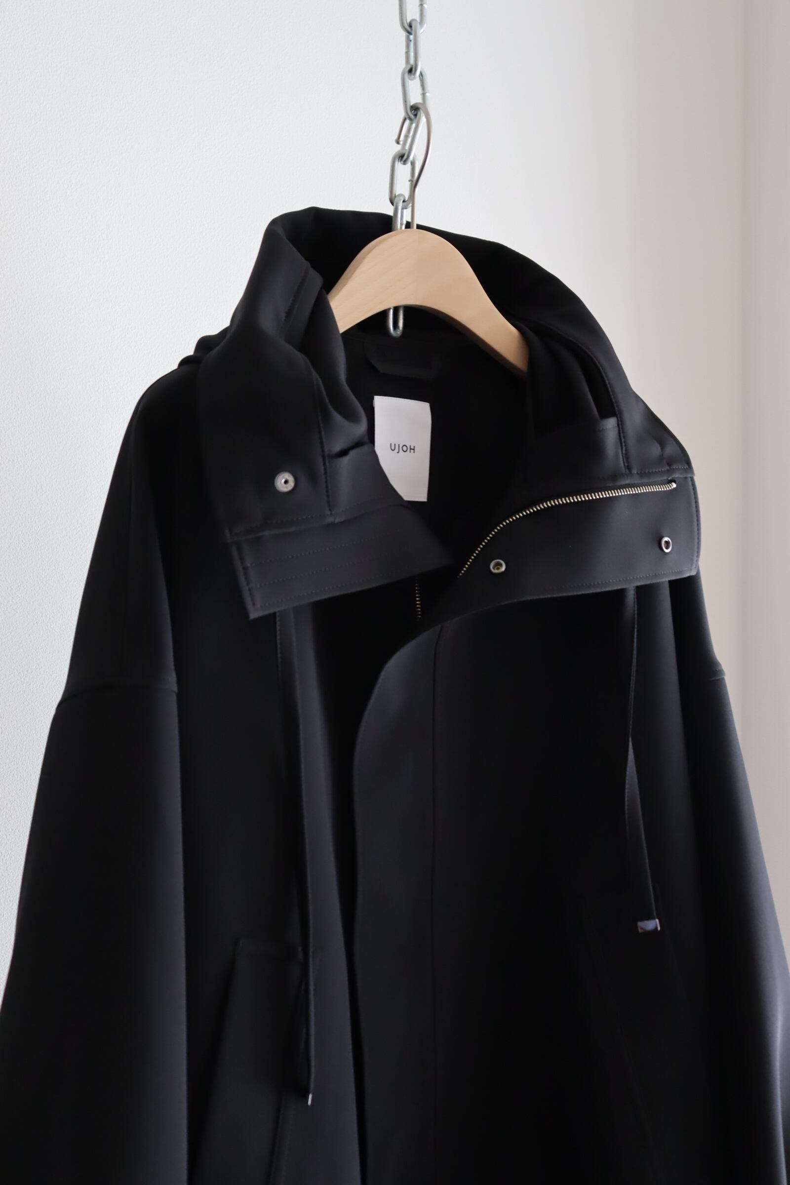 ドット釦付きサイドスリット仕様や、大ぶりなフードデザインが抜け感のある雰囲気に仕上がっています。