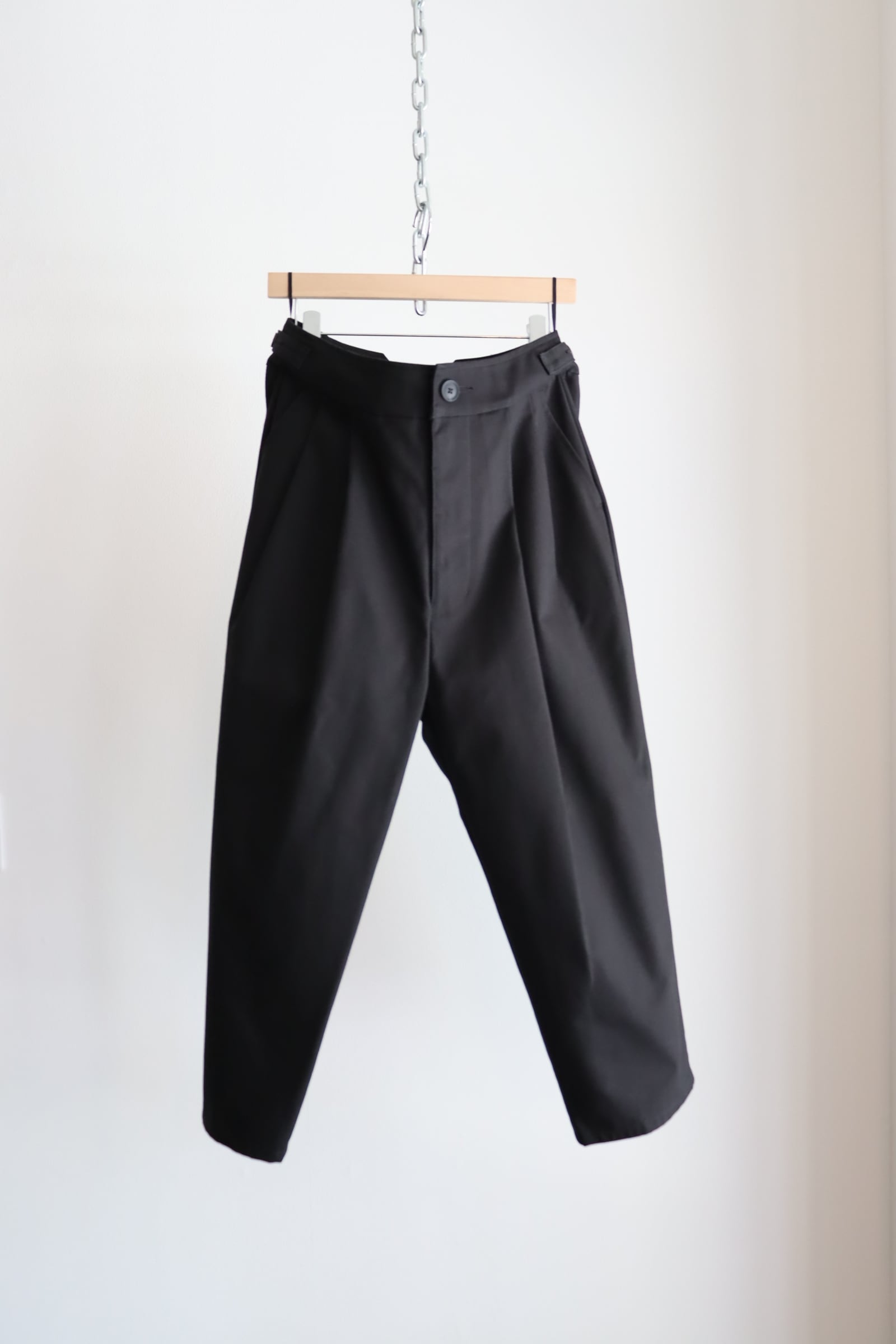 太番手のコットンの平織りによるダック素材、2タックのワイドテーパードのパンツです。