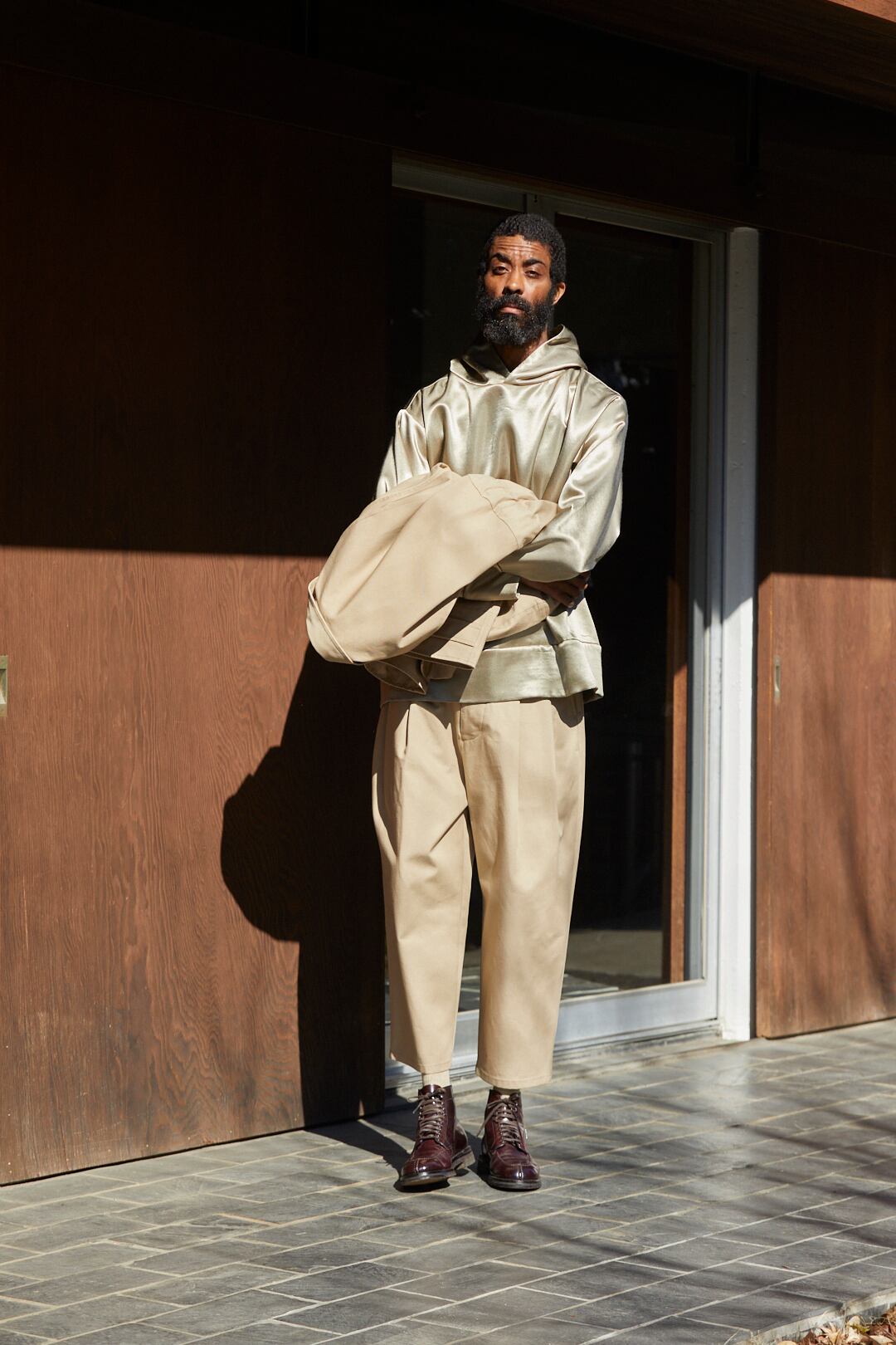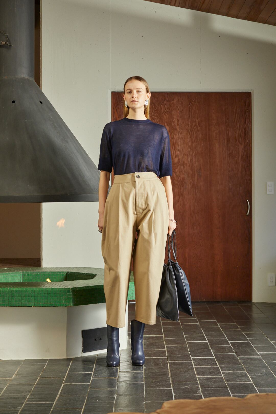 イギリス軍のオフィサーパンツのハイバックをソースに、シルエットを腰回りたっぷりの量感にすることで使いやすいバランスにしました。