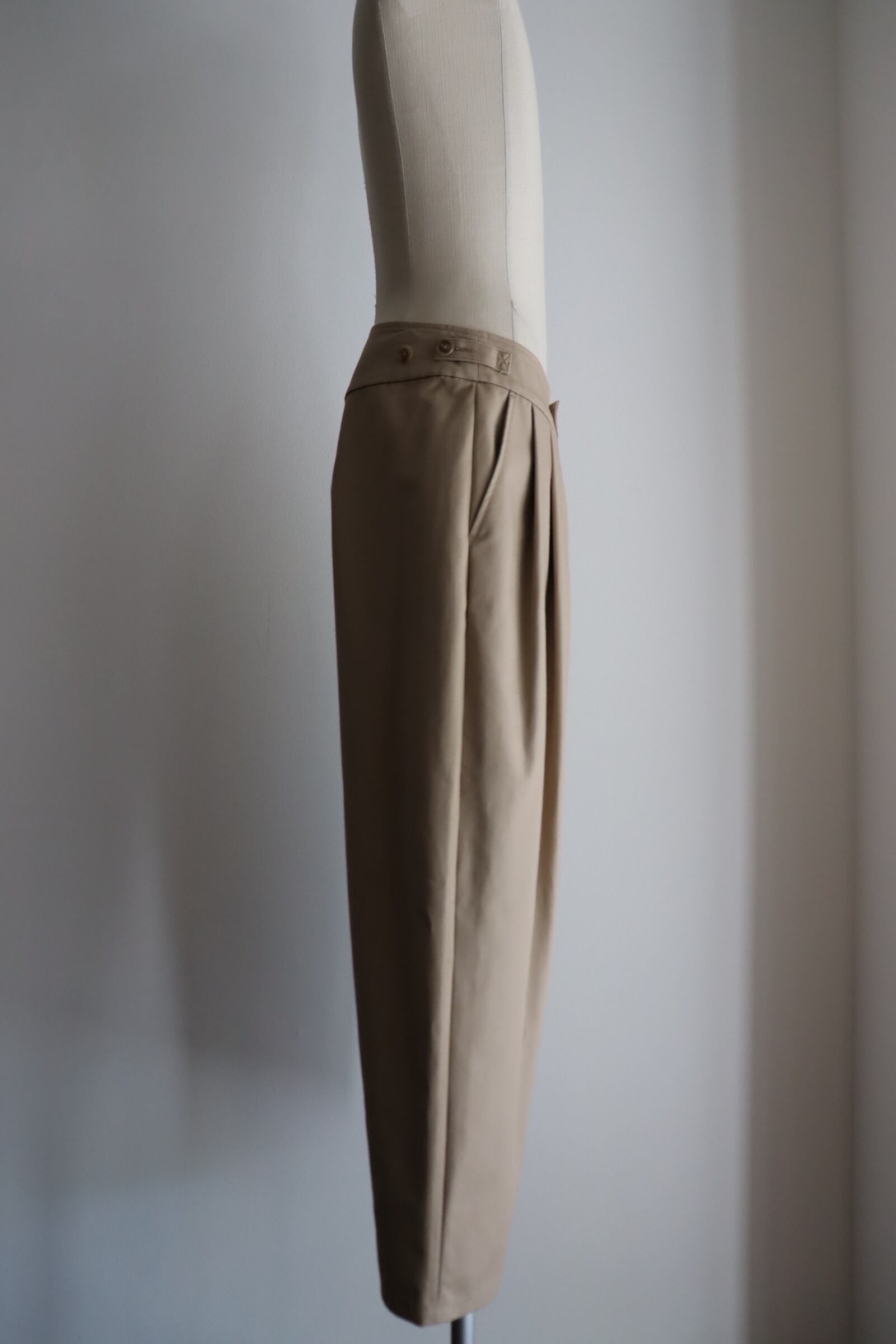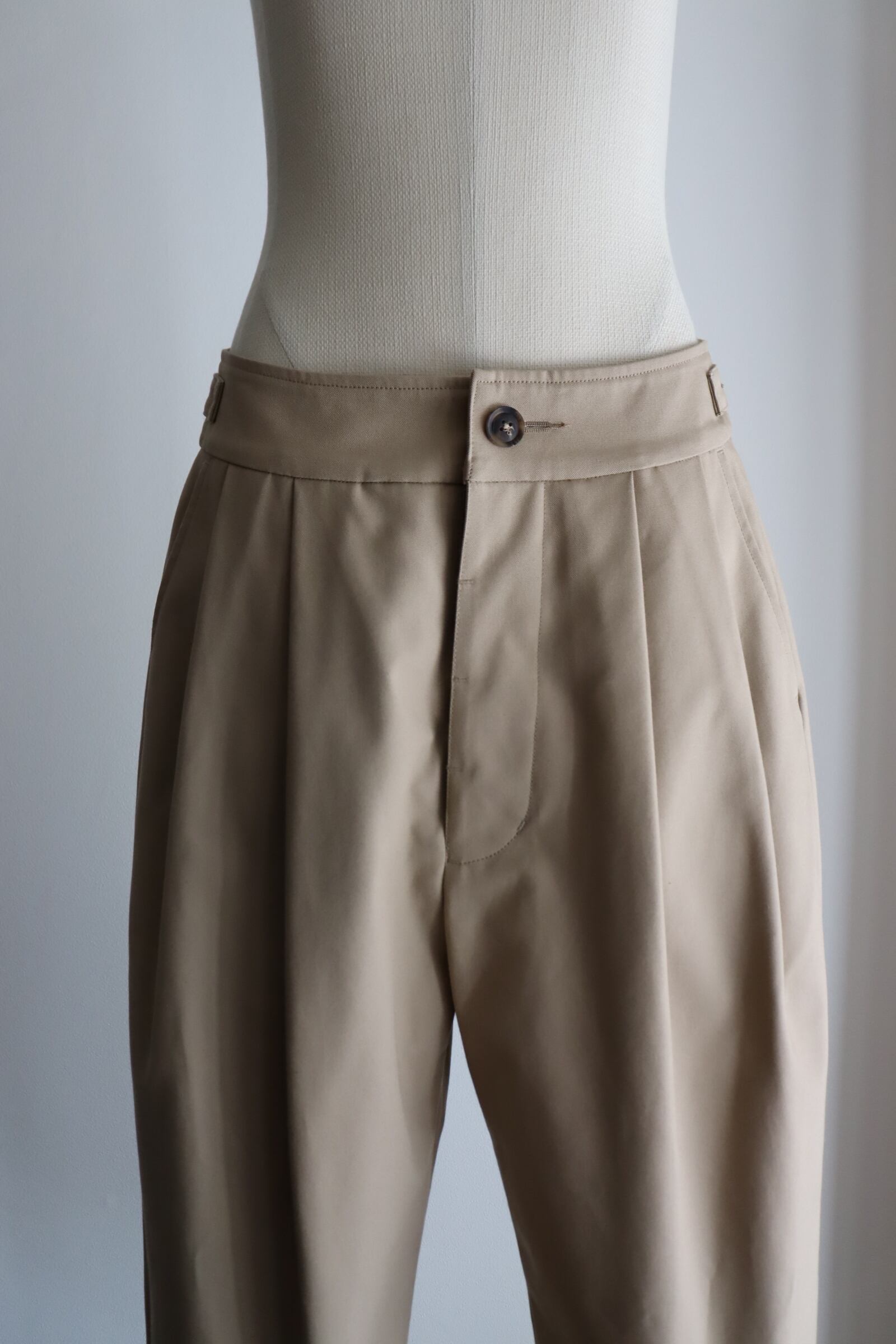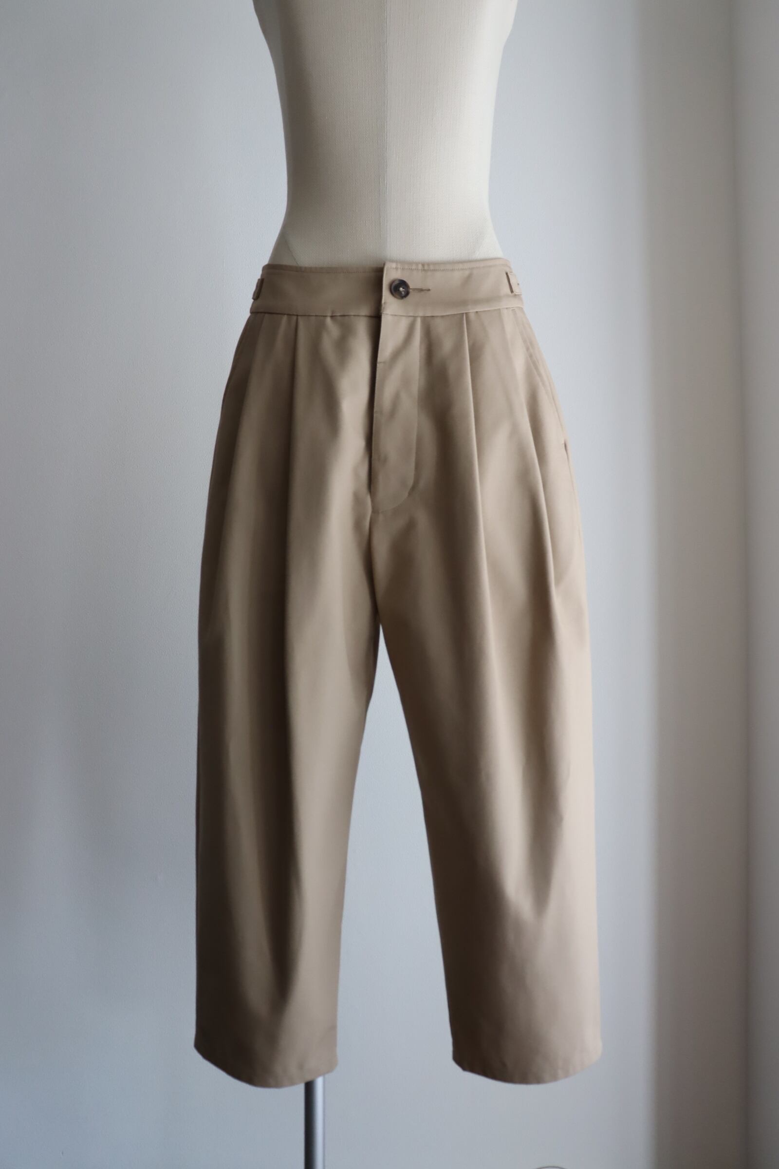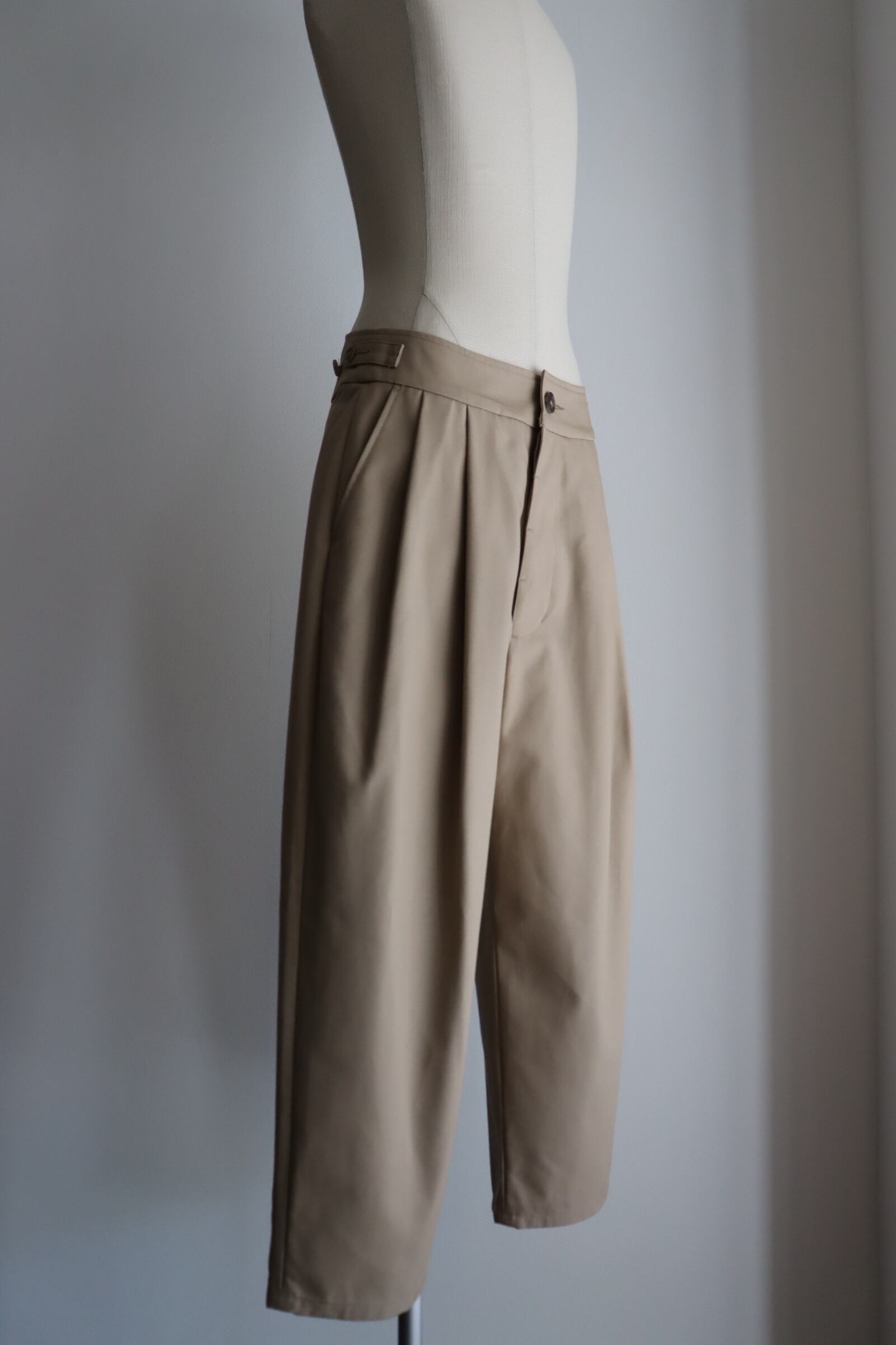 太番手のコットンの平織りによるダック素材、2タックのワイドテーパードのパンツです。