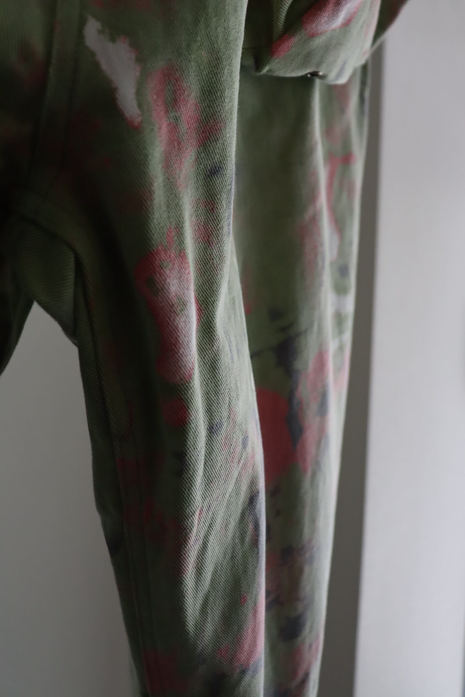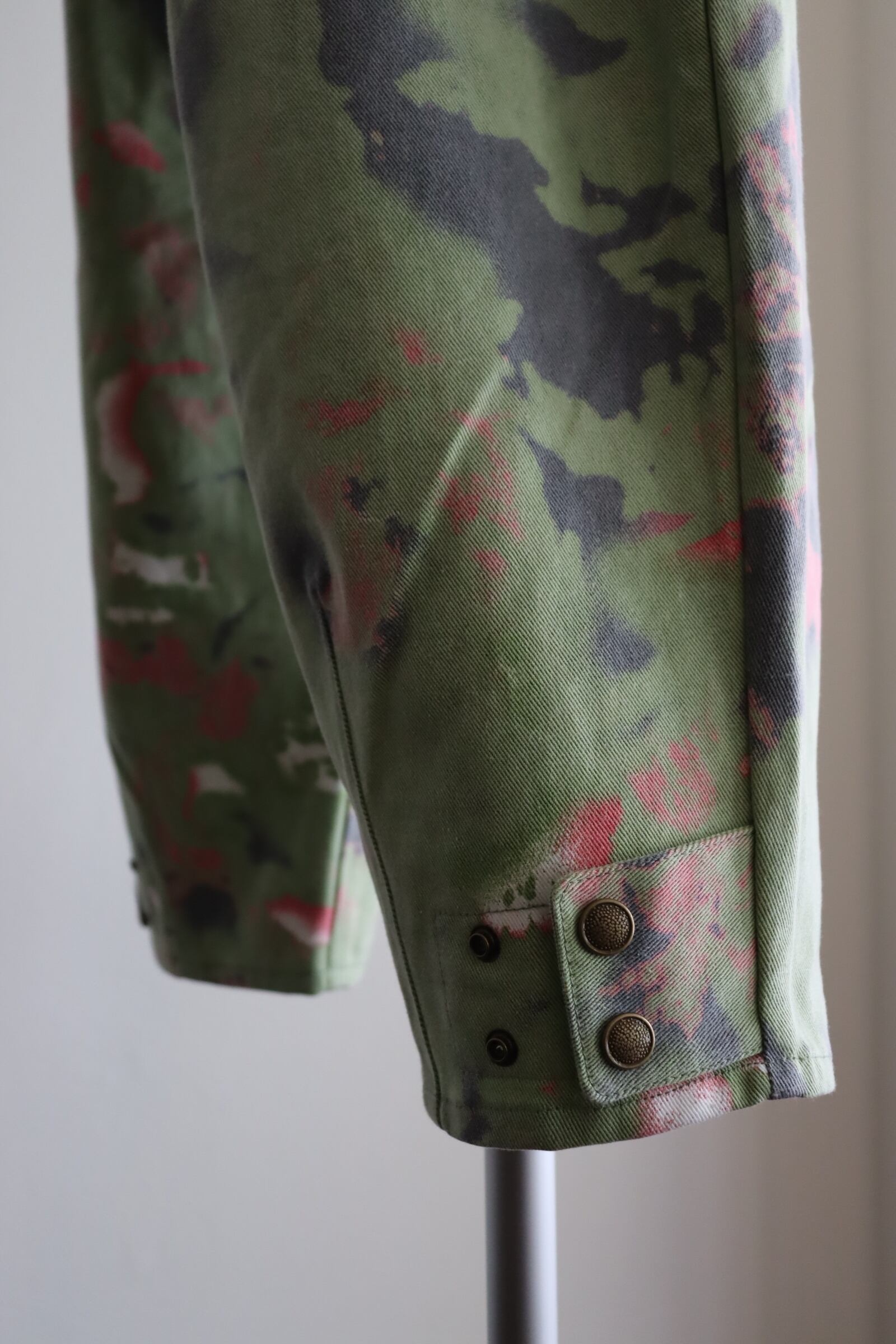ツイル生地にオリジナルのカモフラプリント、独特なプリントインク、技法、加工を施しており、手なせん屋さんで偶然出来上がり、試験を繰り返しできた勇逸無二な柄の出方を持ち合わせた特別な1着。