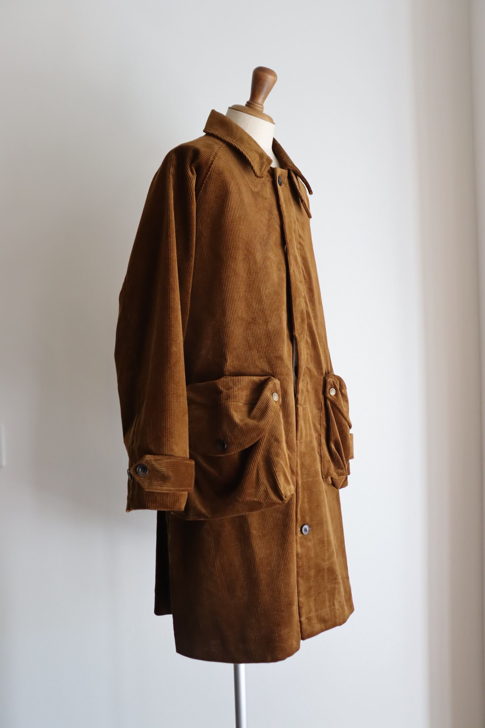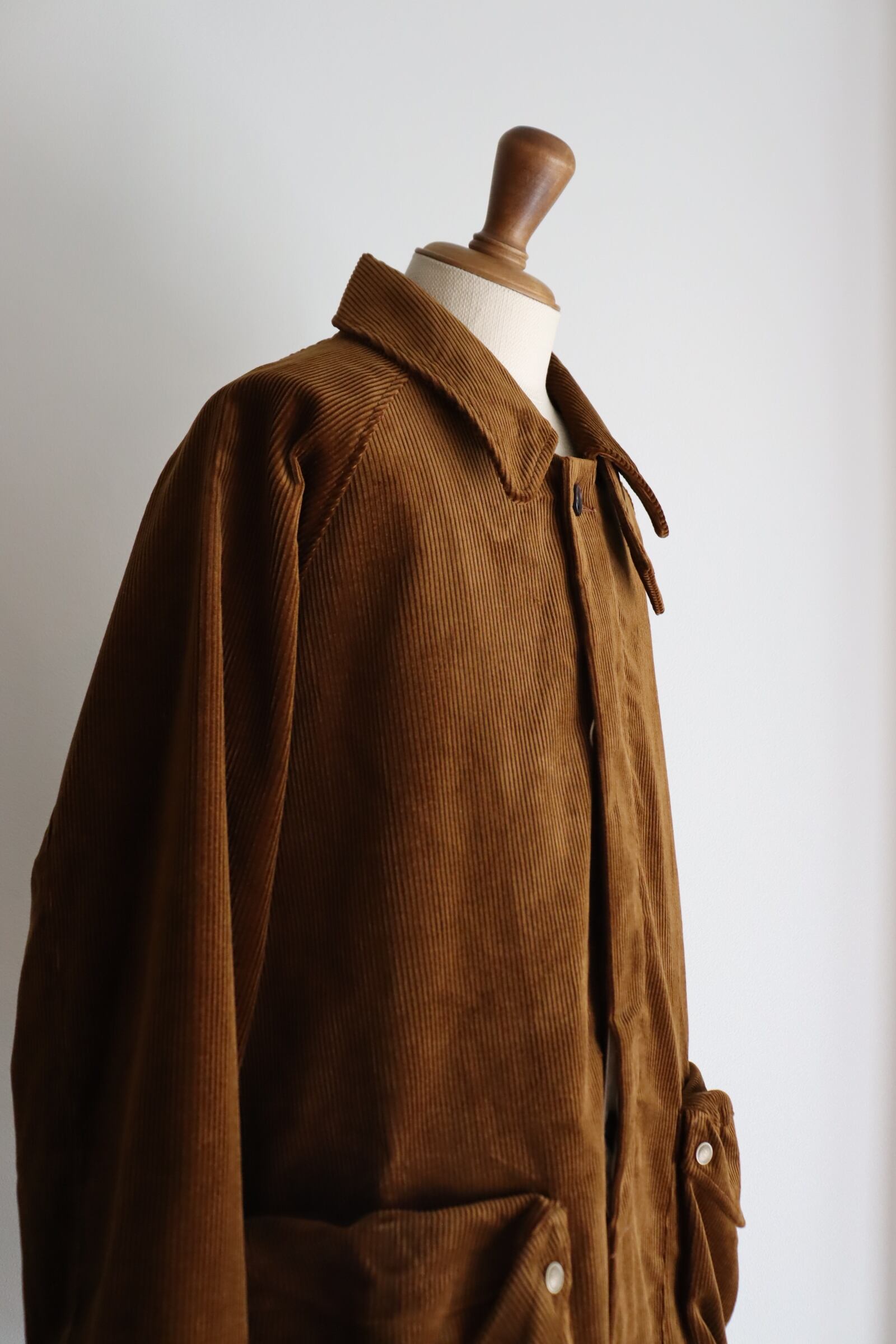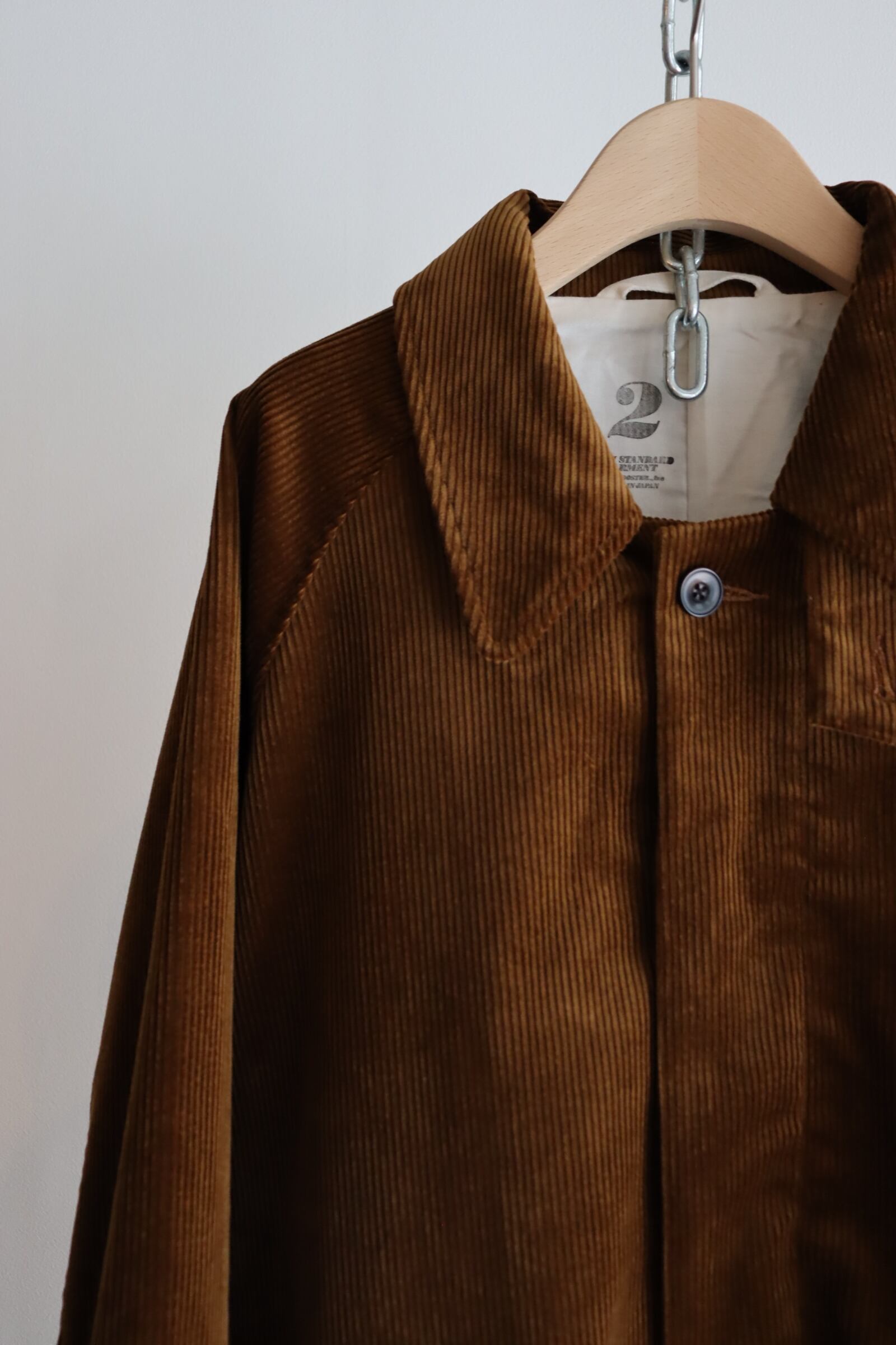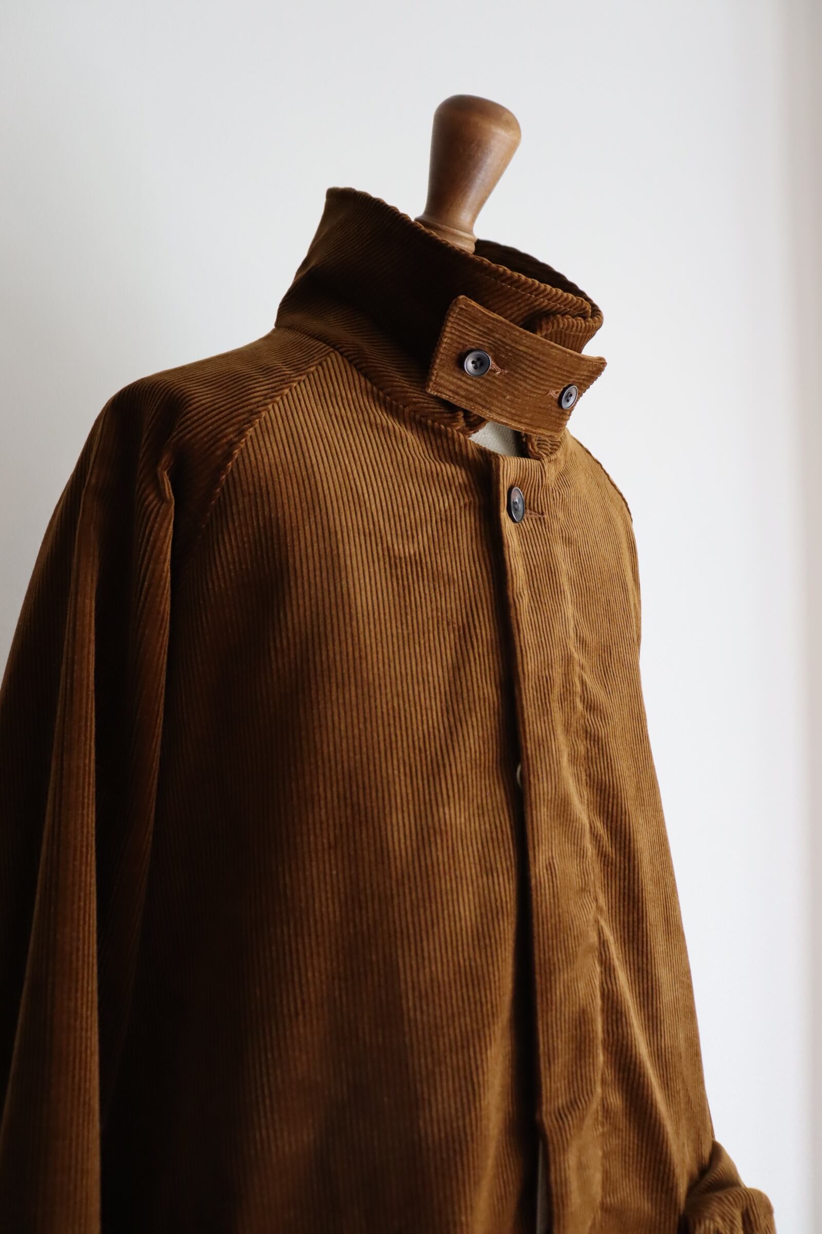 生地はフランスのビックメゾンがブリスベンモスの8welコーデュロイを日本でリプロした生機を使用。重厚なしなやかさを出すために縦糸は20オーガニックコットンの三子糸、度詰めの2重織で風に煽られないアウター用の生地として仕上っております。