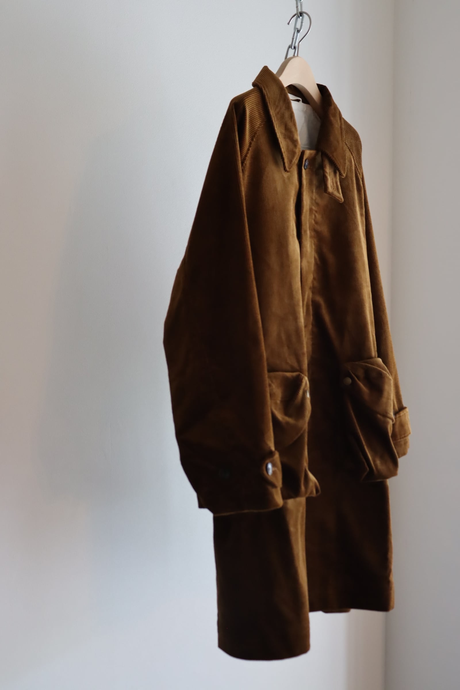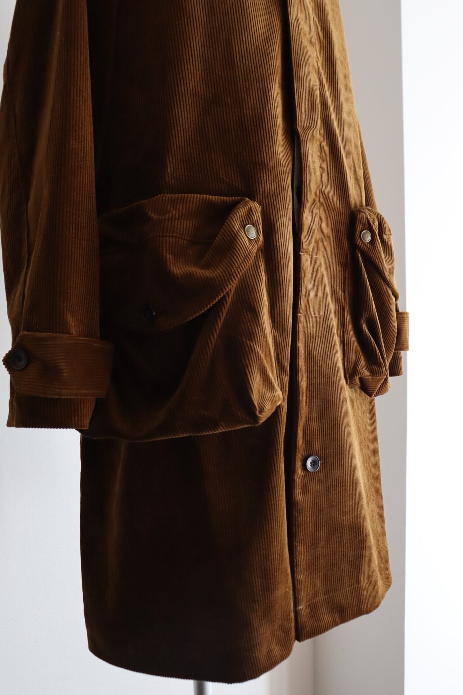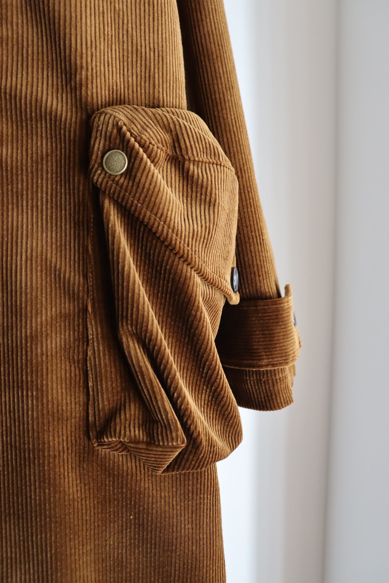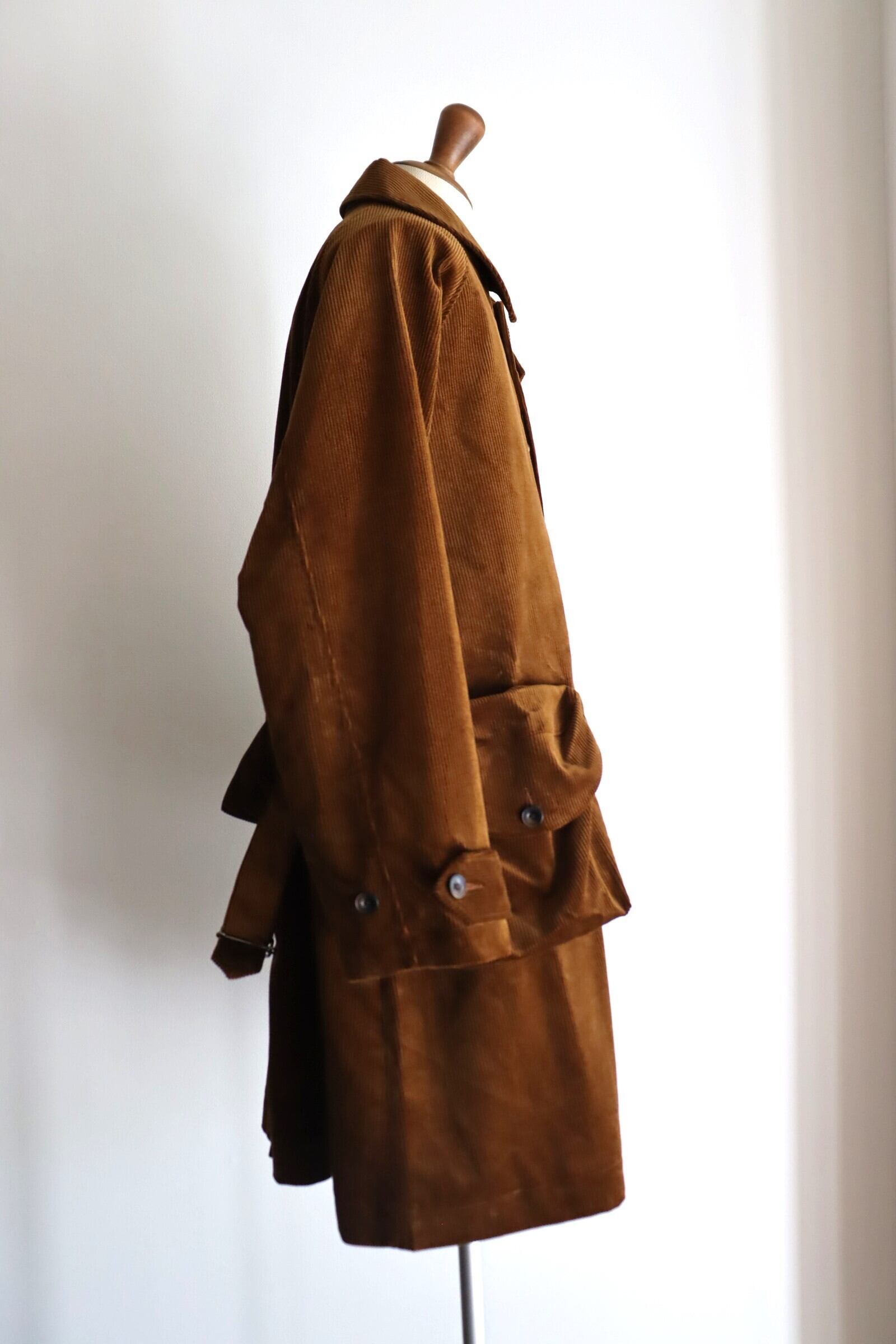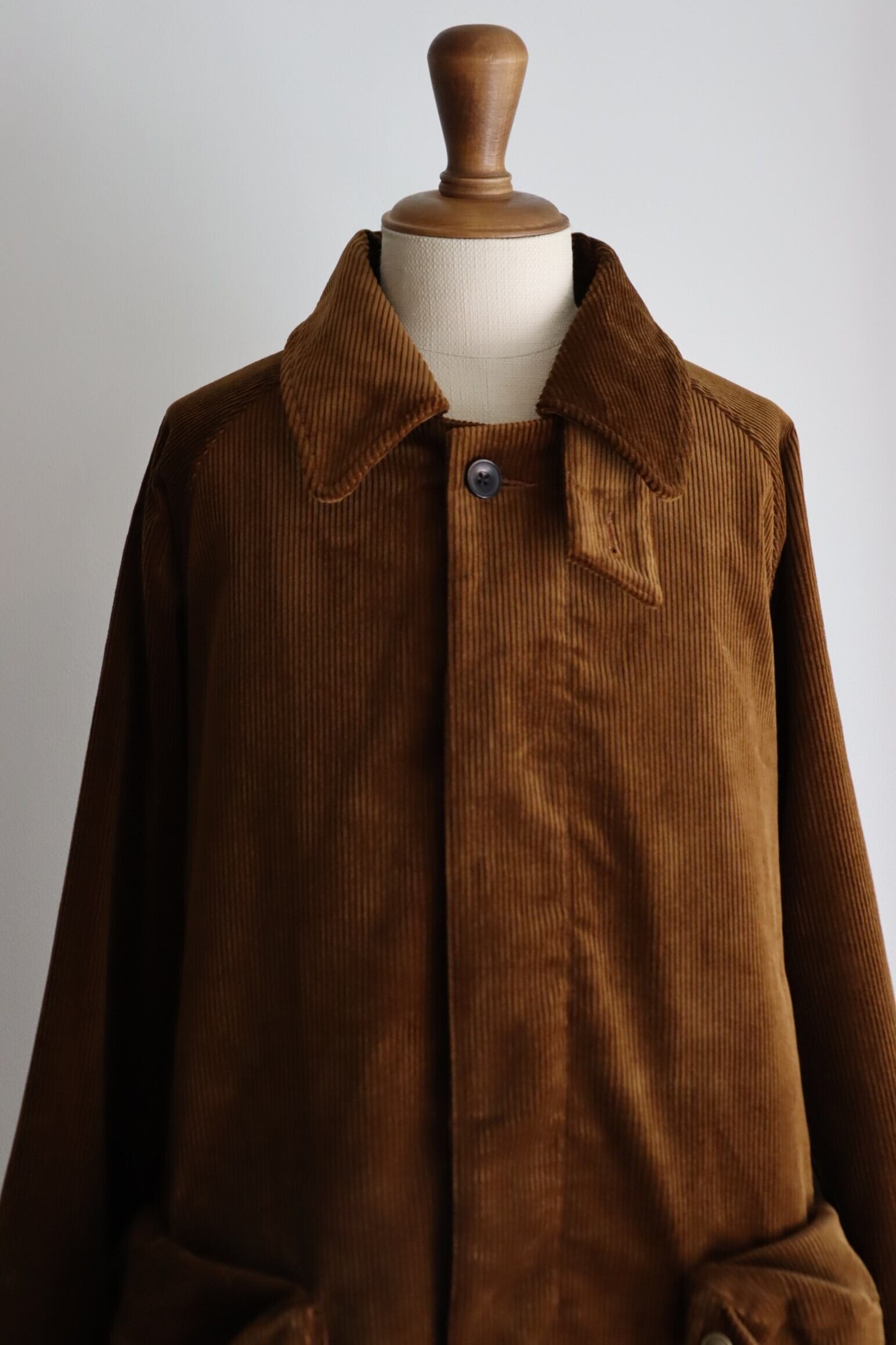 生地はフランスのビックメゾンがブリスベンモスの8welコーデュロイを日本でリプロした生機を使用。重厚なしなやかさを出すために縦糸は20オーガニックコットンの三子糸、度詰めの2重織で風に煽られないアウター用の生地として仕上っております。