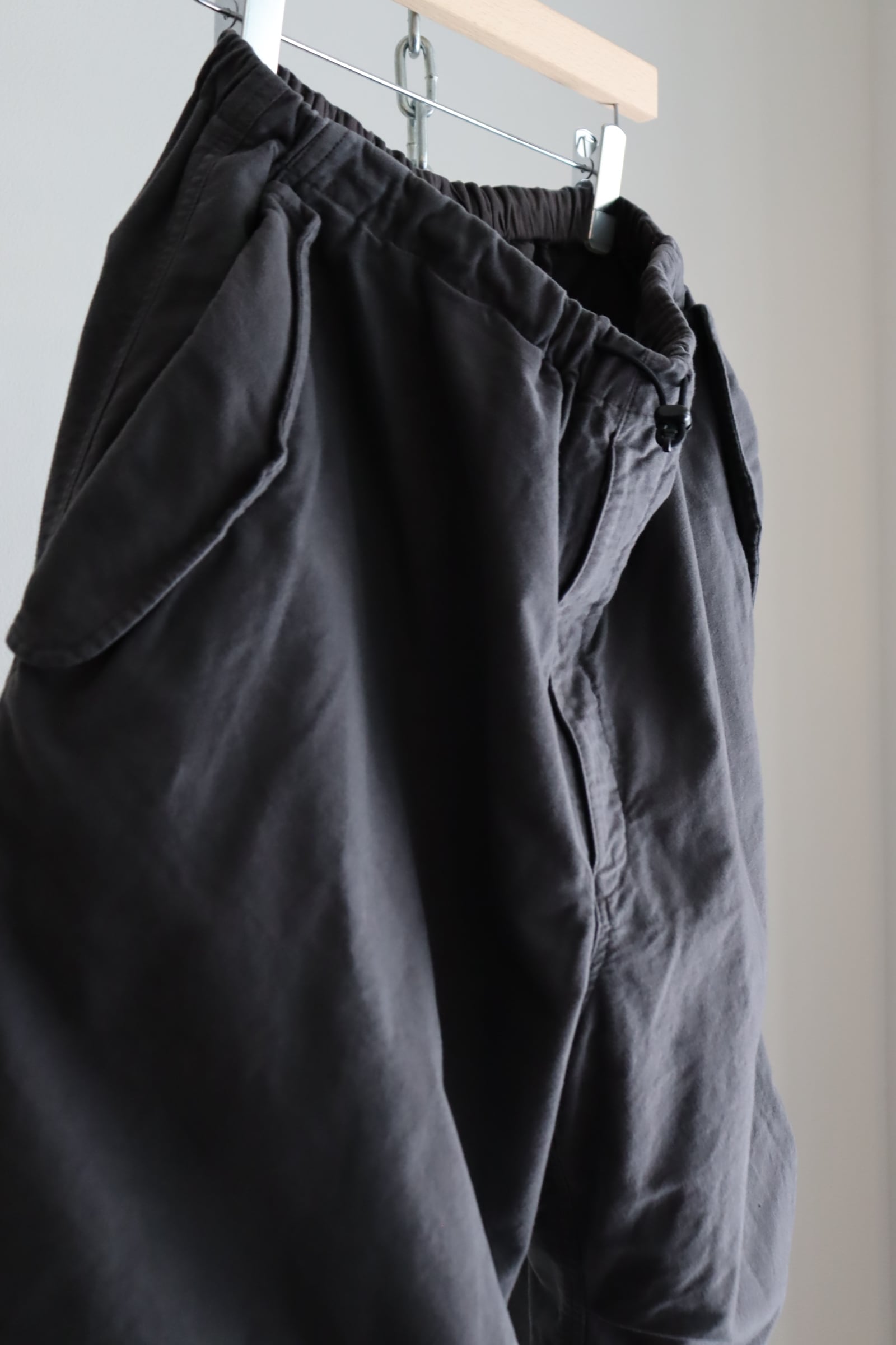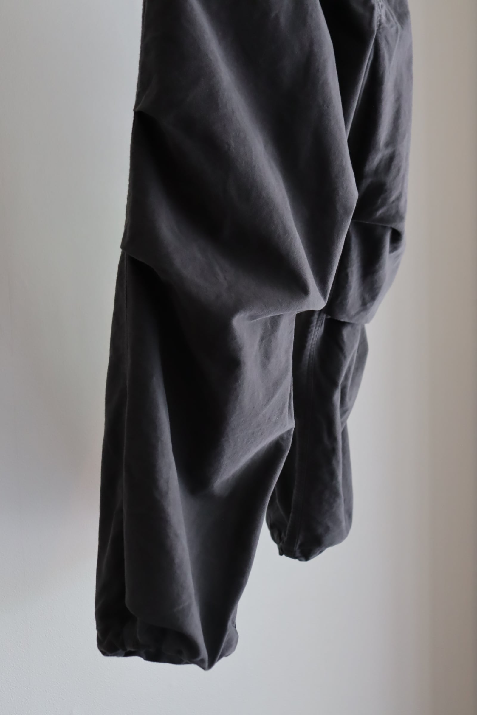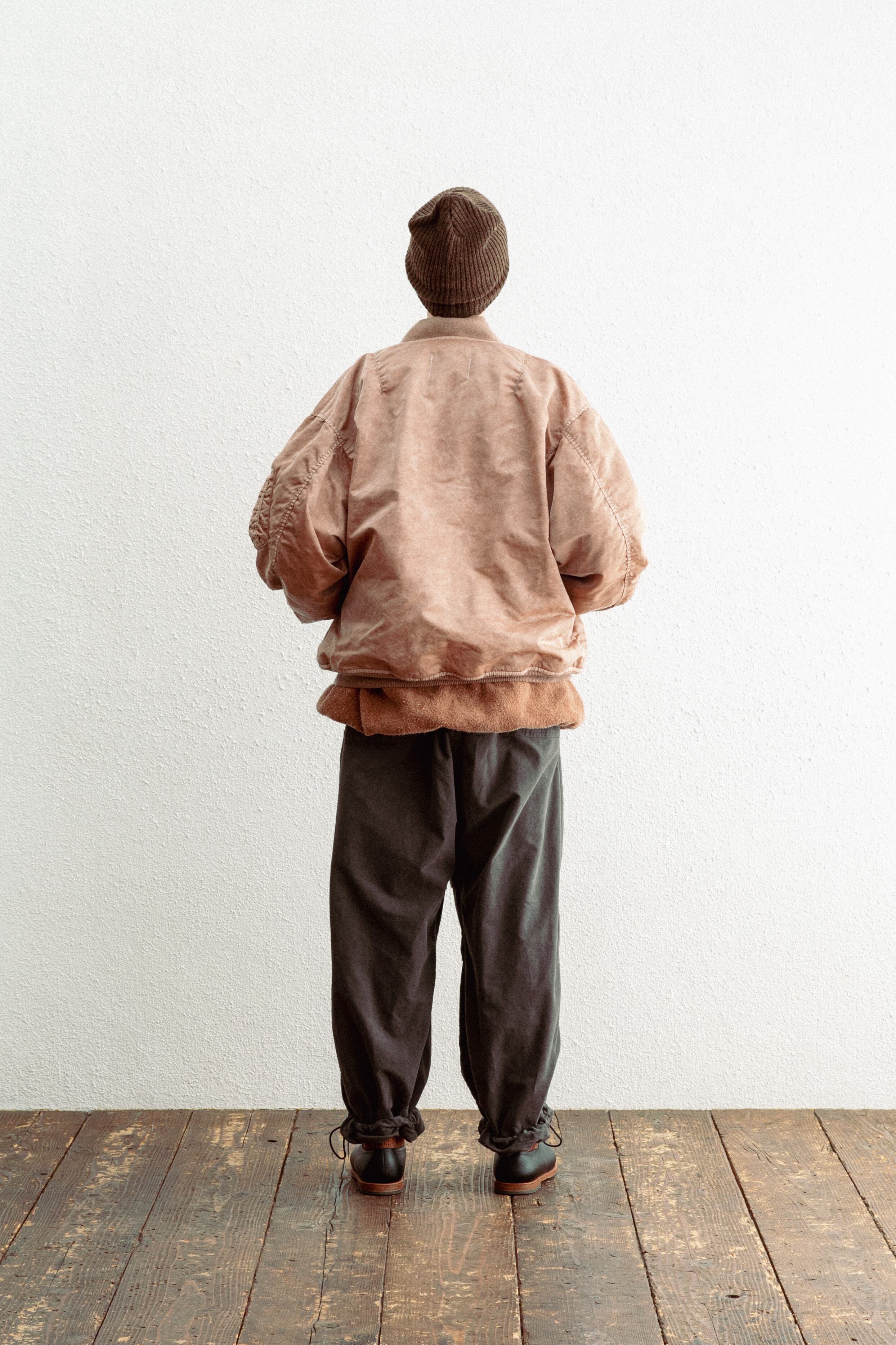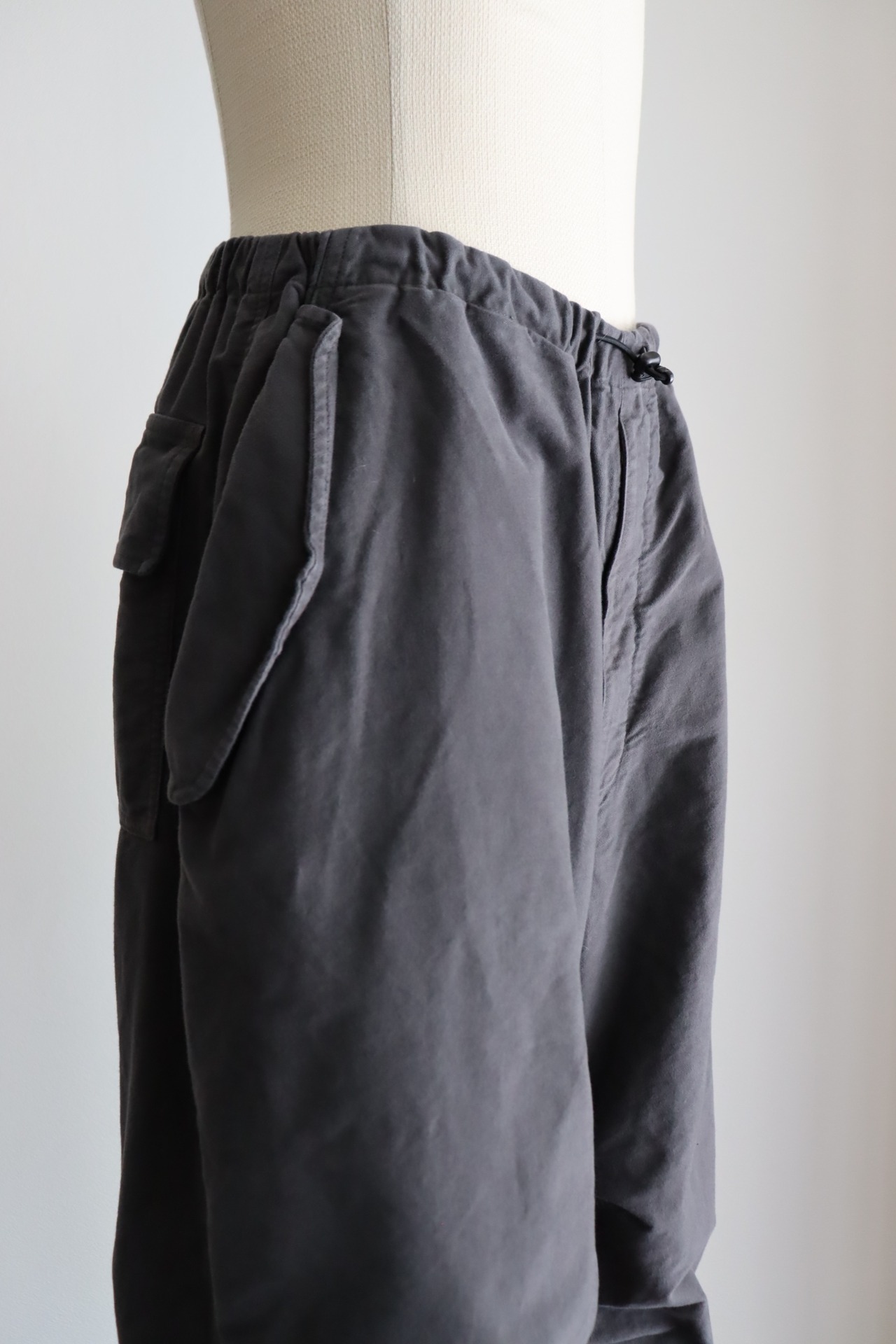 型はウエスト空きを無くし、着脱のし易い仕様に変更。昨シーズンからウエストや裾のコードの仕様もコードストッパーでアウトドア仕様にして、より着易いアイテムにアップデートしています。ウエストPKの仕様は残していて、フラップを開けなくても使⽤できる2段PKの仕様。素材は細番⼿で織り上げたモールスキンストレッチにキメ細かいスエード起⽑を施す事でソフトな⾵合いとウォーム感のある⽣地を使⽤しております。