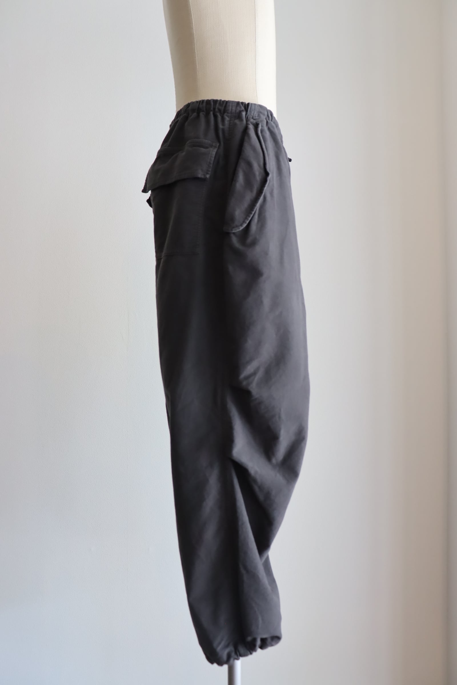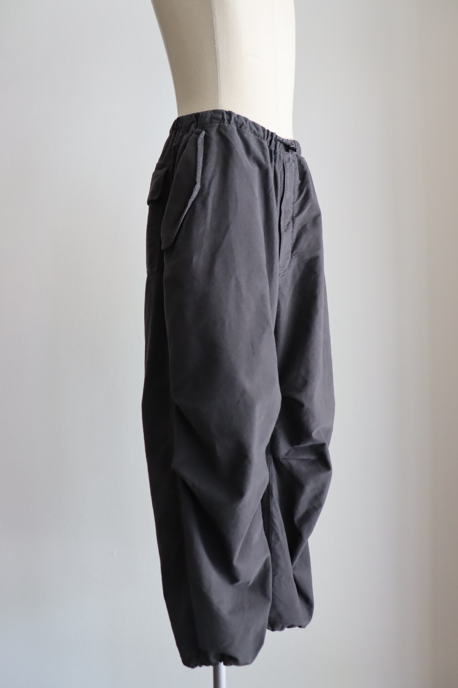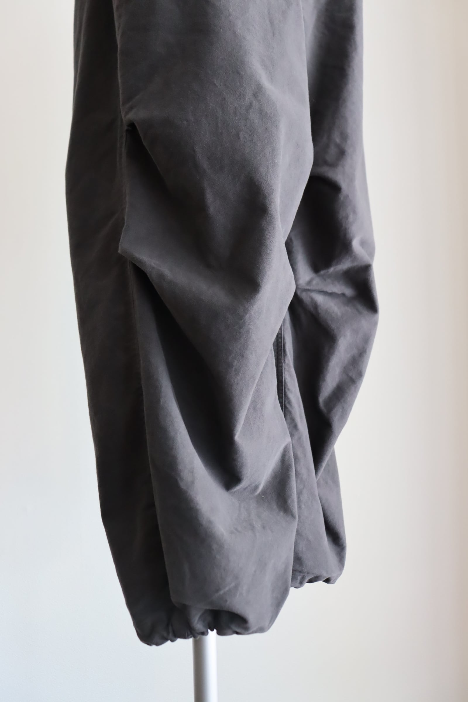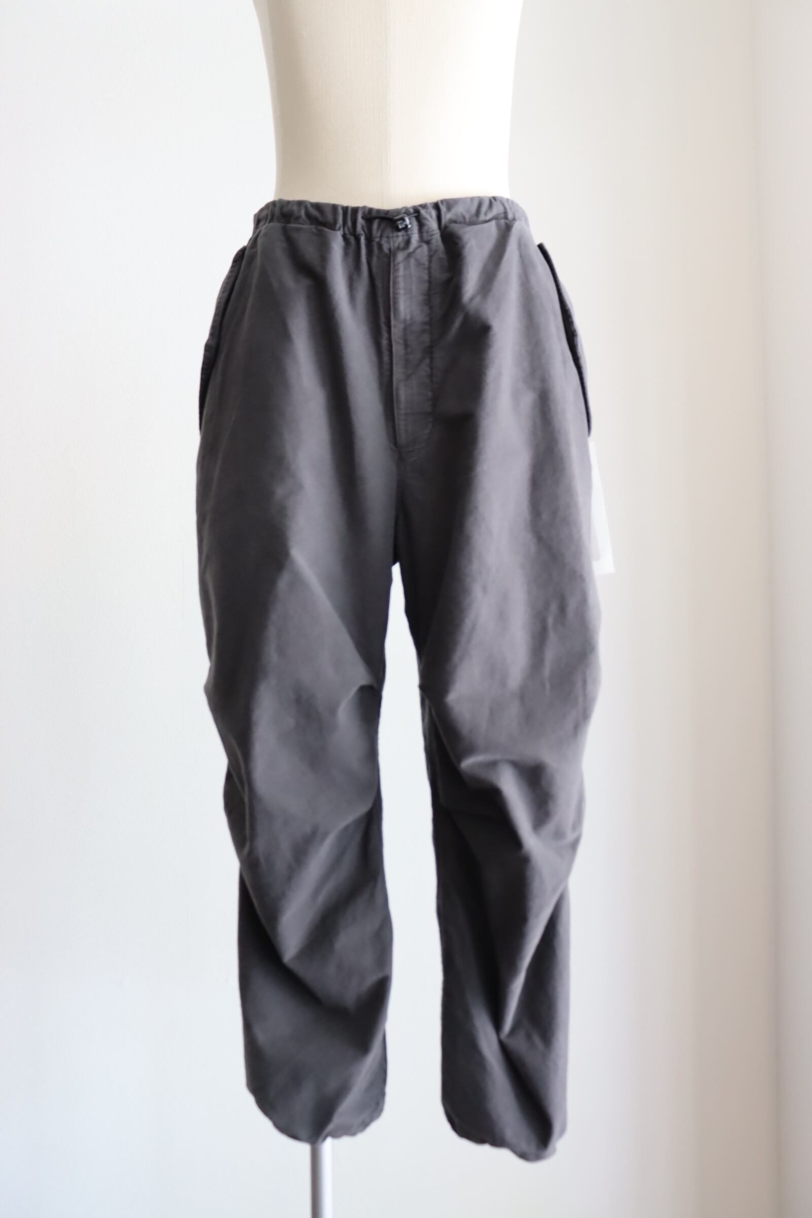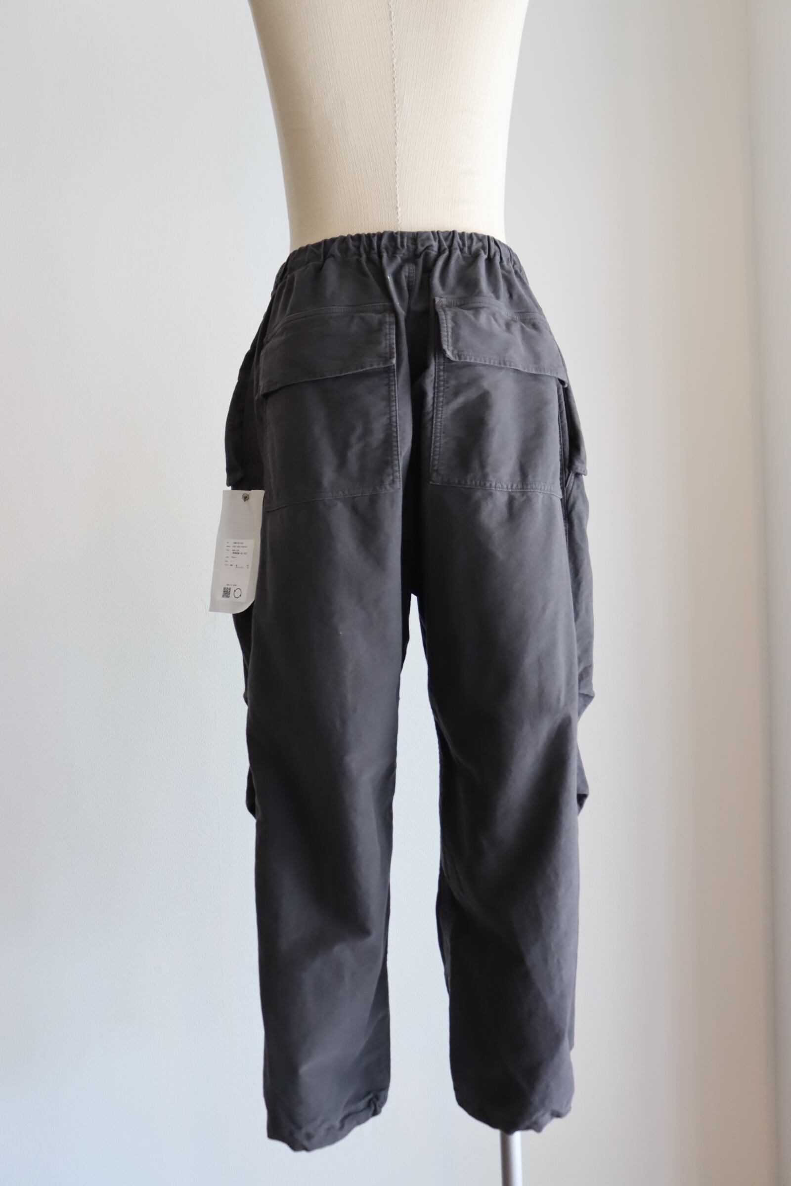 型はウエスト空きを無くし、着脱のし易い仕様に変更。昨シーズンからウエストや裾のコードの仕様もコードストッパーでアウトドア仕様にして、より着易いアイテムにアップデートしています。ウエストPKの仕様は残していて、フラップを開けなくても使⽤できる2段PKの仕様。素材は細番⼿で織り上げたモールスキンストレッチにキメ細かいスエード起⽑を施す事でソフトな⾵合いとウォーム感のある⽣地を使⽤しております。