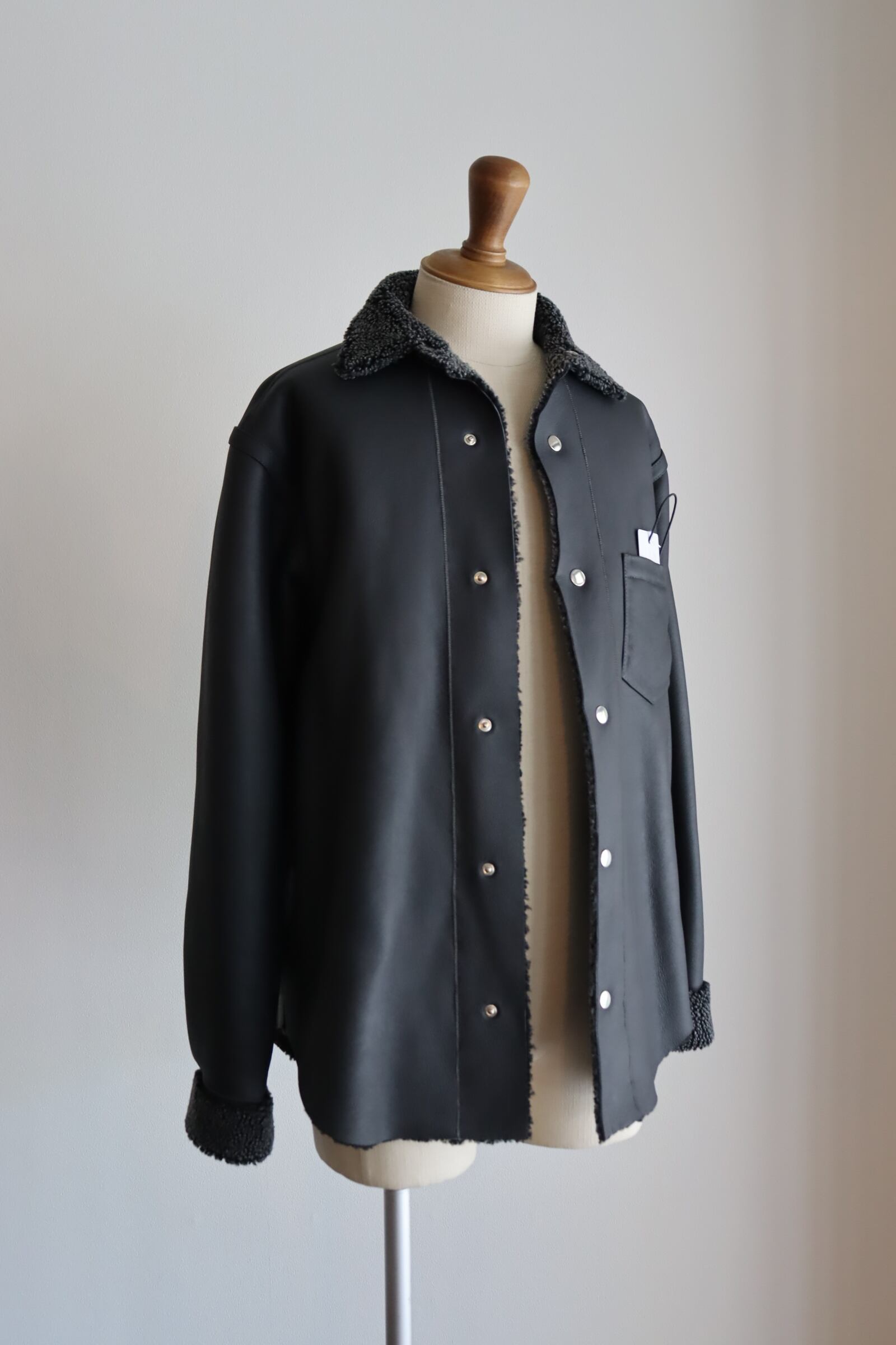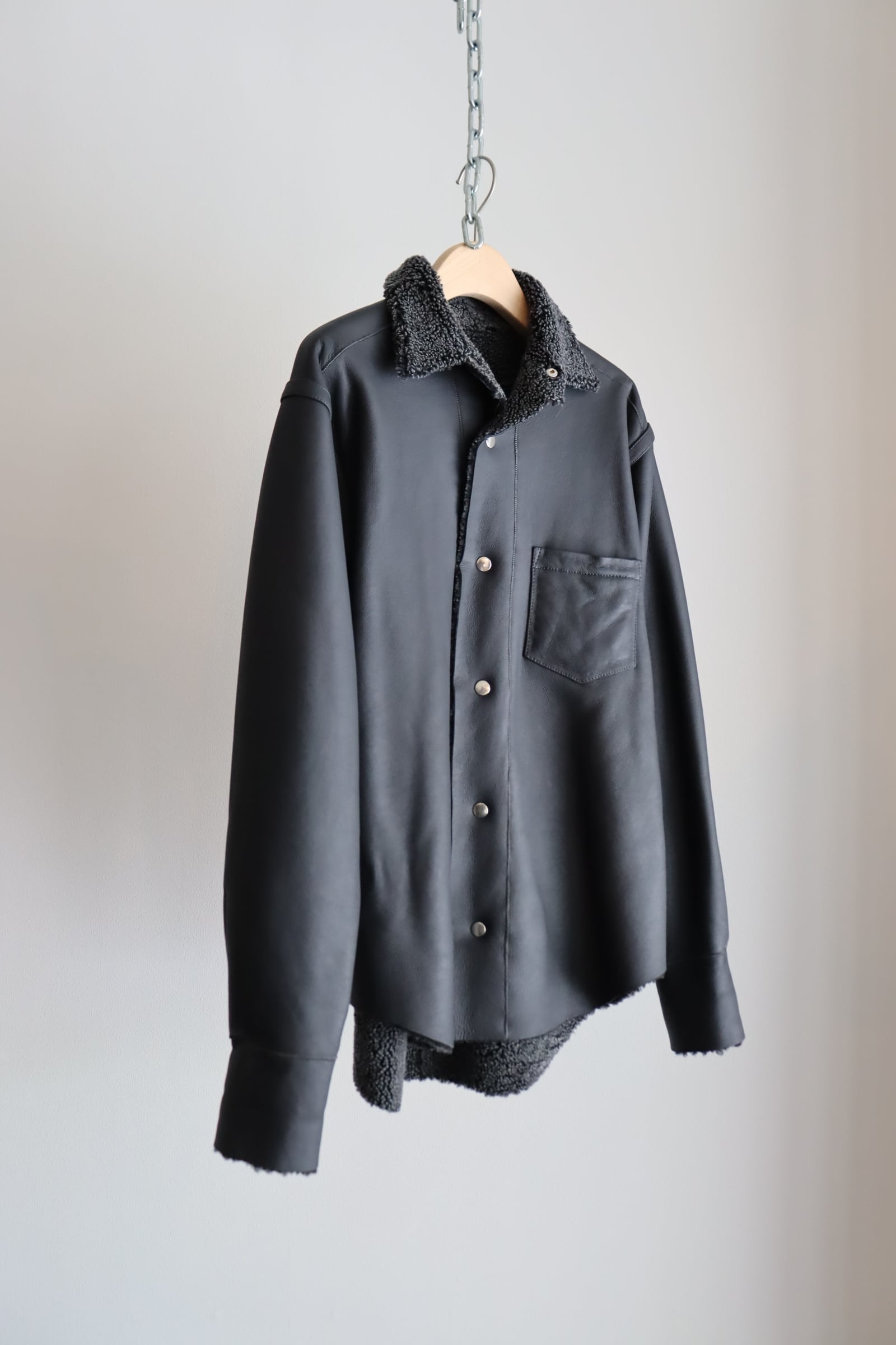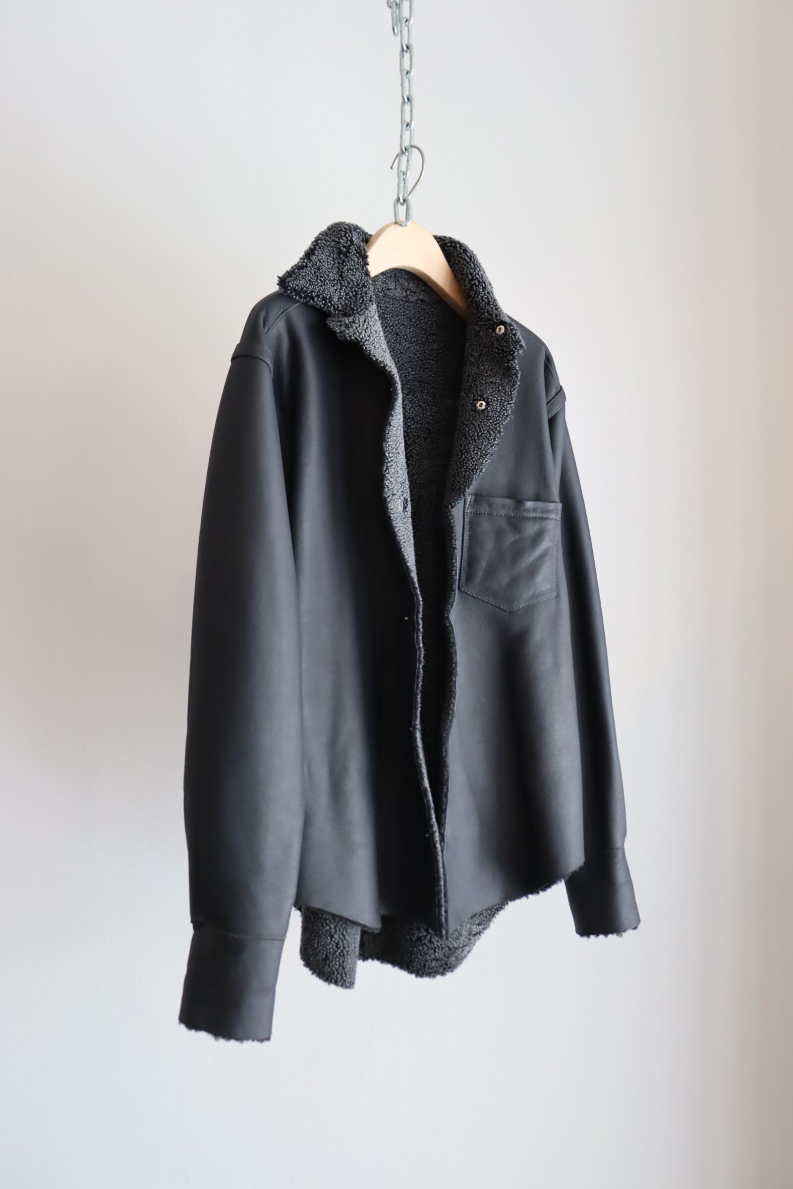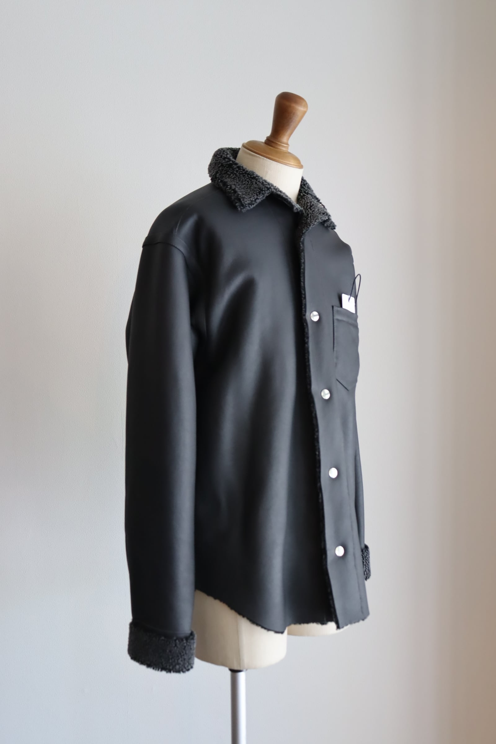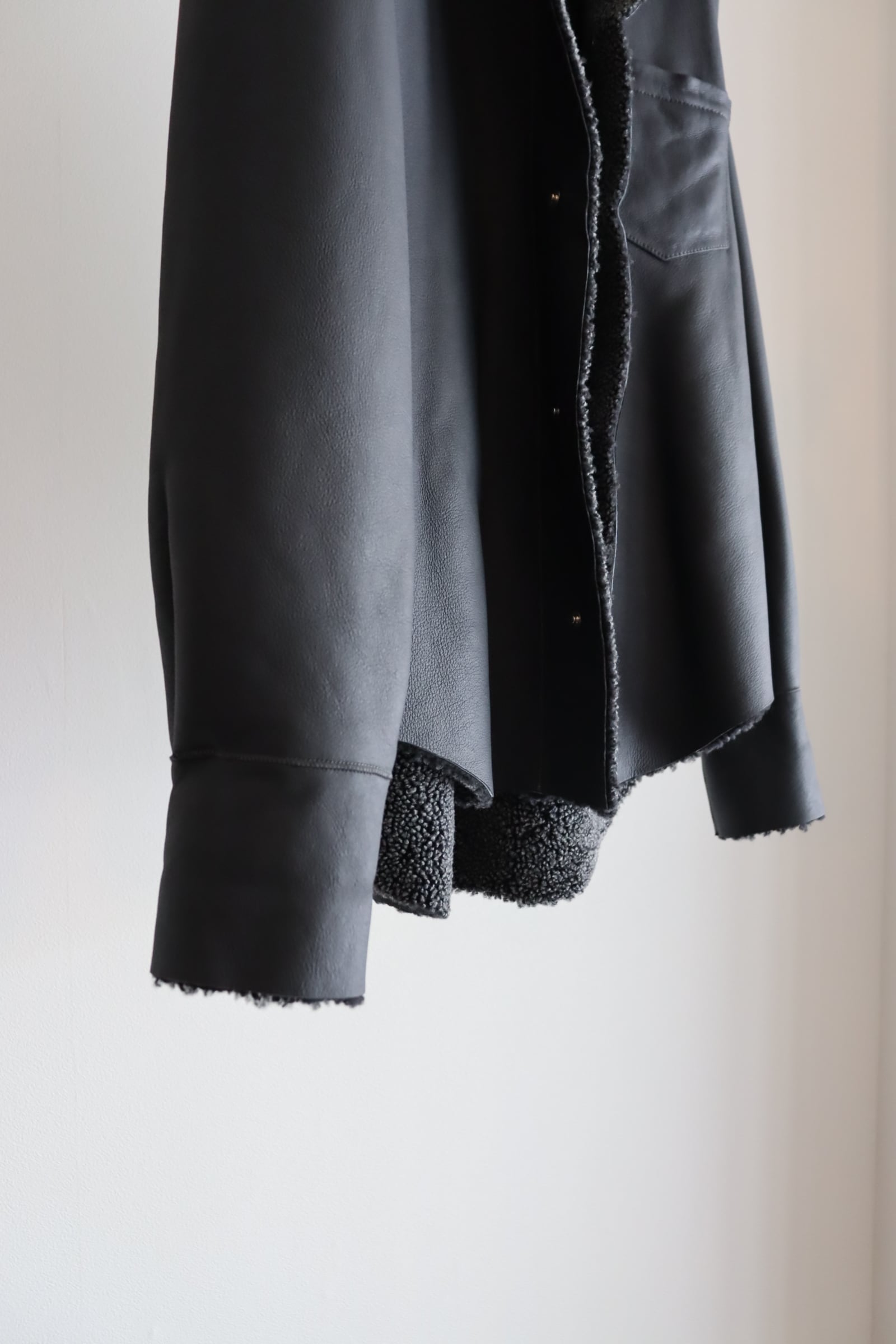 ムートンボアのシャツ型ジャケットです。表面はセミナッパ加工を施し、しっとりとした艶があります。