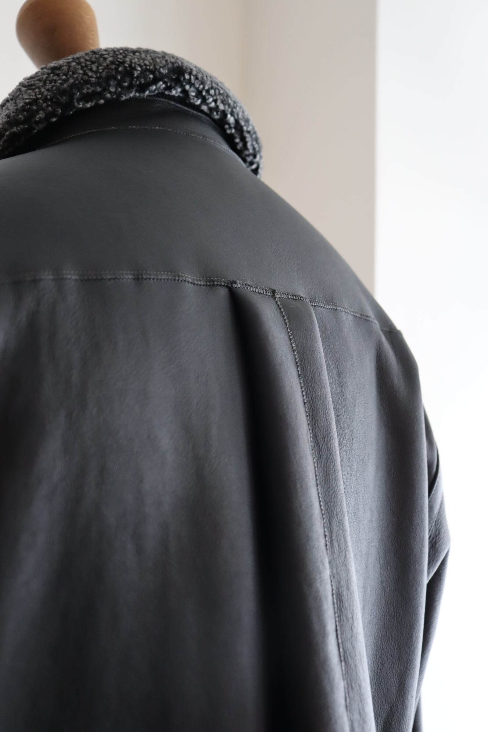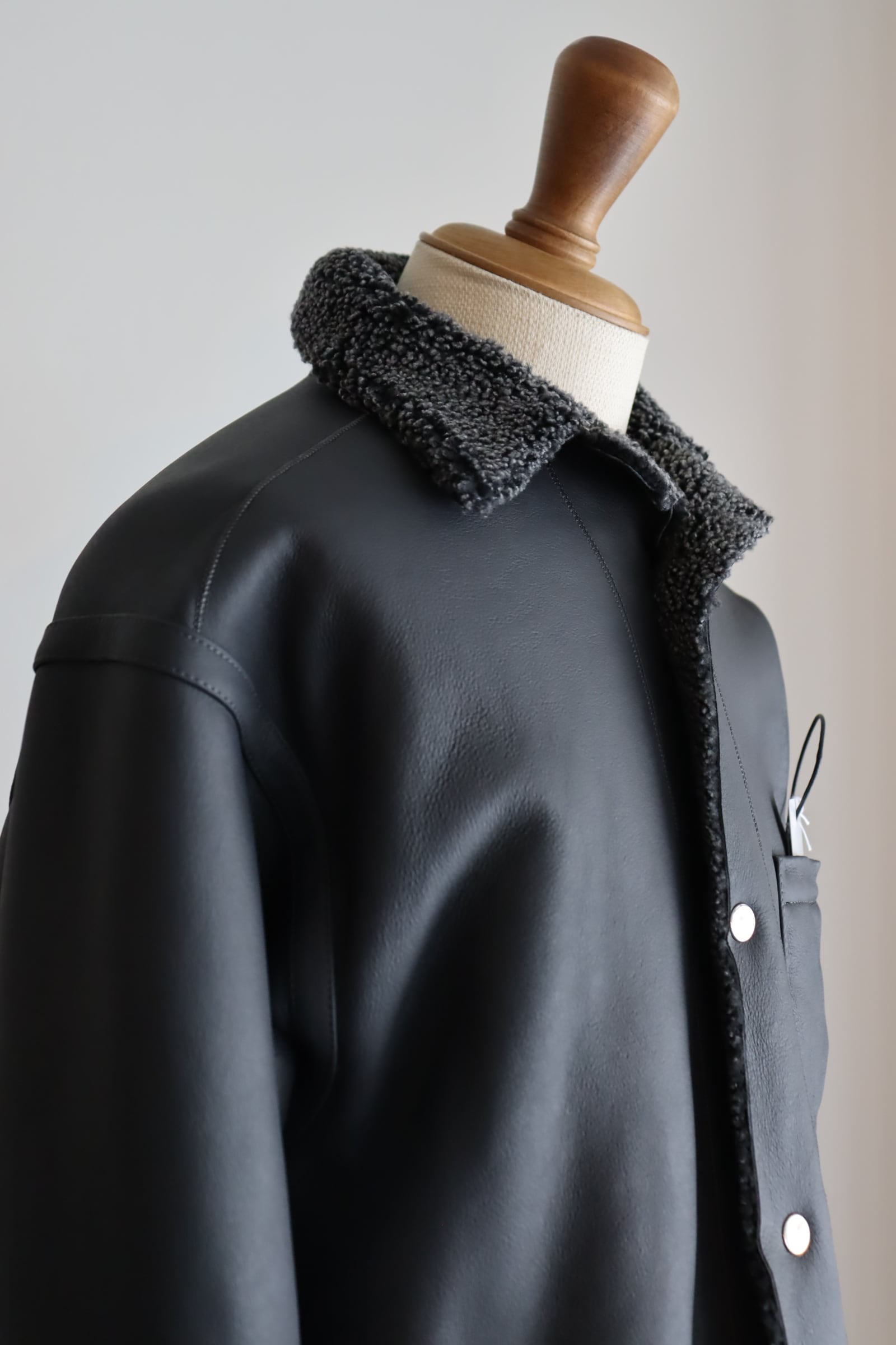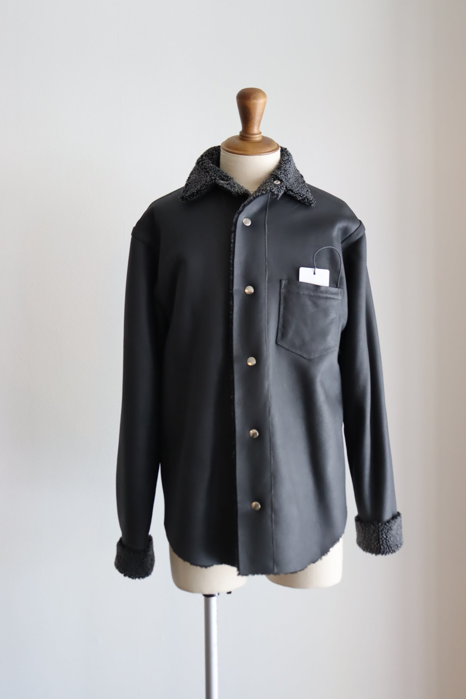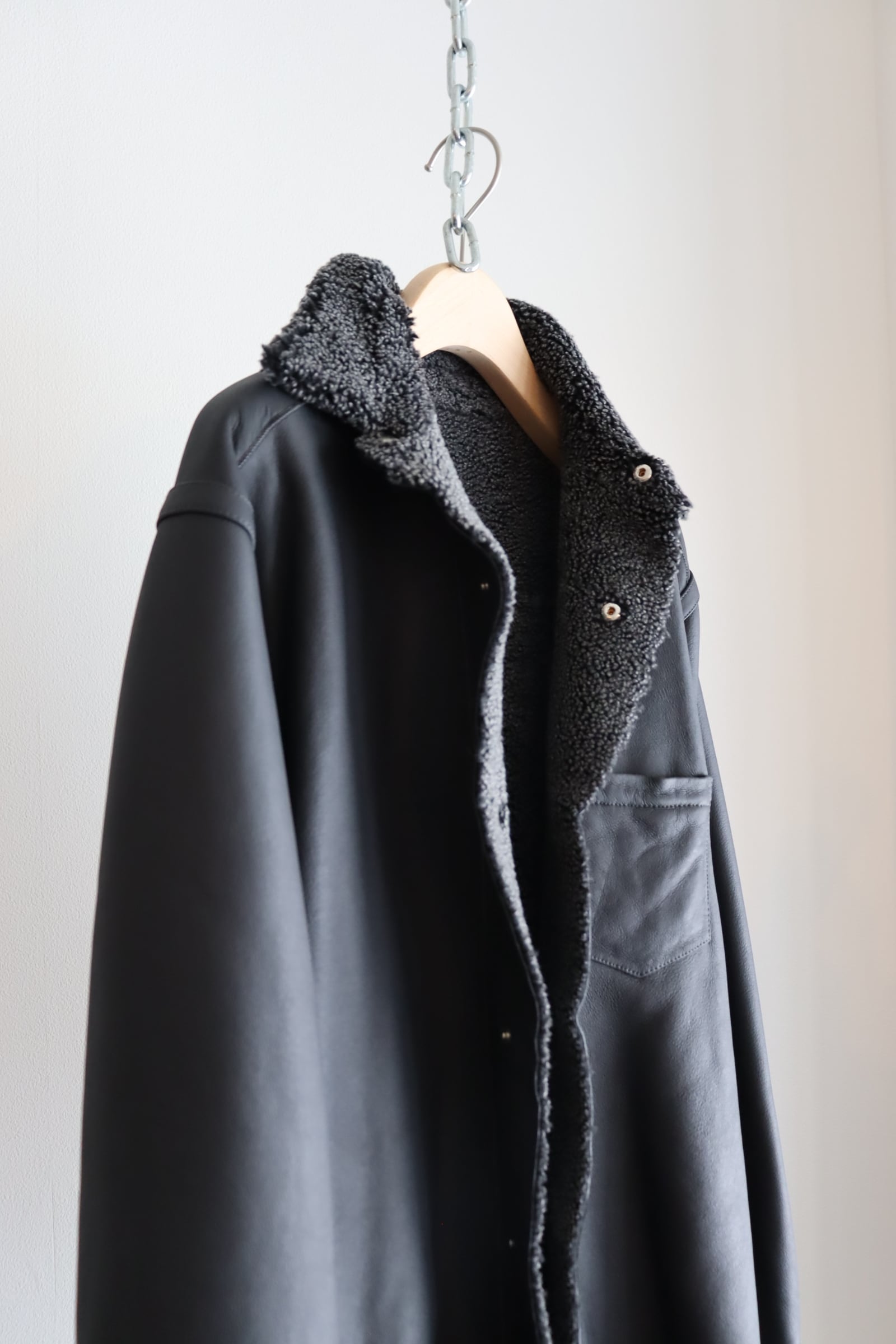 ムートンボアのシャツ型ジャケットです。表面はセミナッパ加工を施し、しっとりとした艶があります。